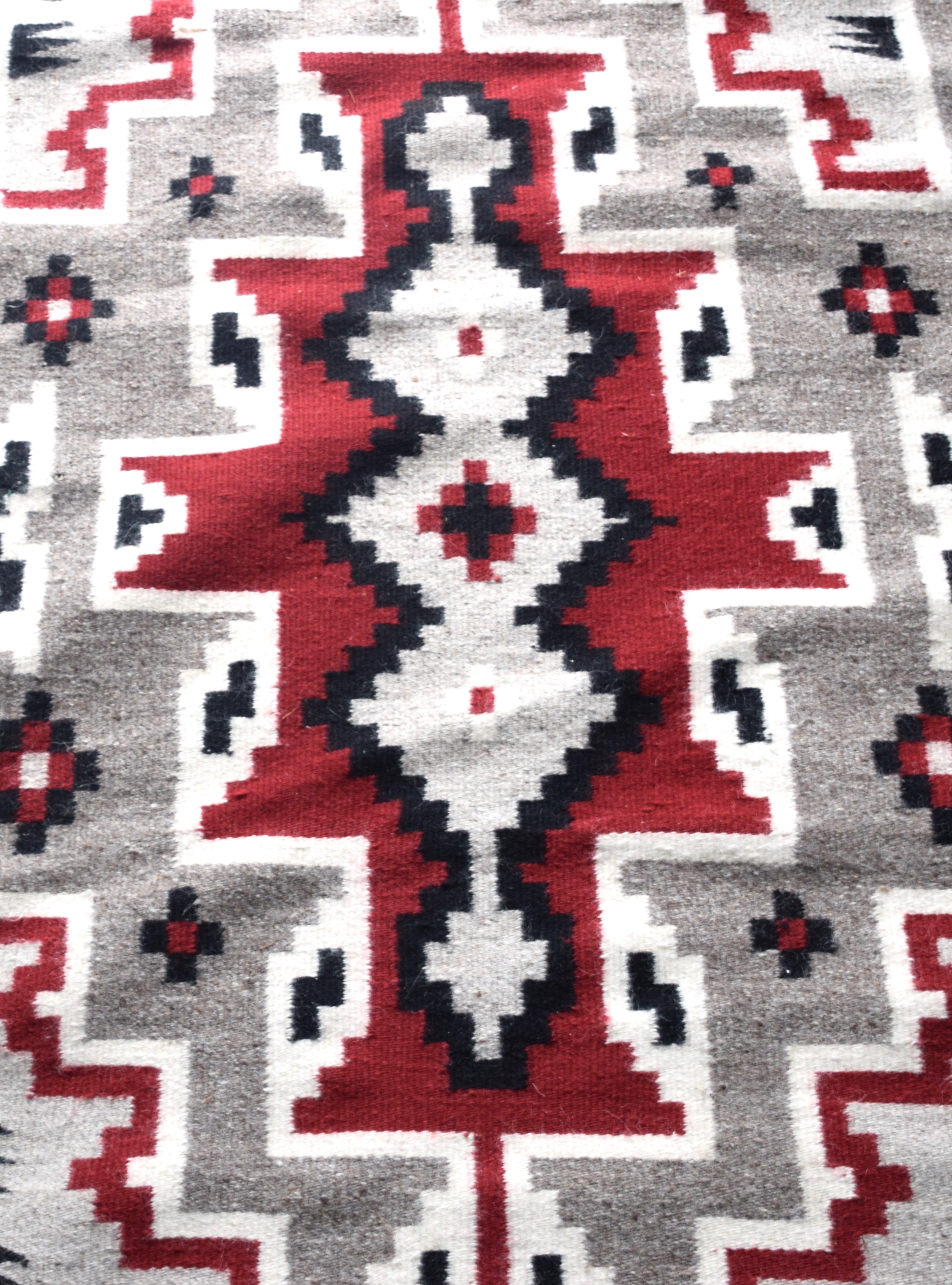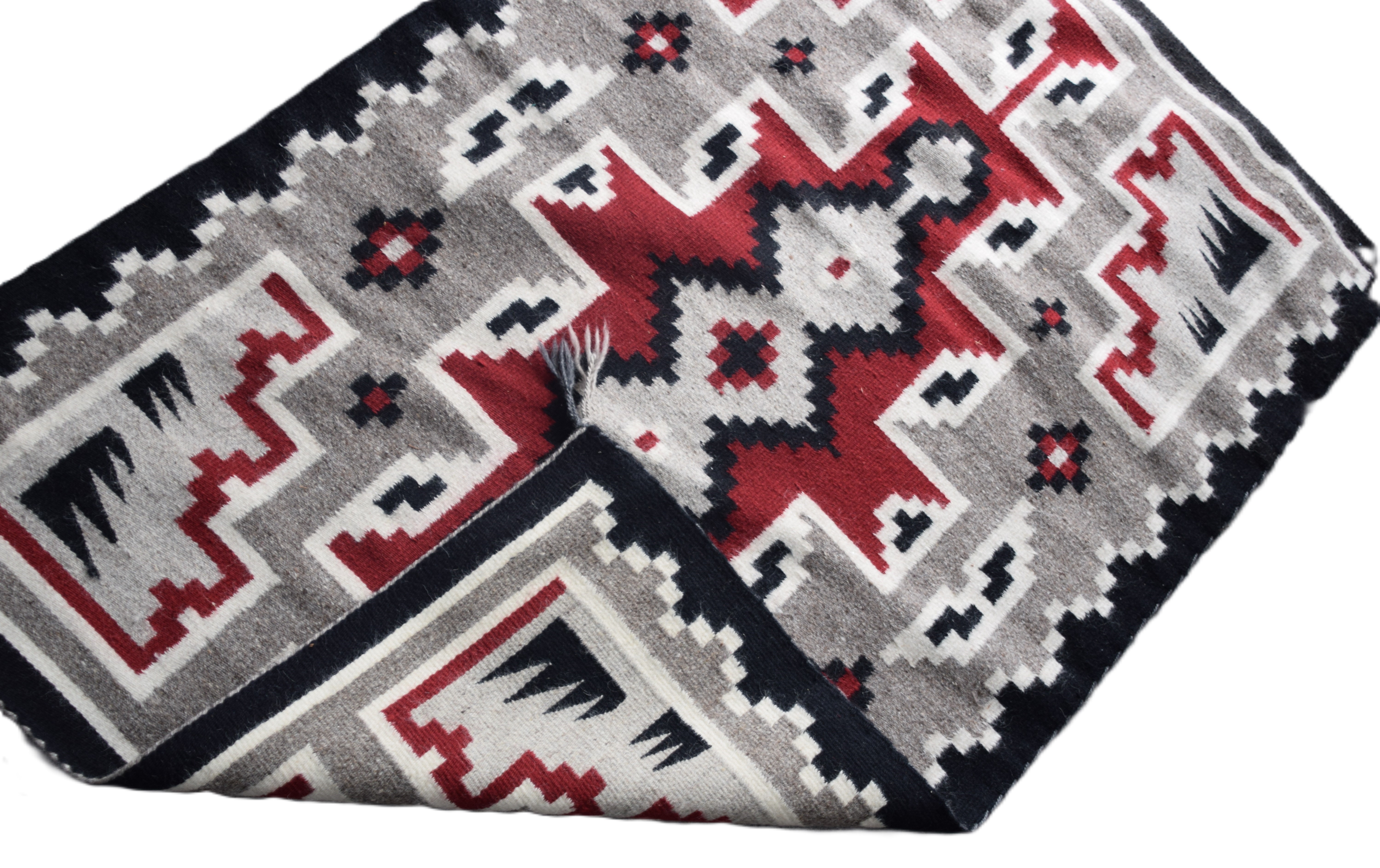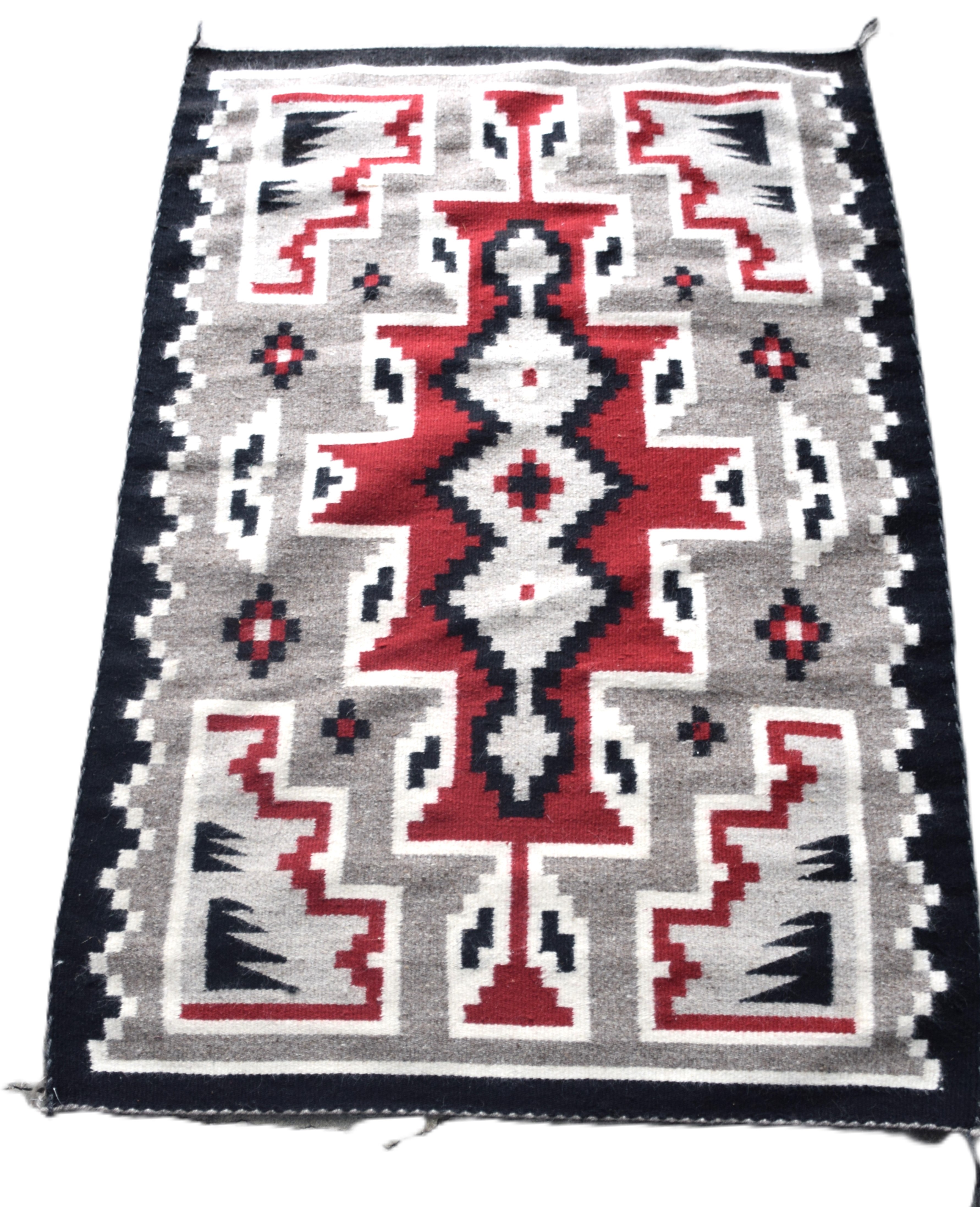 Native American rug with Indian geometric designs with red, black and gray colors. Dimensions: 2′ 10″ x 4′ 3″