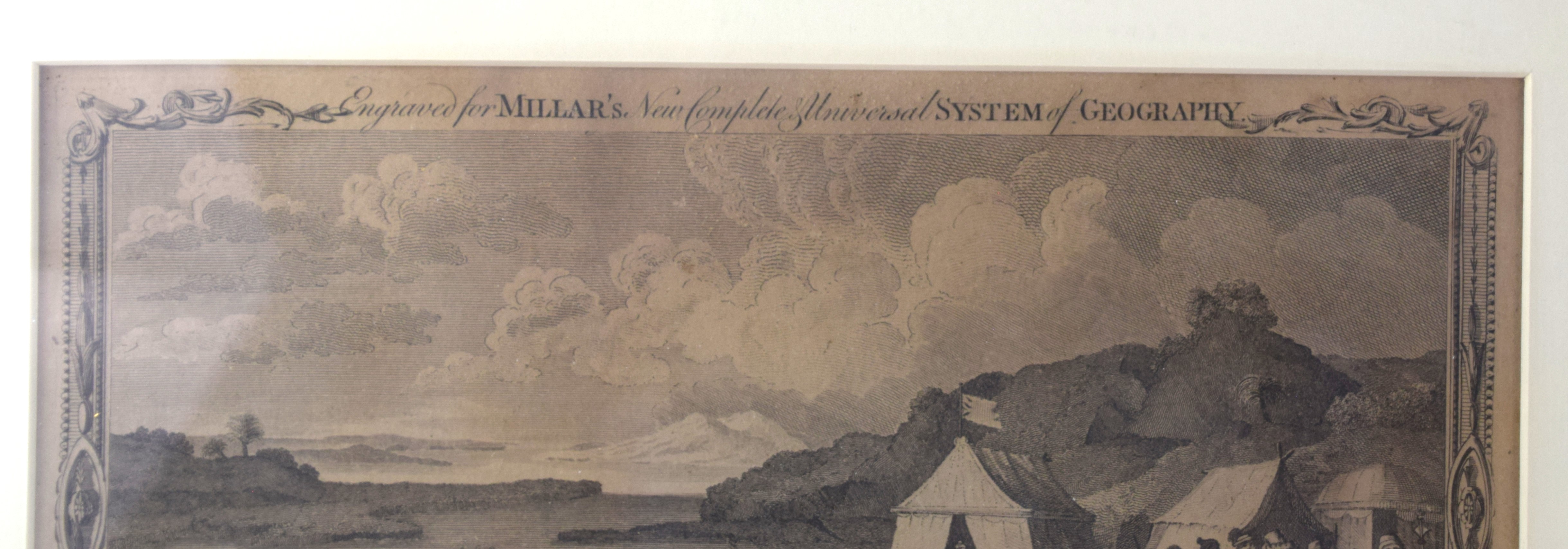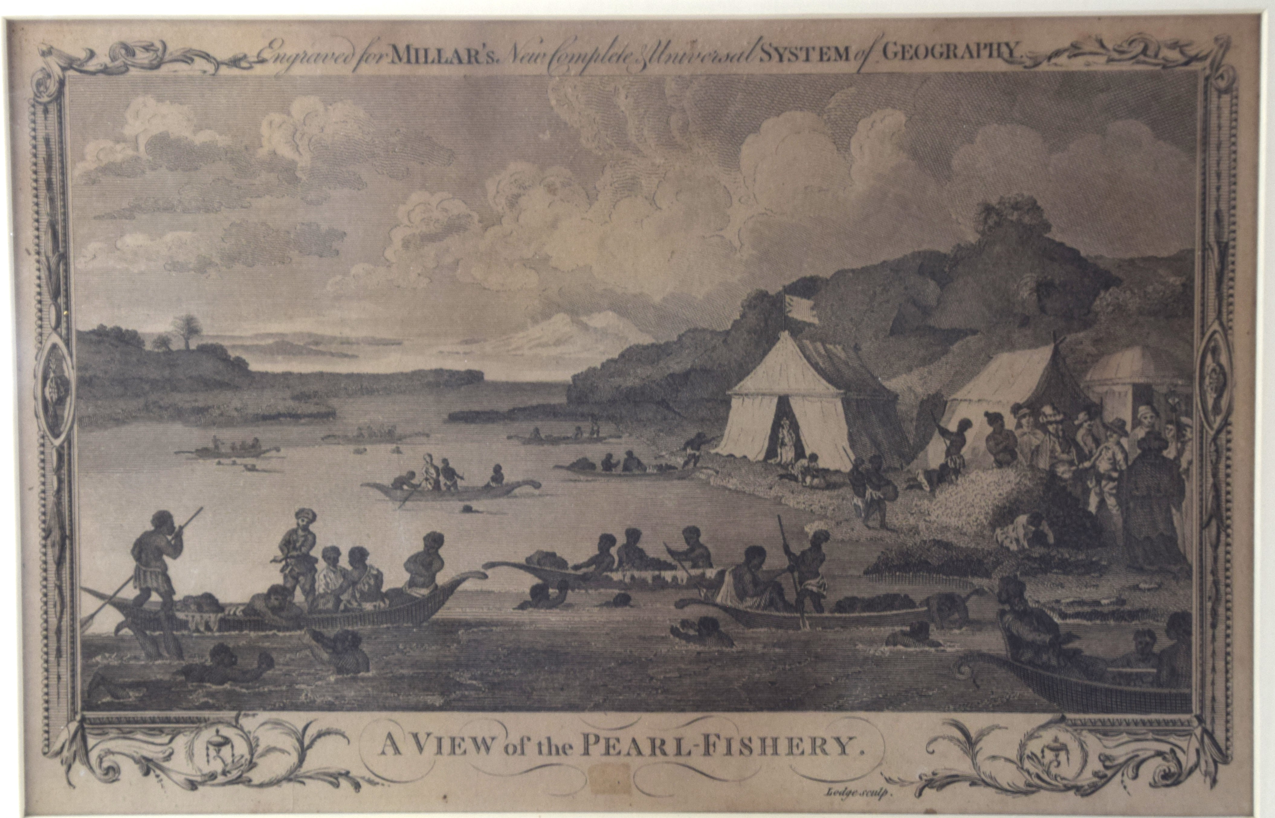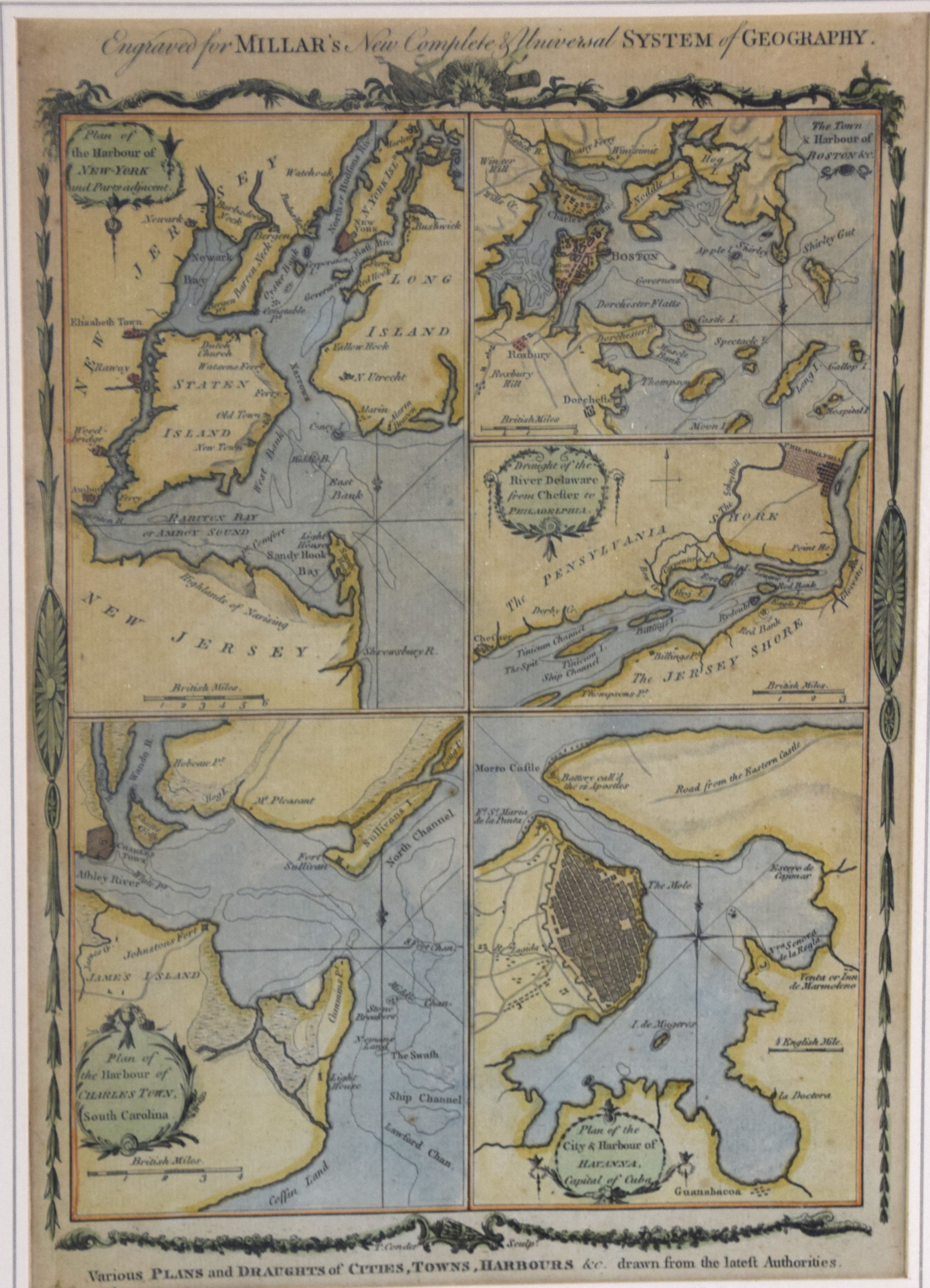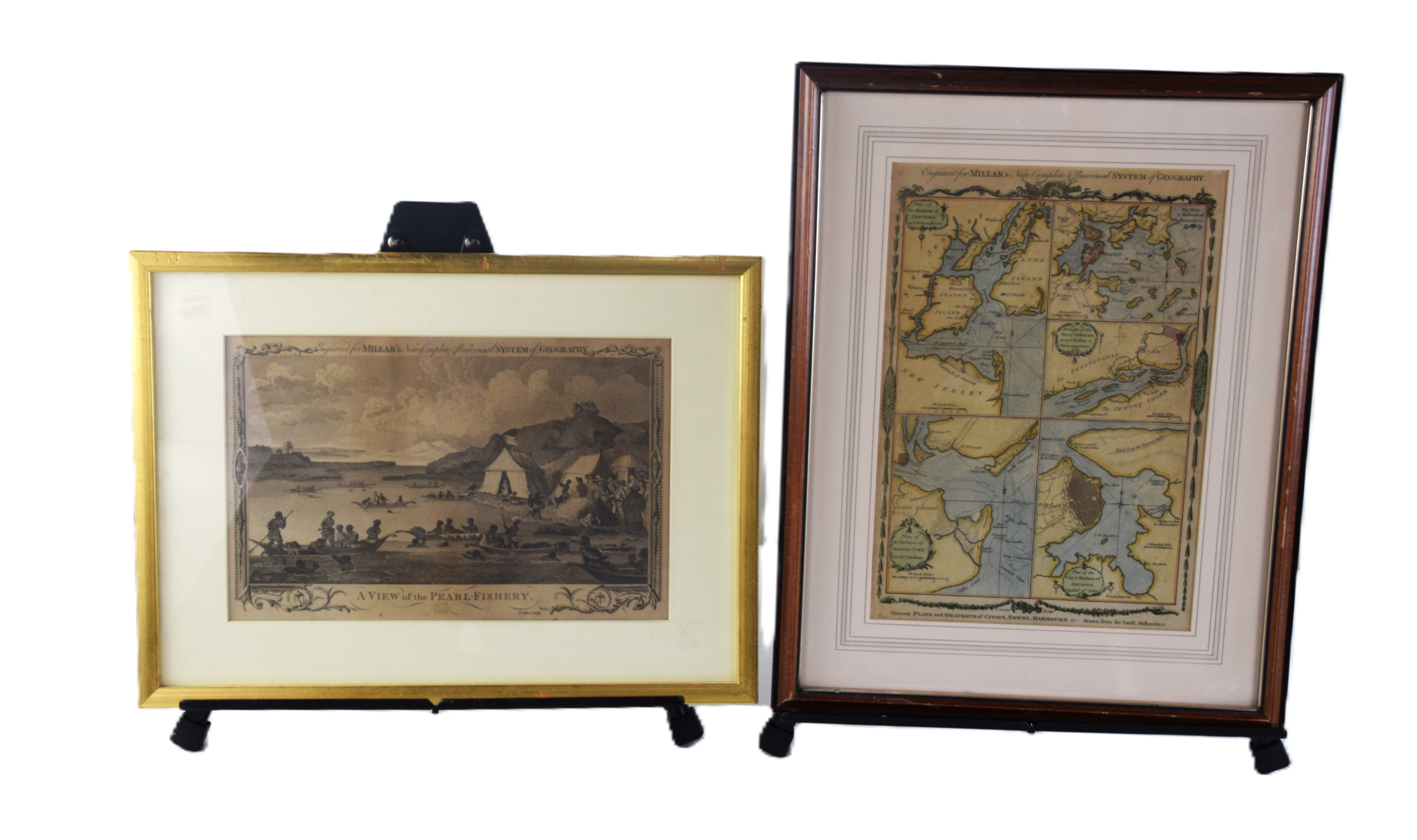 Two framed engravings for Millar’s New Complete Universal System of Geography to include “A View of the Pearl Fishery” (Probably Bali) and N” North American Harbors Maps”. Dimensions: 19″ x 13.5″ Overall