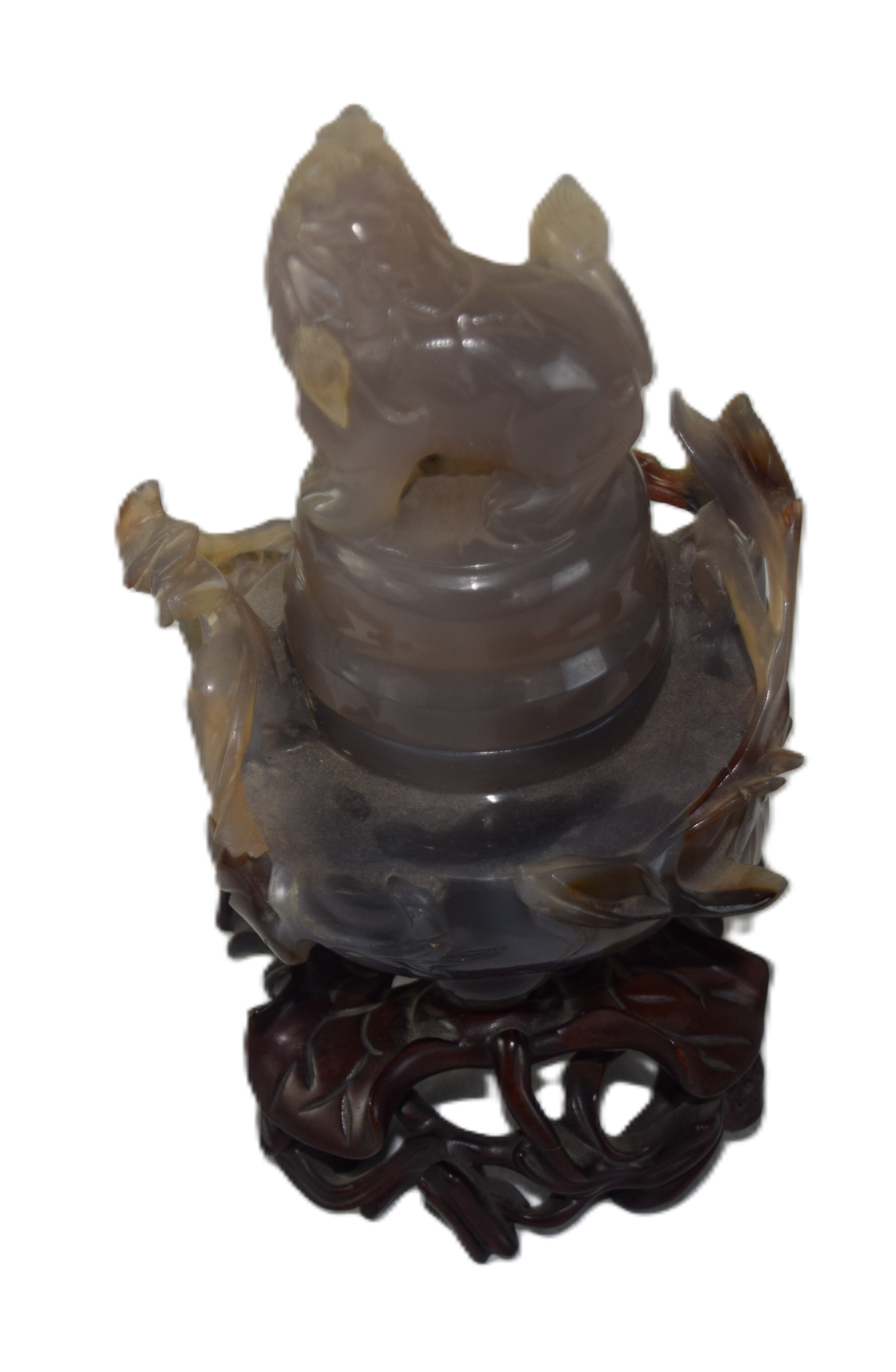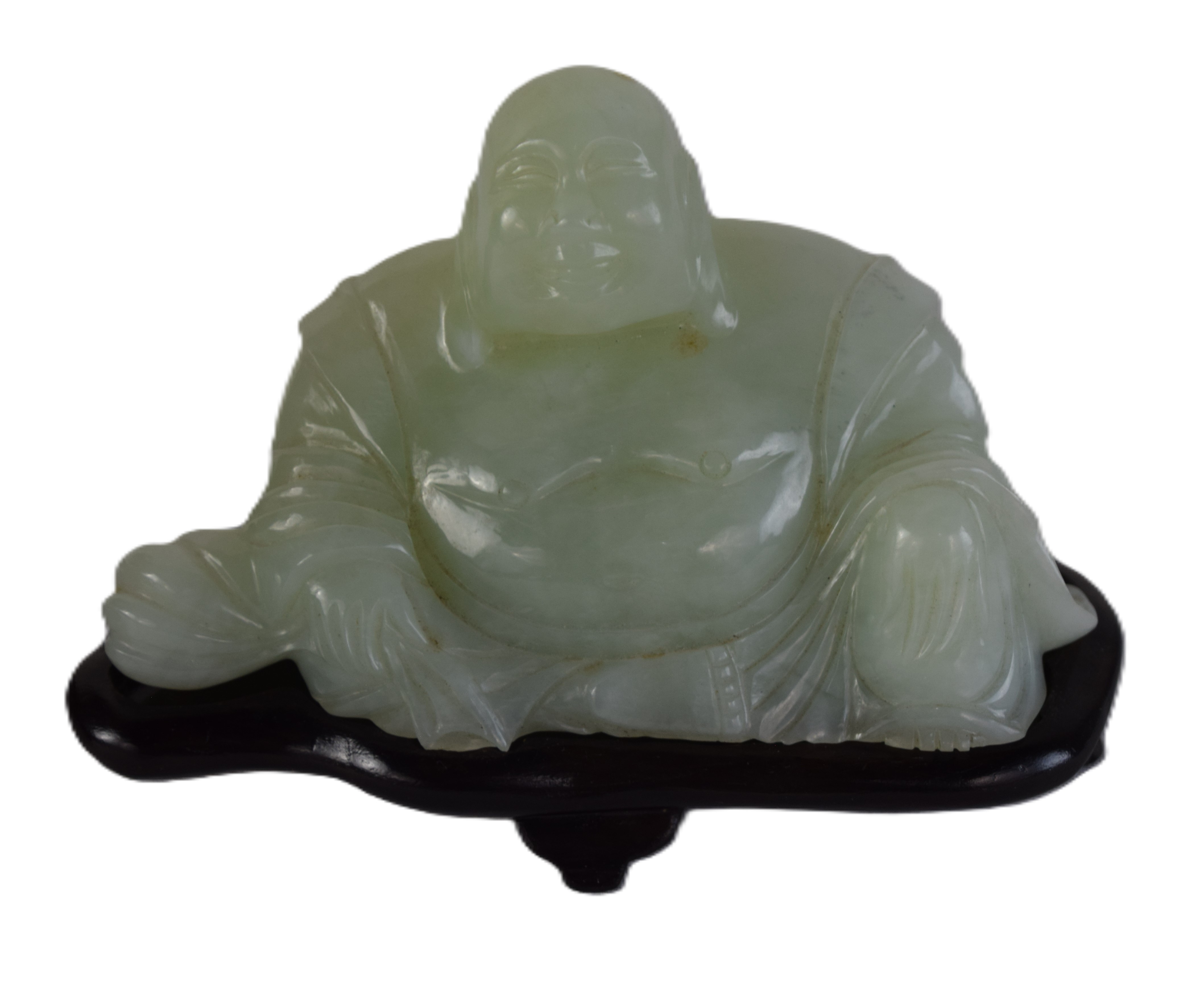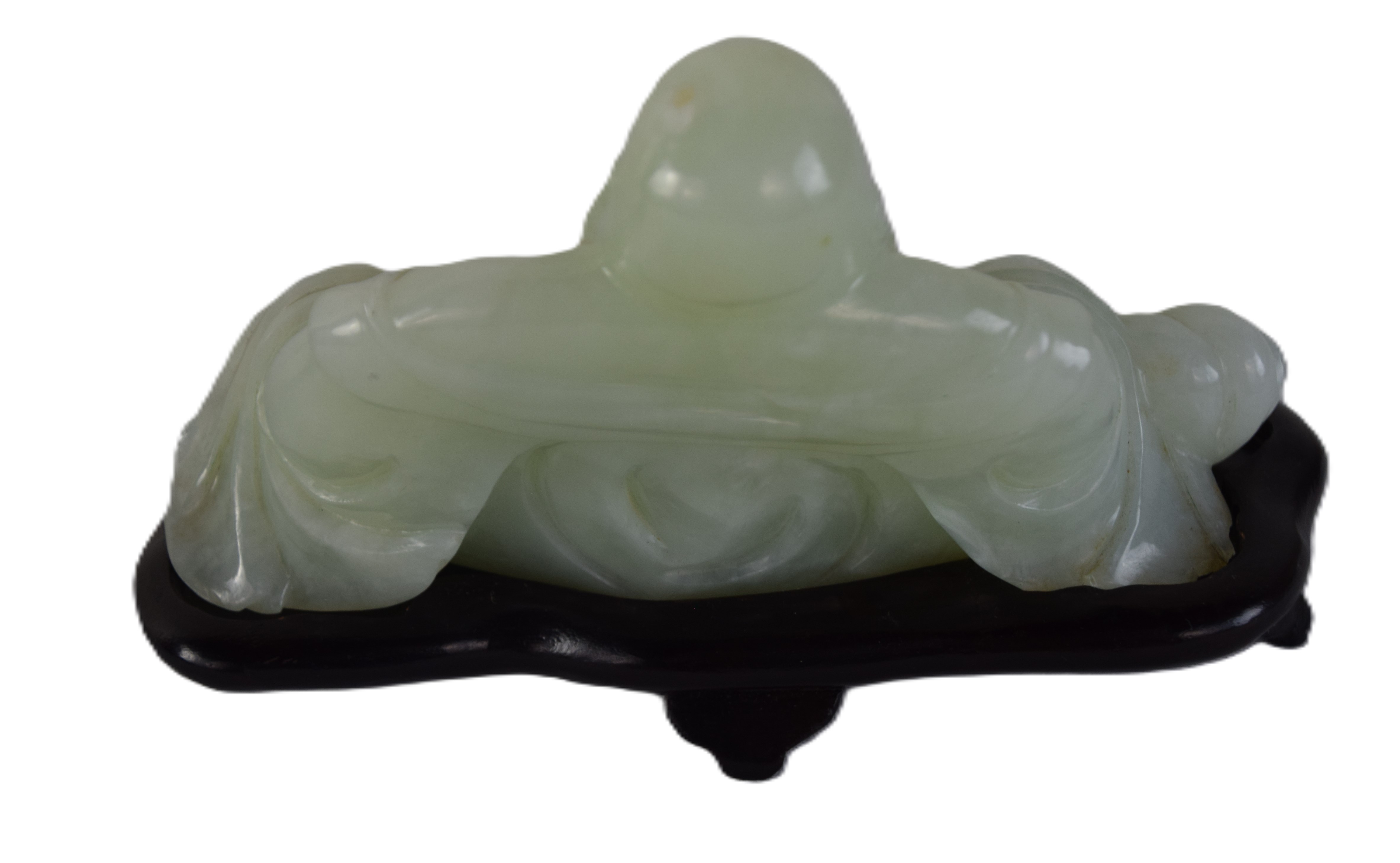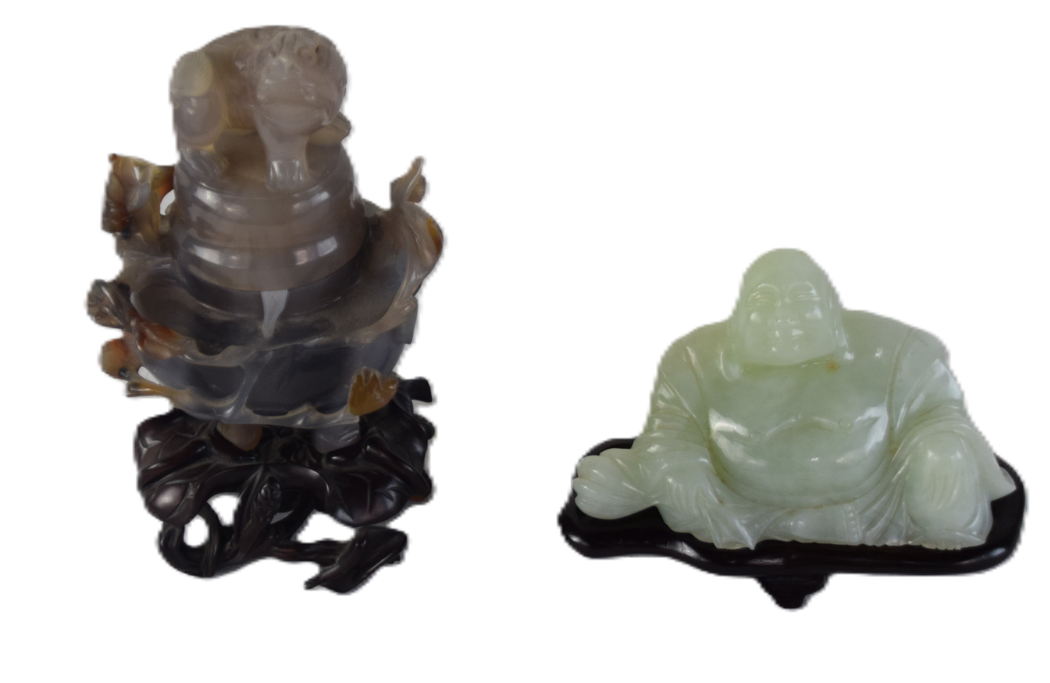 Jade Buddha figure (6″ L) on a teak base, jade figural animal (8″ H) on wooden base
