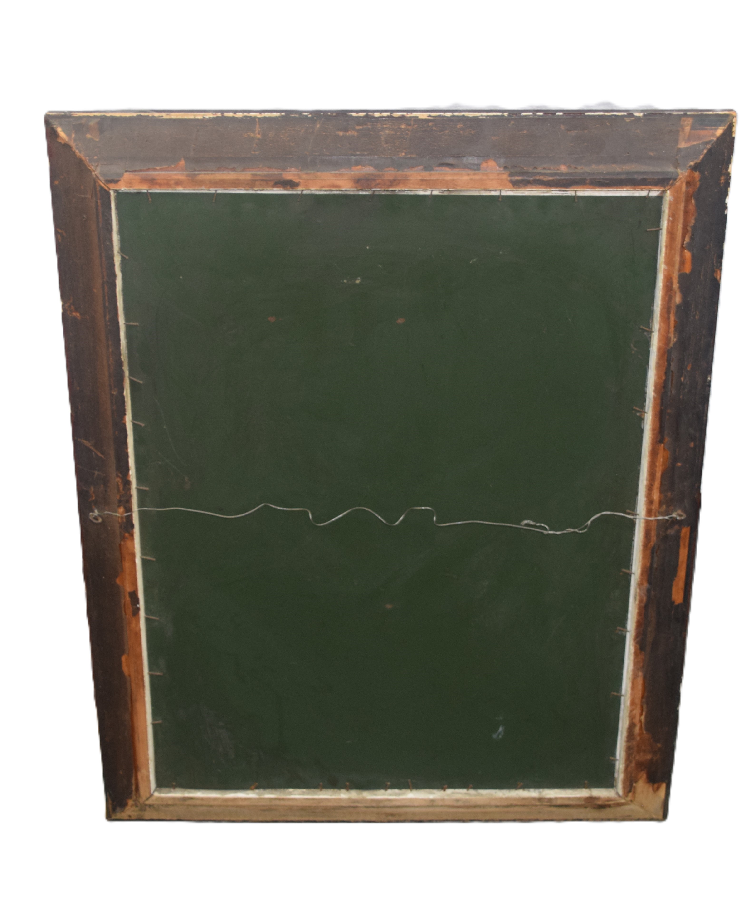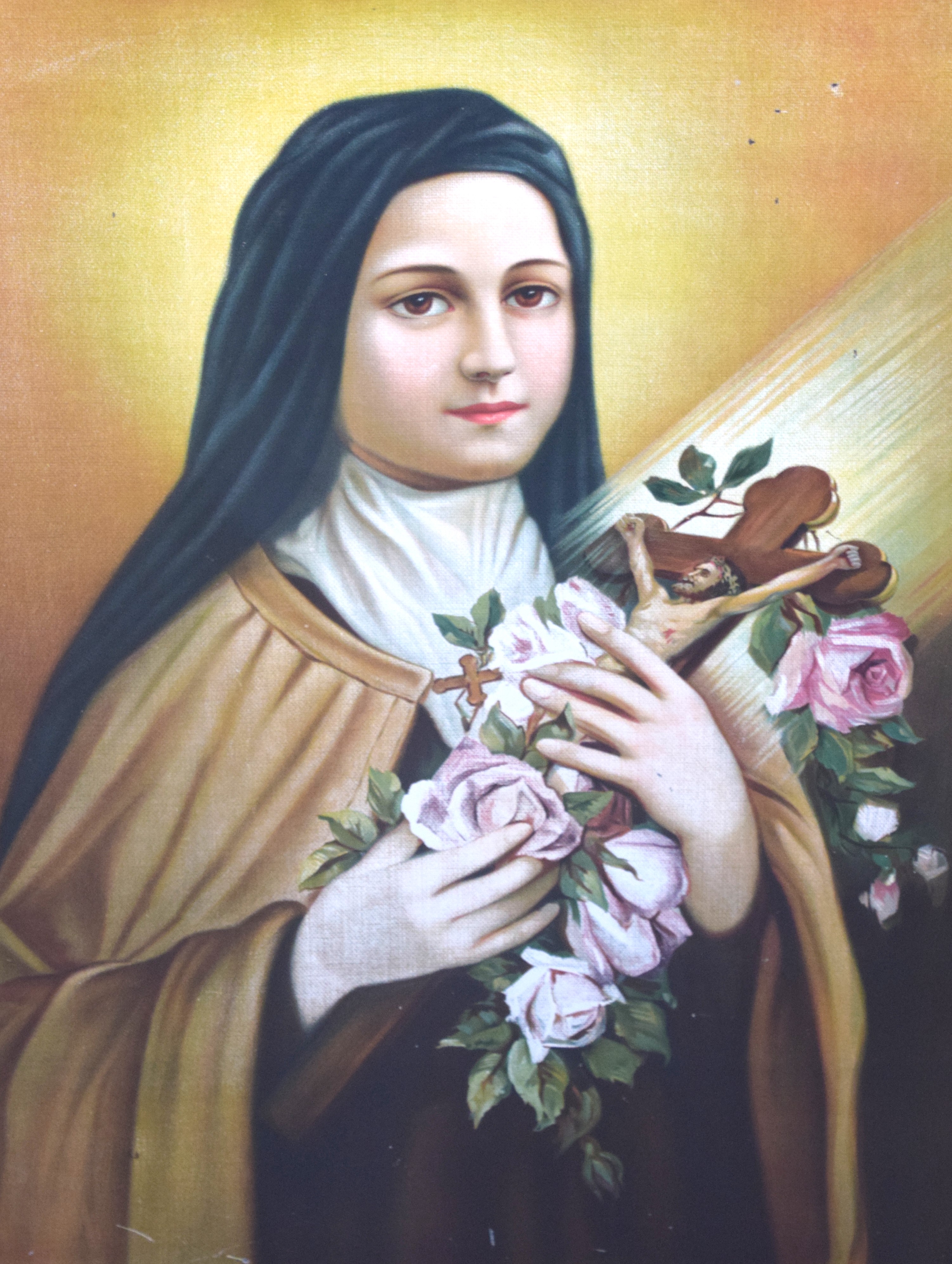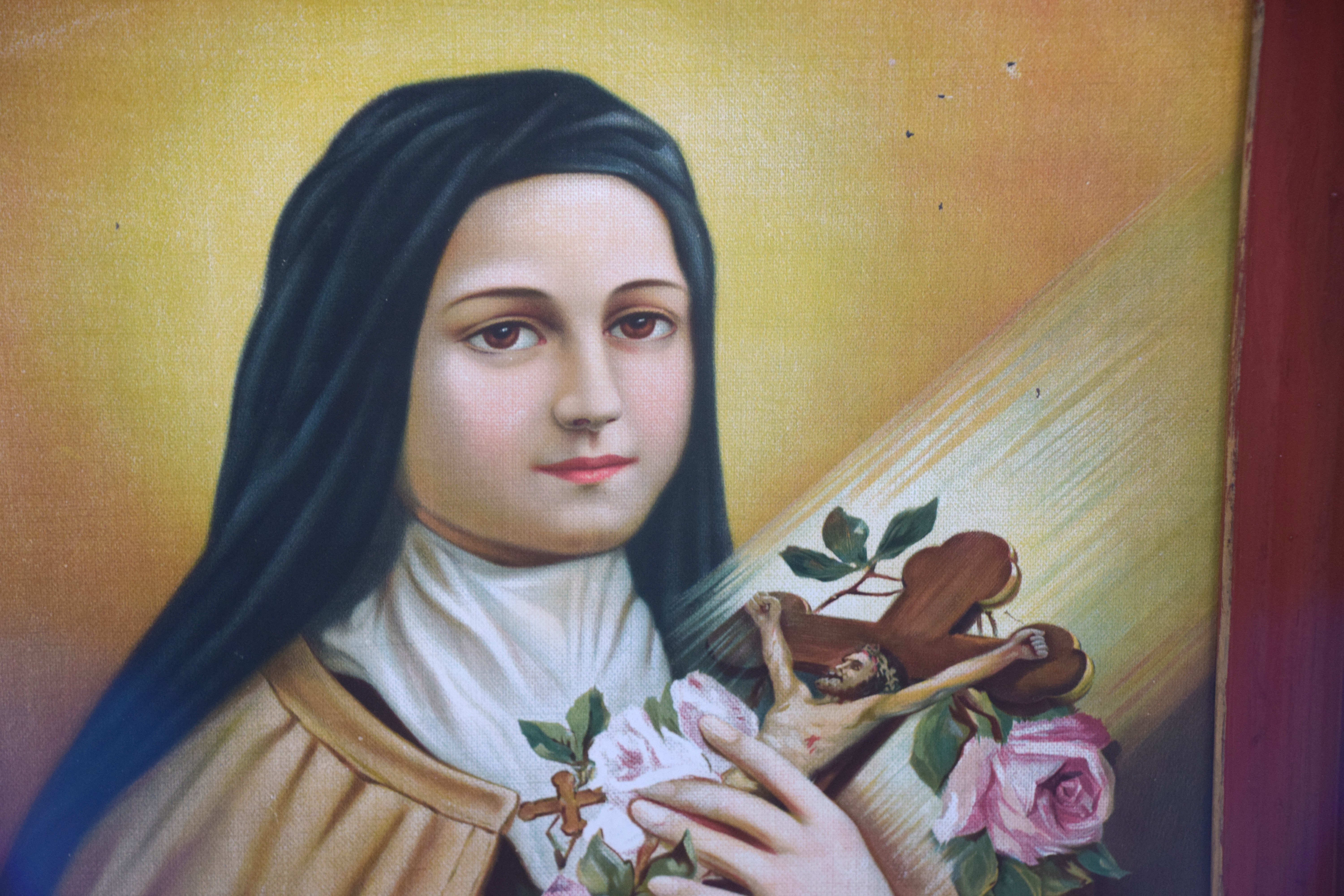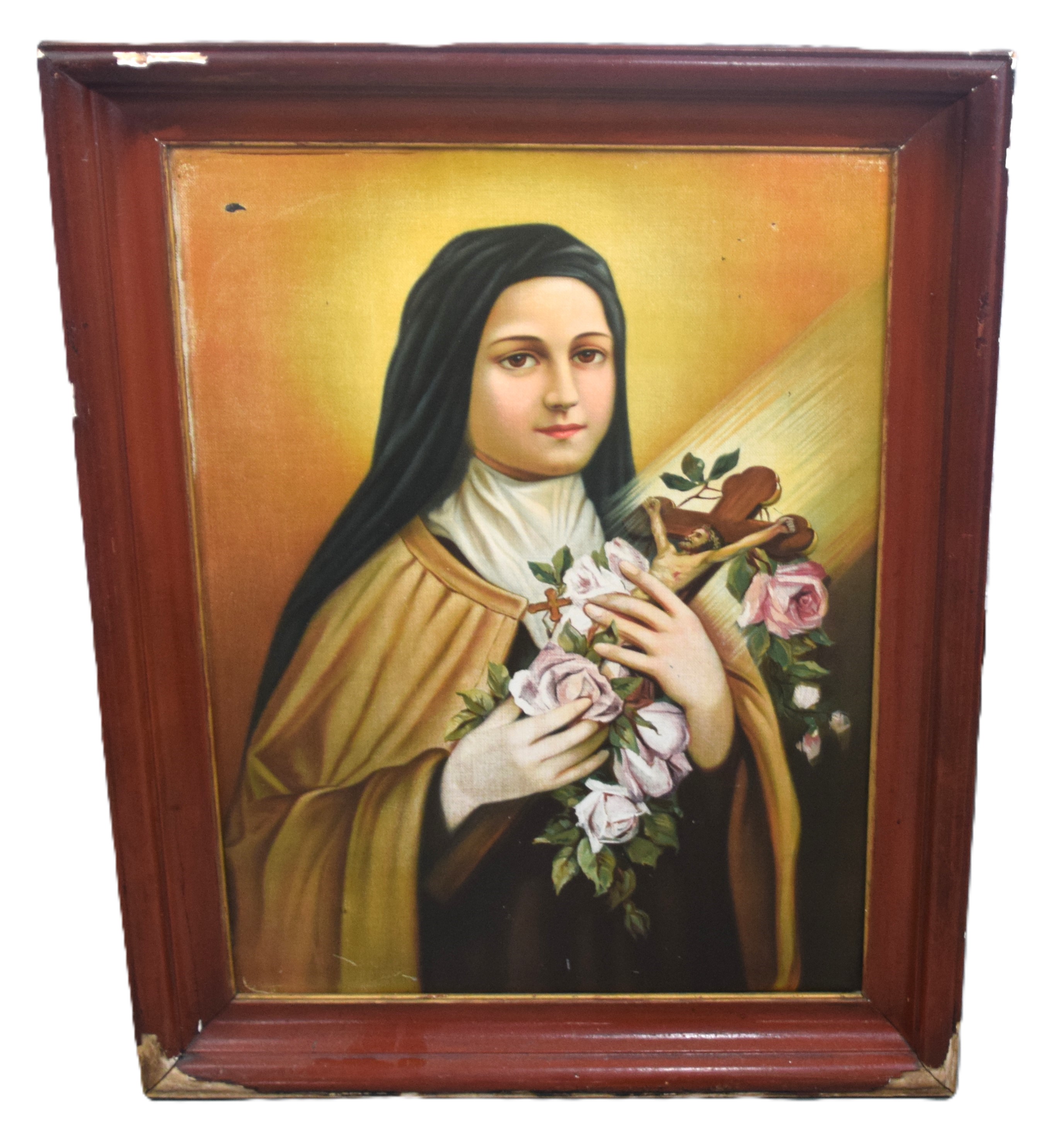 Framed religious oil painting on tin of Saint Theresa of Lisieux, know as the little flower. Dimensions: 23″ x 17″