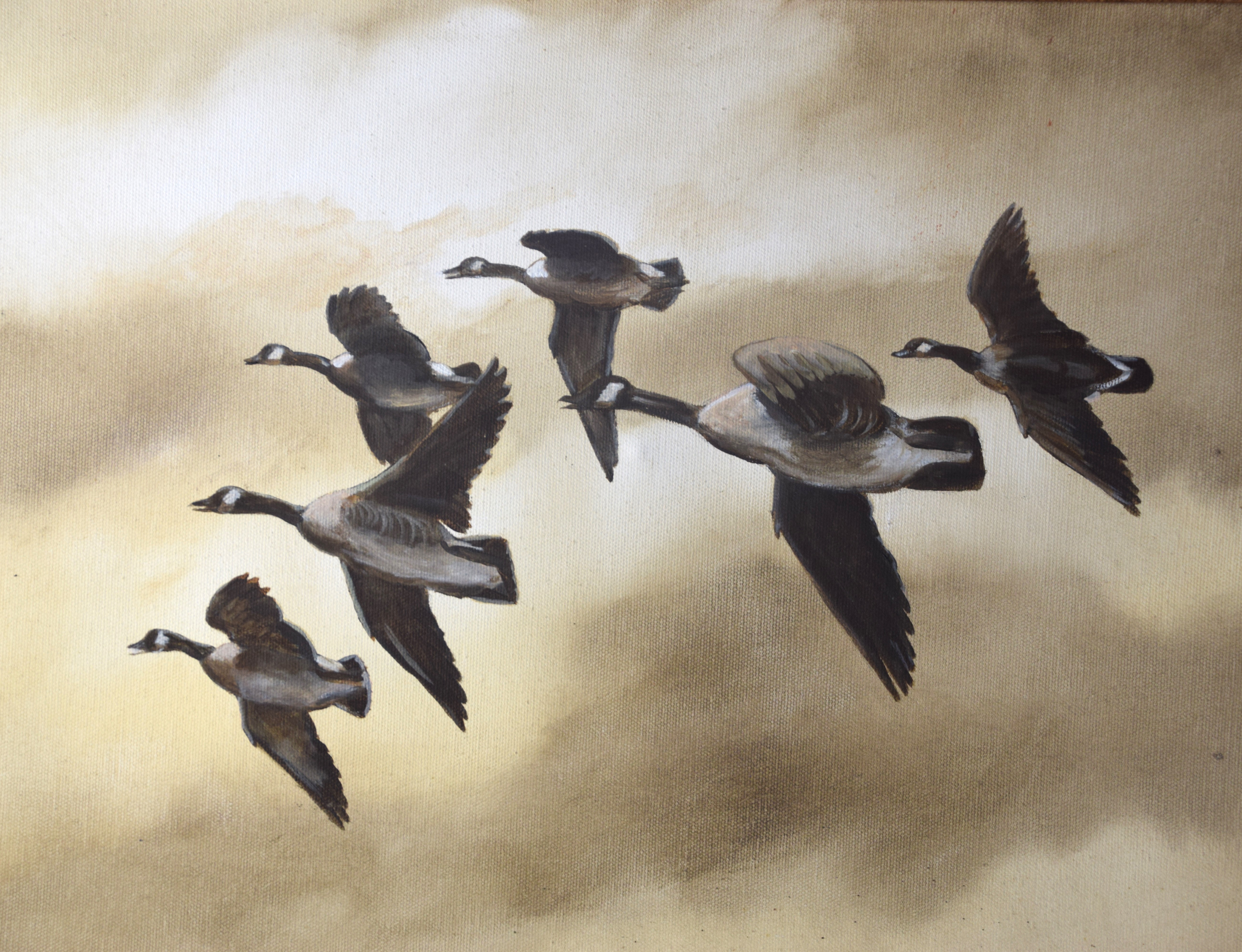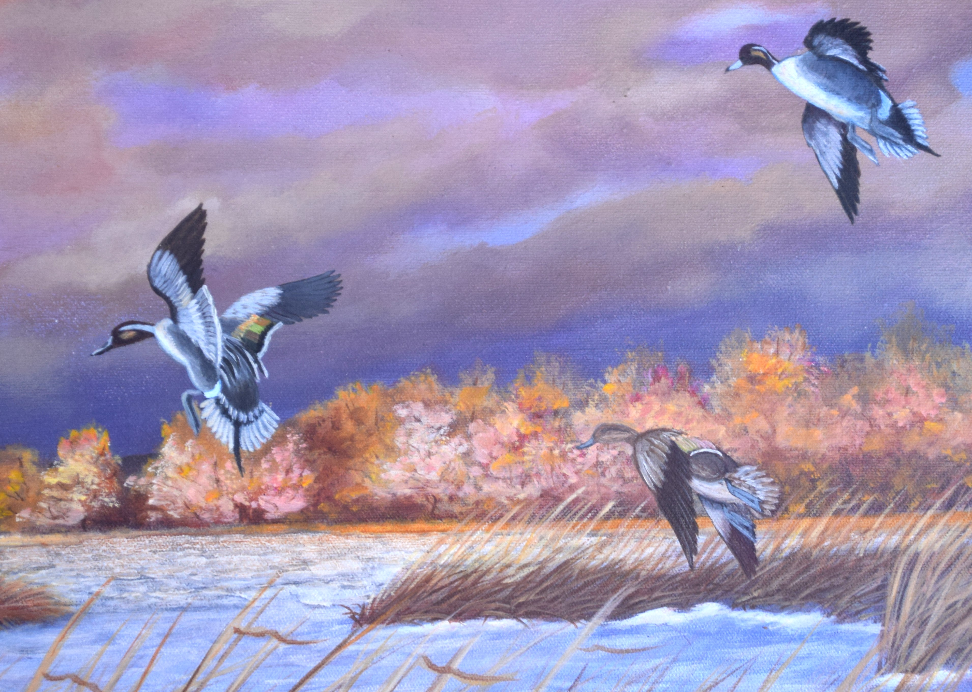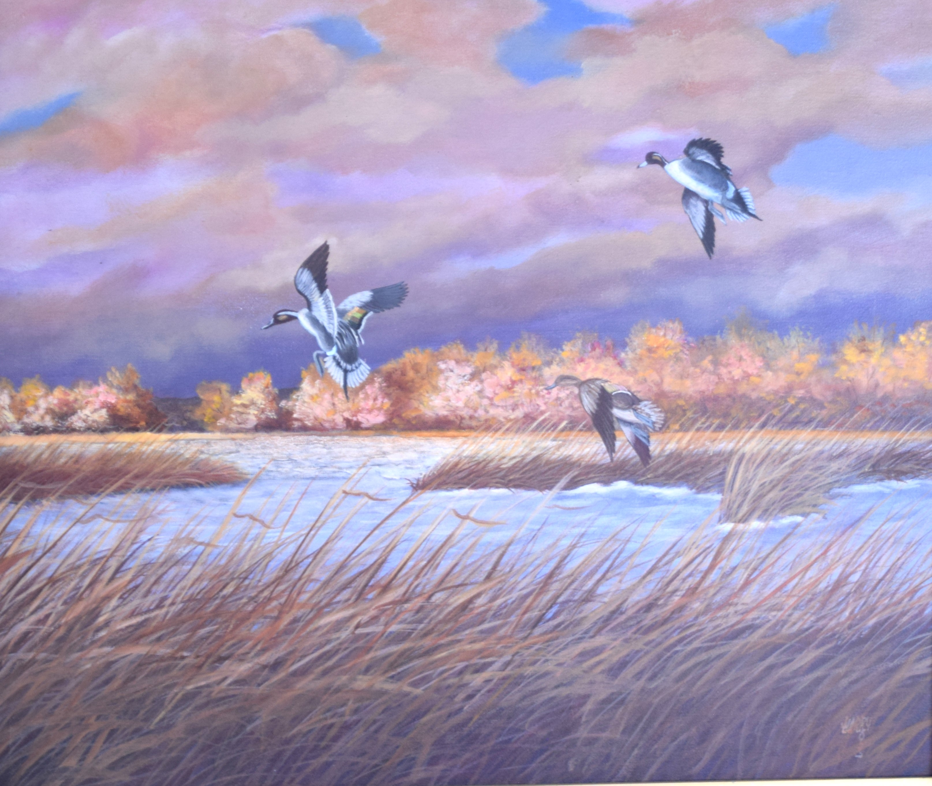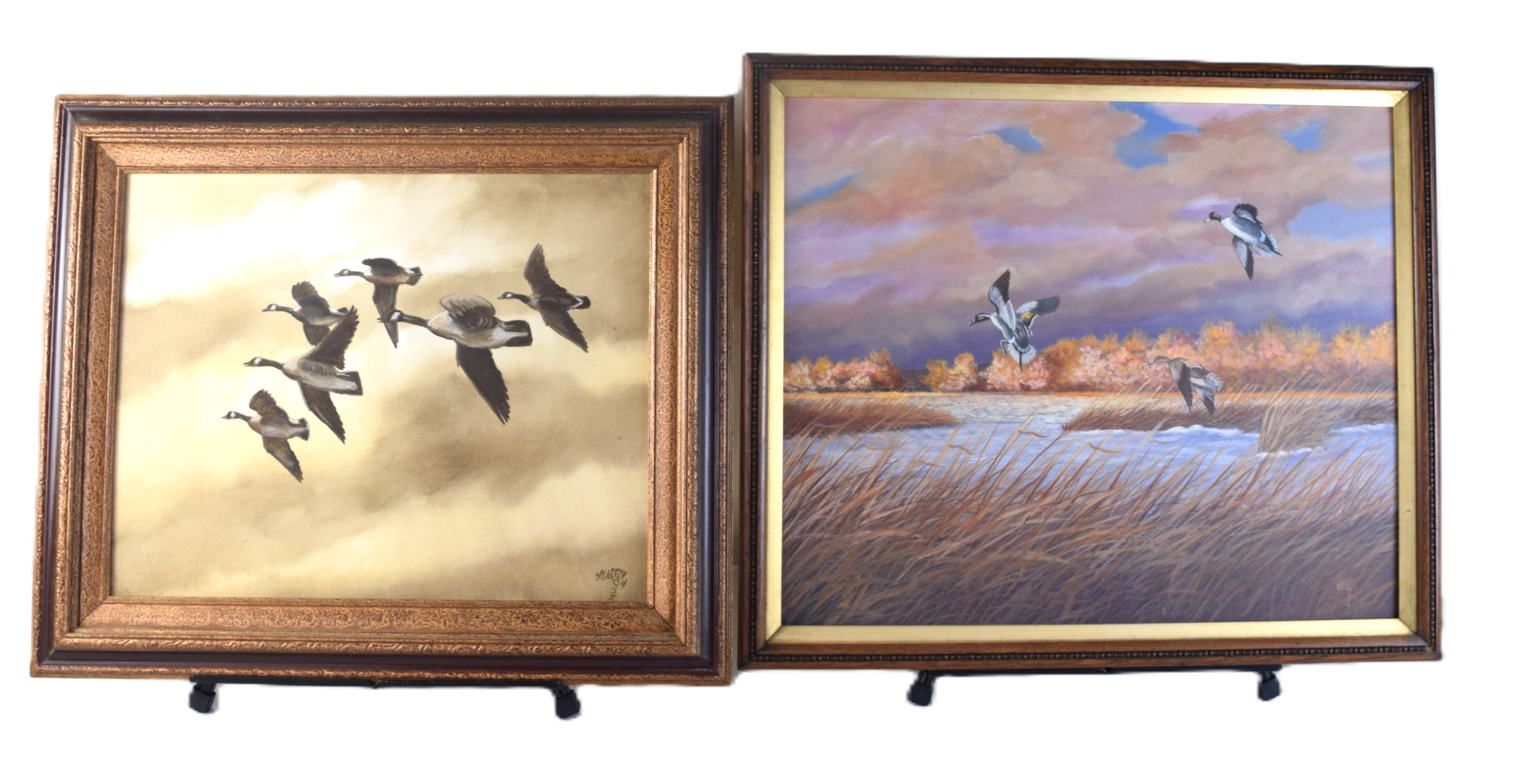 Framed, two signed Harry Ross oil on canvas paintings of ducks in a pond and geese in flight. Harry L. Ross (mid 20th century) works in New York. Dimensions: 20″ x 23″ and 16″ x 19″