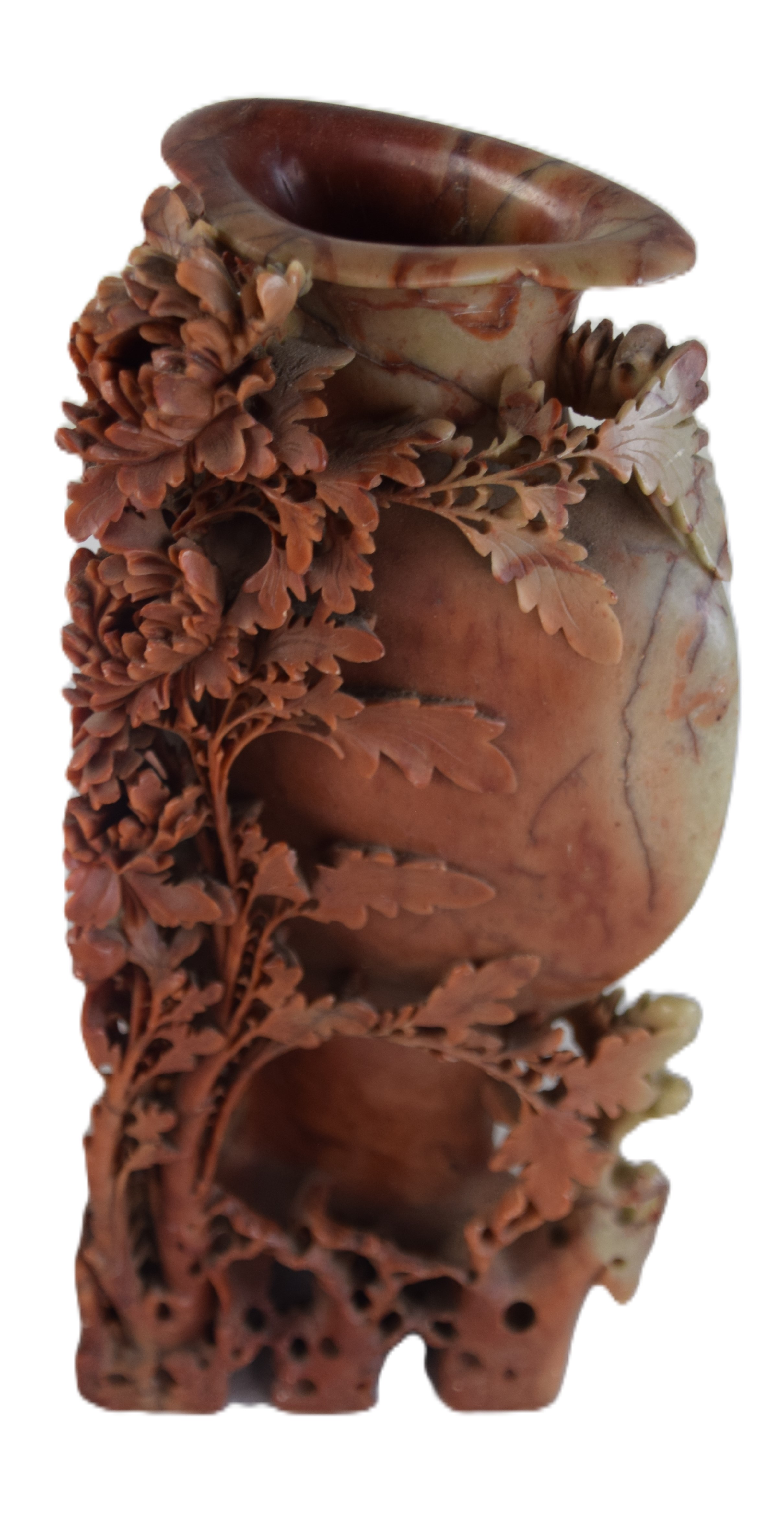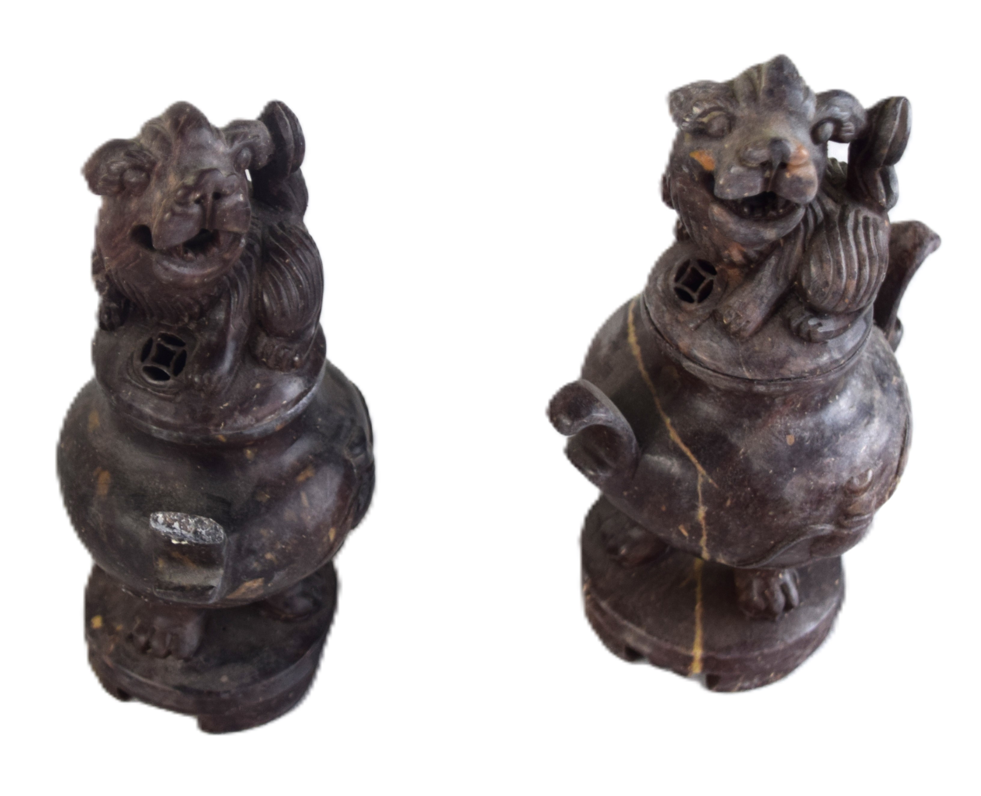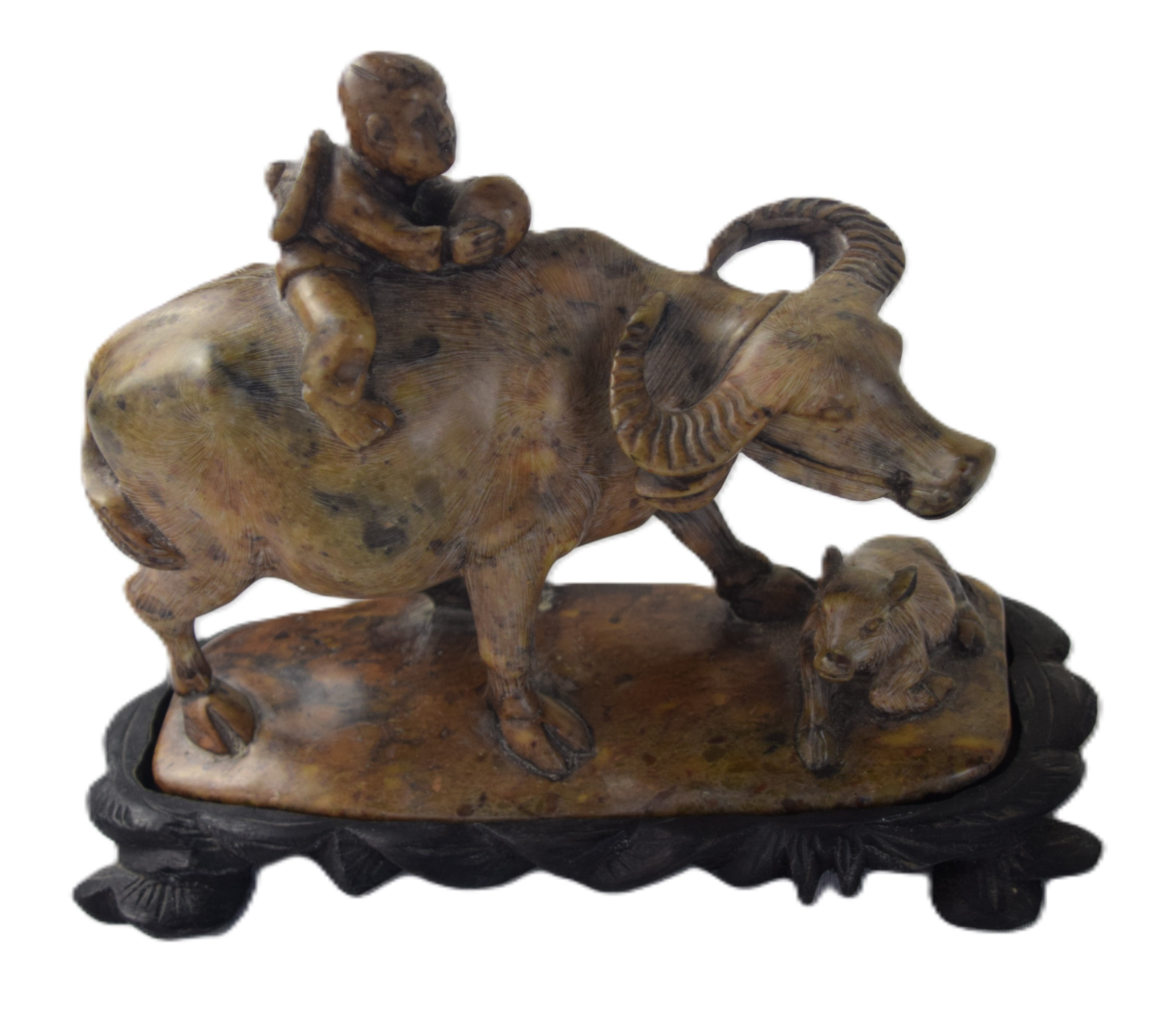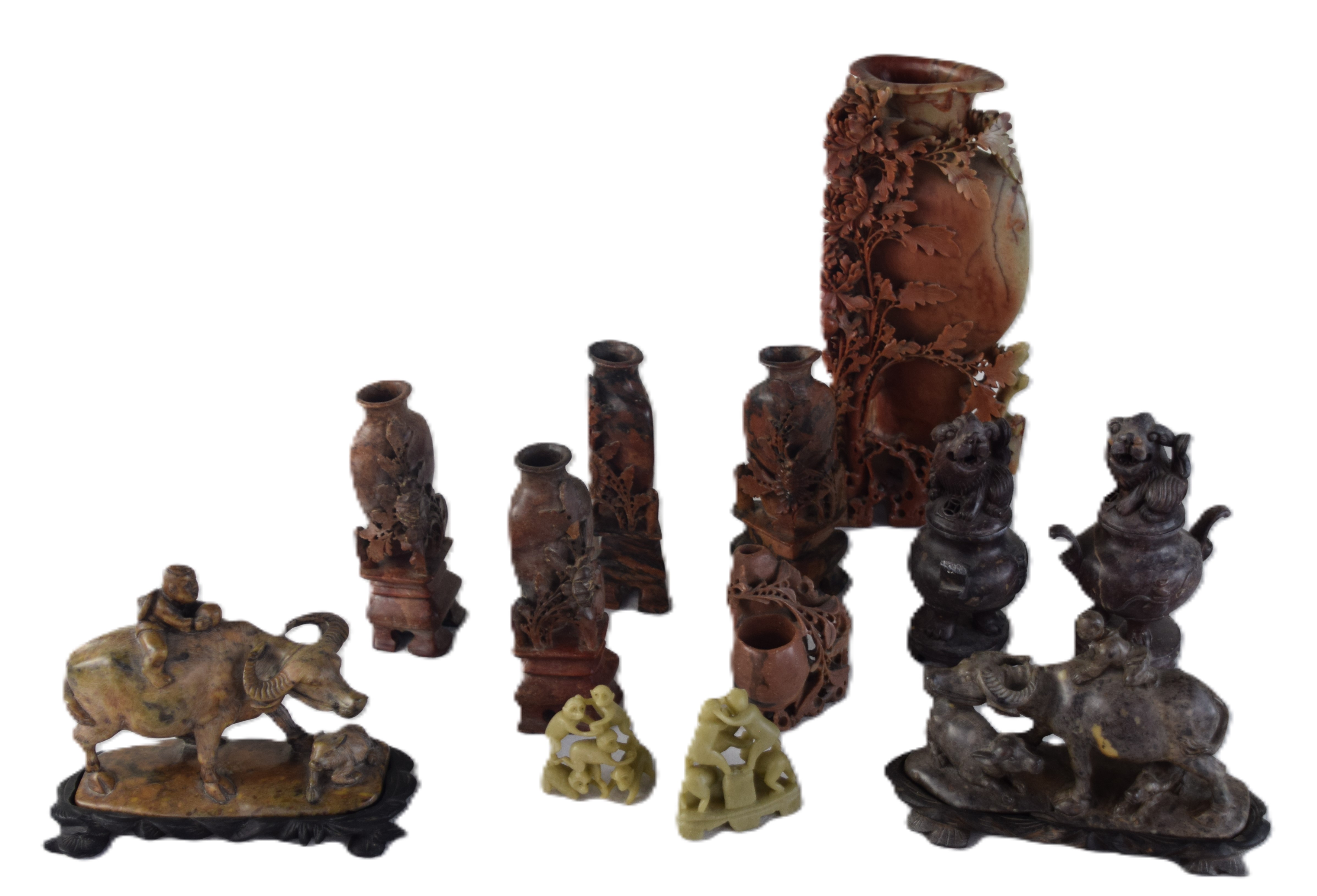 12 Piece oriental soapstone lot of carvings to include large floral decorated vase (11″ H); pair of covered urns with foo dog finials (6.5″ H); two figures of oriental child riding water buffalos on teakwood bases (7″L); soapstone vase (4″ H); pair of soapstone carved vases with applied flowers (7″ H) two carved monkey sculptures (3″ and 3.5″ H); single carved soapstone vase (6.5″ H)