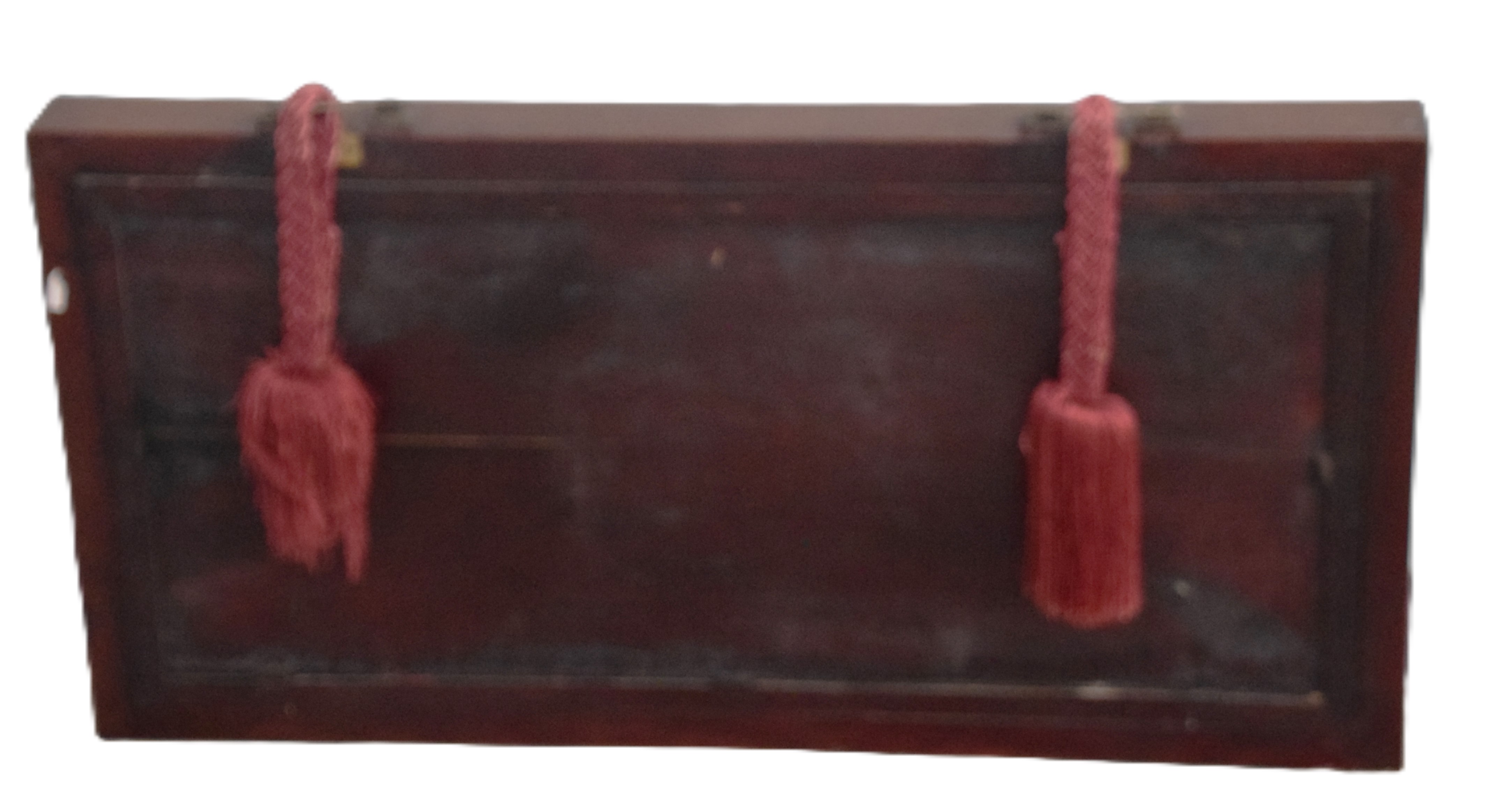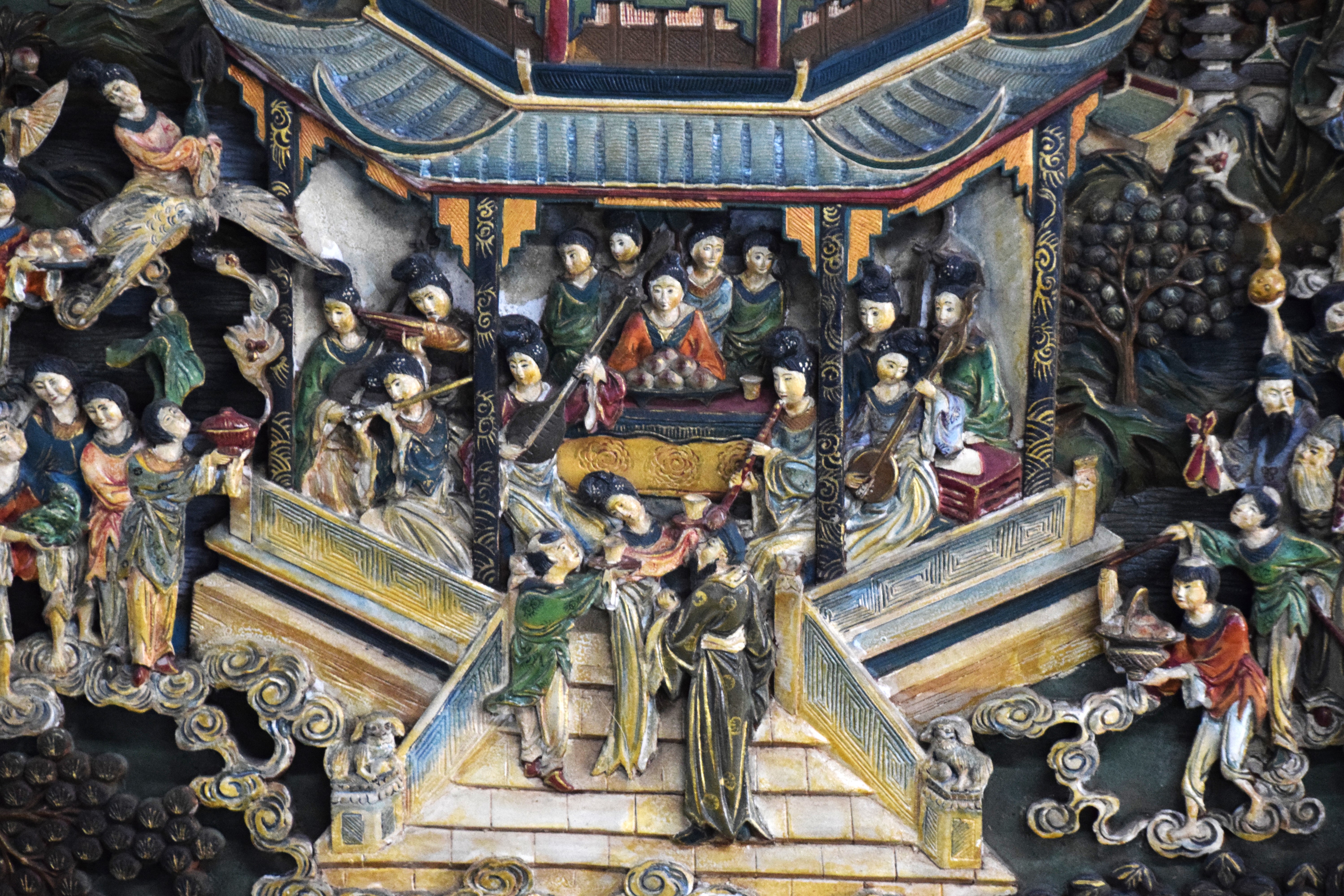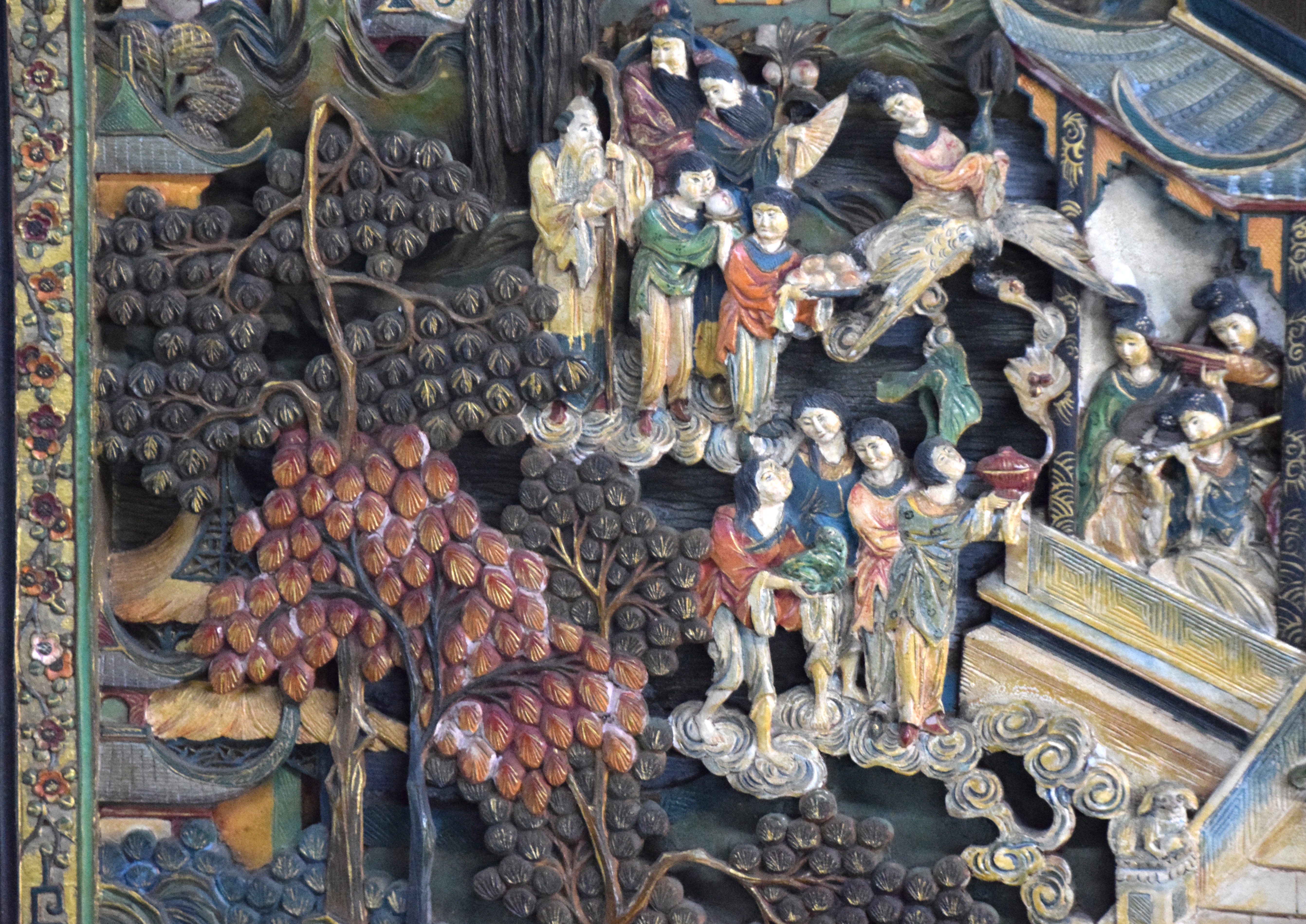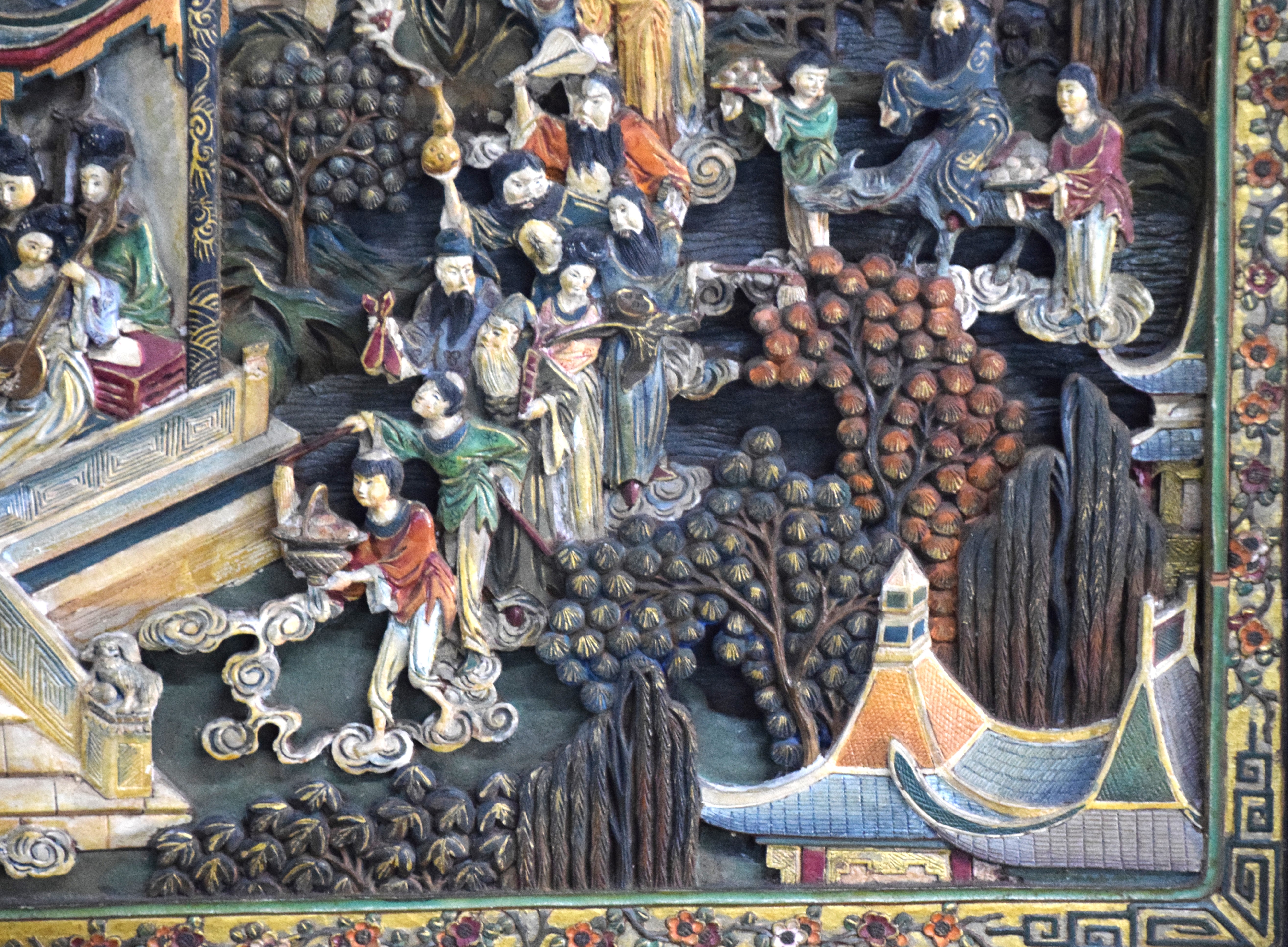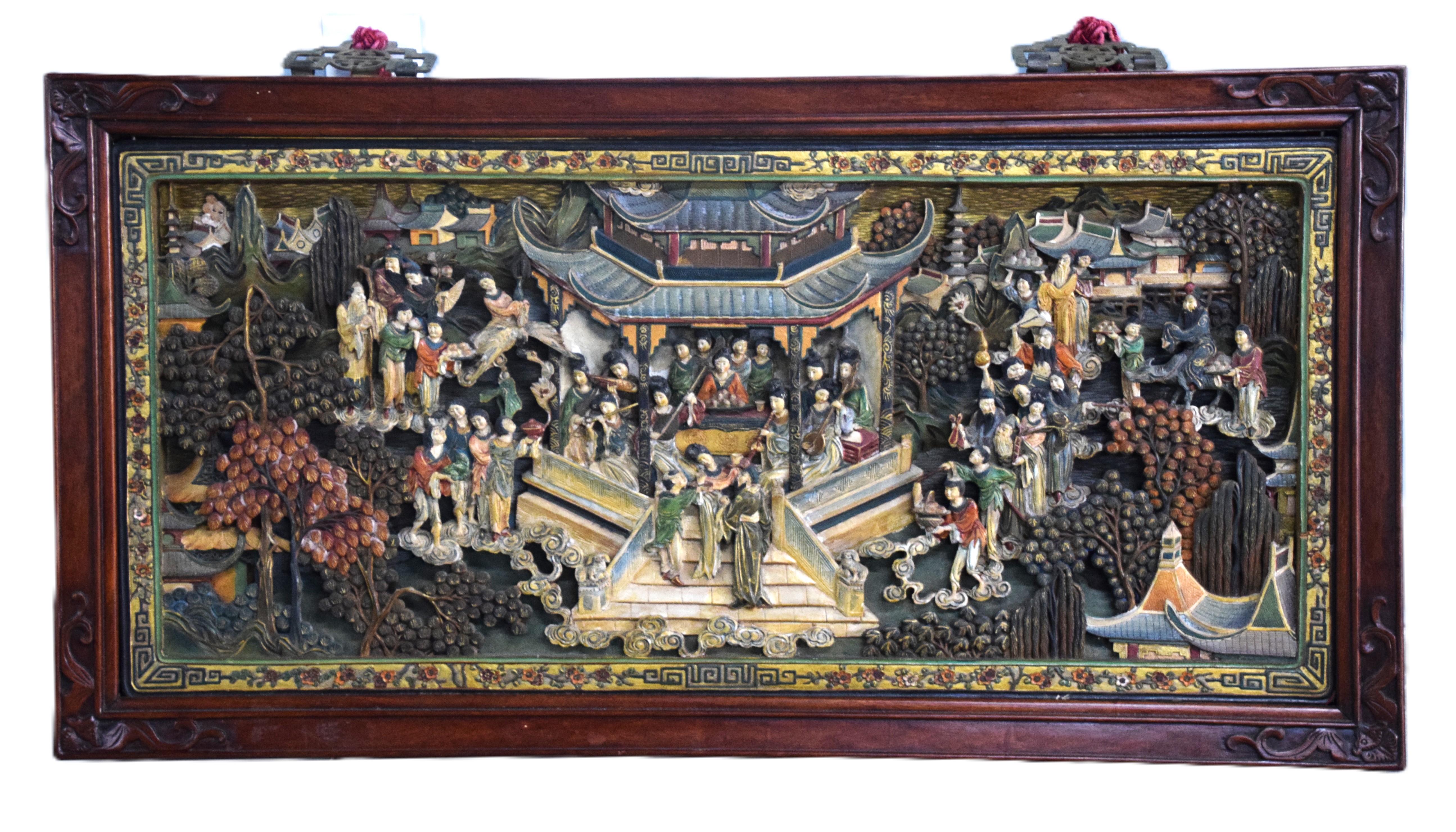 Large framed polychrome carved Asian village with multiple scenes. Very intricate carvings. Dimensions: 21″ x 39″ Overall size