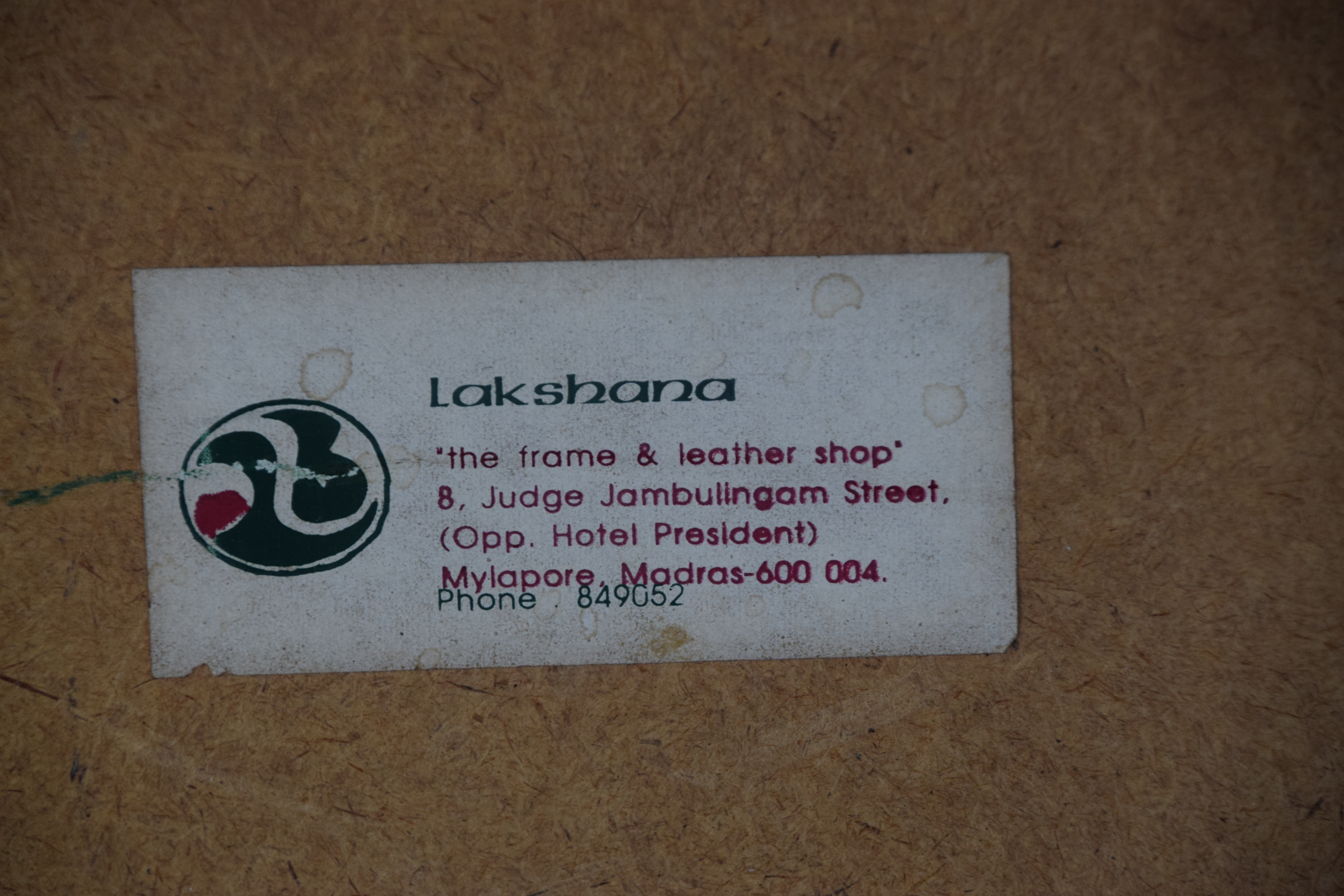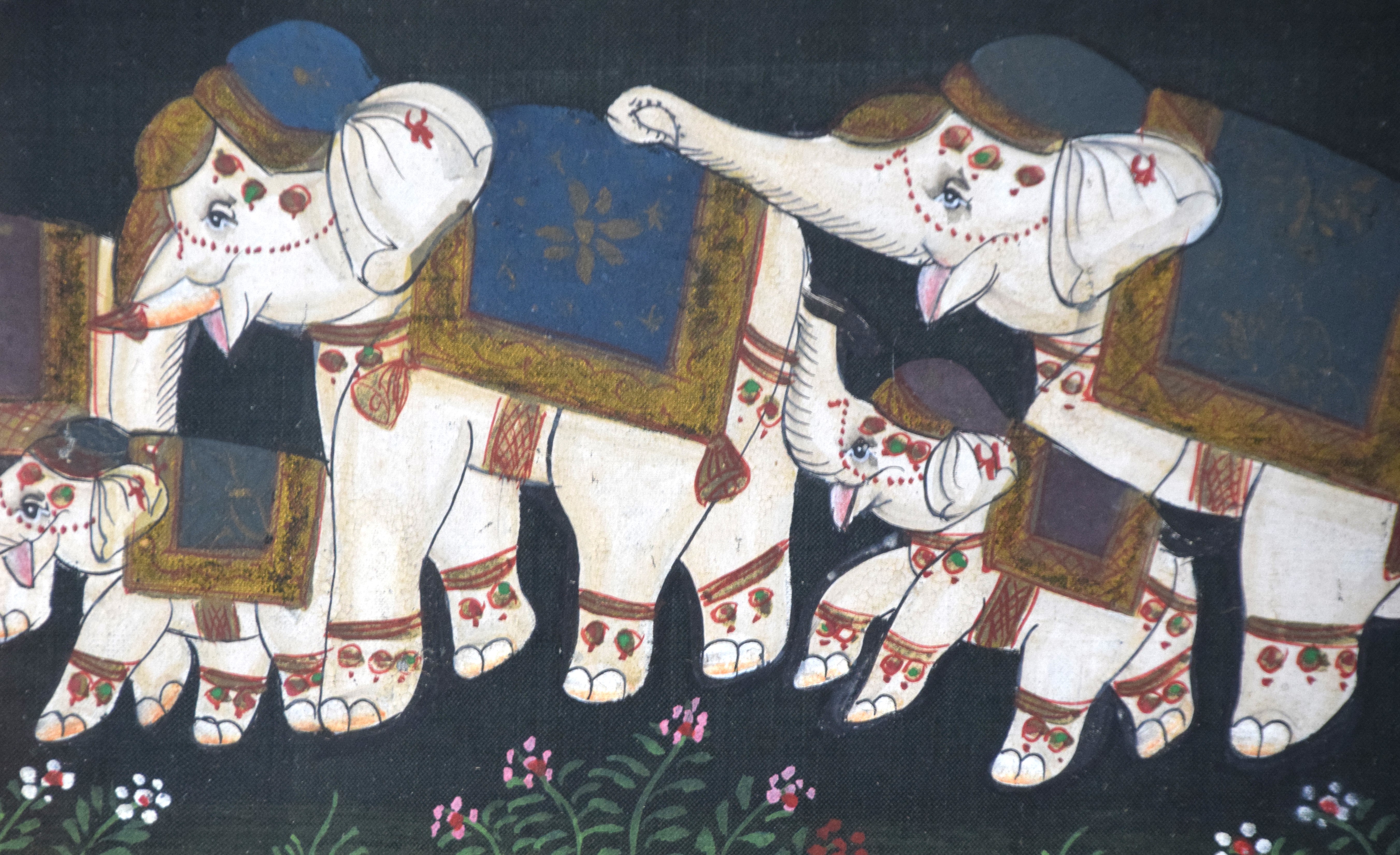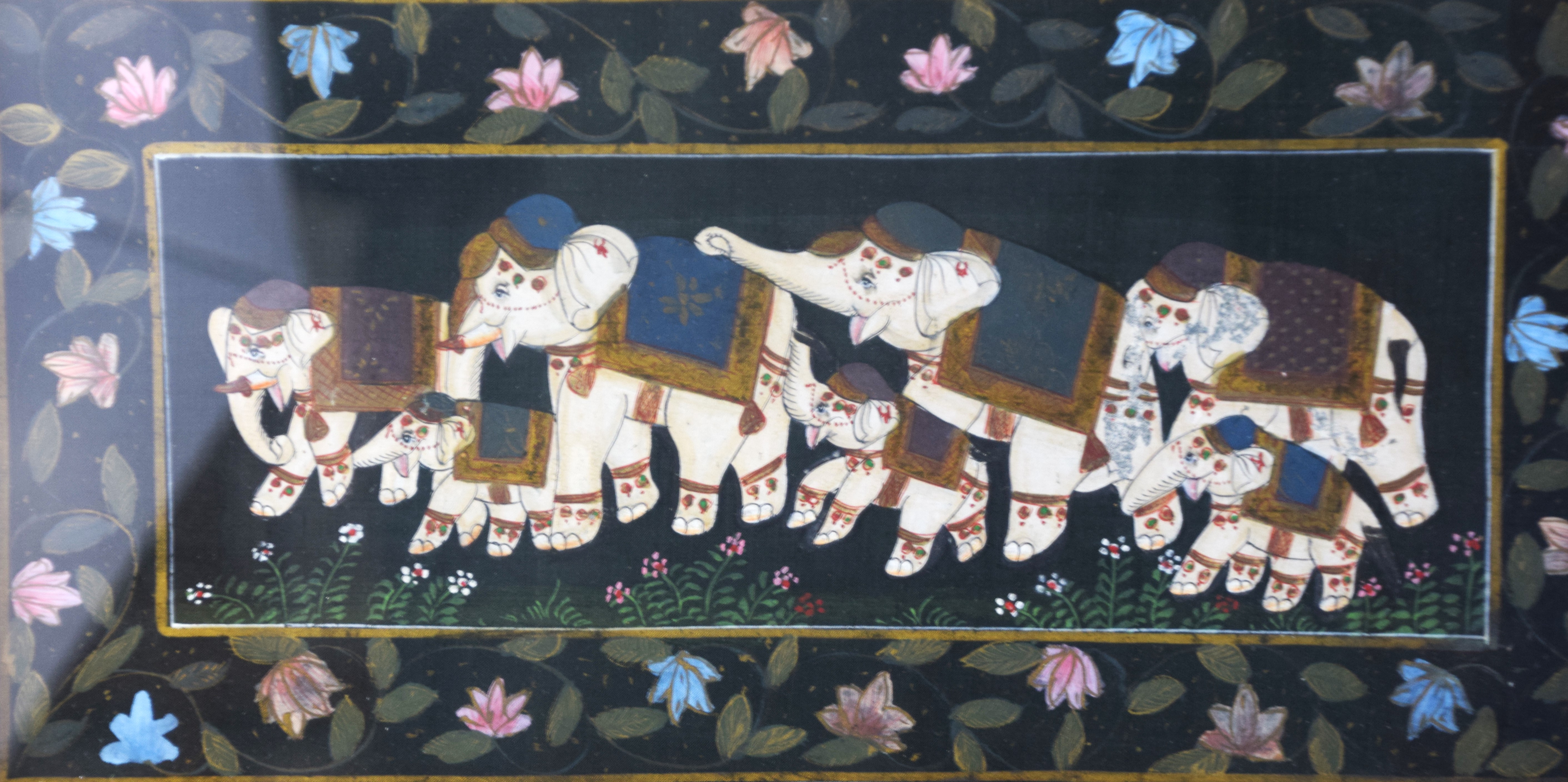 Framed artwork of Indian elephants surrounded by a border of flowers. Dimensions: 7″ x 13.5″