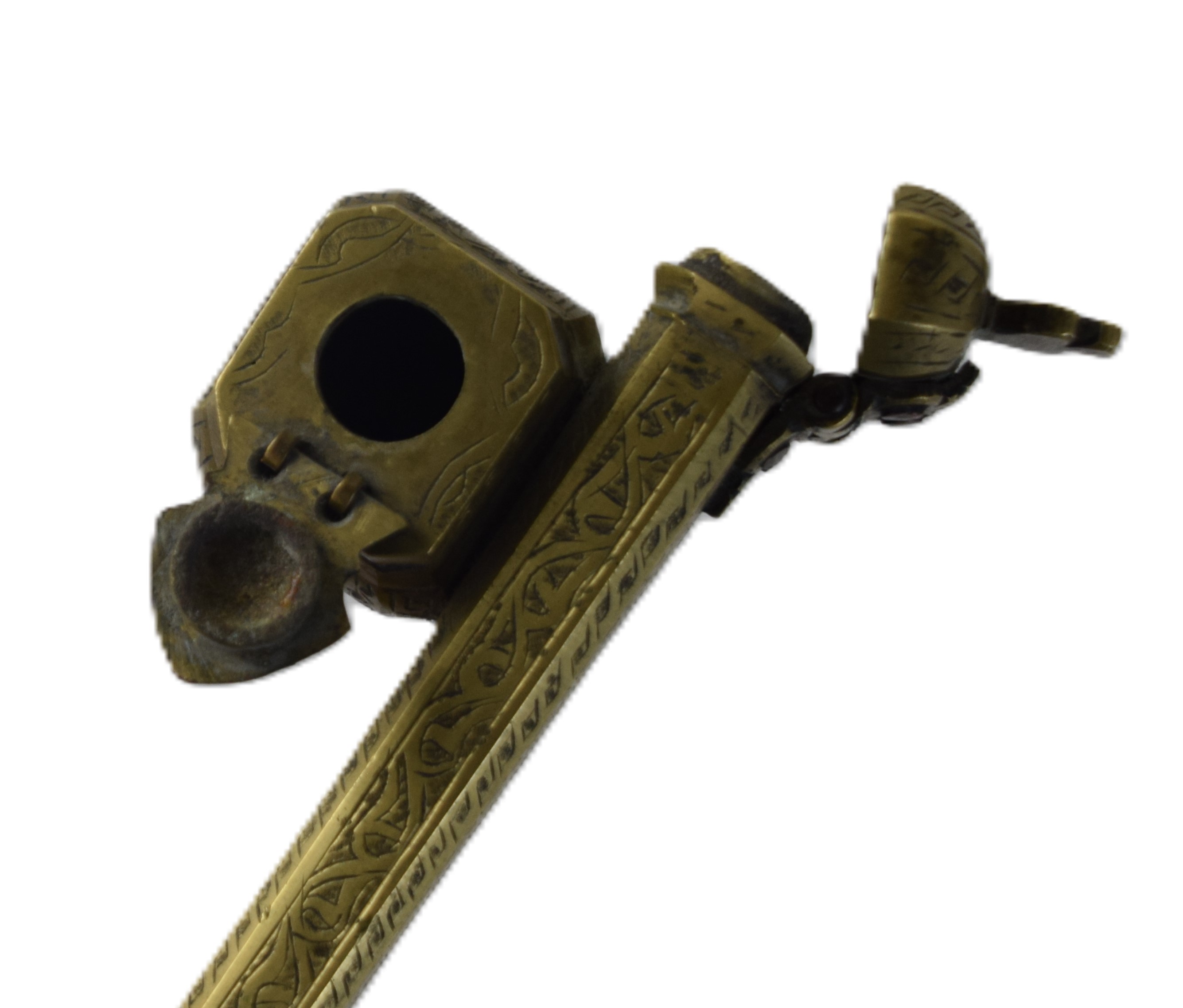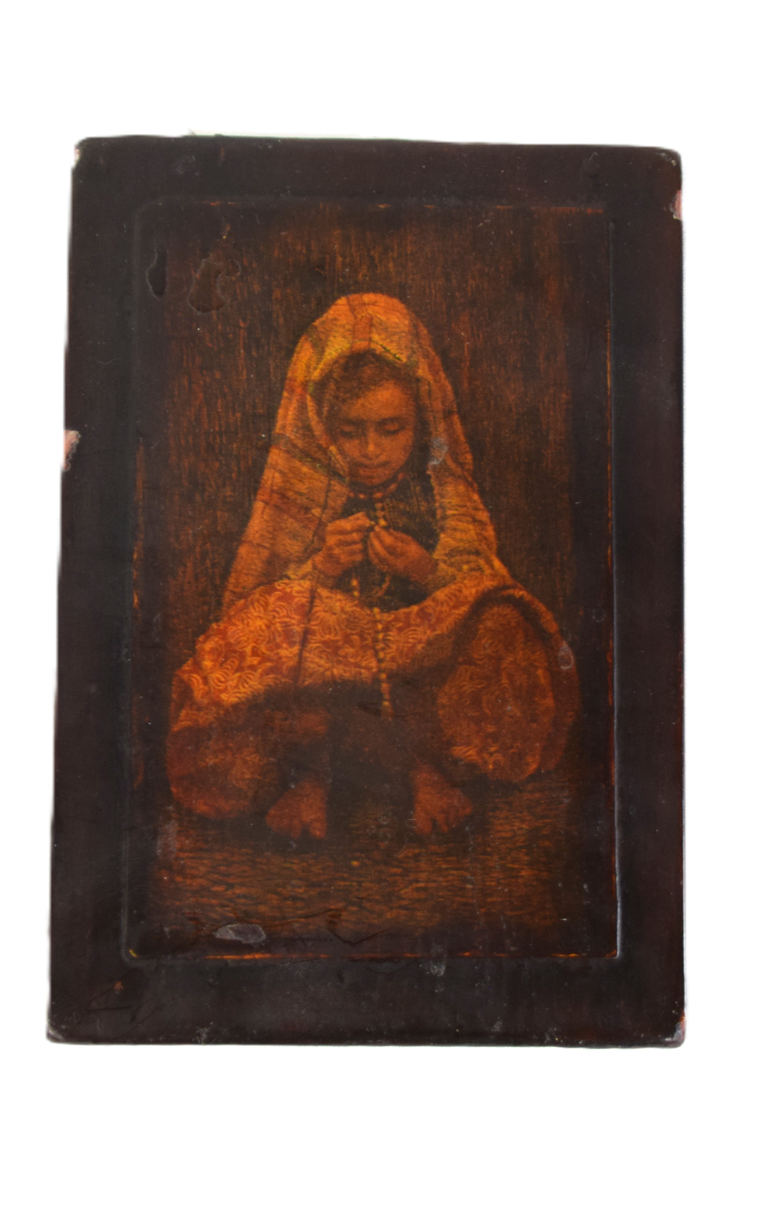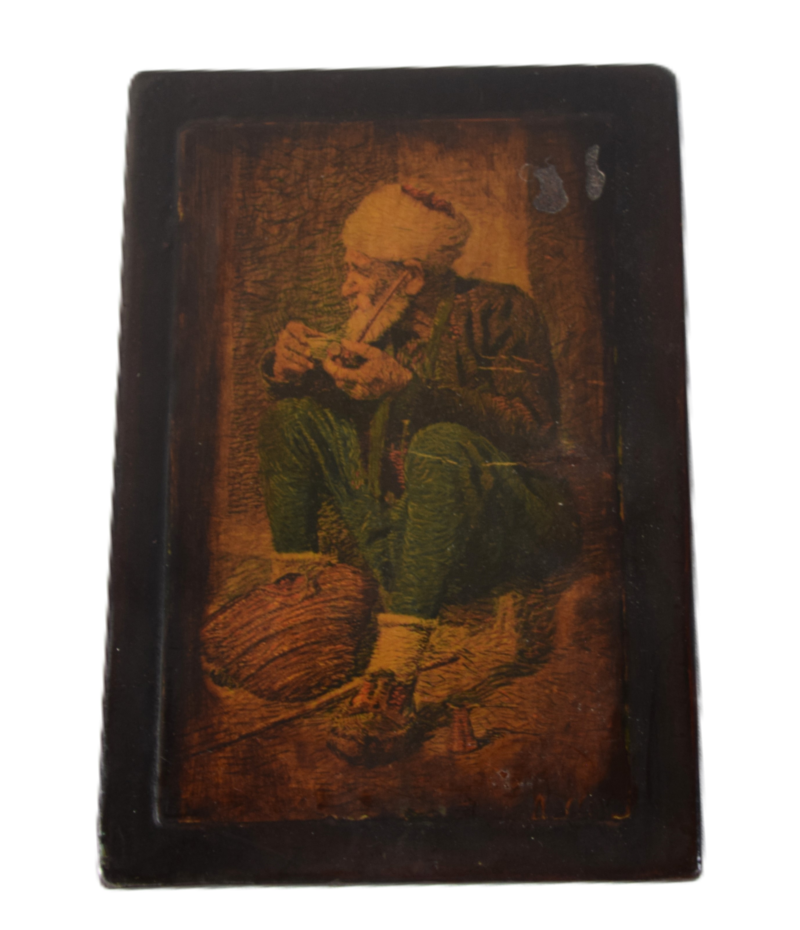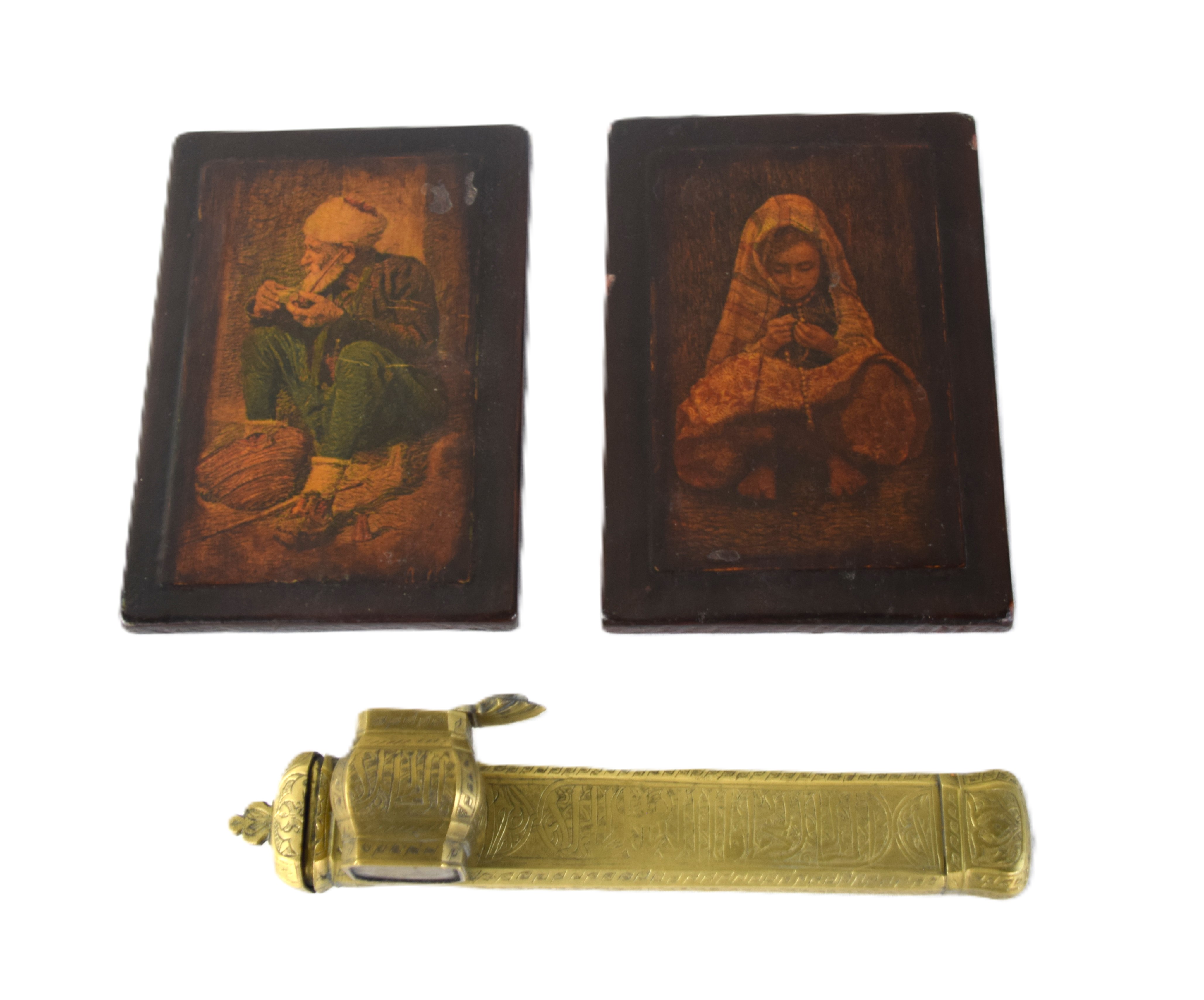 Pair of painted on wood of an older gentleman smoking a pipe and a lady praying with a rosary (6.5″ x 4.5″). Also included is a interesting embossed incense burner (8″ L)
