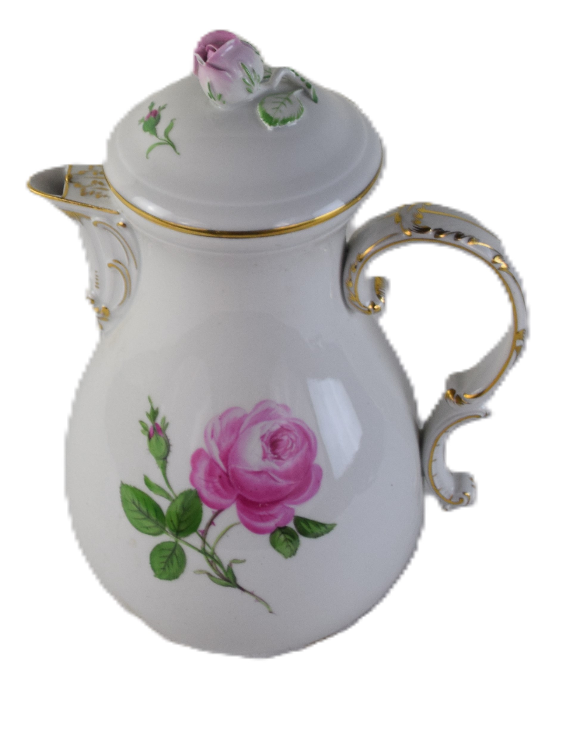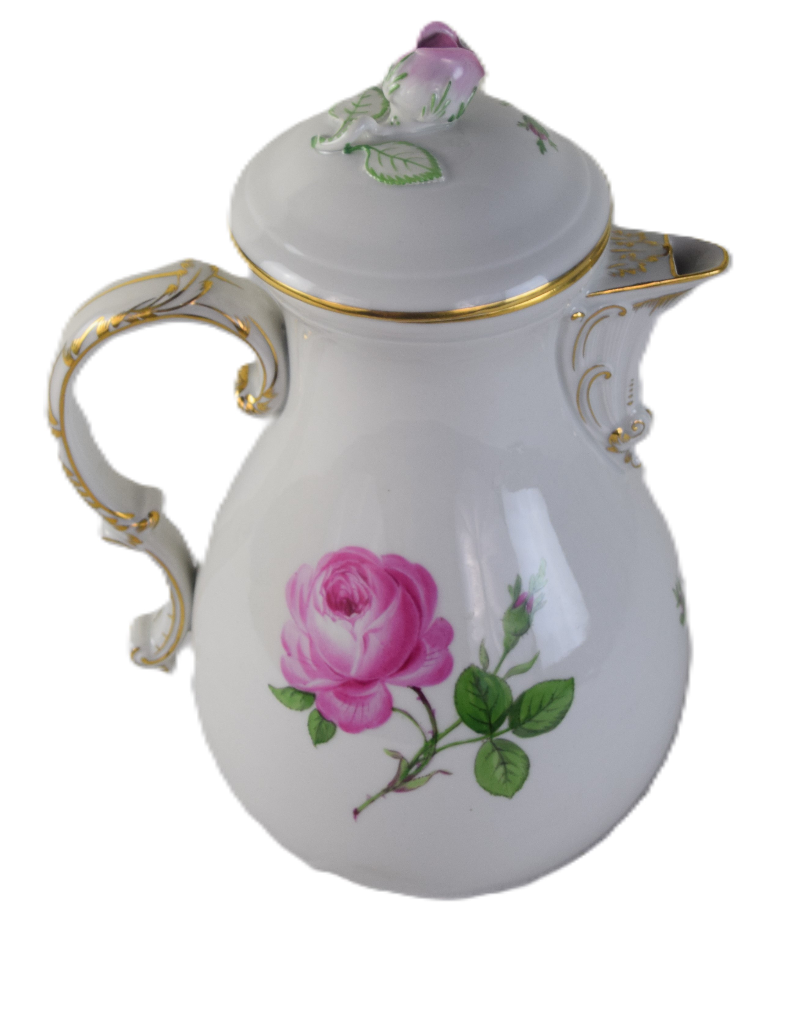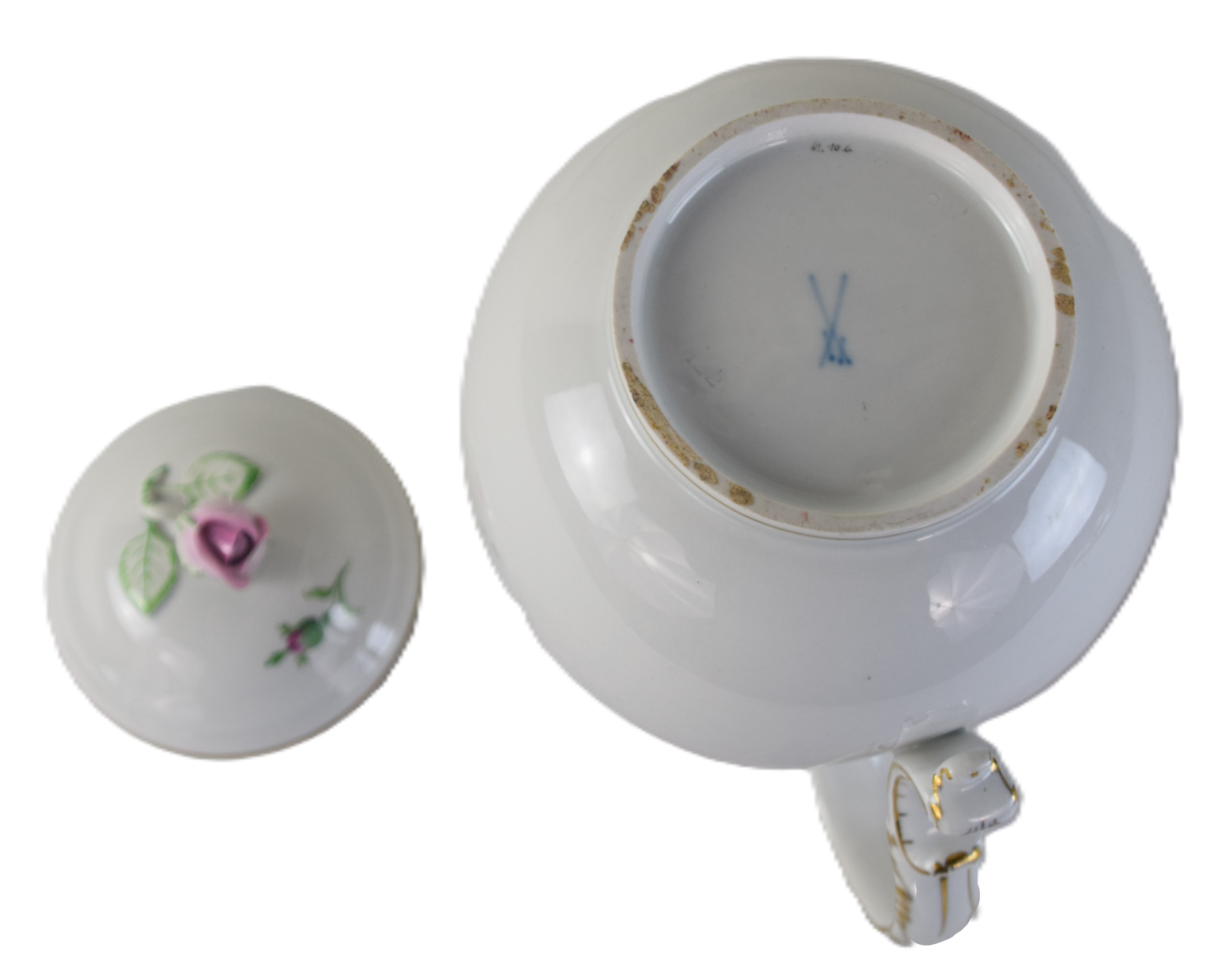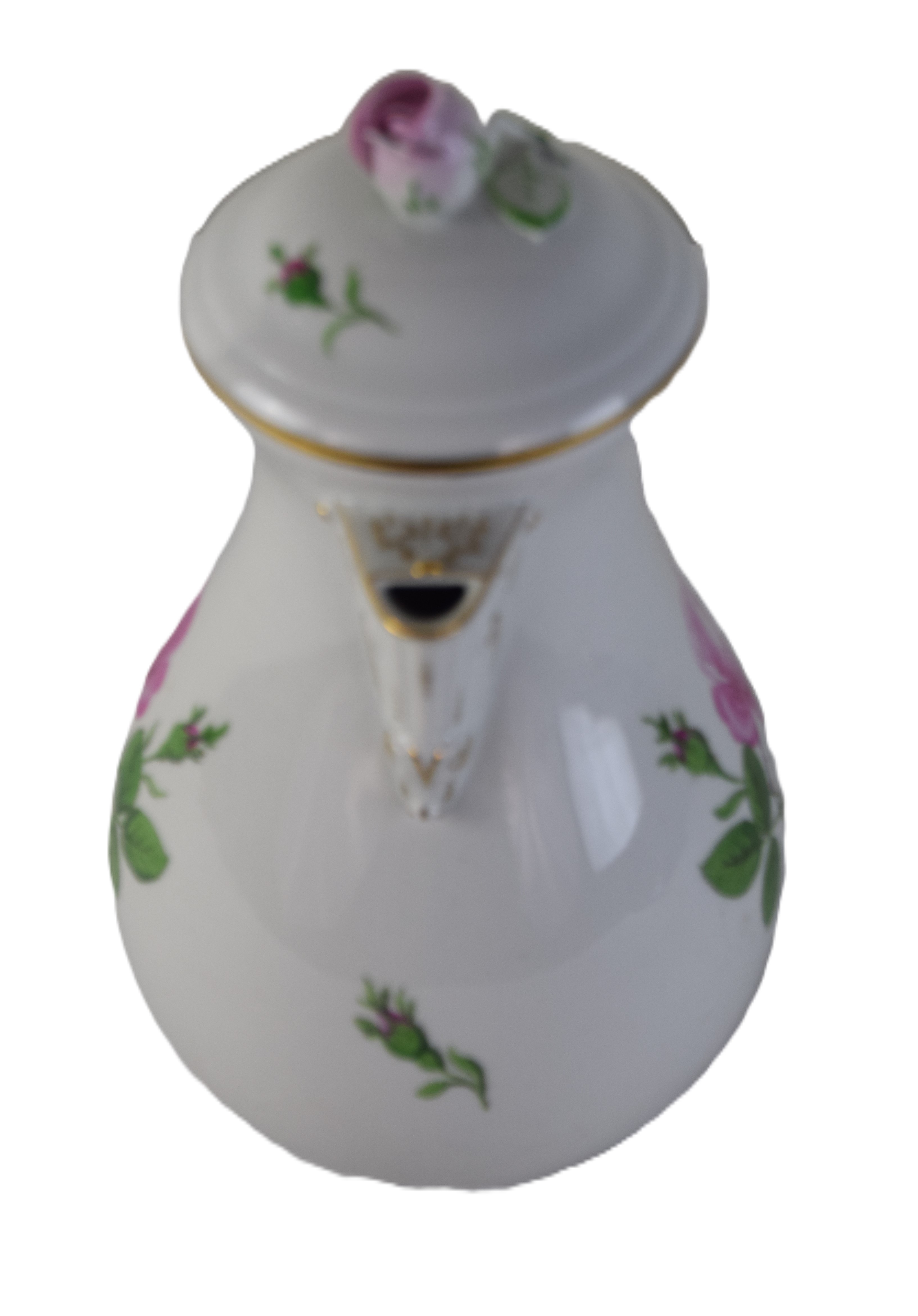 Very good Meissen porcelain coffee/chocolate pot with lid, applied handle with floral decorations, blue cross swords. Dimensions: 11″ H