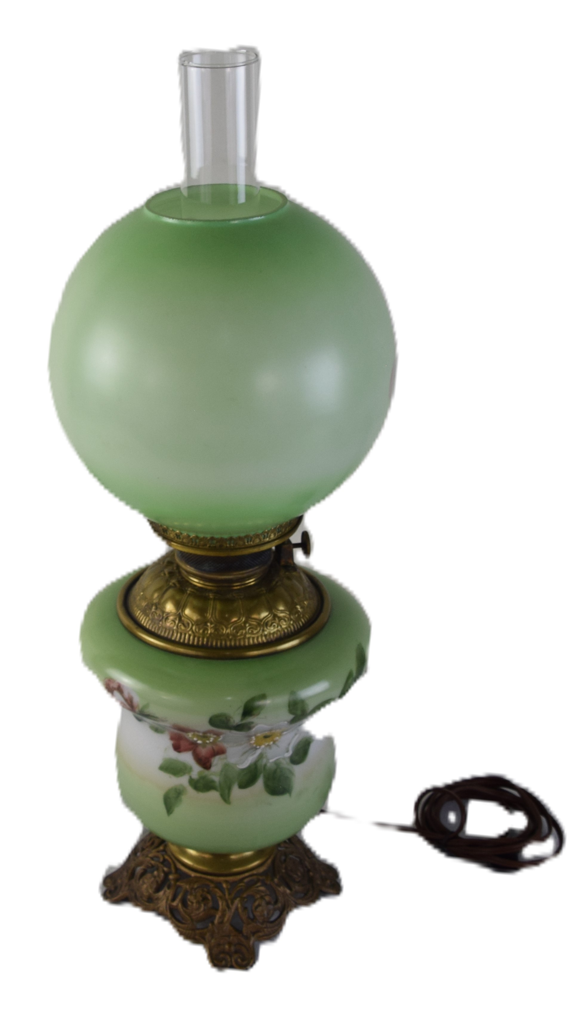 Gone With The Wind lamp with ball shade-floral hand painted decoration with brass font and brass base, complete with chimney. Dimensions: 26″H