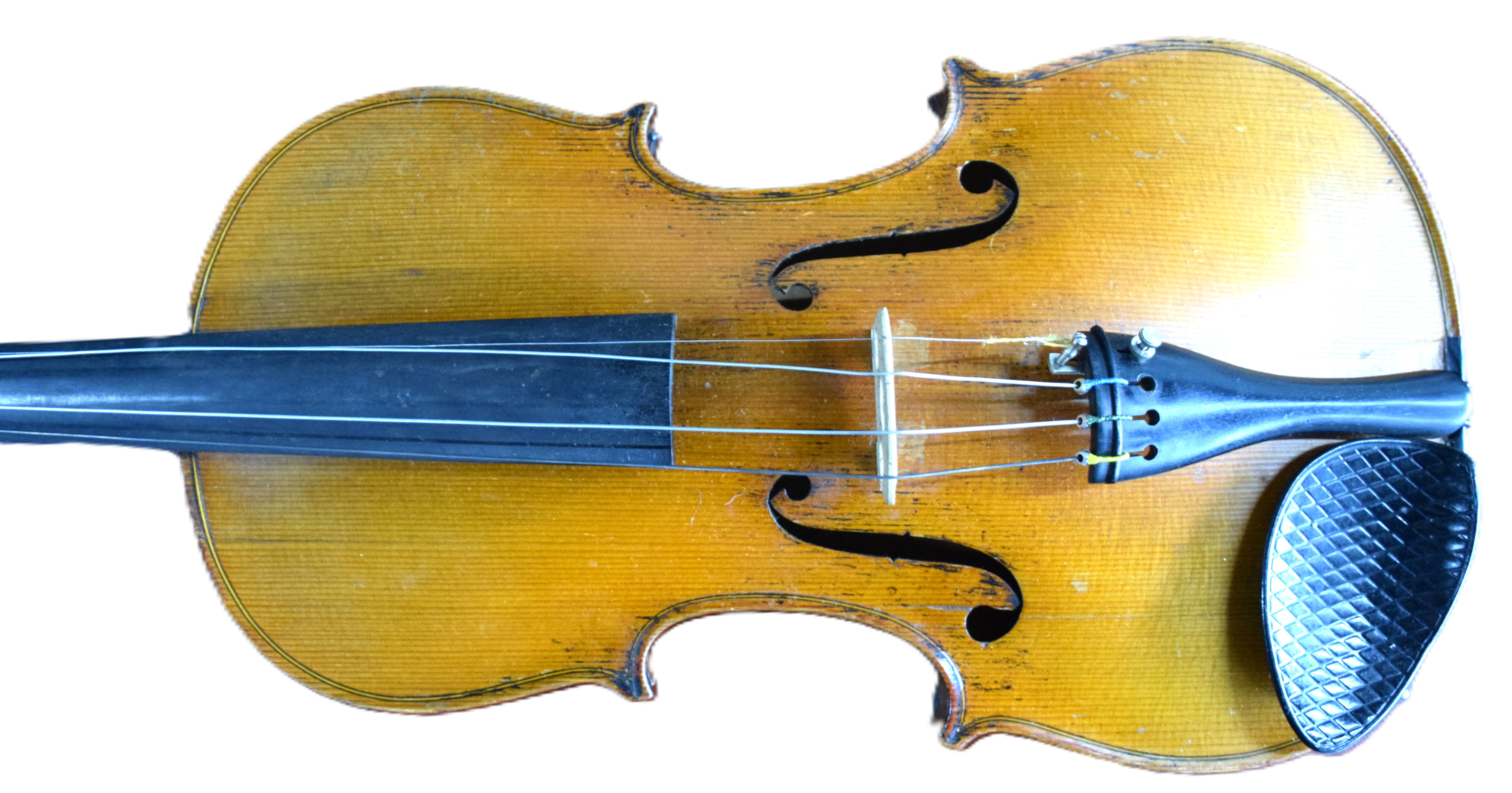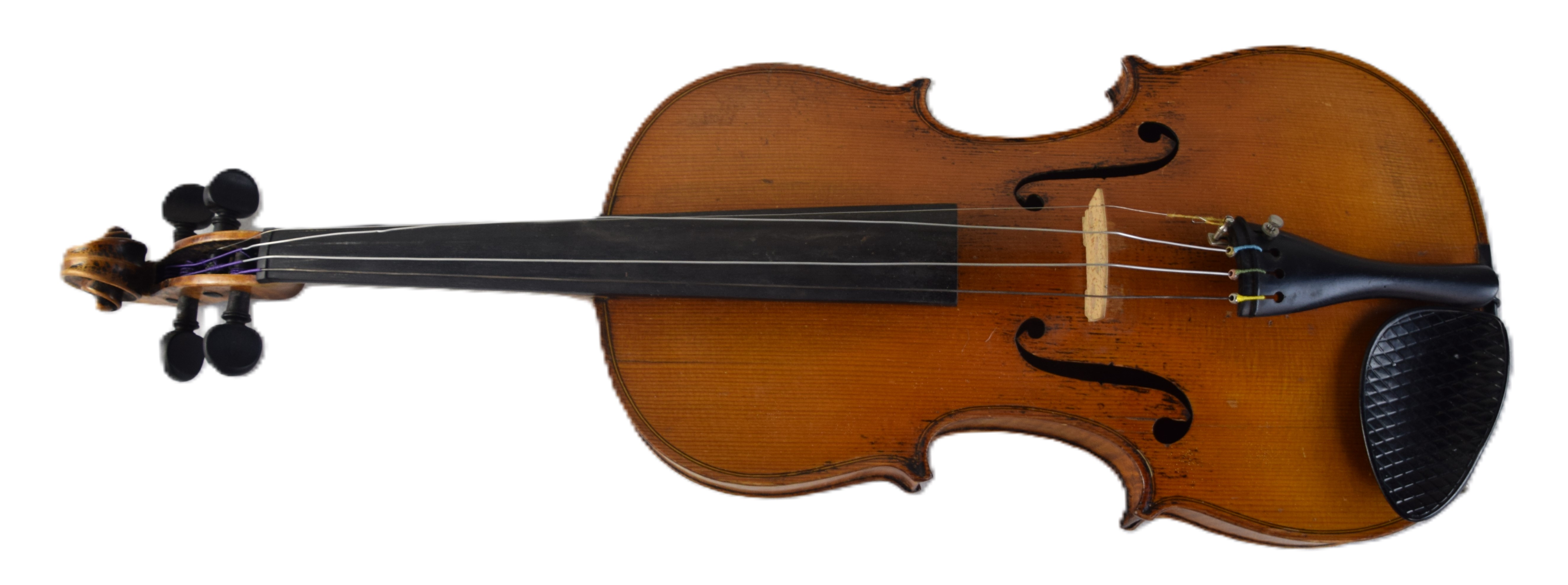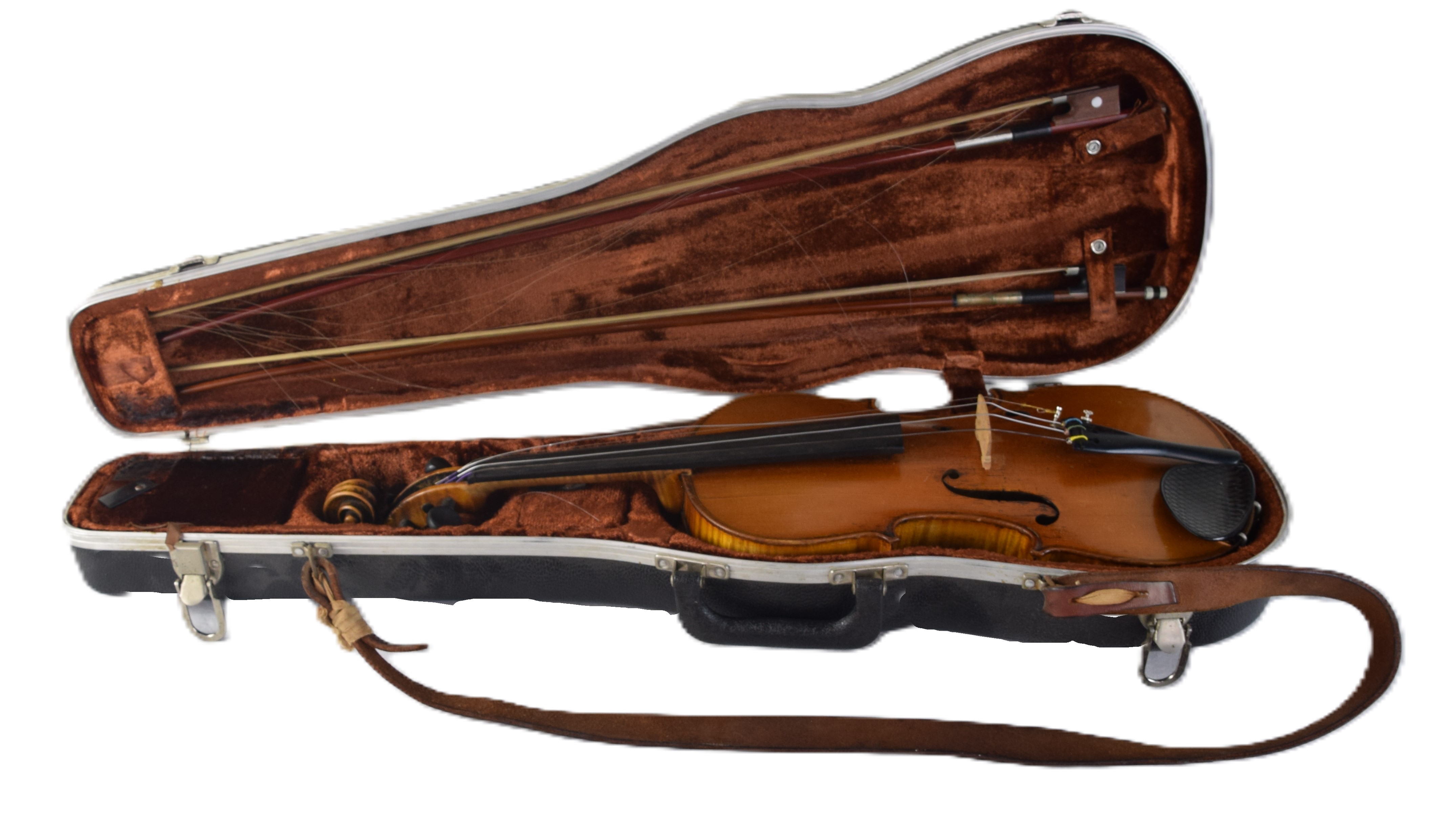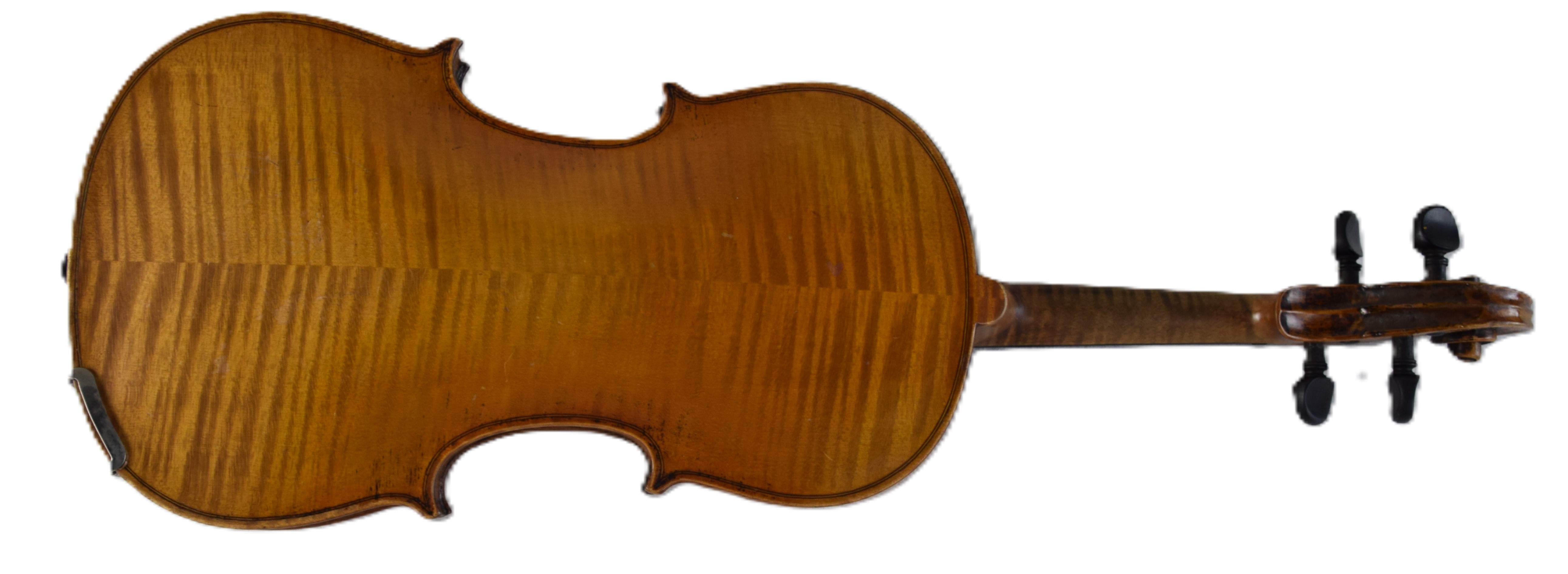 Tiger maple violin made by Gustav Pirazzi and Co., Germany with two bows and case. One bow signed “Bausch” Dimensions: 23″ L, 14″ Violin body, 29.5″ Bow length