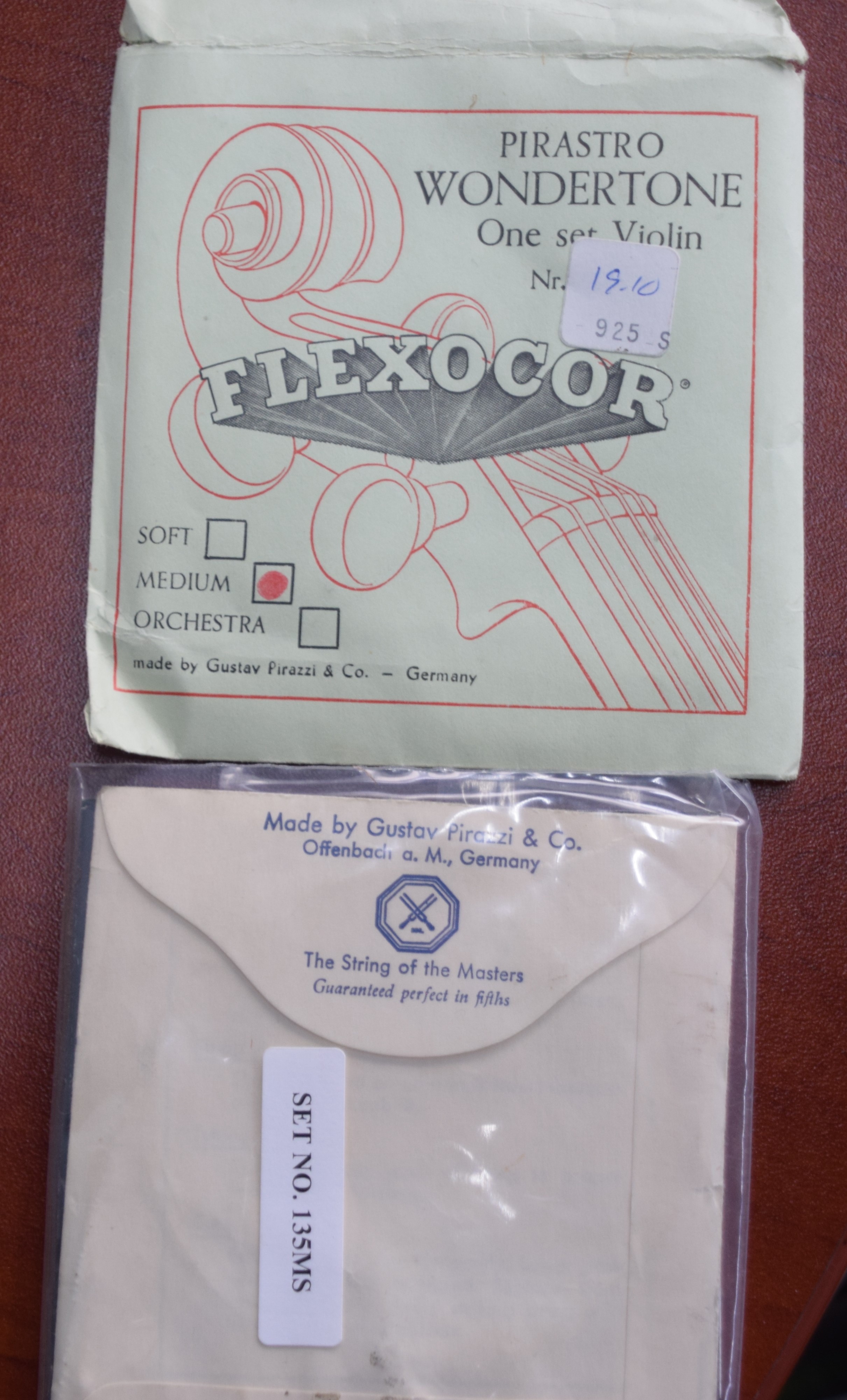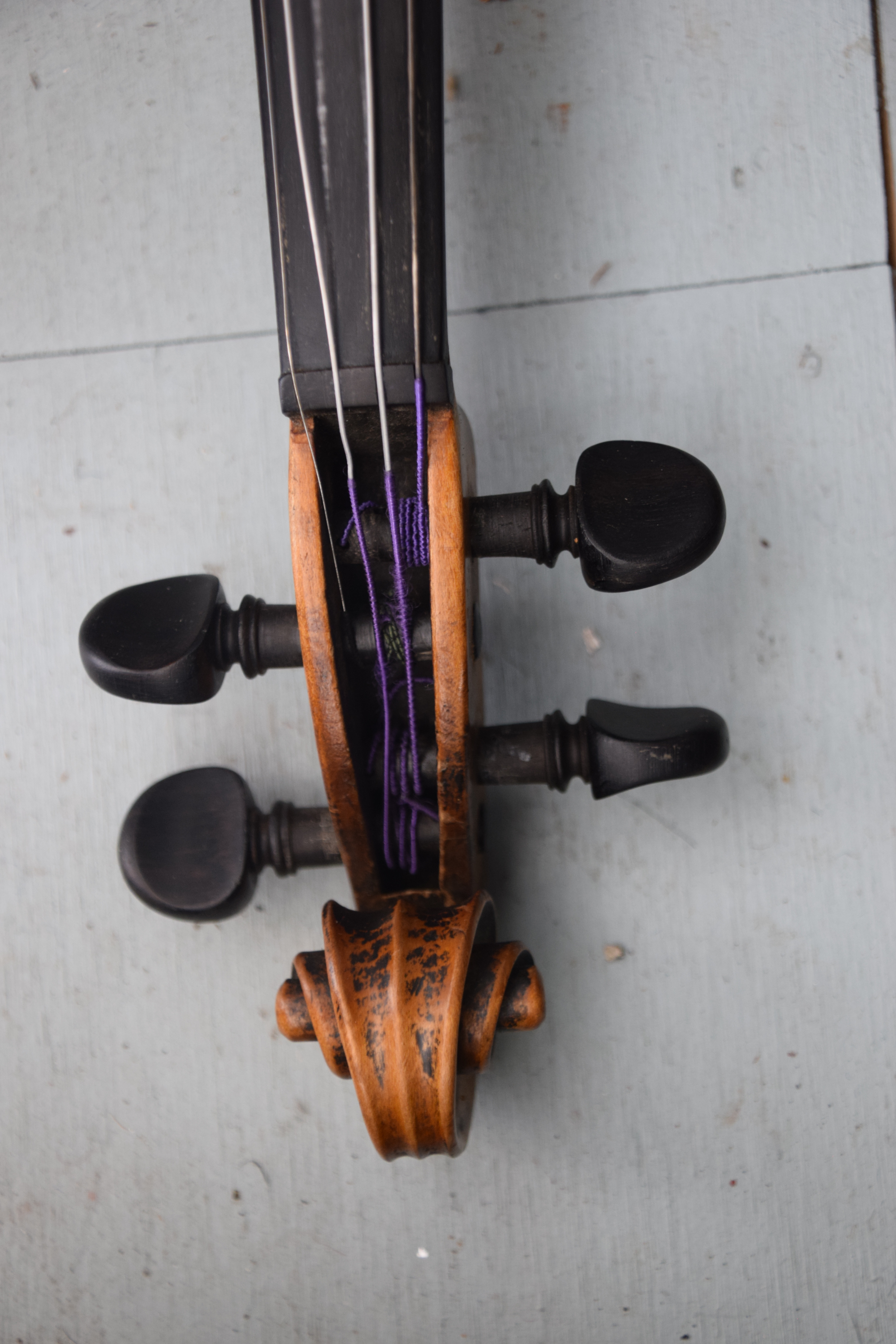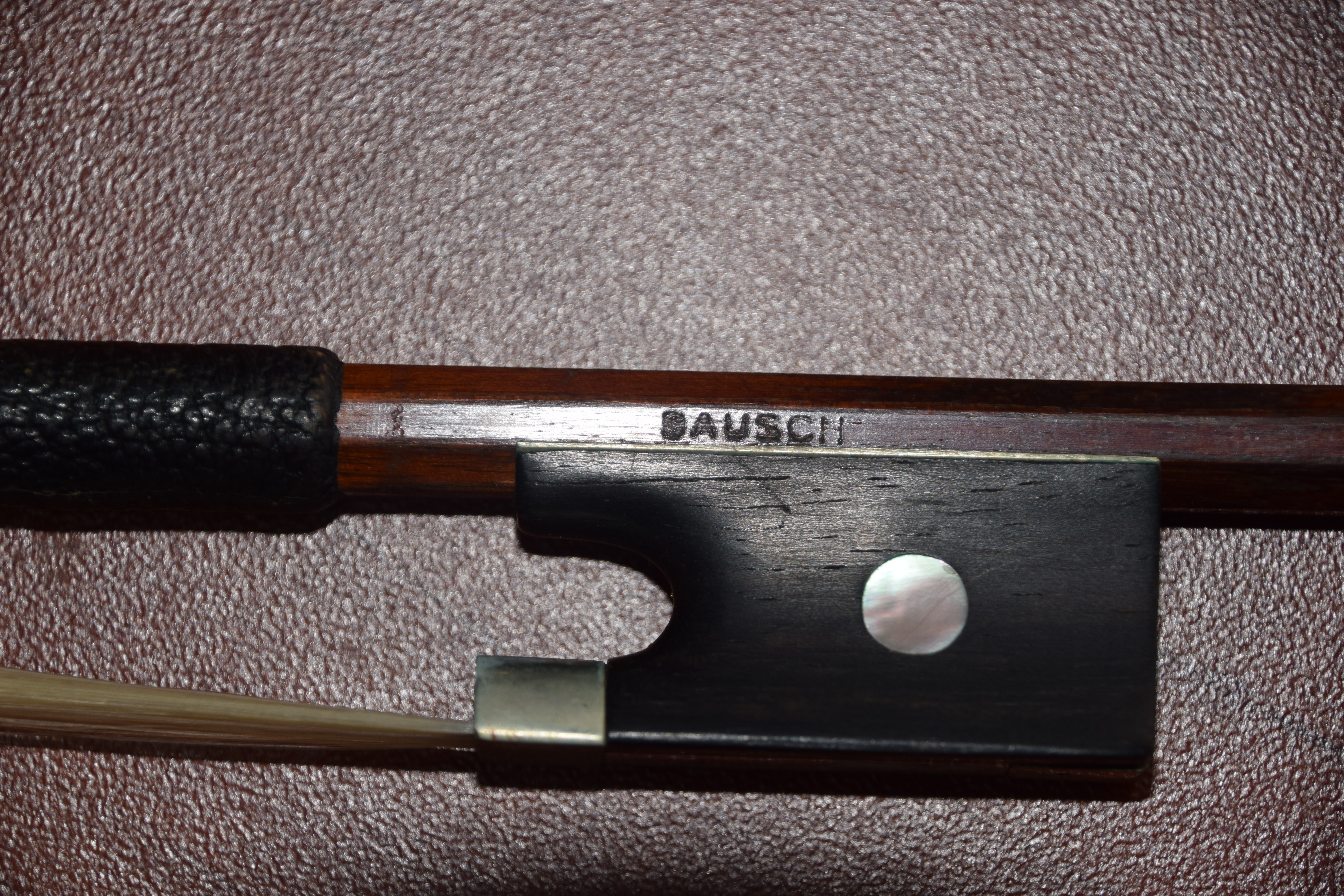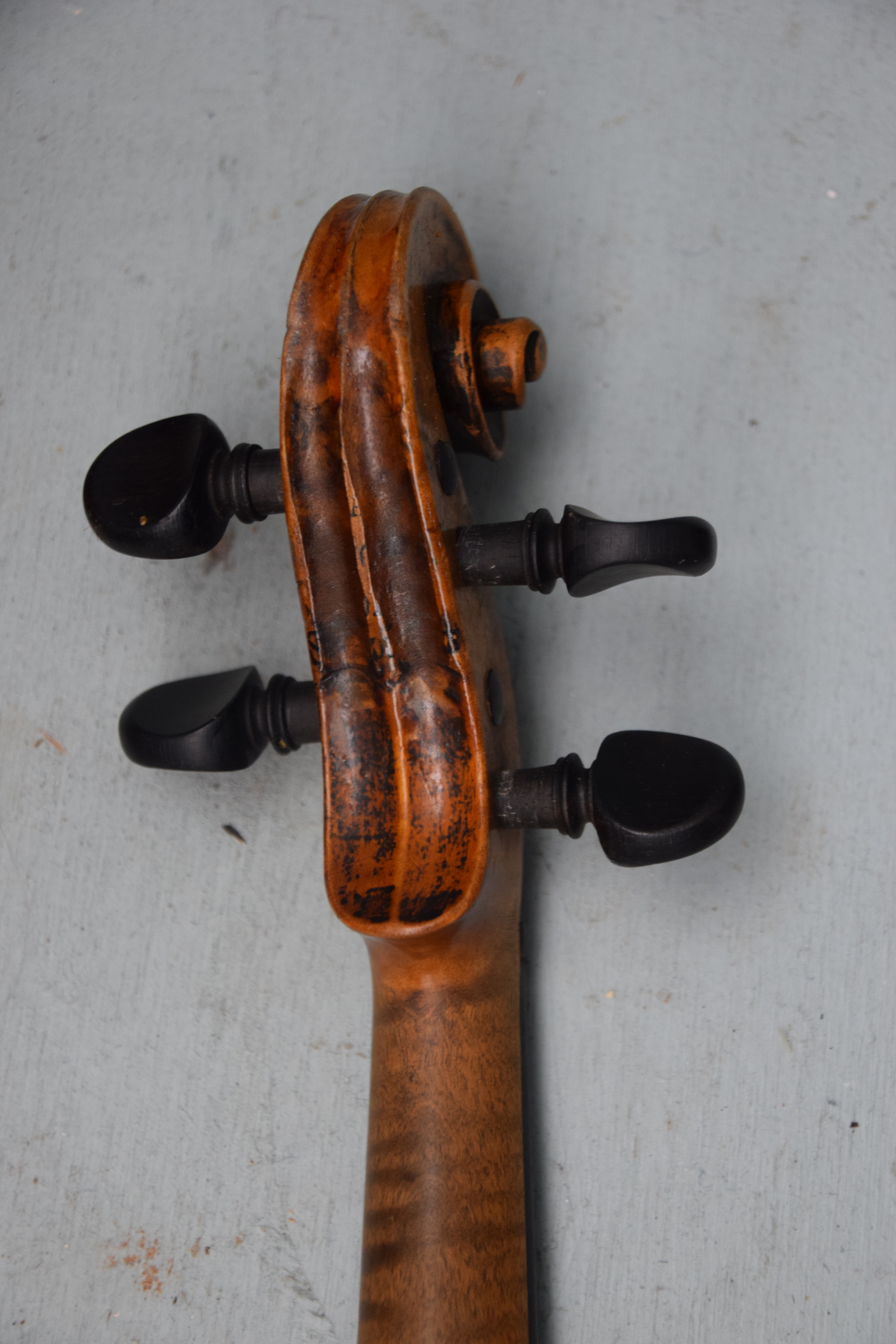 Tiger maple violin made by Gustav Pirazzi and Co., Germany with two bows and case. One bow signed “Bausch” Dimensions: 23″ L, 14″ Violin body, 29.5″ Bow length