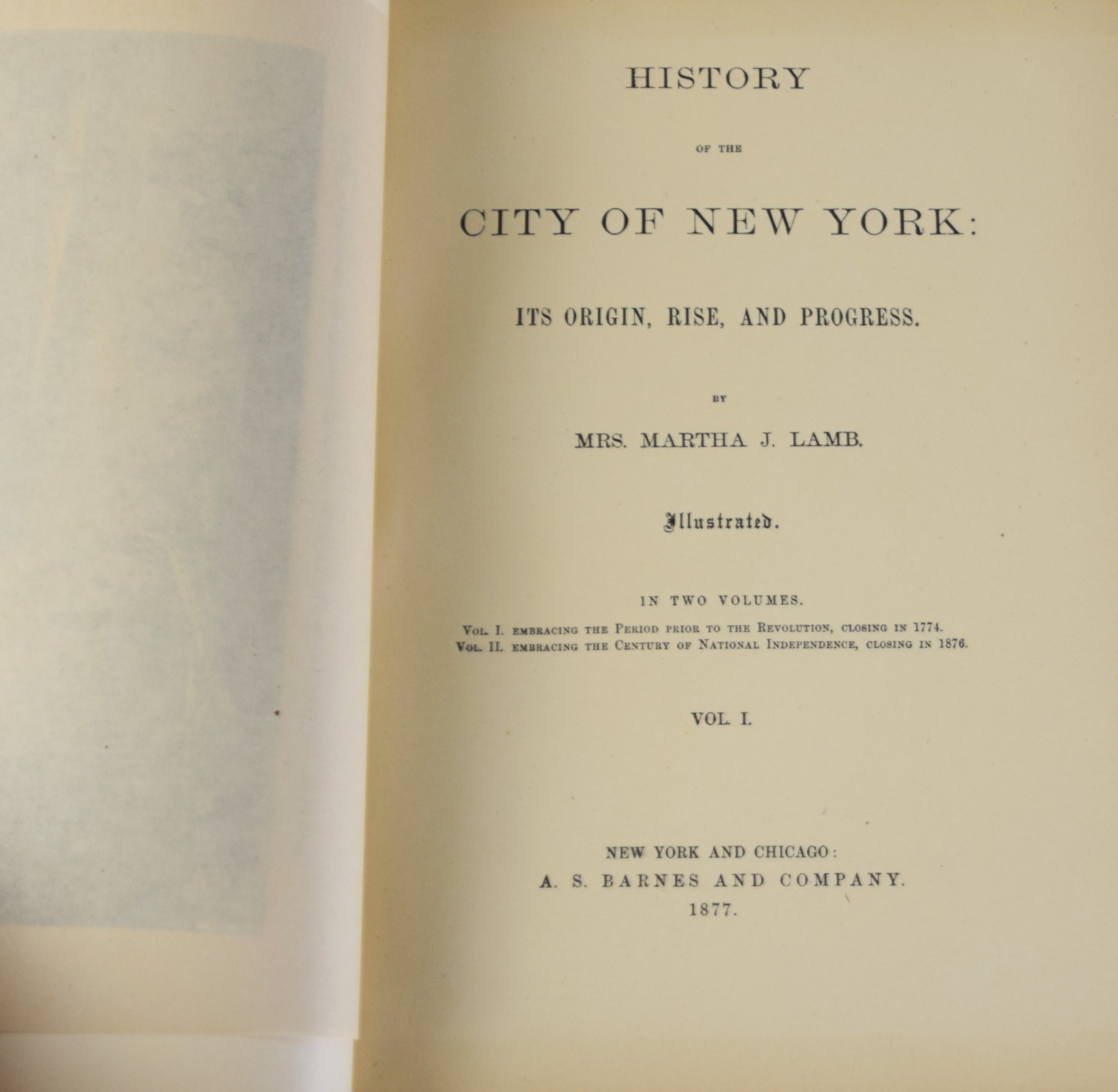 The History of the City of New York in hardcover, 1st Edition in two volumes published in 1877. Original 3/4 tan leather over marbled boards and gilt titles on spine with marbled page edges and end pages. More than 150 illustrations–portraits, maps, buildings, landscapes, etc.– in each volume. 786 pages and 820 pages. At the time of its publication, this work was reputed to be “the most complete history ever published of any city in the world.”
