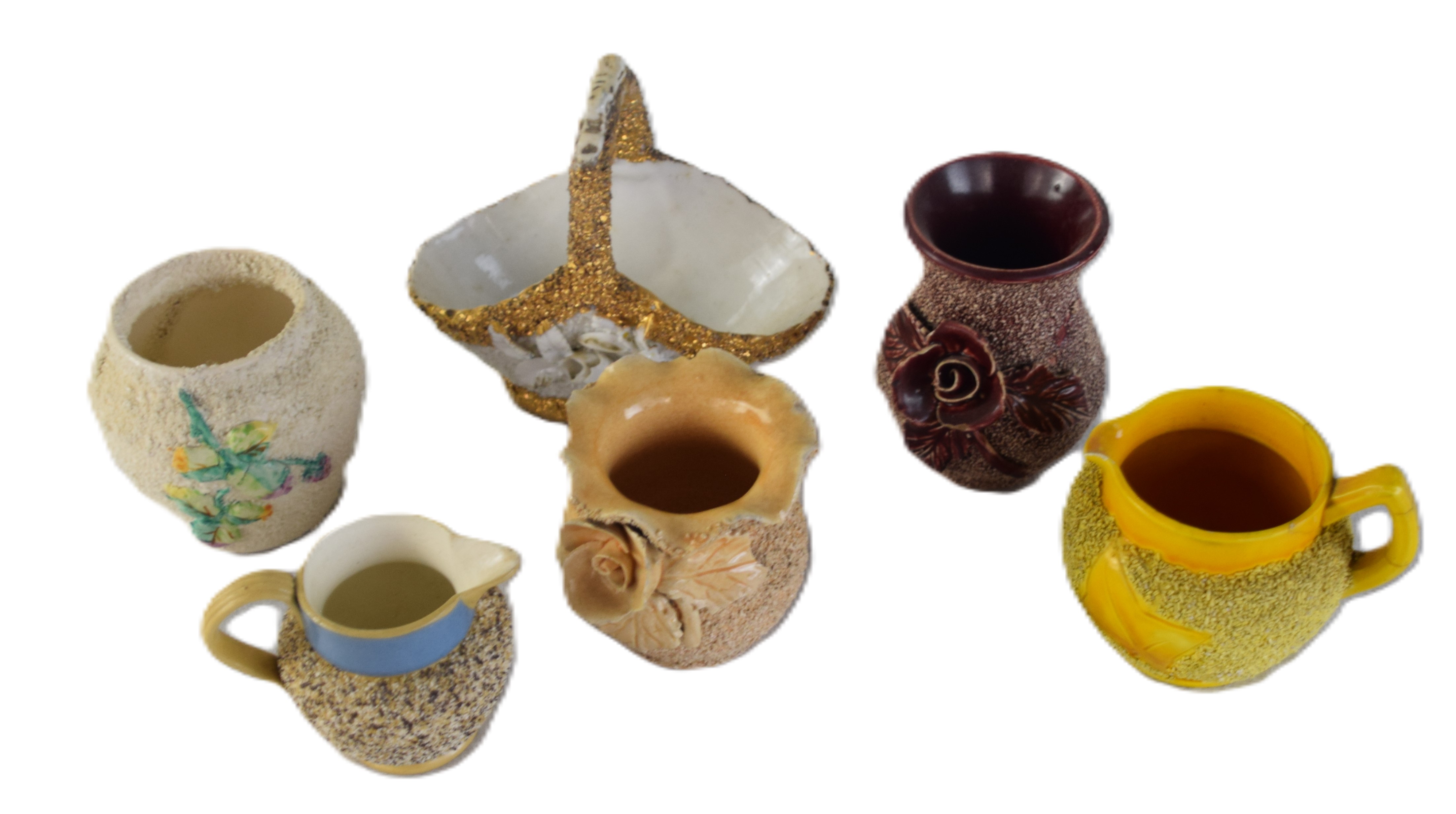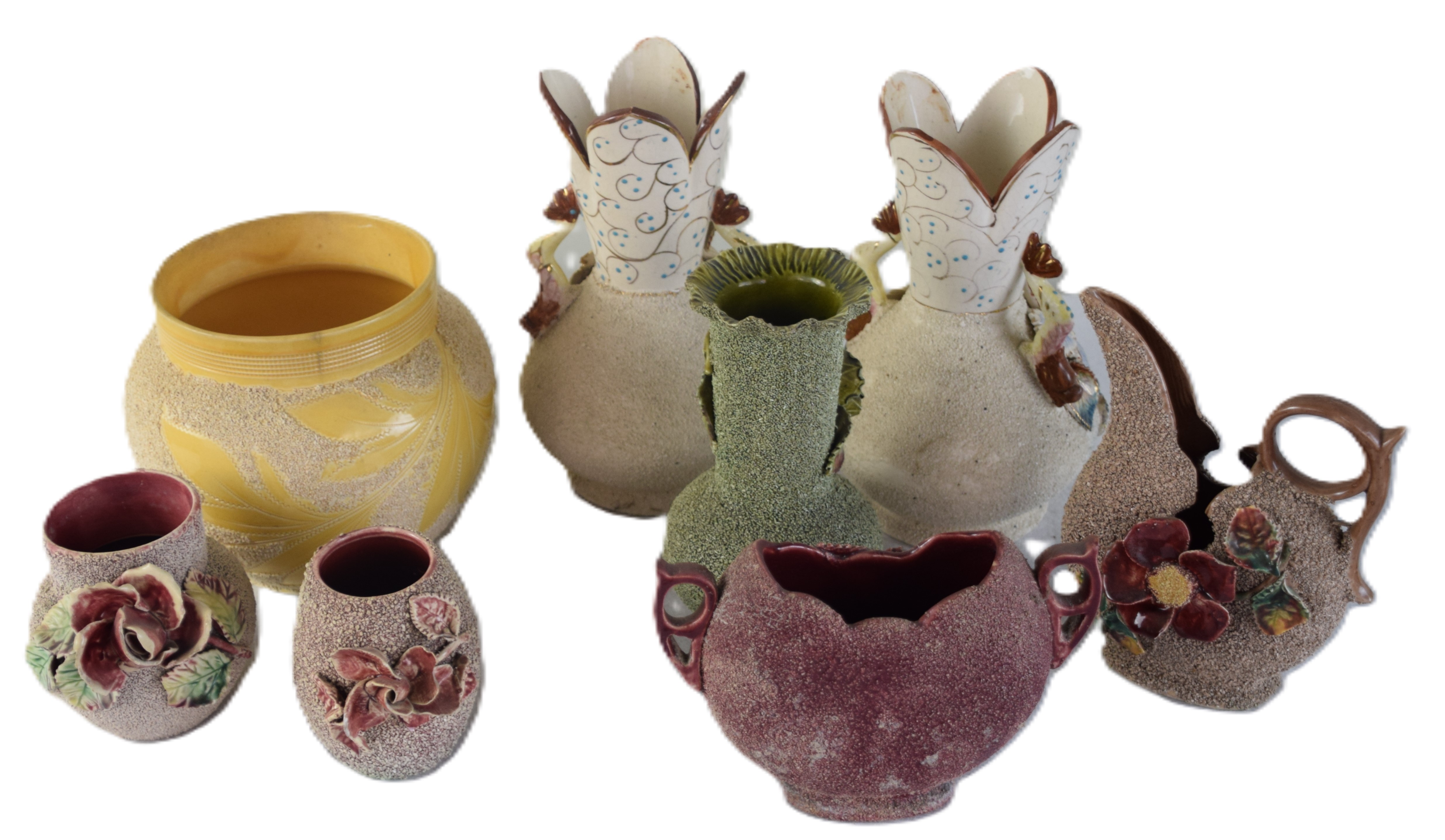 14 piece Majolica tableware lot with floral and sandpaper surface with raised flowers. Lot includes vases, creamers, bowls, etc. Dimensions: 3″ – 9″ H