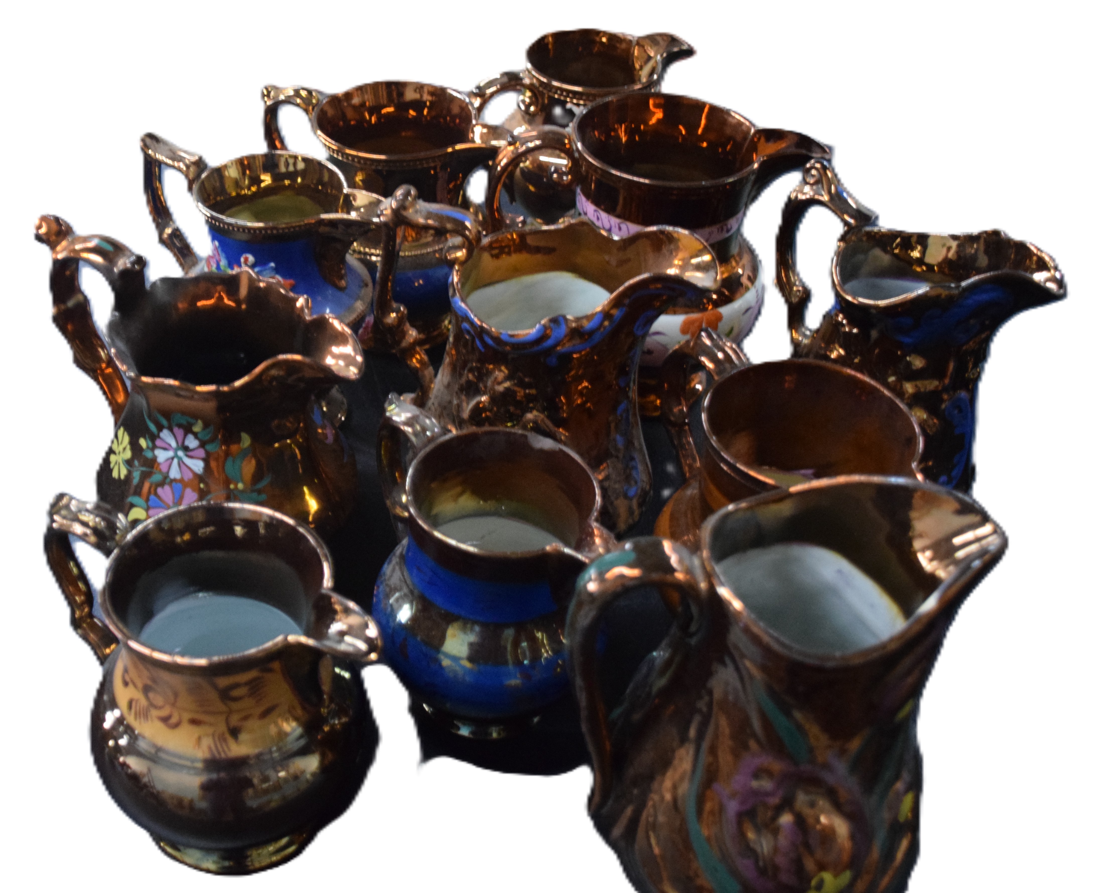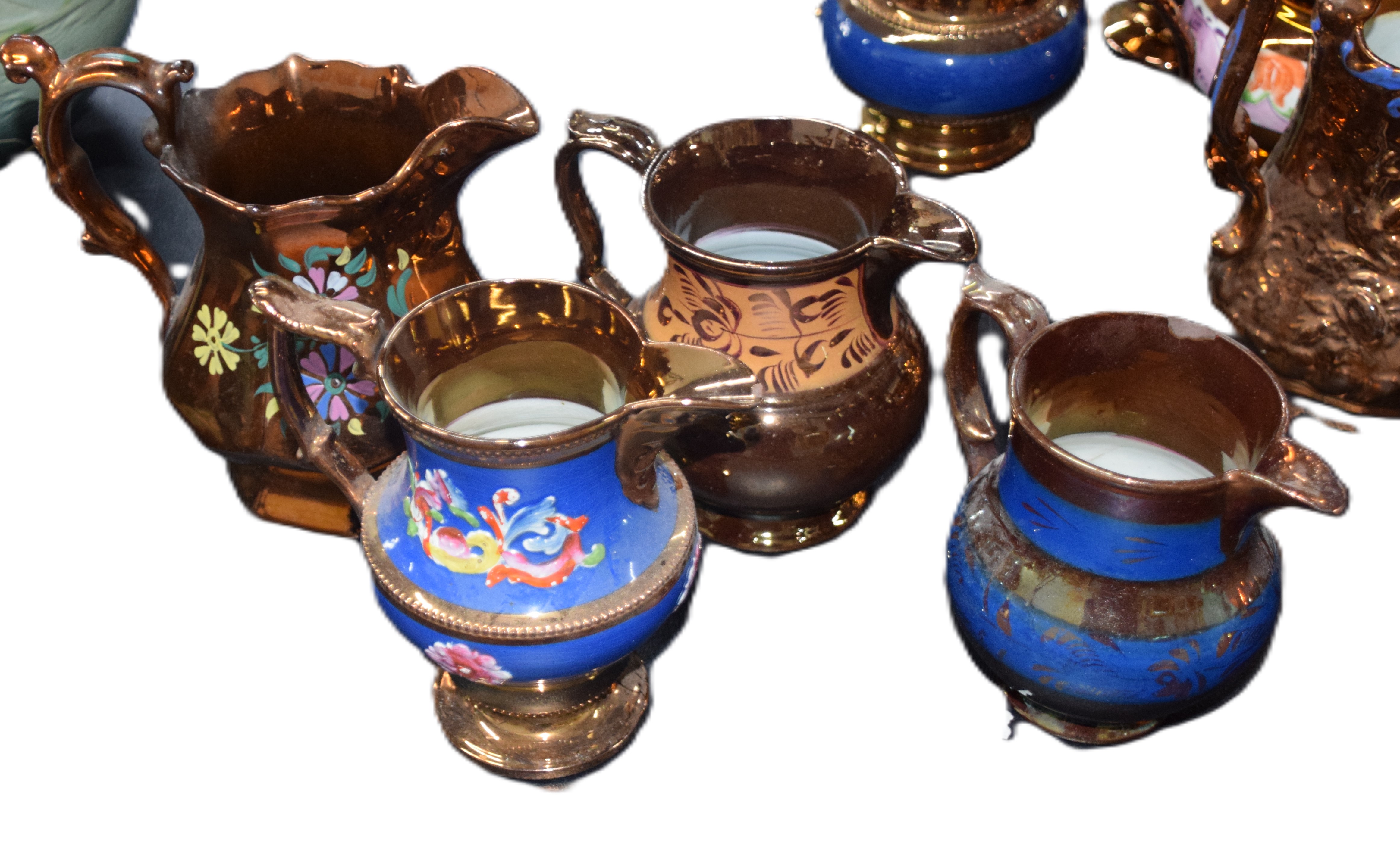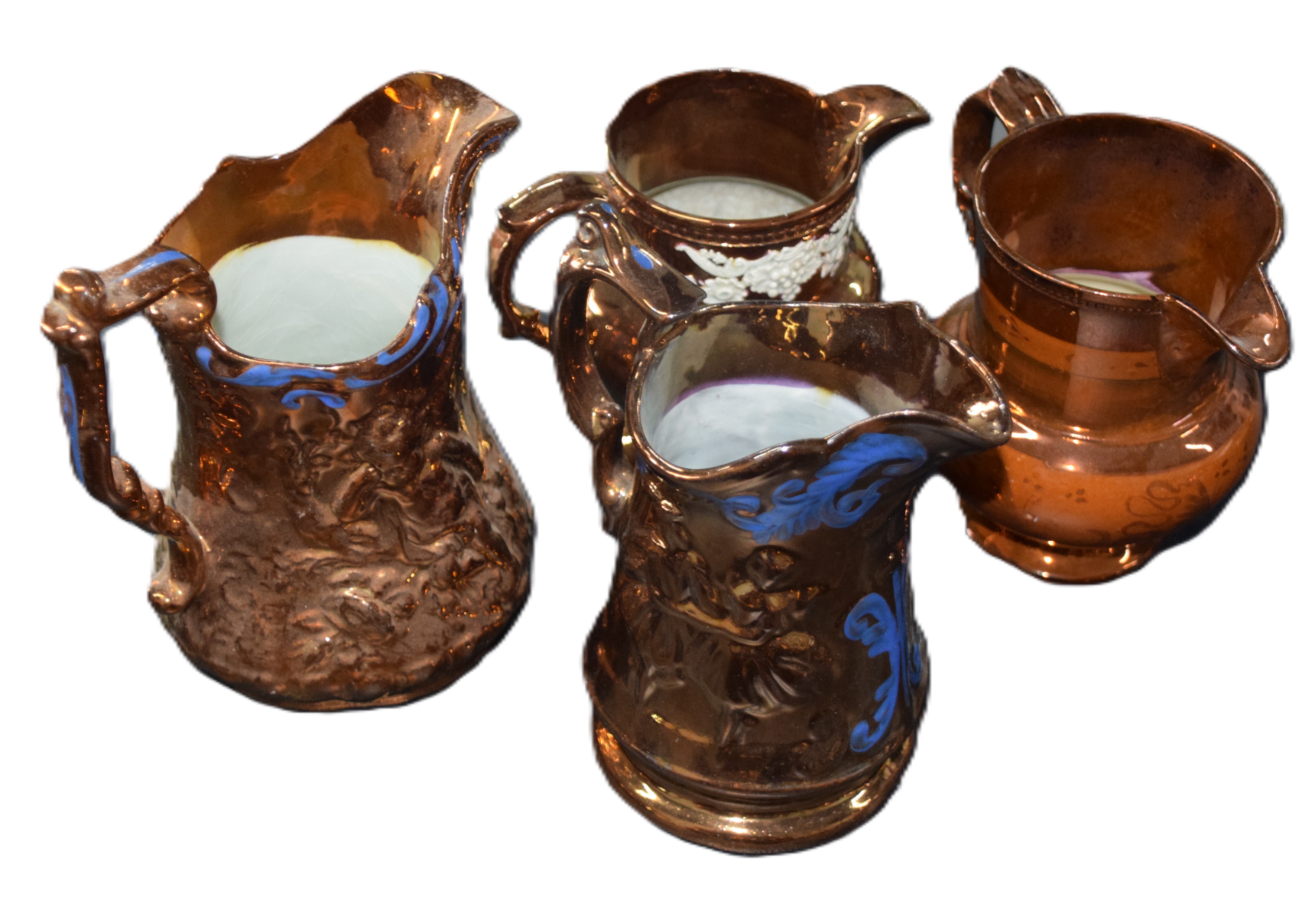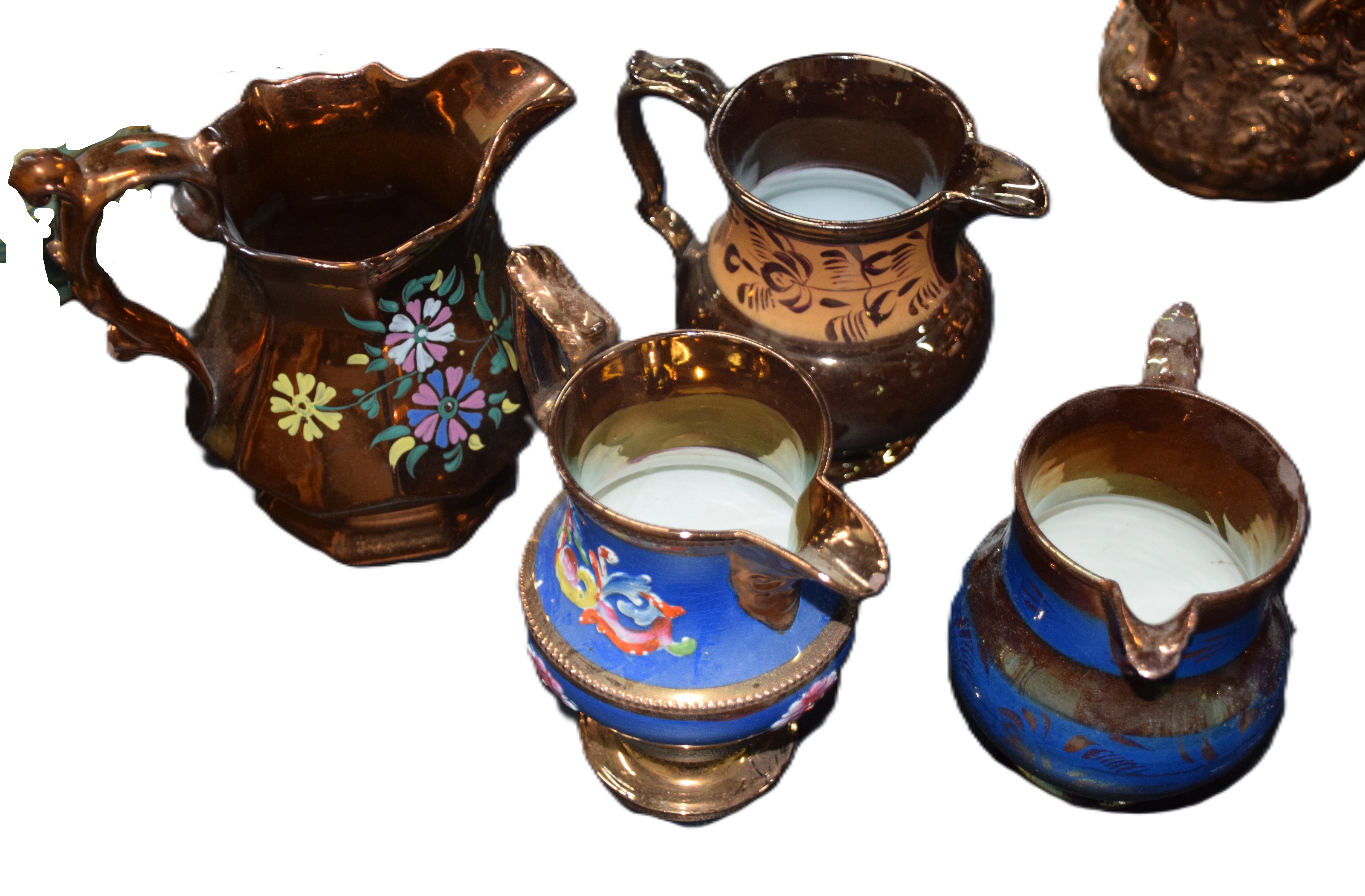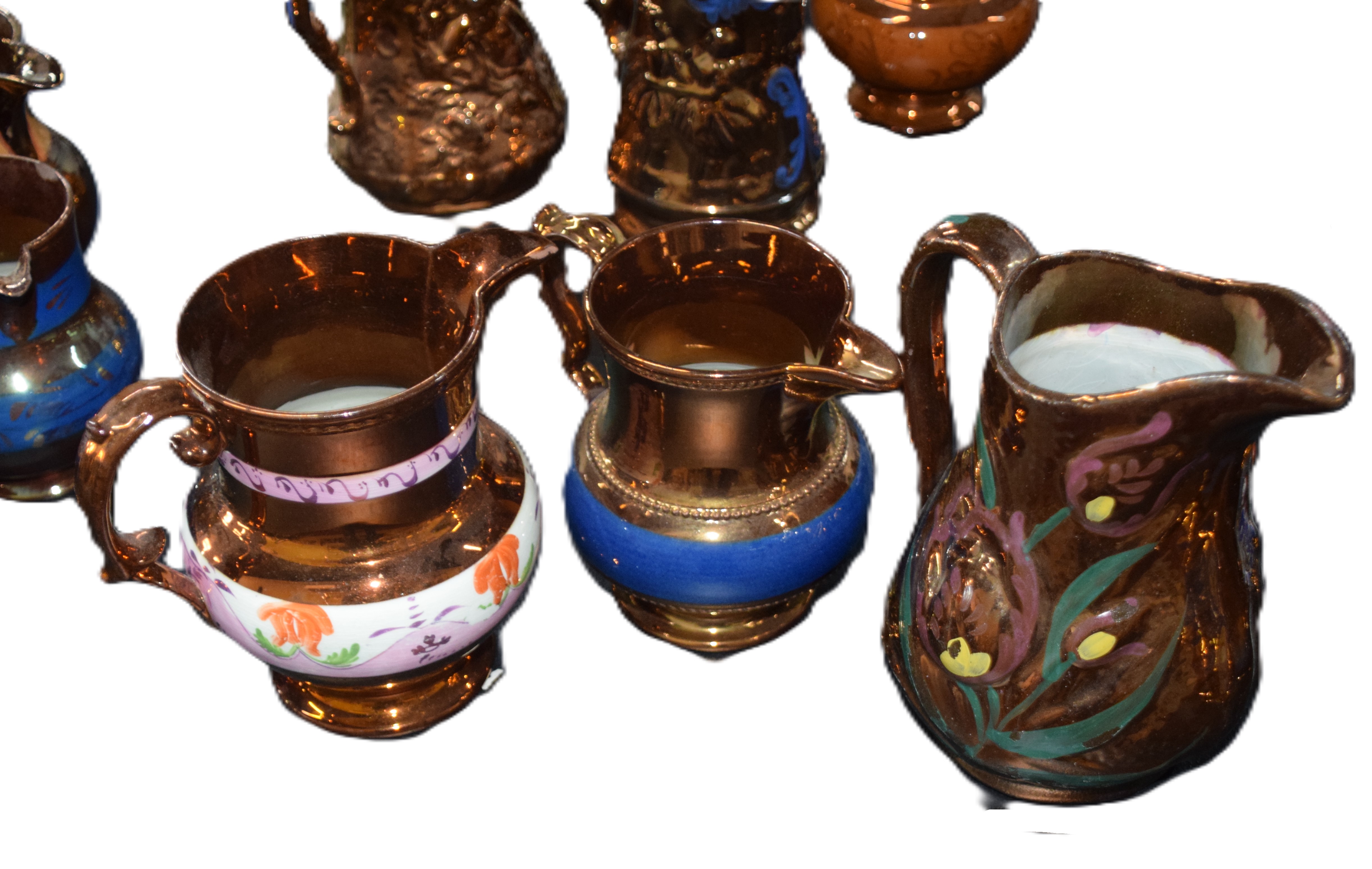 Assembled lot of copper luster pitchers all with applied handles, many with decorations, one with floral designs. Dimensions: Various sizes ranging from 5.5″ to 7″ H