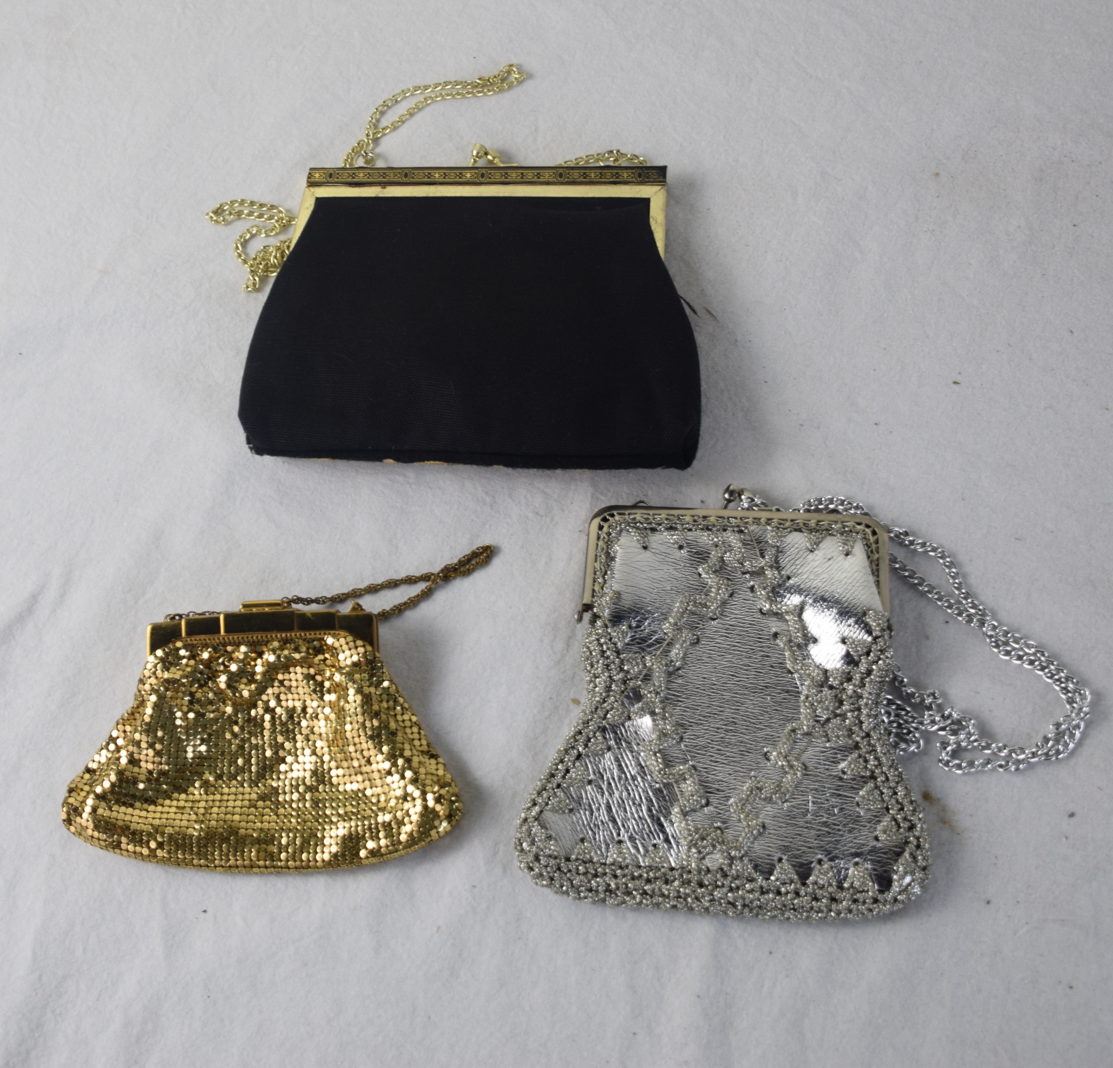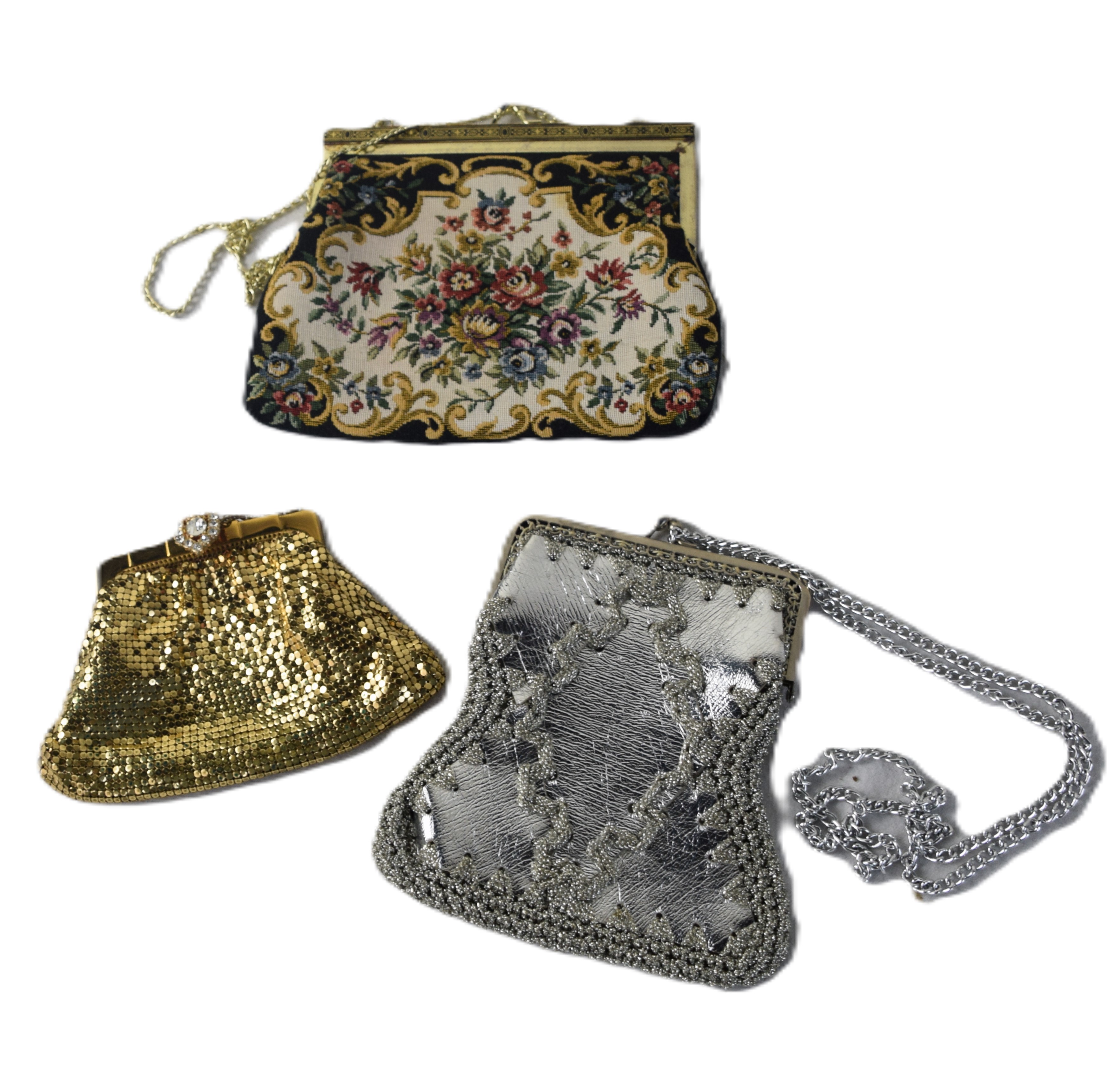 Three vintage purses including one gold colored, one tapestry and one silver.