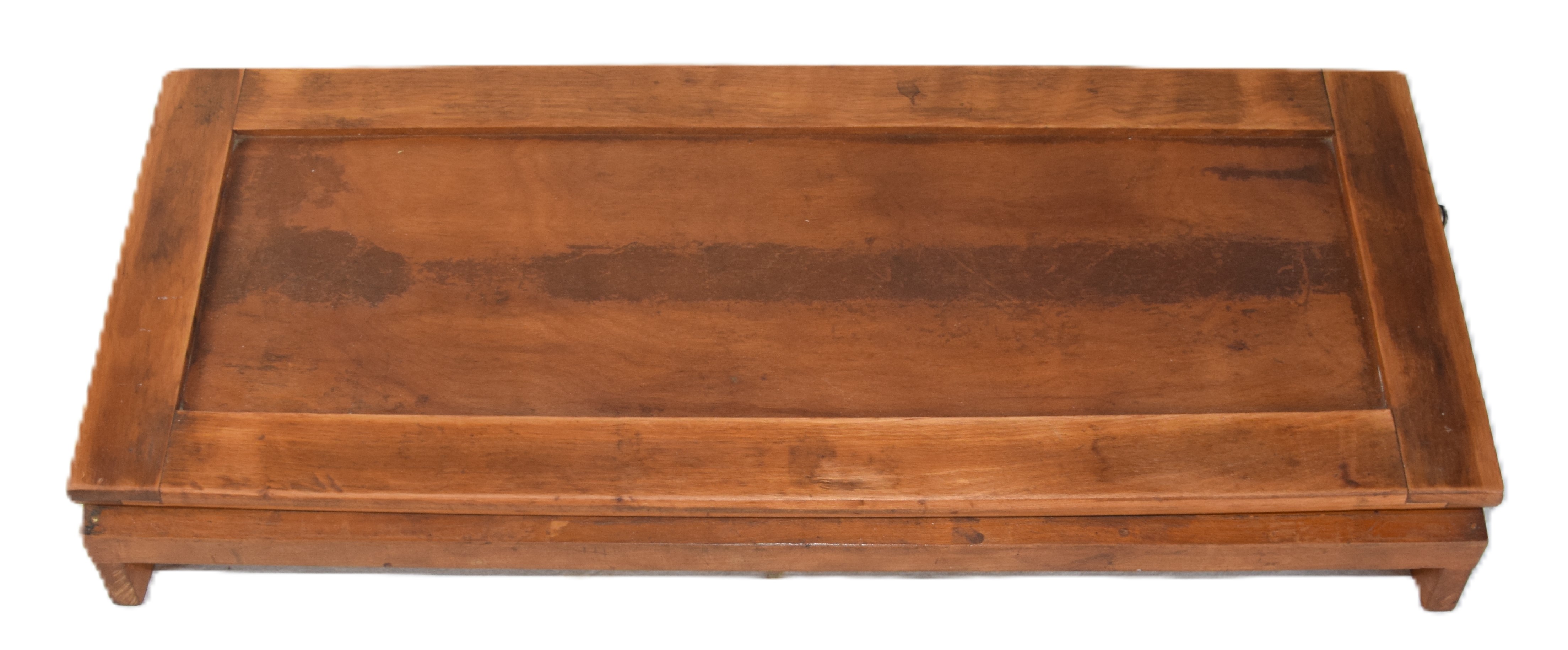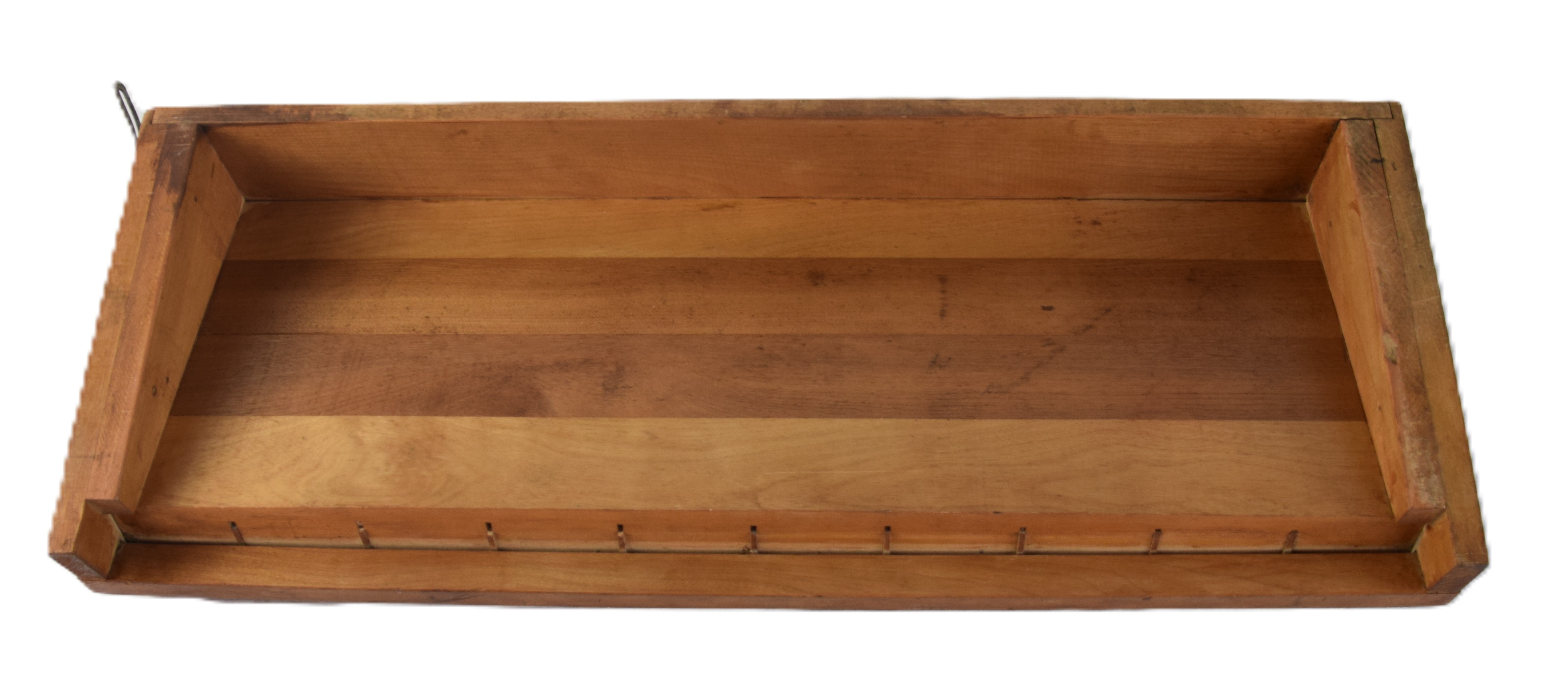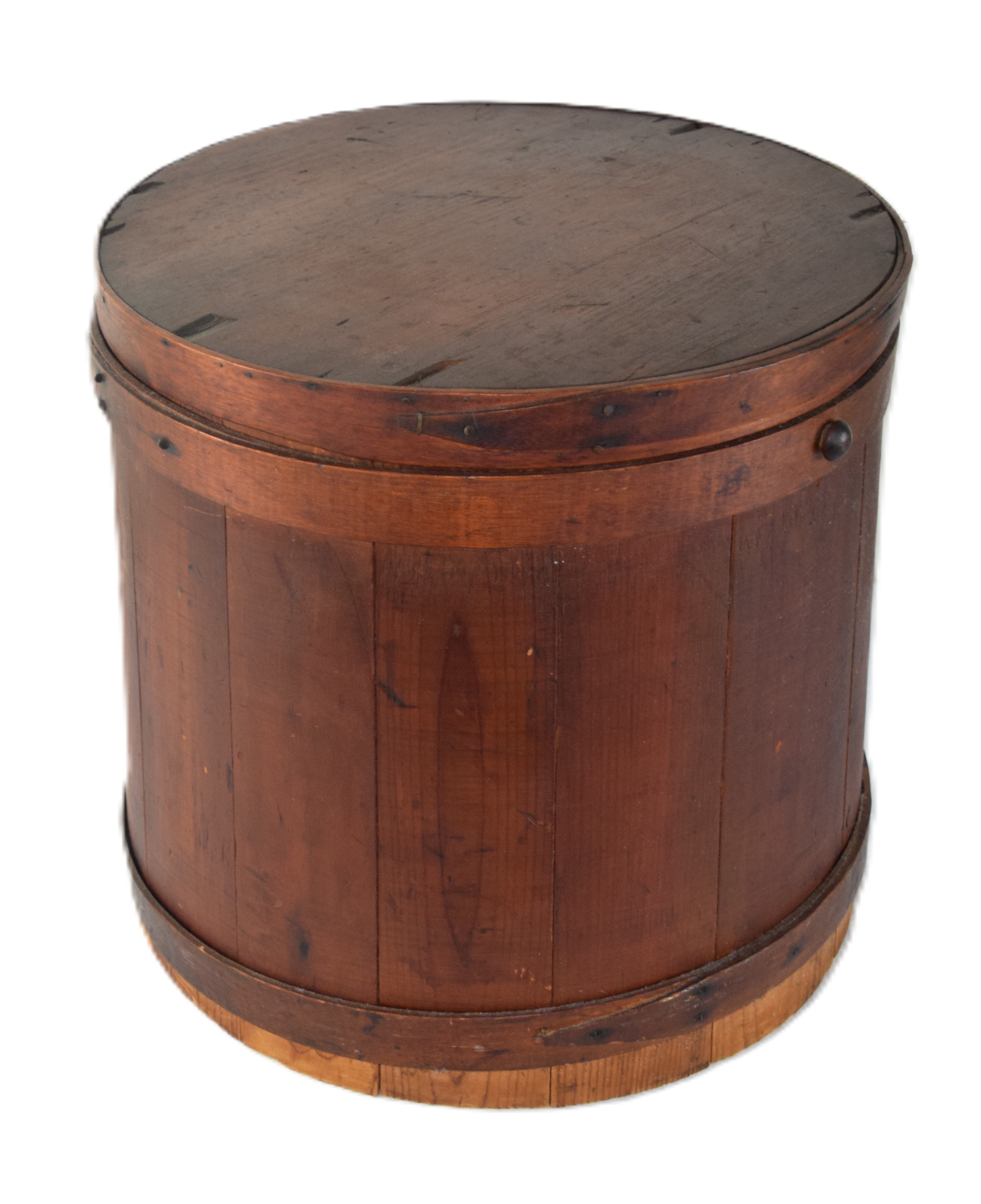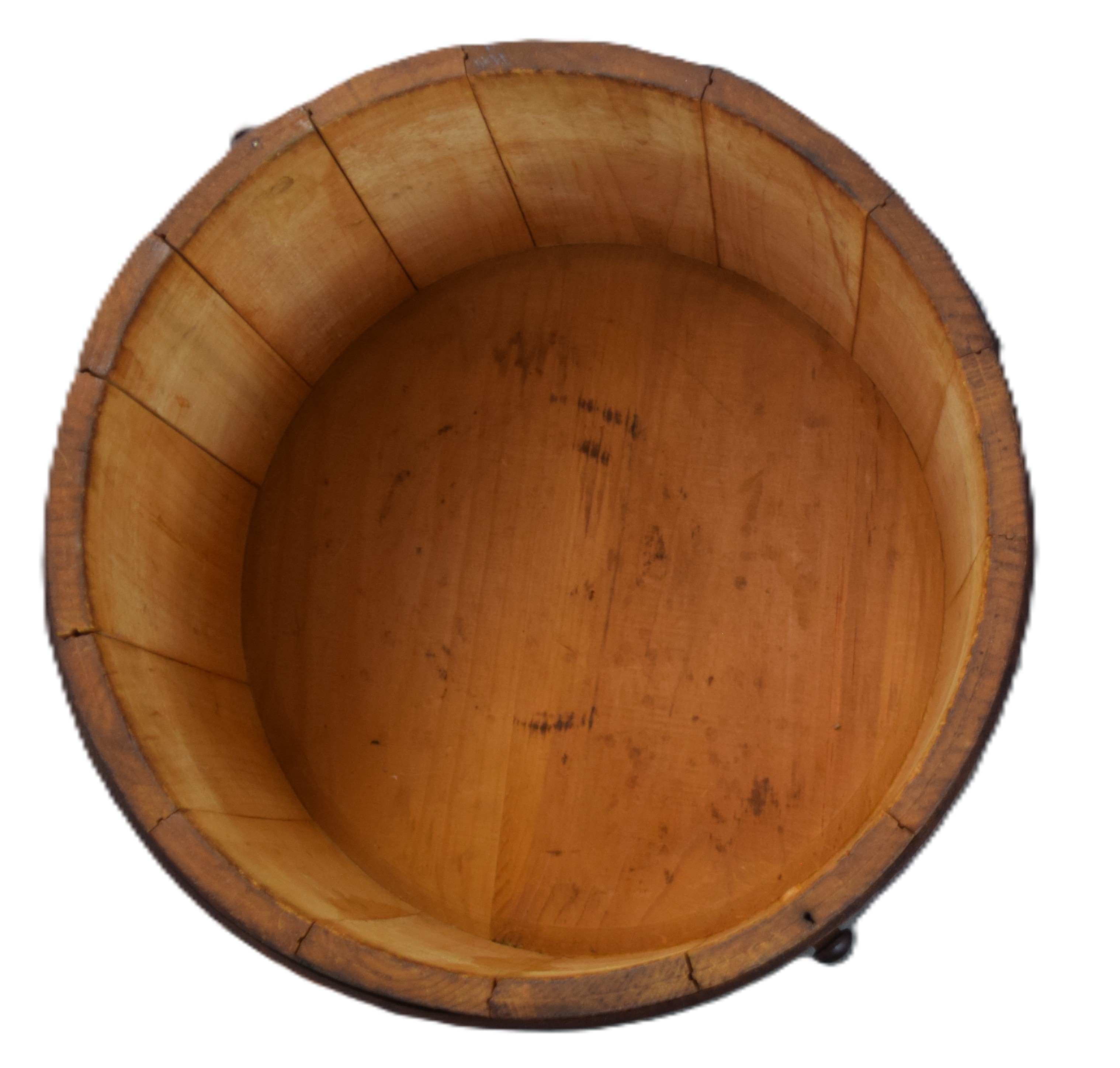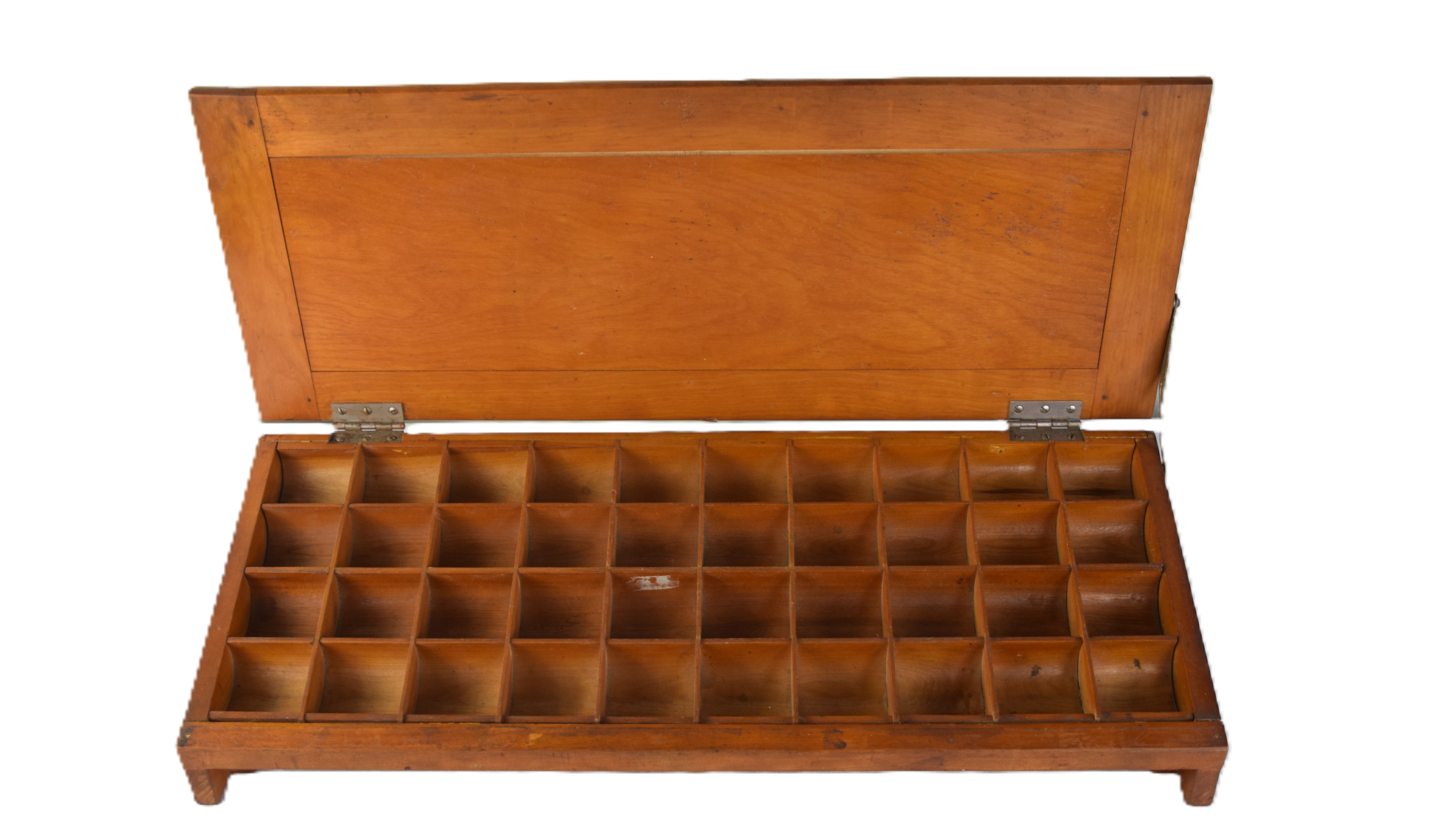 Post office unit ( 25″ L) in birch wood with a paneled hinged lid covering multi postage stamp sectional interior along with a large firkin bucket (14″ H).