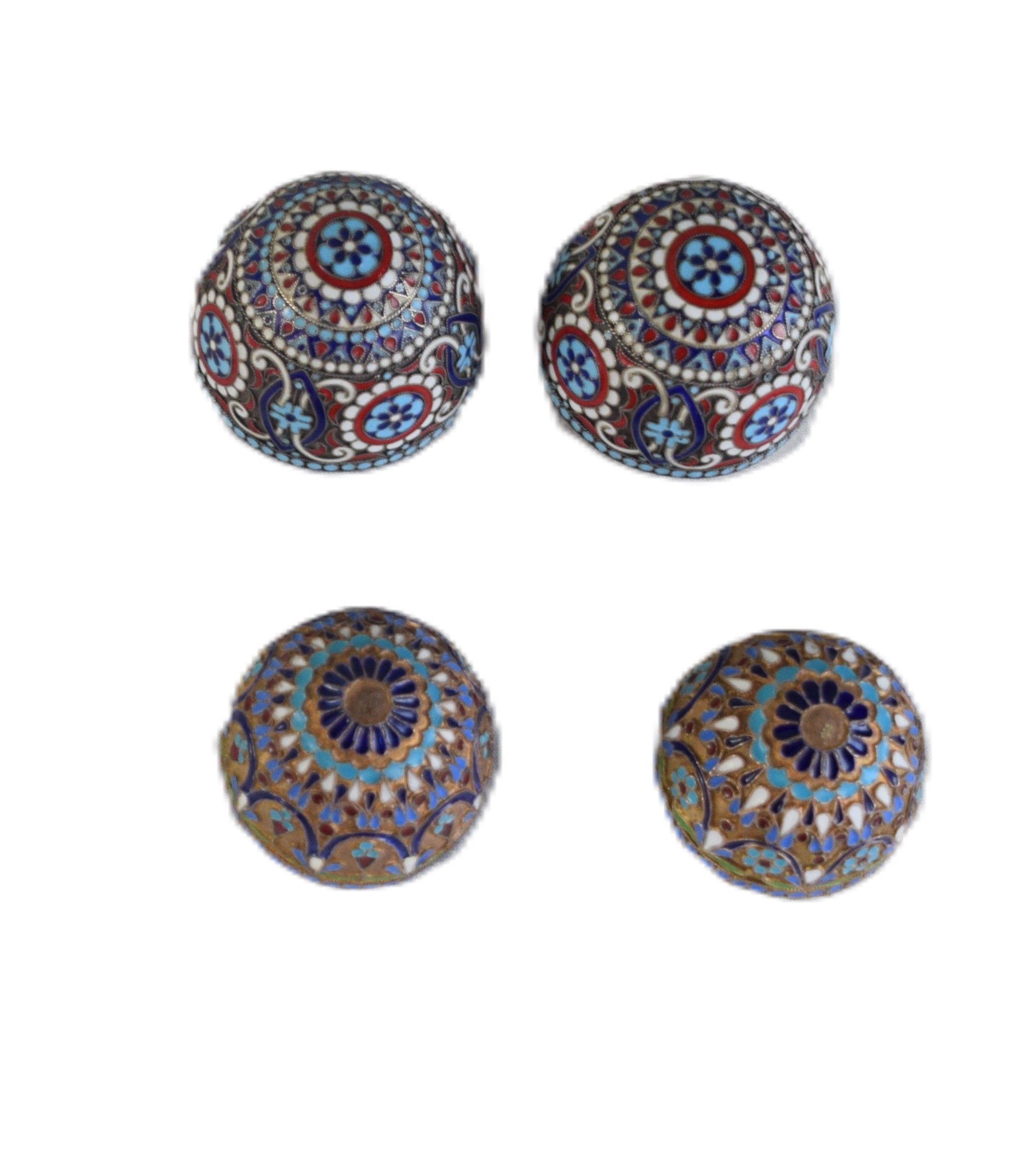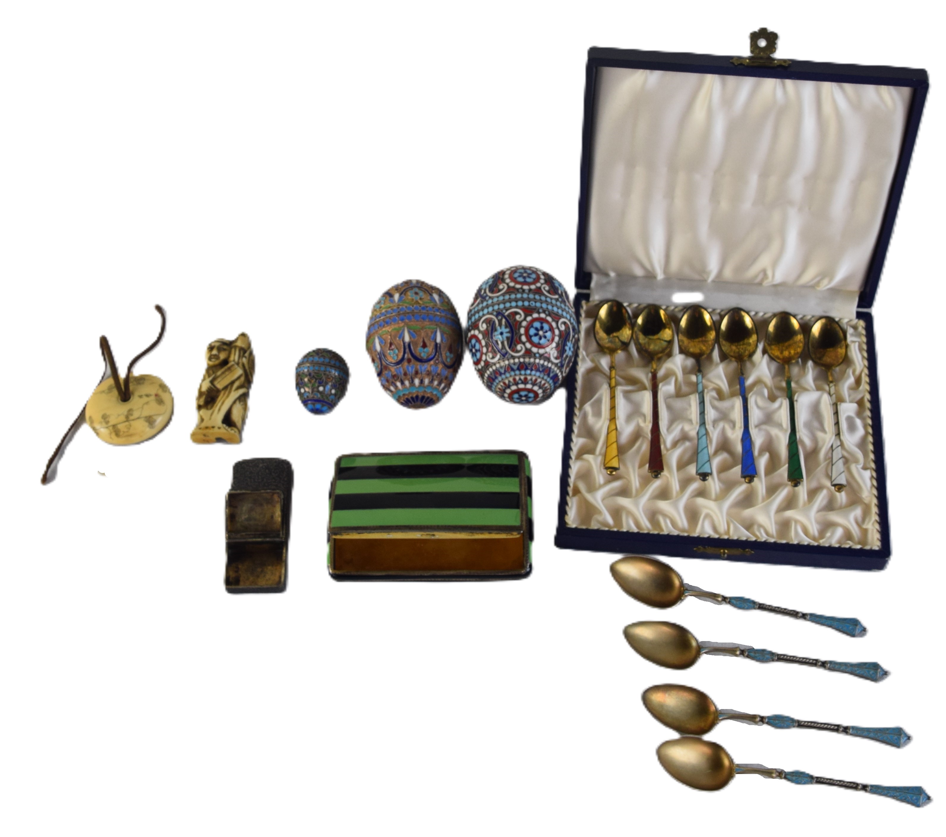 Three cloisonne egg form containers, Four cloisonne handle spoons, Chinese Netsuke, hinged cigarette box, gold wash spoon set with container.