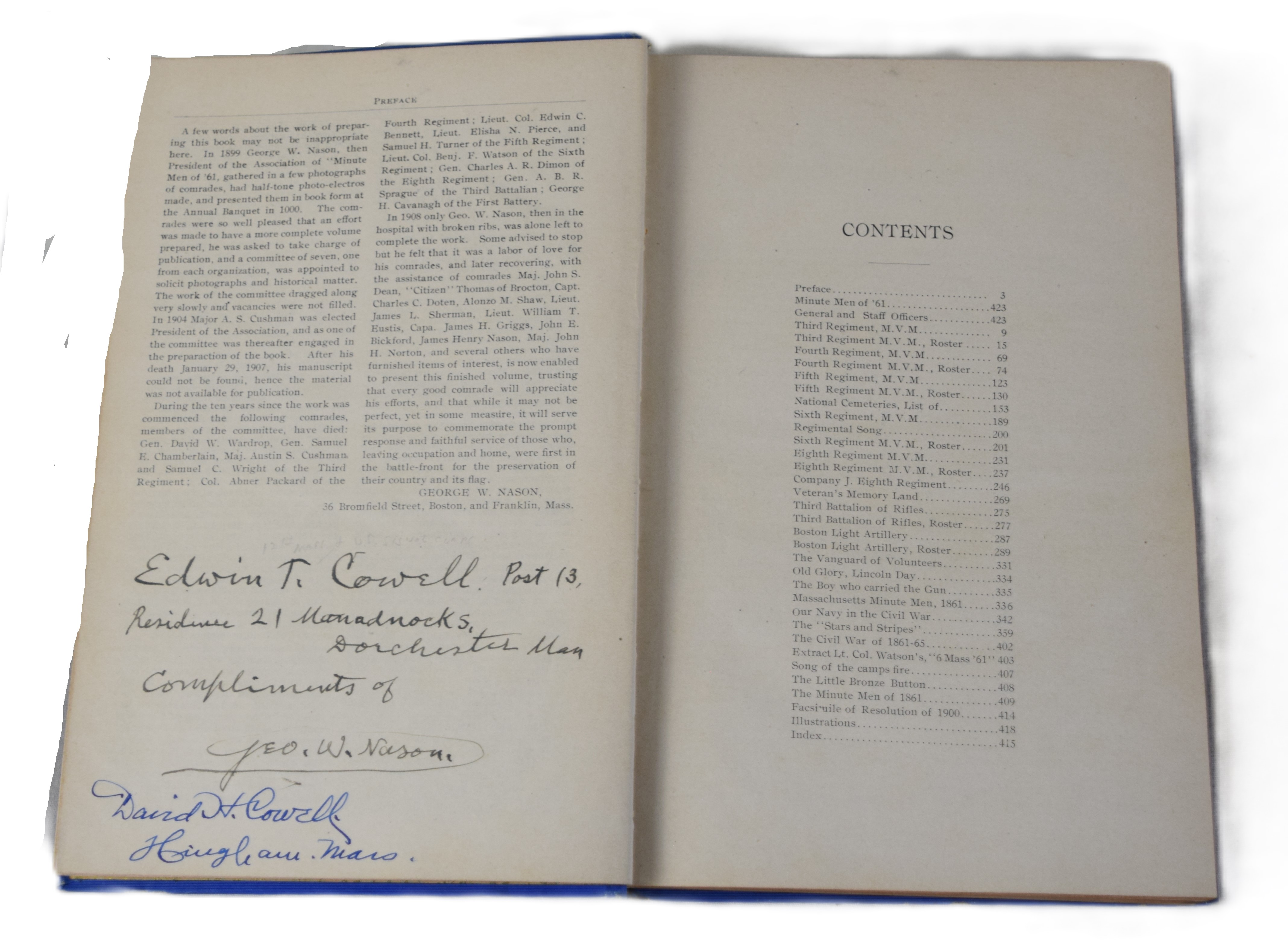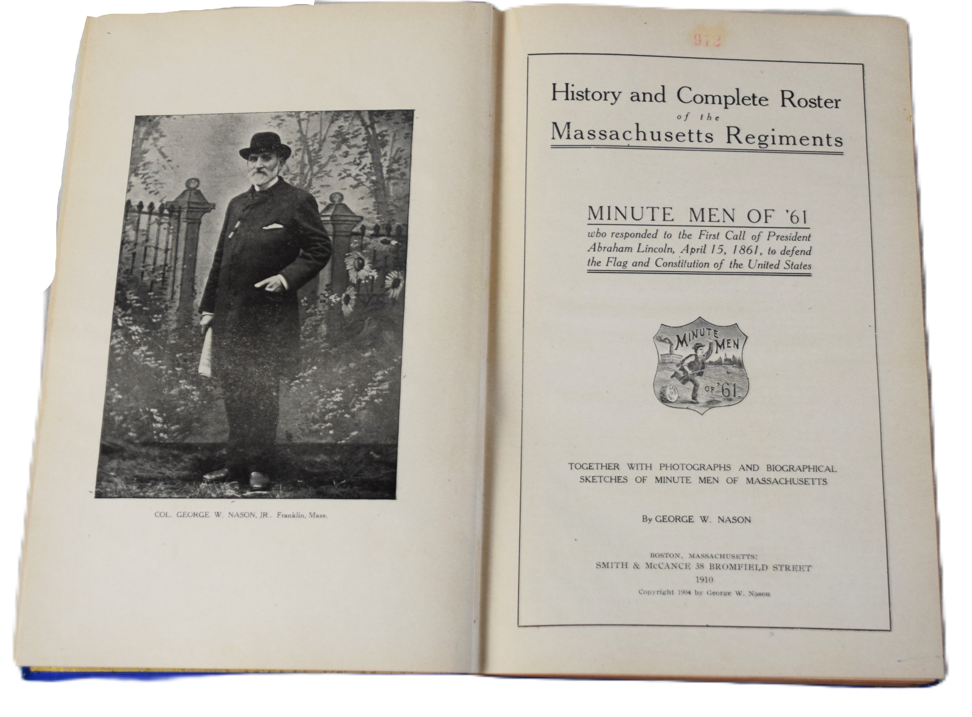 History and Complete Roster of the Massachusetts Regiments in the first year of the Civil War. 413 pages plus Indices, well illustrated, bright blue cloth, and gilt page edges. Published by Smith & McCance, Boston 1910. Signed by the author, George Nason.