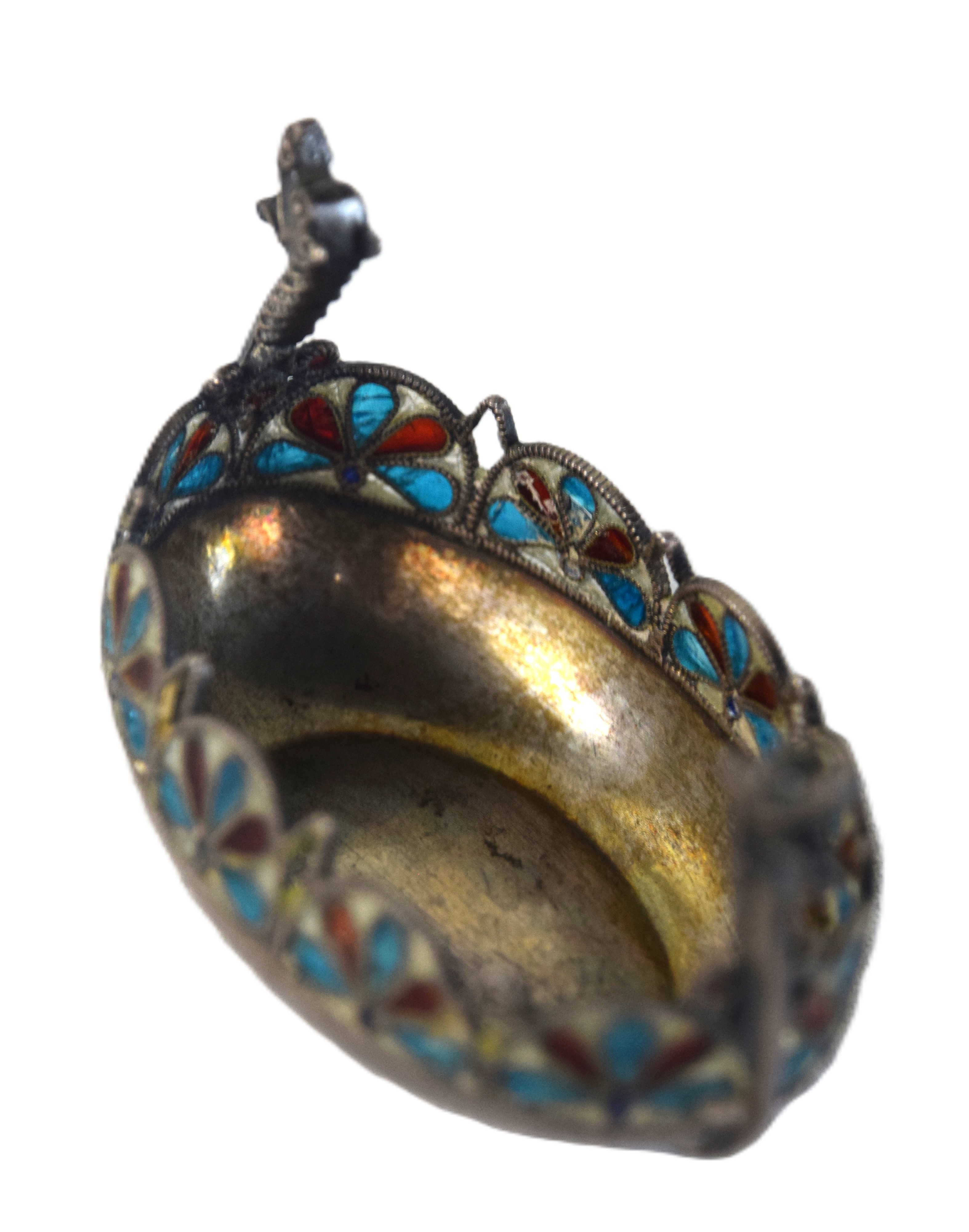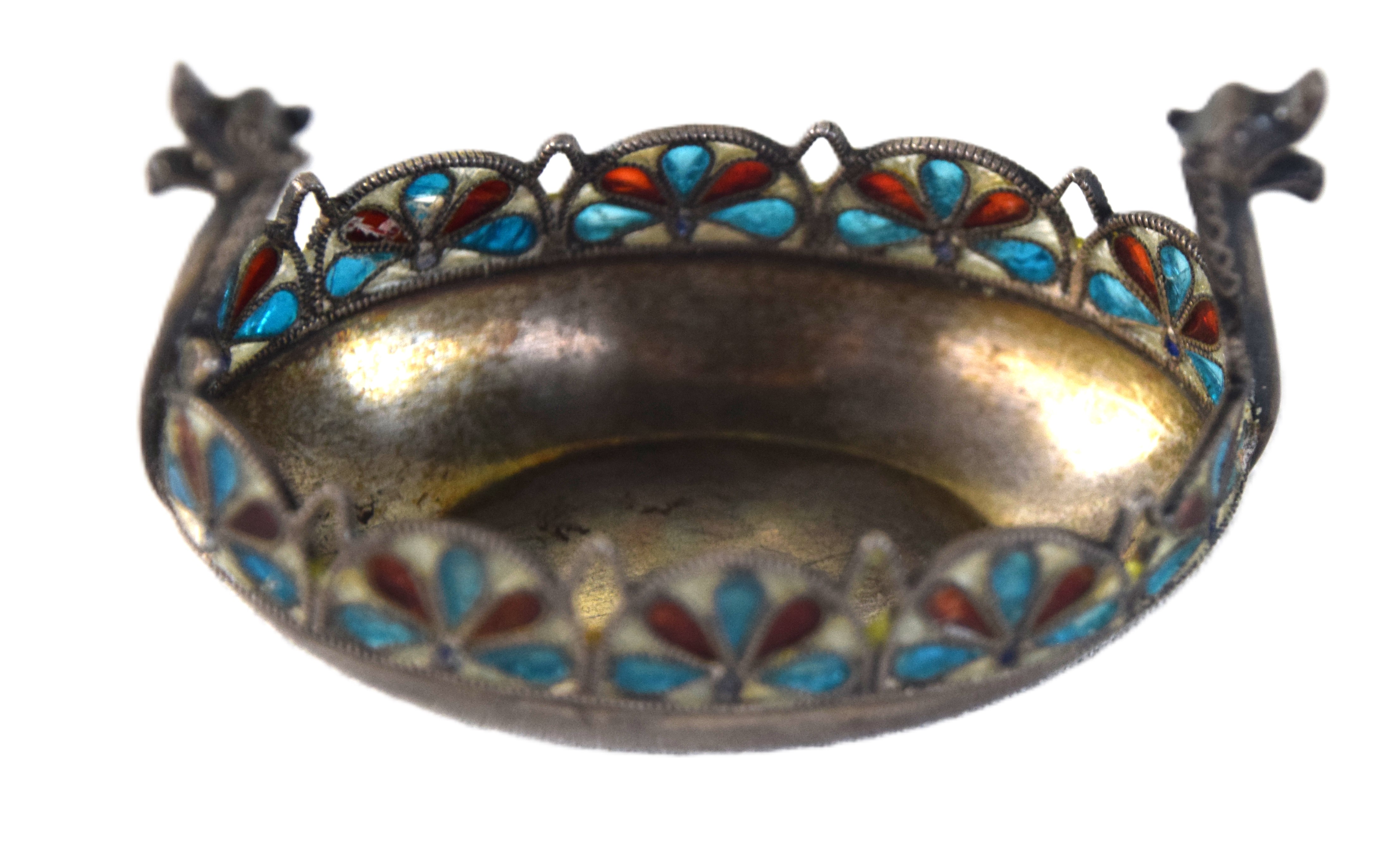 Miniature Viking ship of silver similar to lot 19, but much smaller using the cloisonné technique. Marked on bottom MH and 900 silver. MH may be the firm Martin Hall (established 1854) of the UK. From a Bedford NH estate. Dimensions: 1.24″ H x 2.25″ L x 1.25″ W