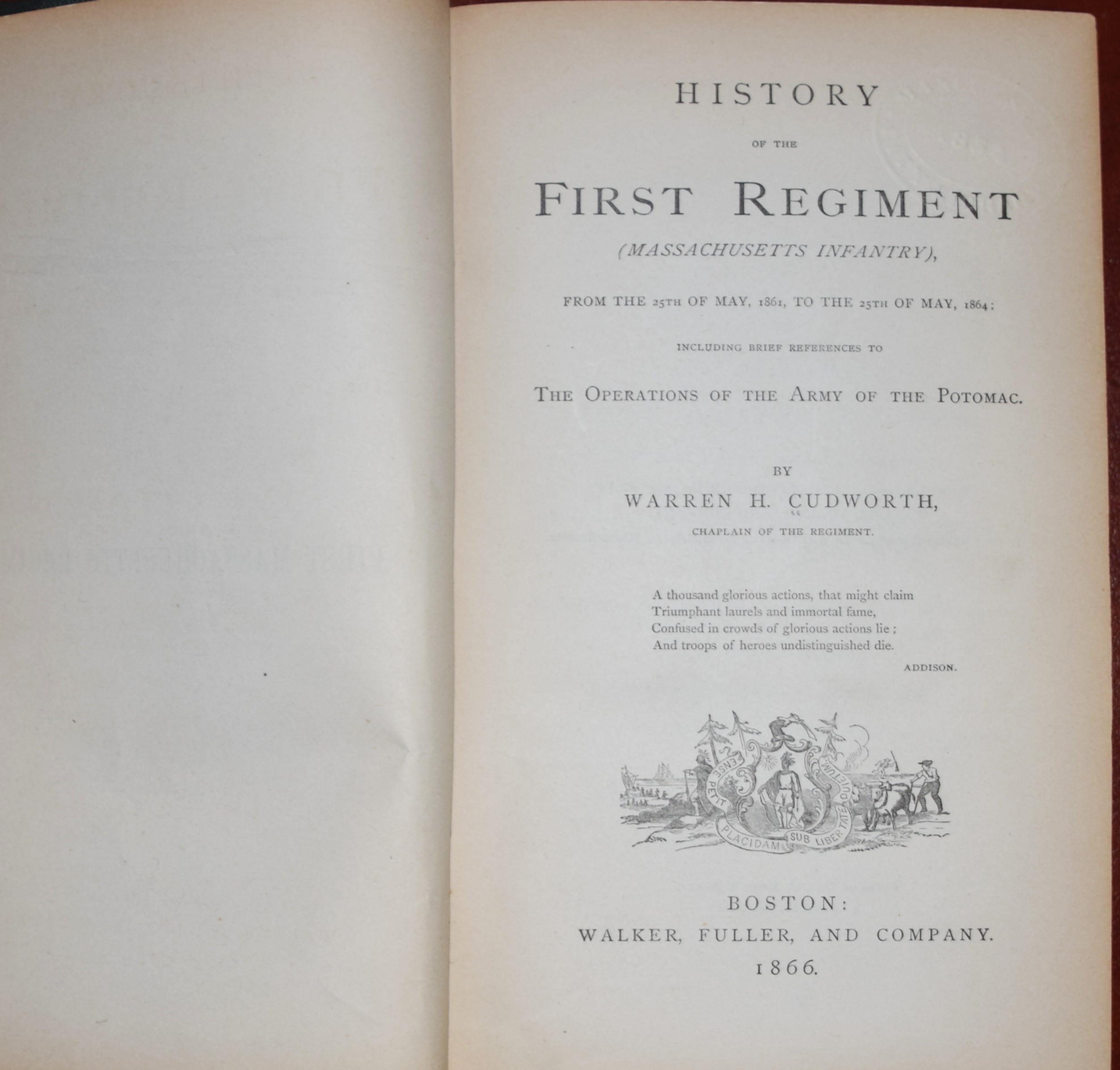 Civil War regimental “The First Massachusetts Regiment” by Warren Cudworth, 1st edition, 1866, Walker, Fuller & Co, Boston, 528 pages