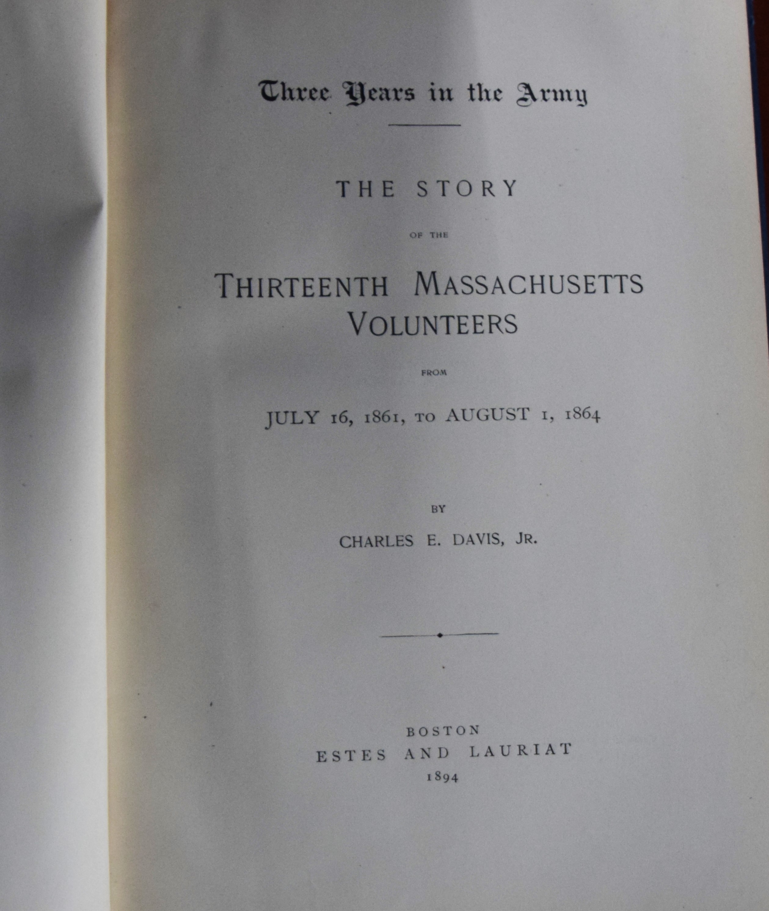 Civil War regimental “Three Years In The Army Thirteen Mass. Vols.”, Charles Davis, 1st edition, 1894, Estes & Lauriat, Boston, 476 pages