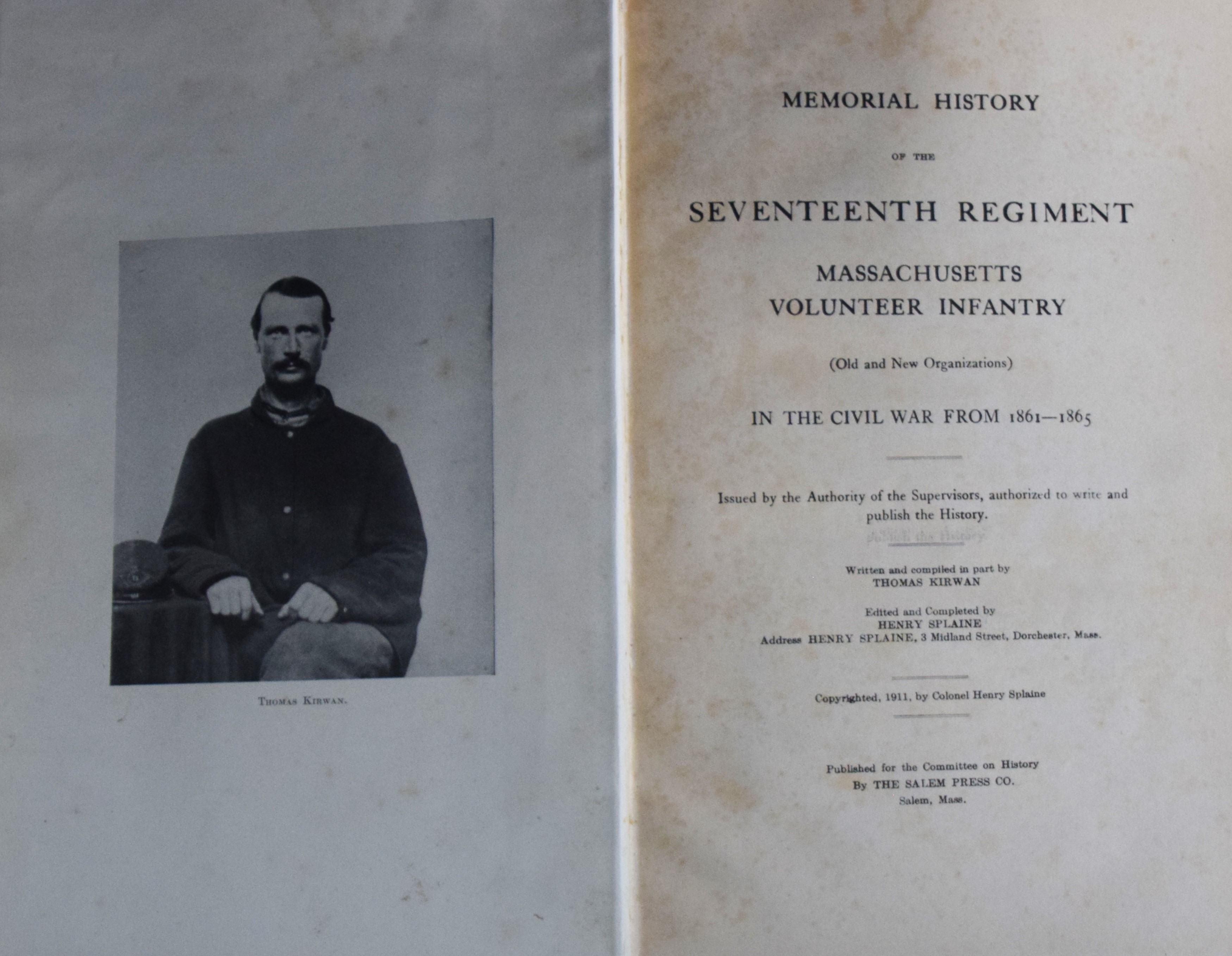 Civil War regimental “The 17th Massachusetts Volunteers” by Thomas Kirwin, 1st edition, 1911, Salem Press, 403 pages