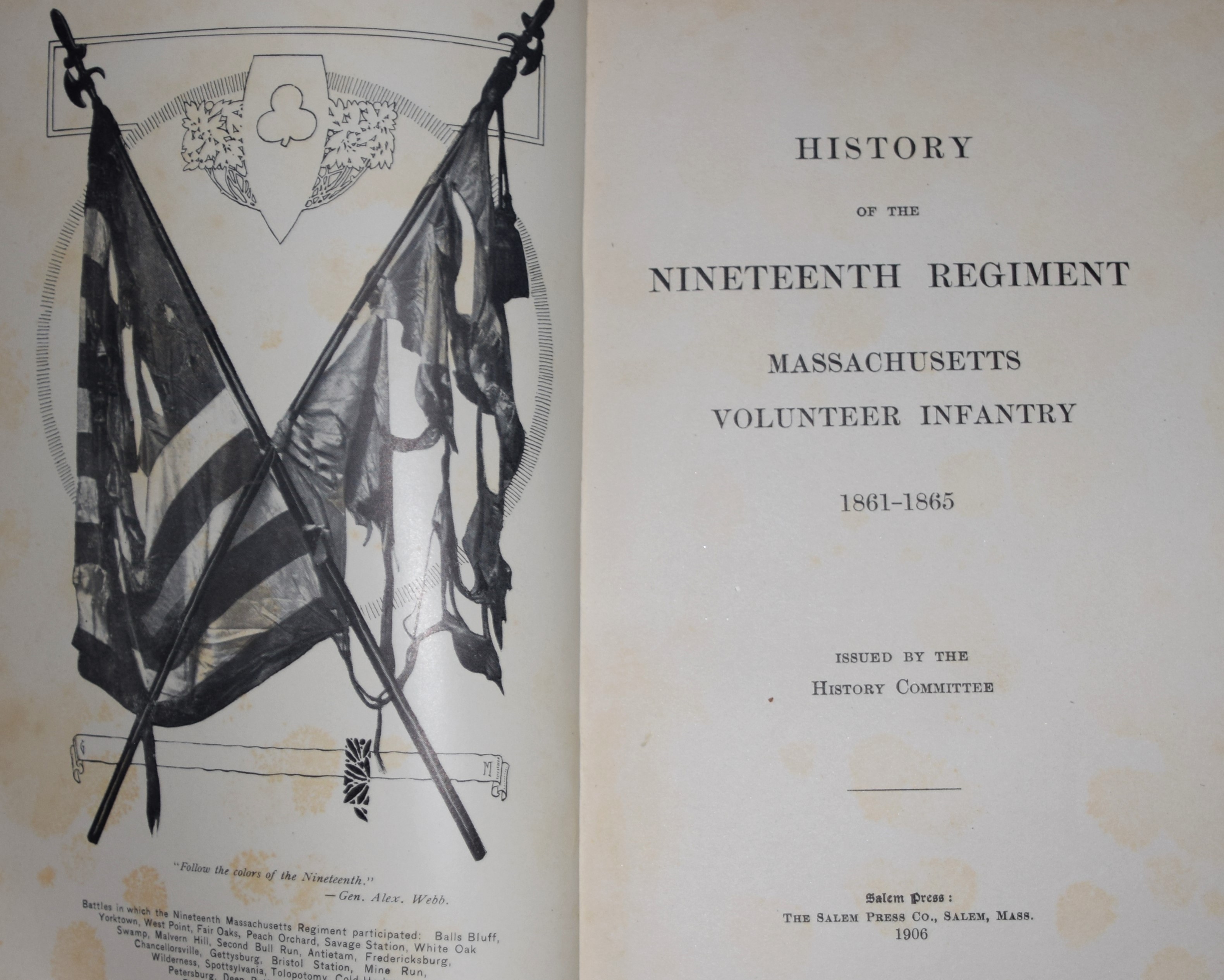 Civil War regimental, “History Of The Nineteenth Regiment Massachusetts Volunteers”, 1st edition 1906, Salem Press Co., 456 pages