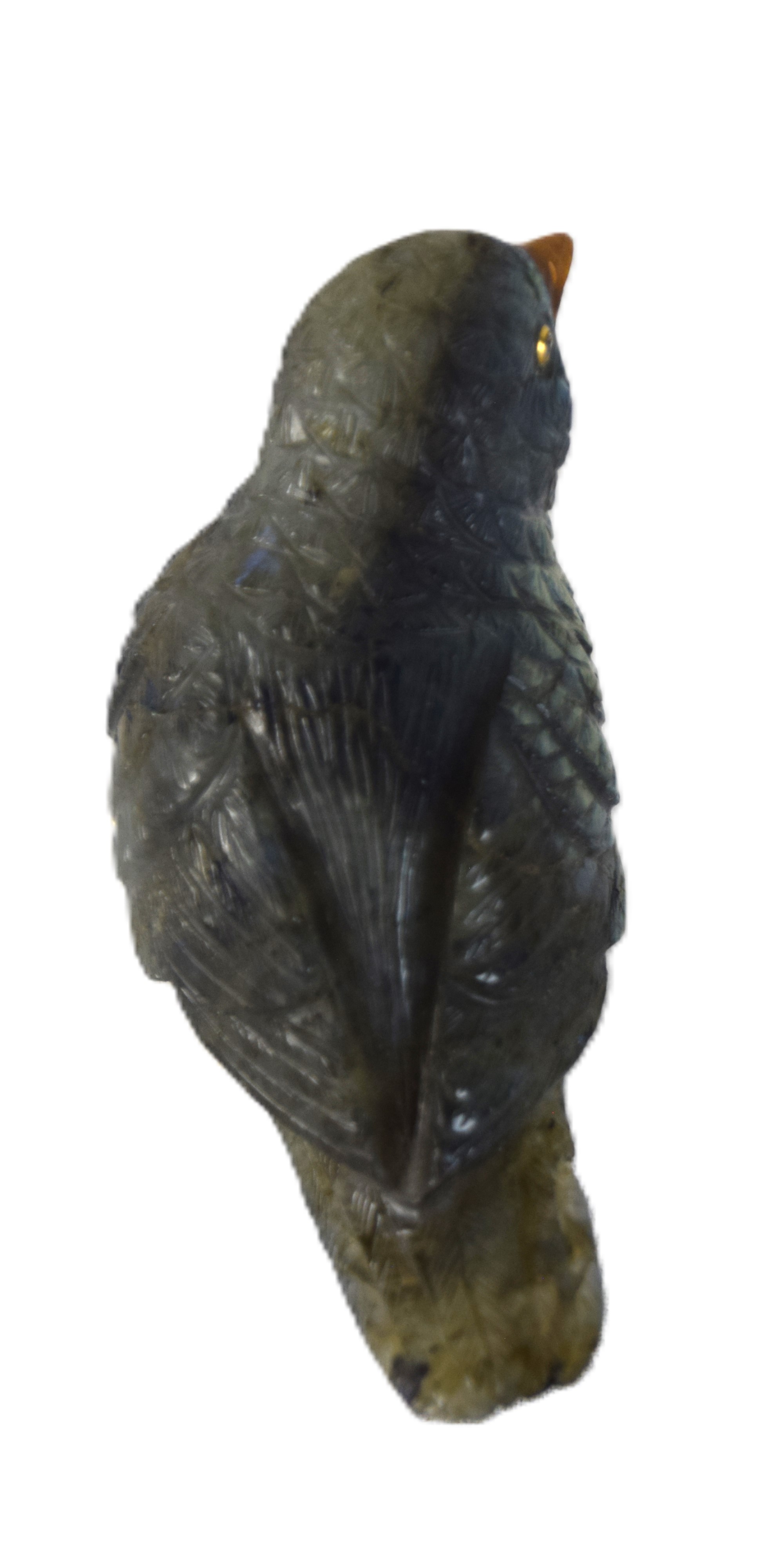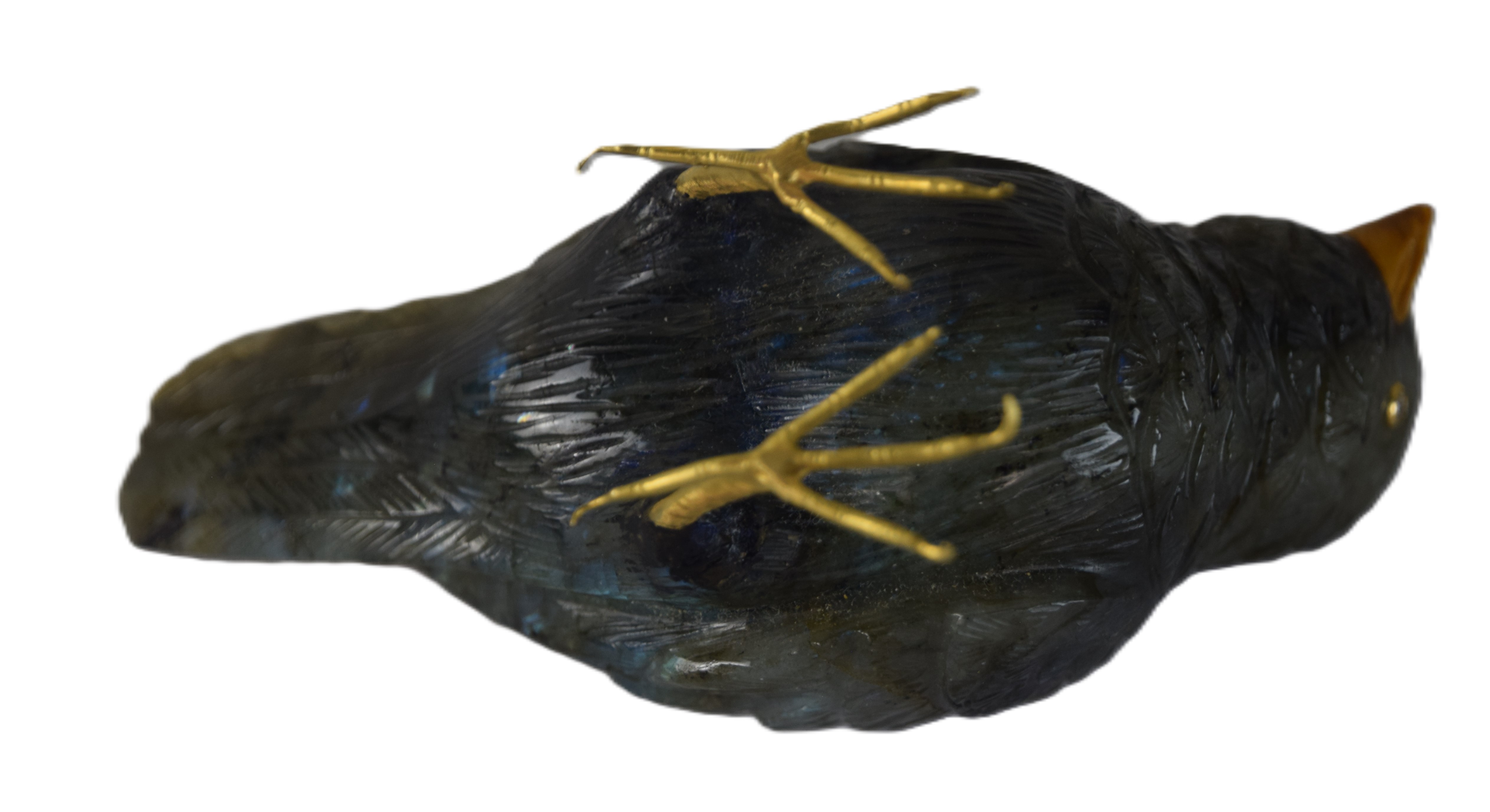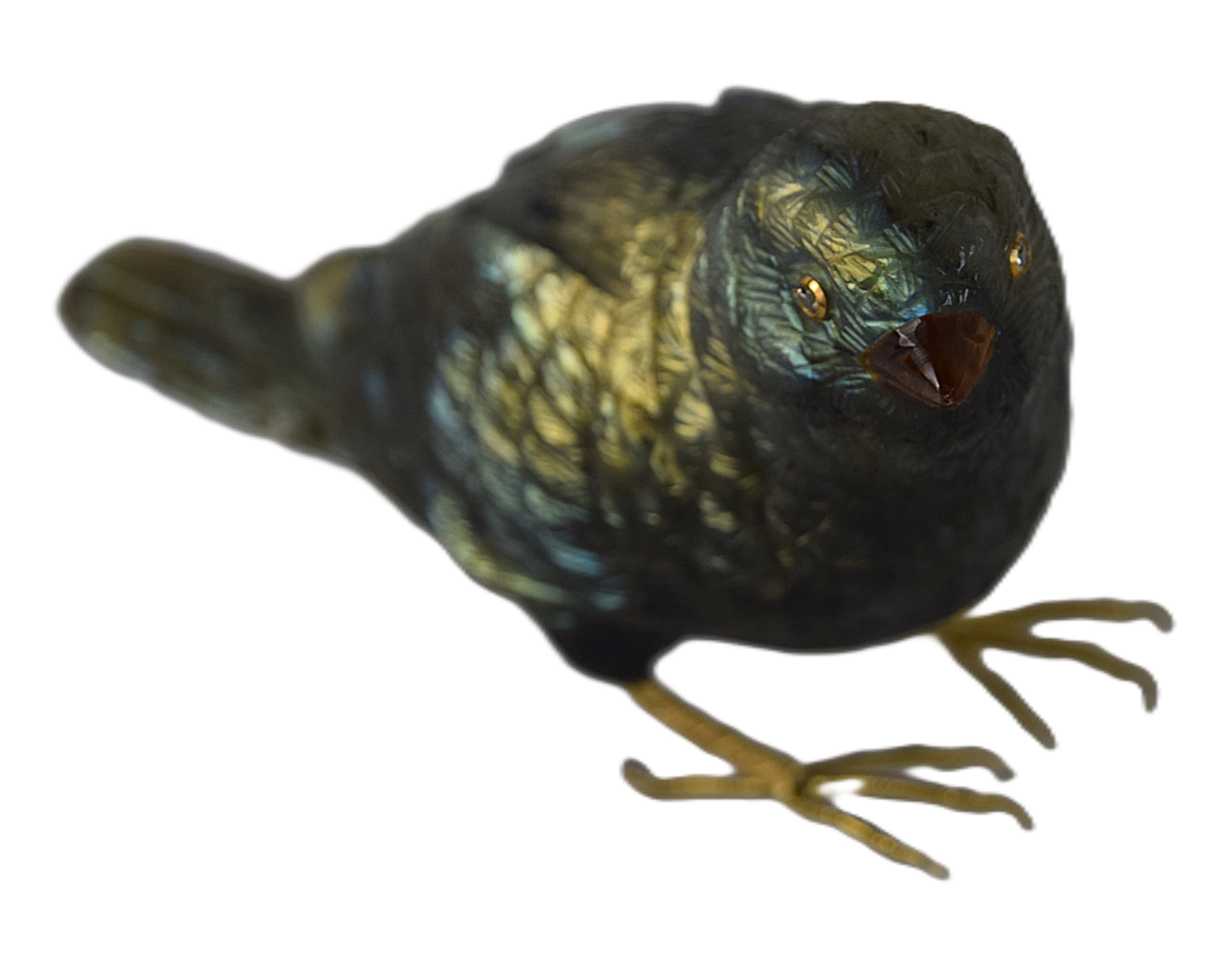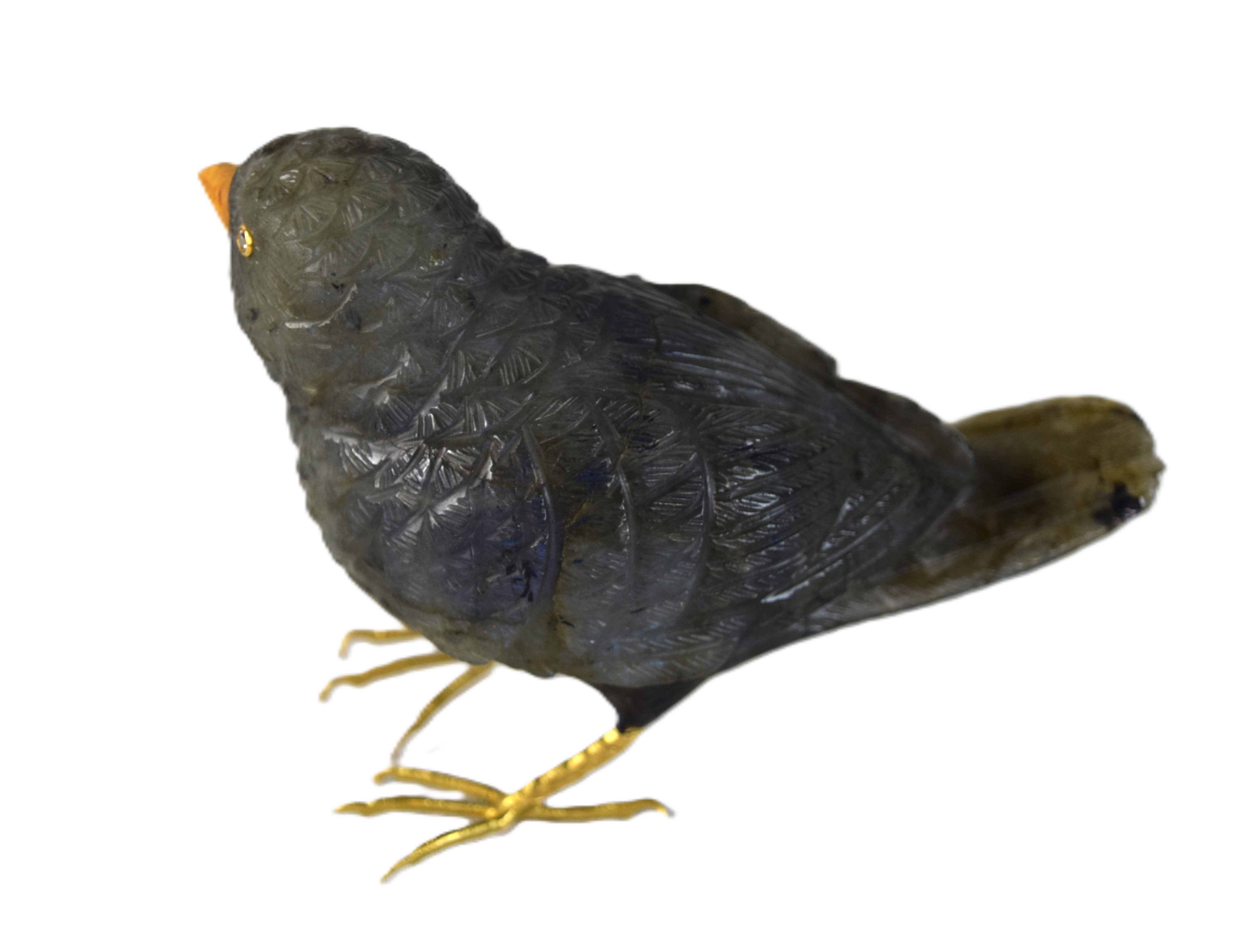 Very fine hard stone, probably rainbow obsidian, hand carved bird with gold feet, most likely diamond eyes surrounded by gold, unsigned. Very typical of Fabergé work. From a Bedford NH estate who immigrated from Russia. Dimensions: 3″ H x 4″ L