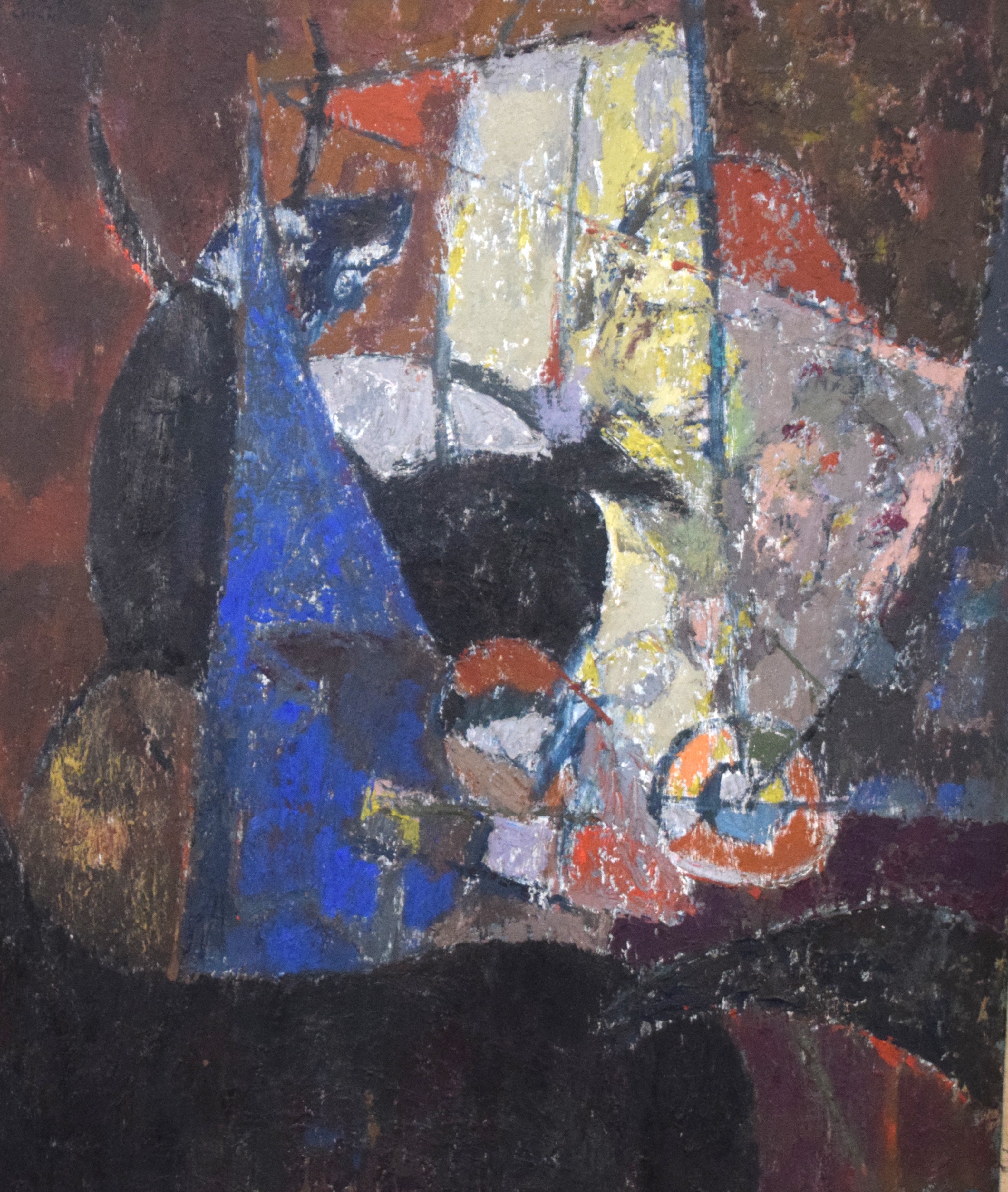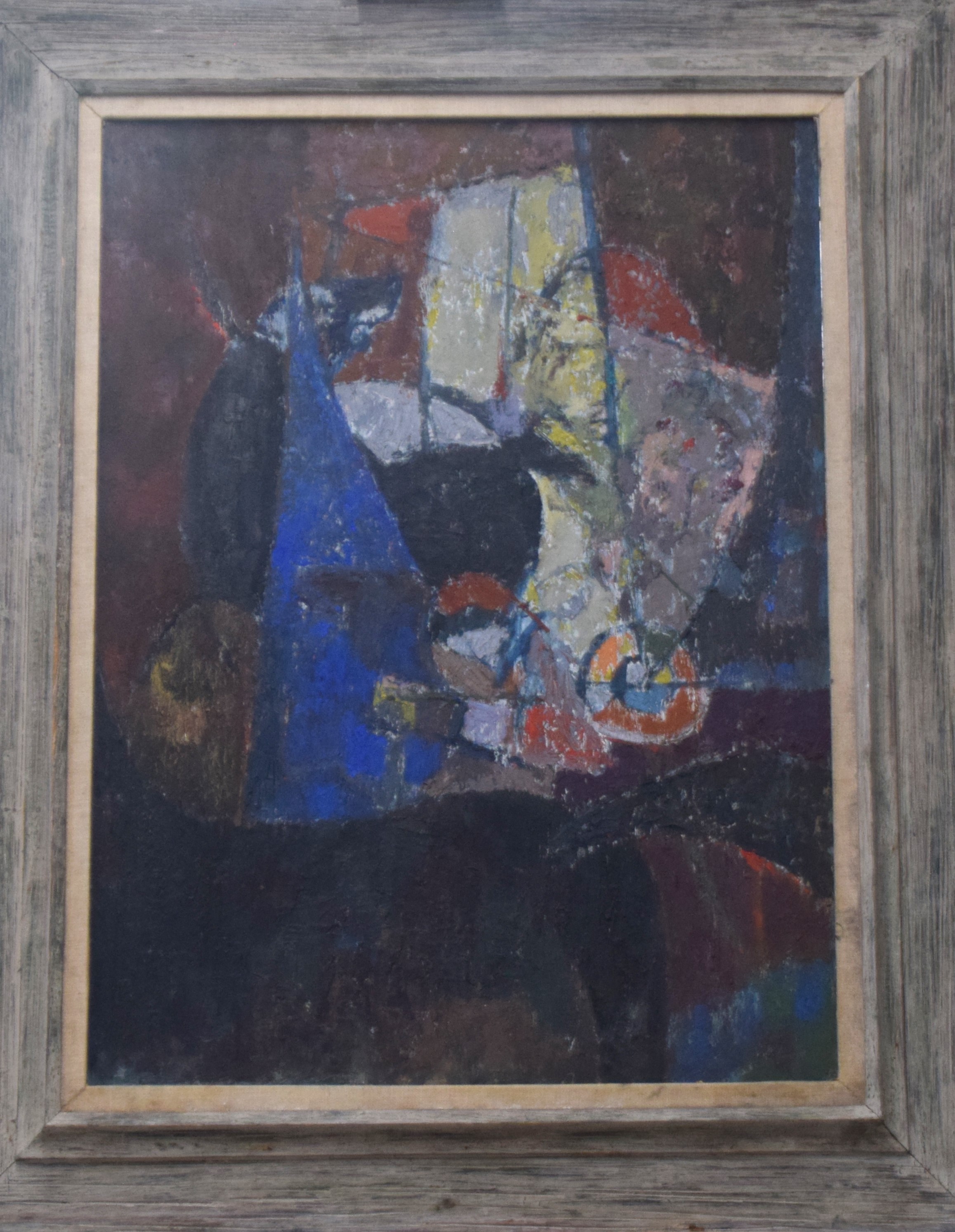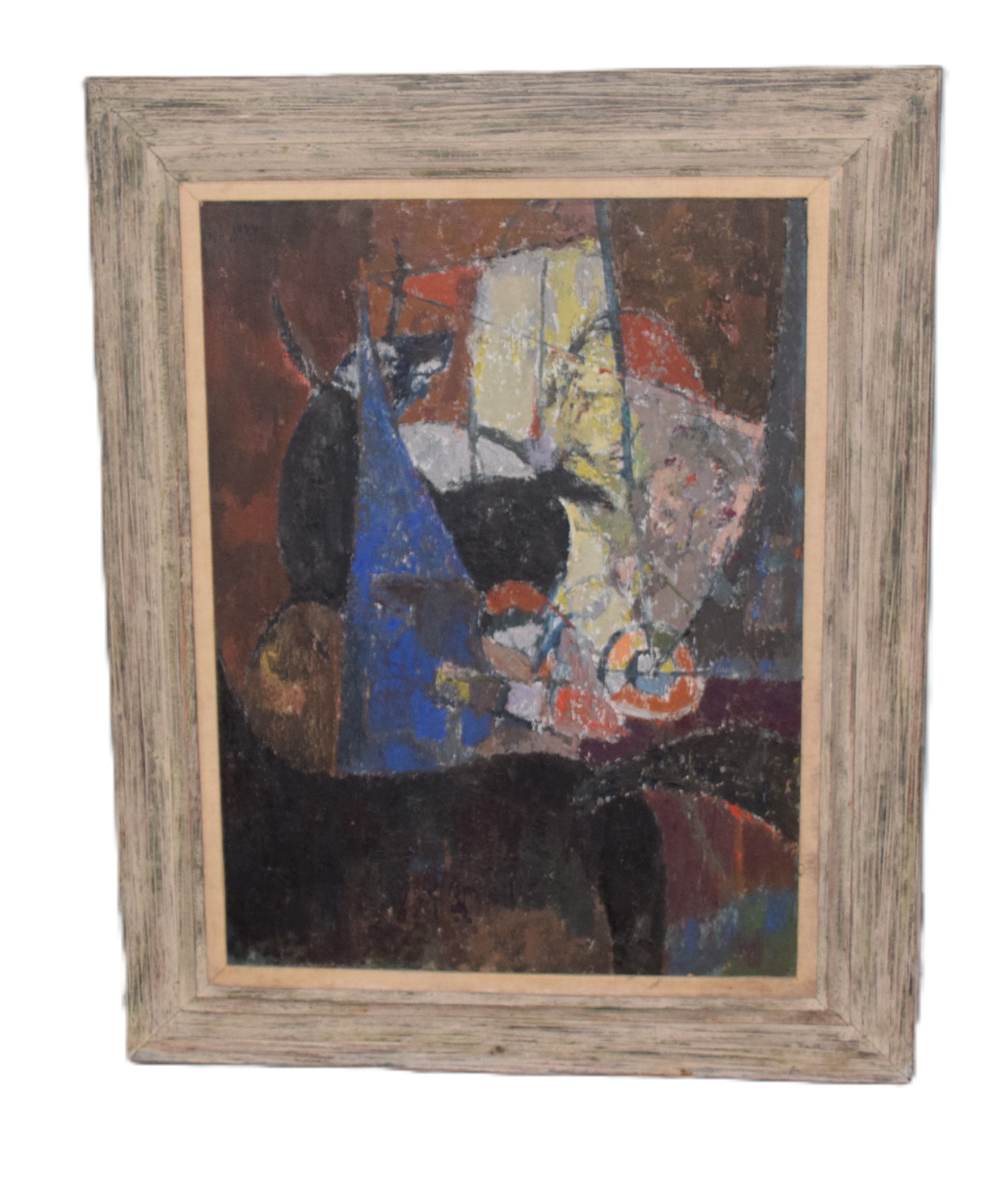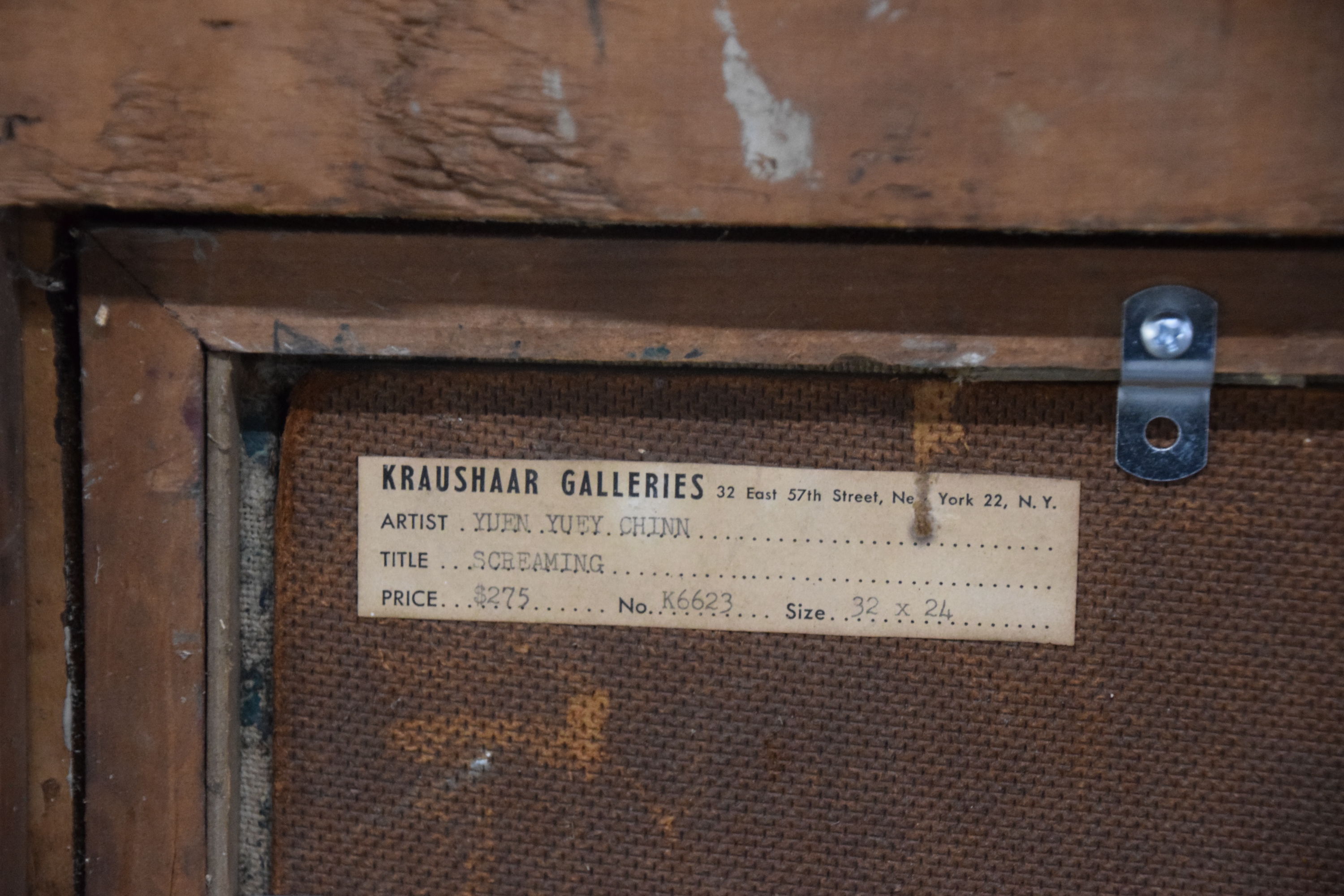 An abstract oil on Masonite by Yuen Chinn. Yuen Yuey Chinn (Born 1922) worked in New York and China as a painter and graphic artist. Provenance: Kraushaar Galleries of New York. Dimensions: 32″ x 24″