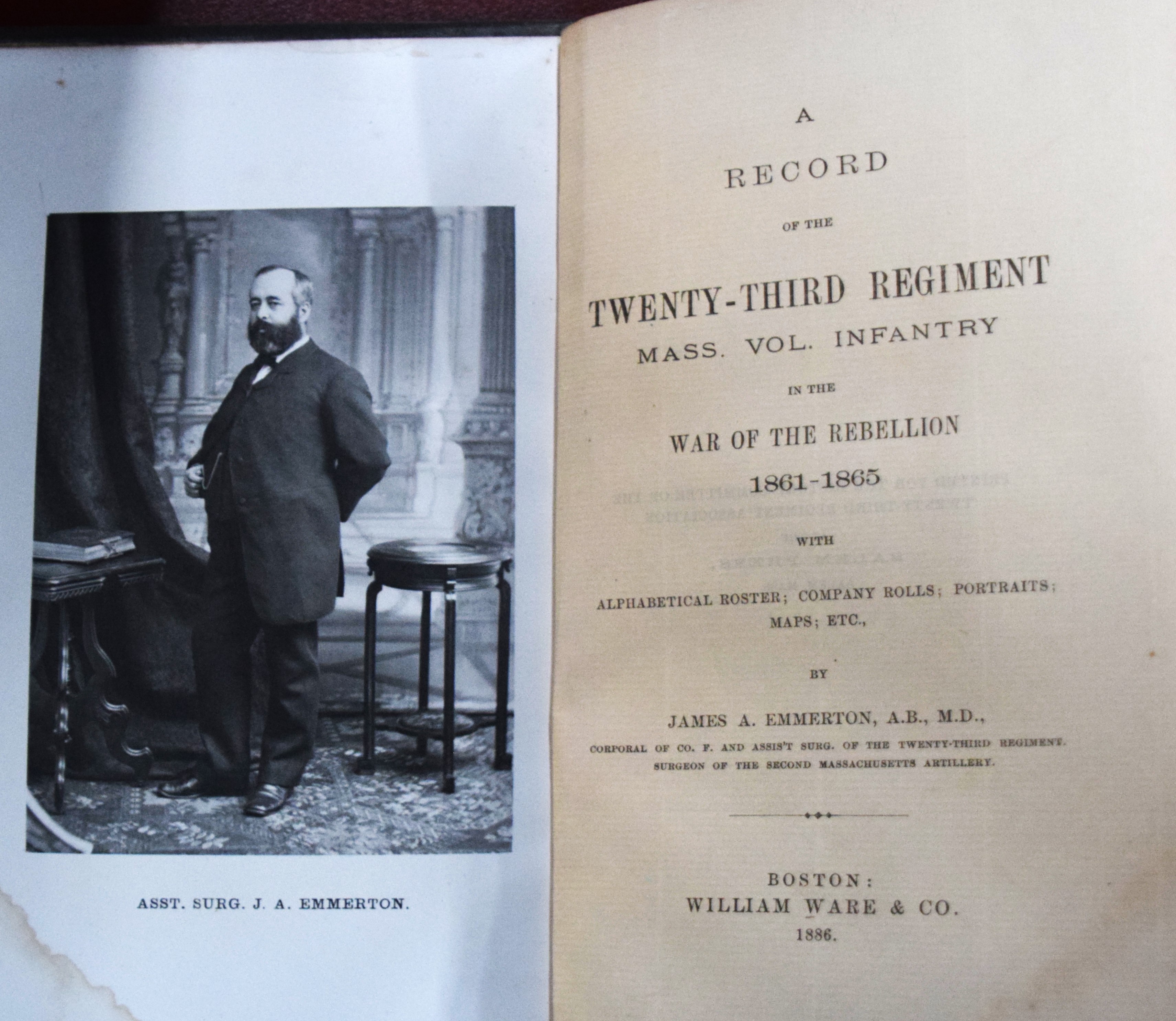 Civil War regimental, “Record Of The Twenty-Third Regiment Massachusetts Volunteers”, by James Emerson, 1st edition, 1886, William Ware & Co, Boston, 351 pages