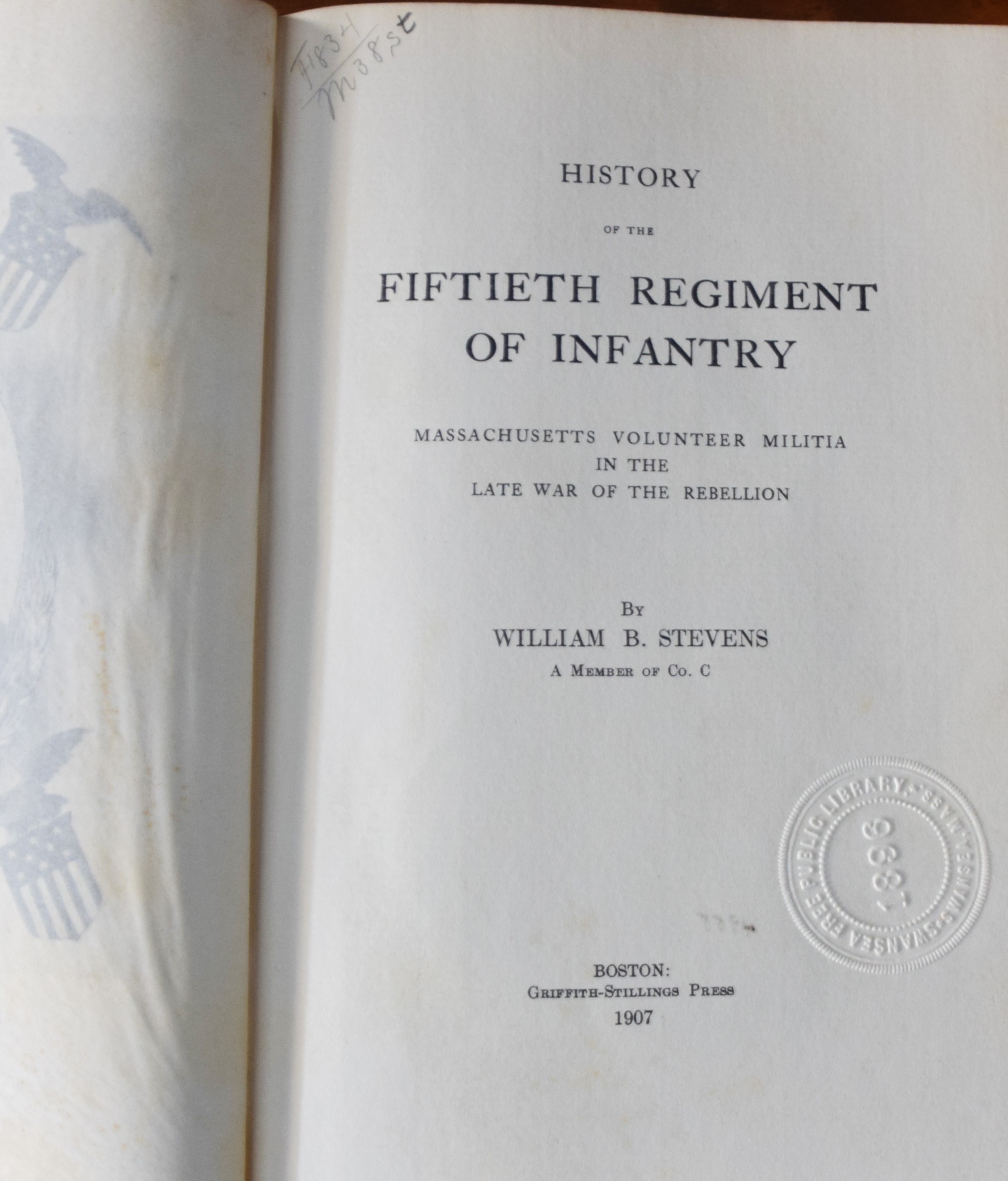 Civil War regimental “History Of The Fiftieth Regiment Of Infantry M.V.M.”, by William B Stevens, 1st edition, William B. Stevens, 1907, Griffith-Stillings Press, 399 pages
