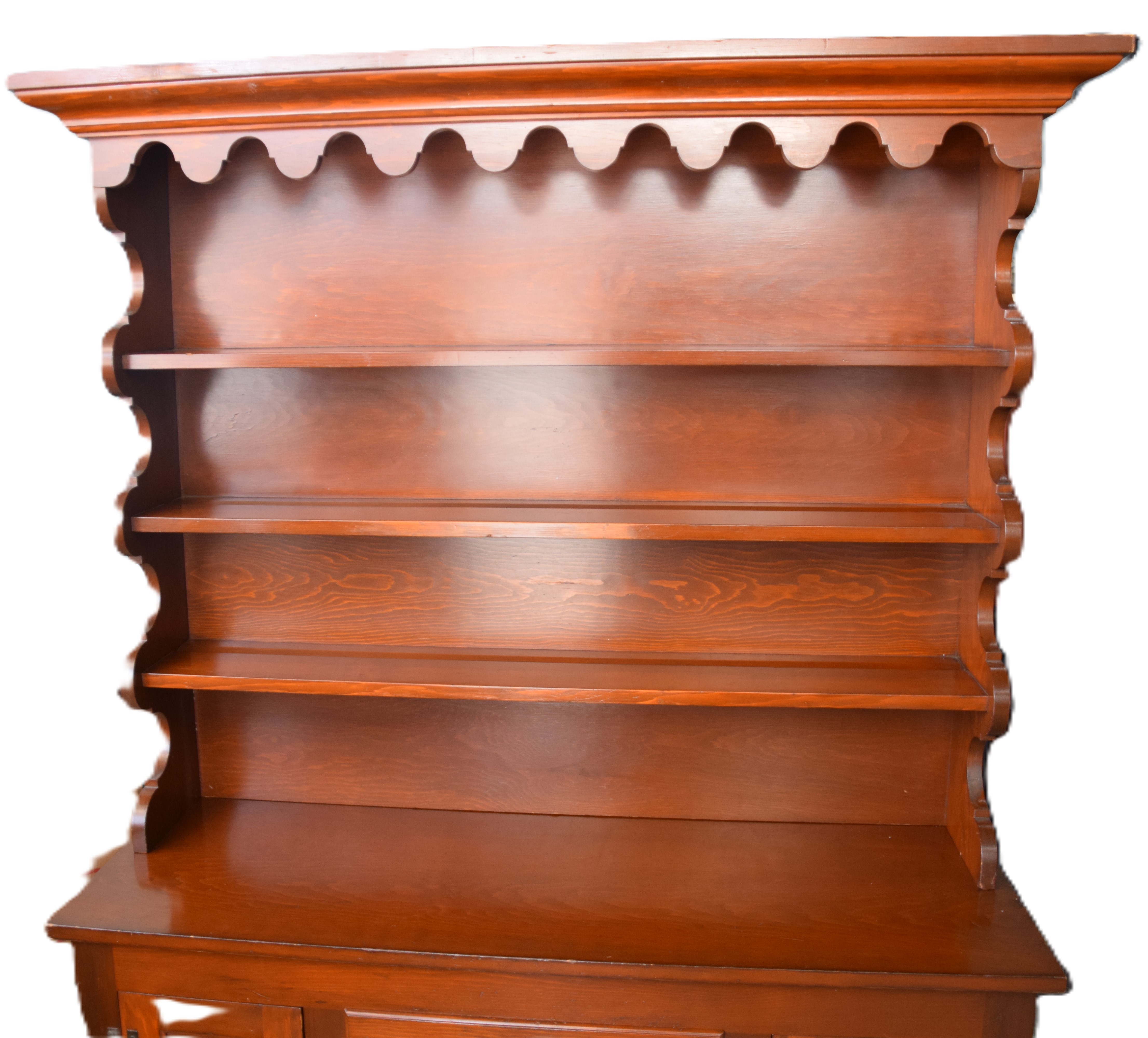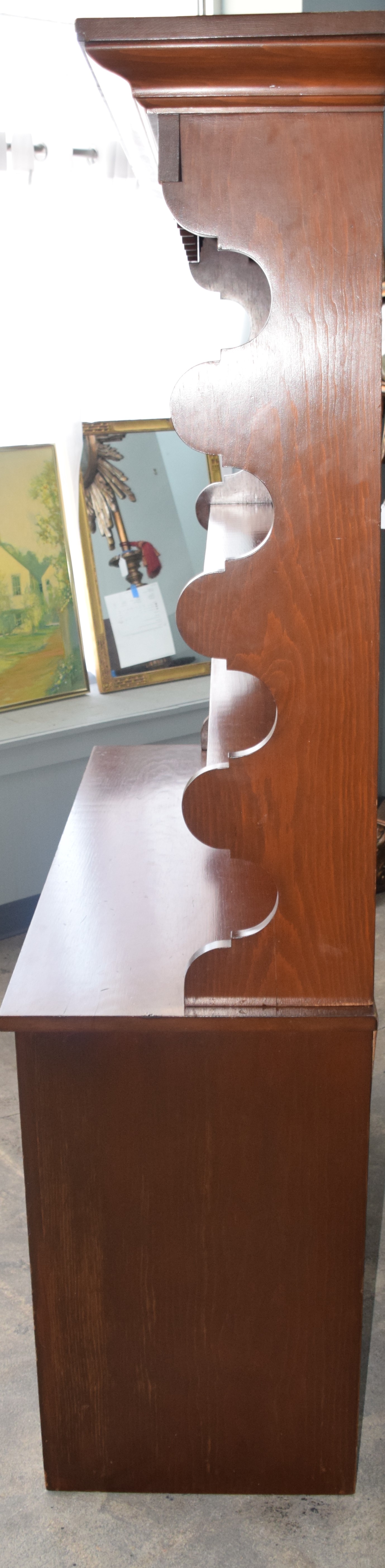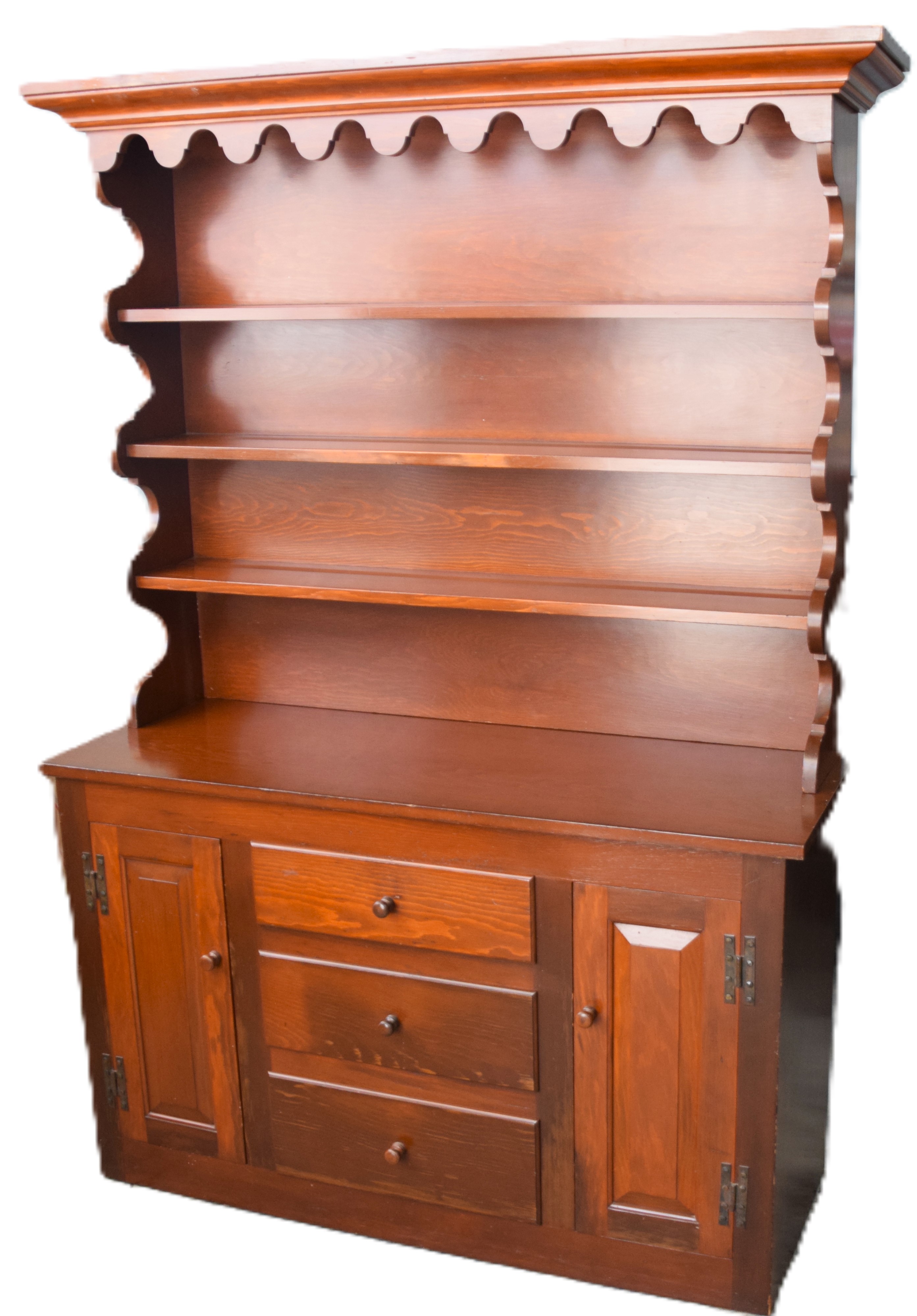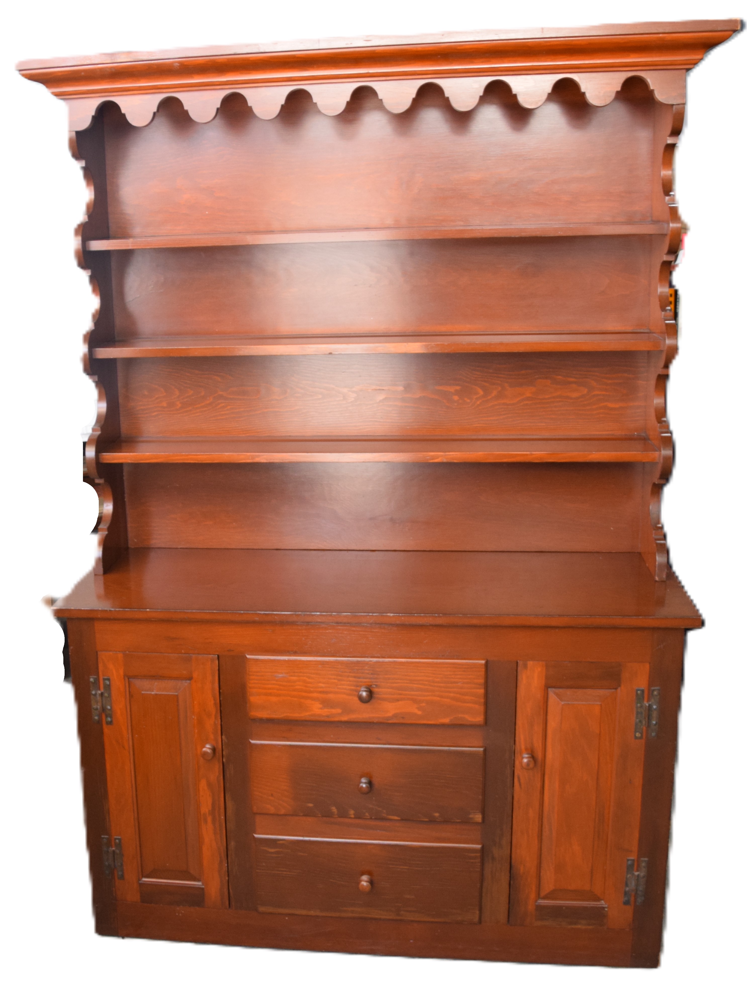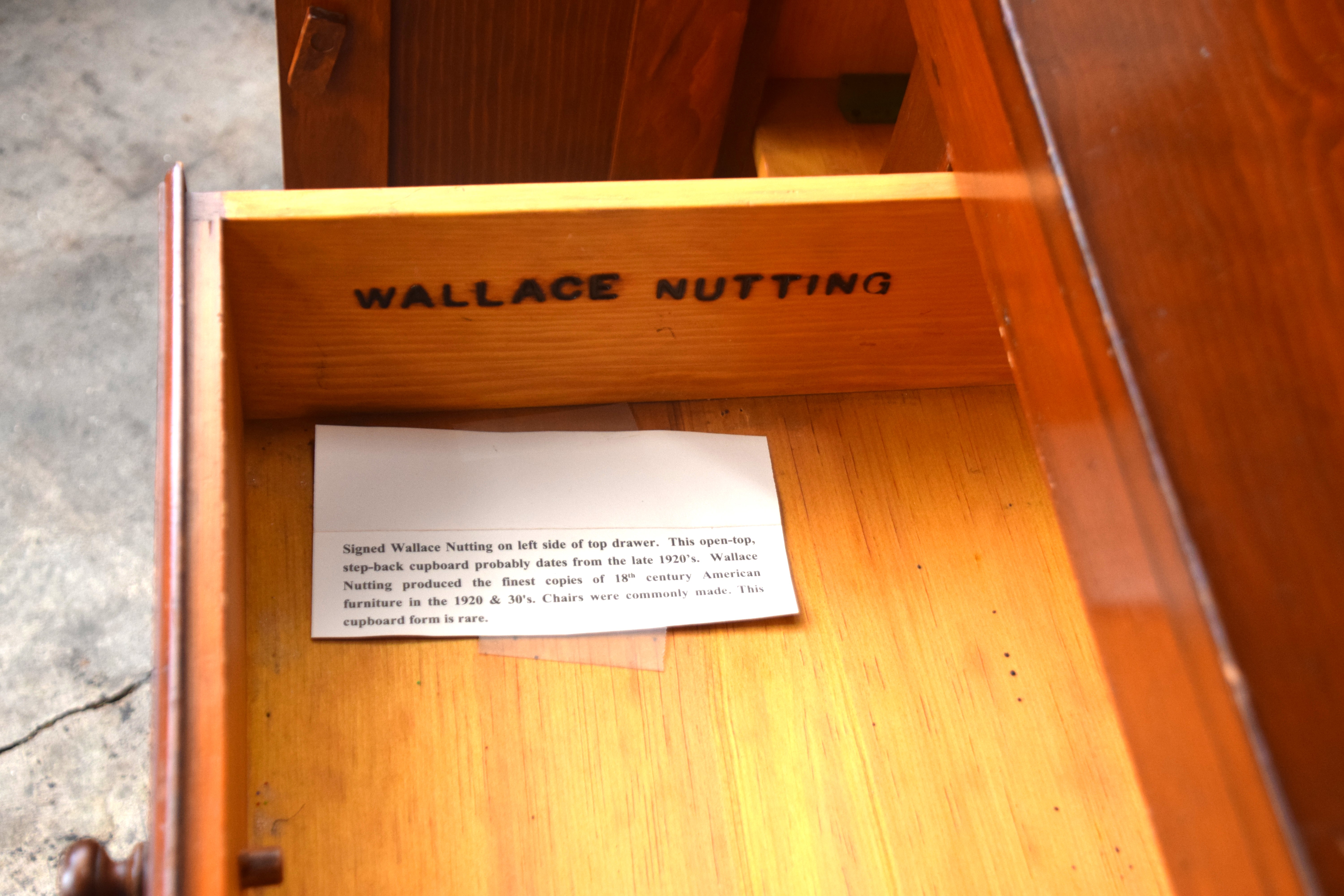 Fine two-part pine Wallace Nutting cupboard molded scalloped top. Plate grooved shelves, with lower section with three drawers, flanked by two raised paneled doors with “H” hinges. Top drawer stamped with “Wallace Nutting”. This cupboard is probably from the 1920s era. Dimensions: 75″ H x 51″ L x 18.5″ D