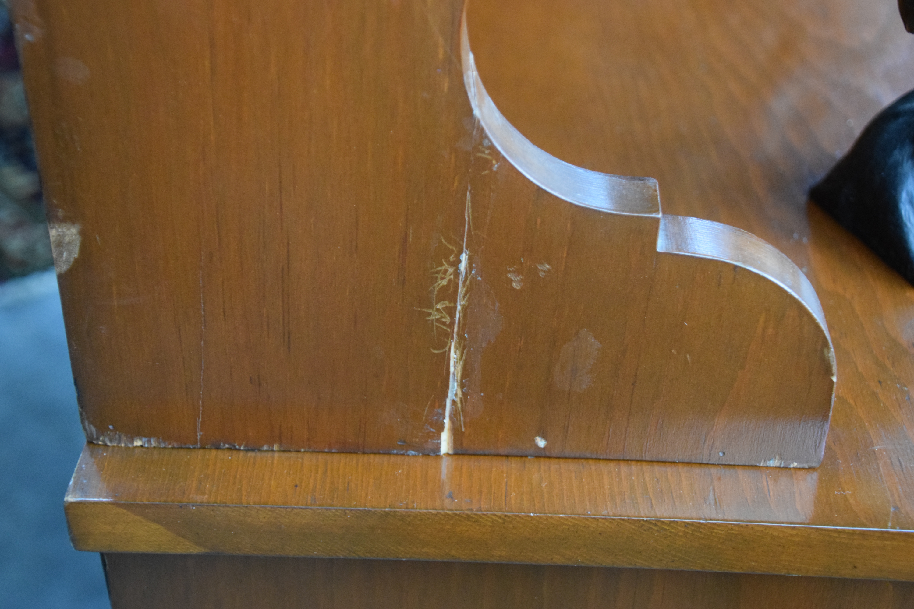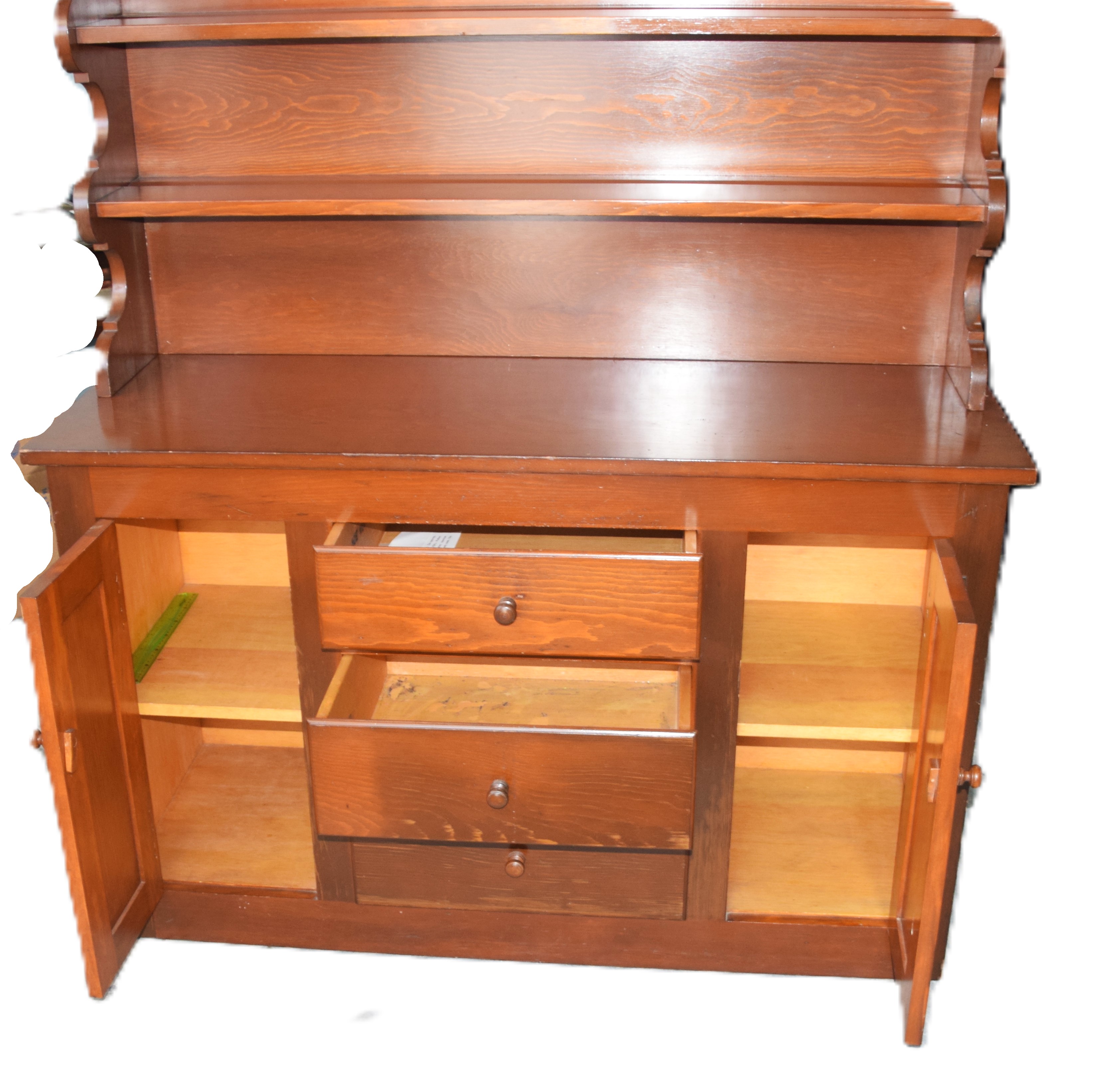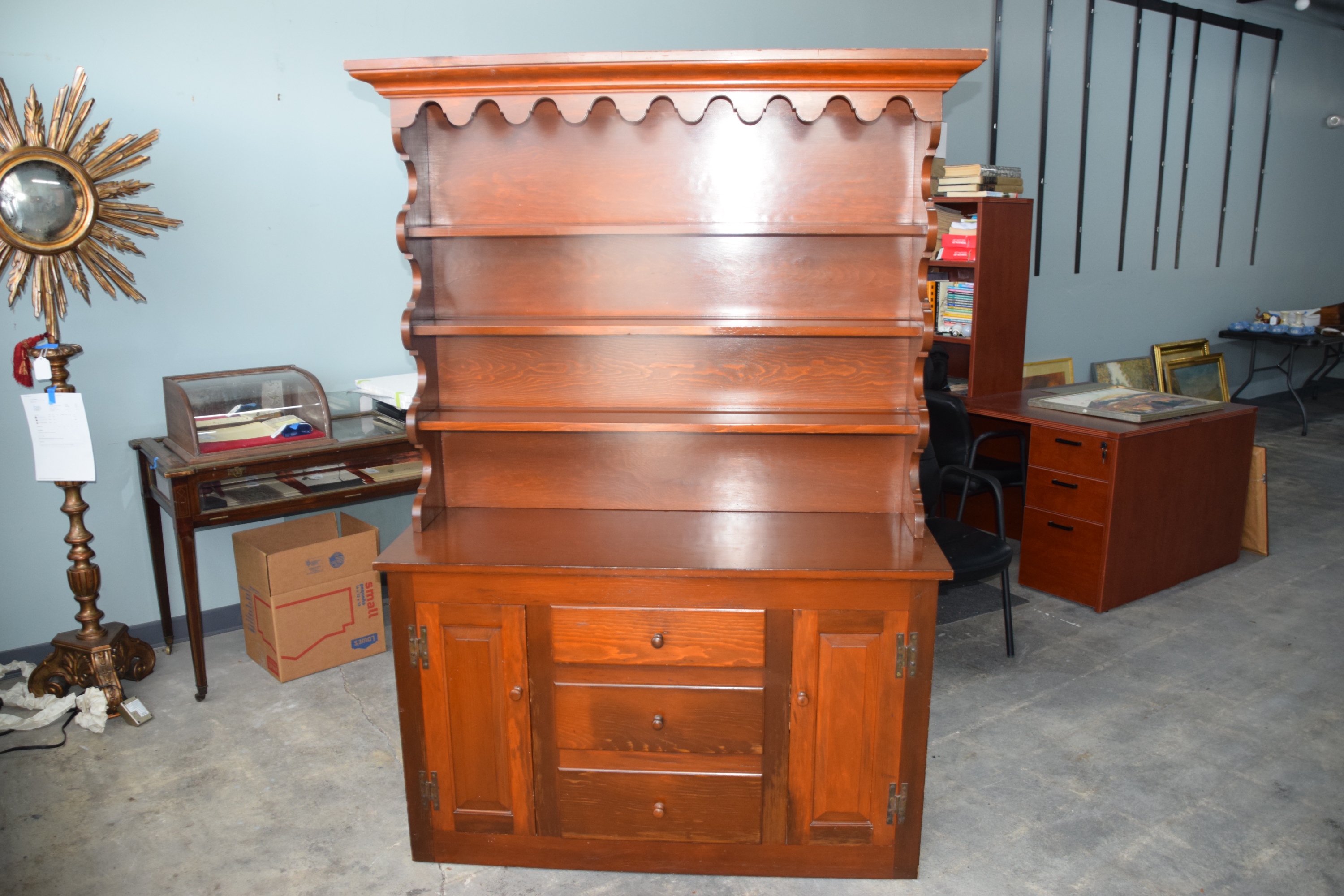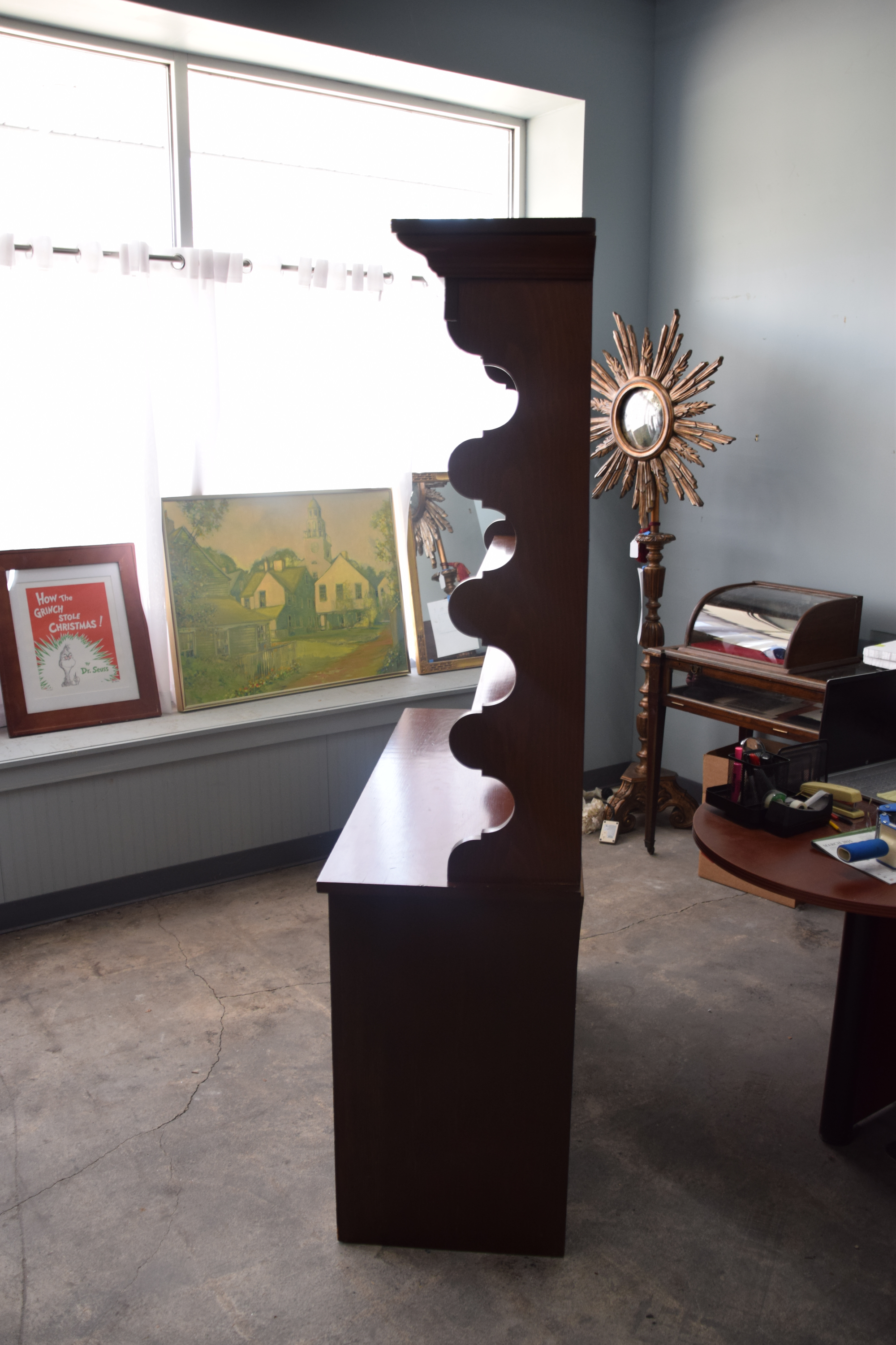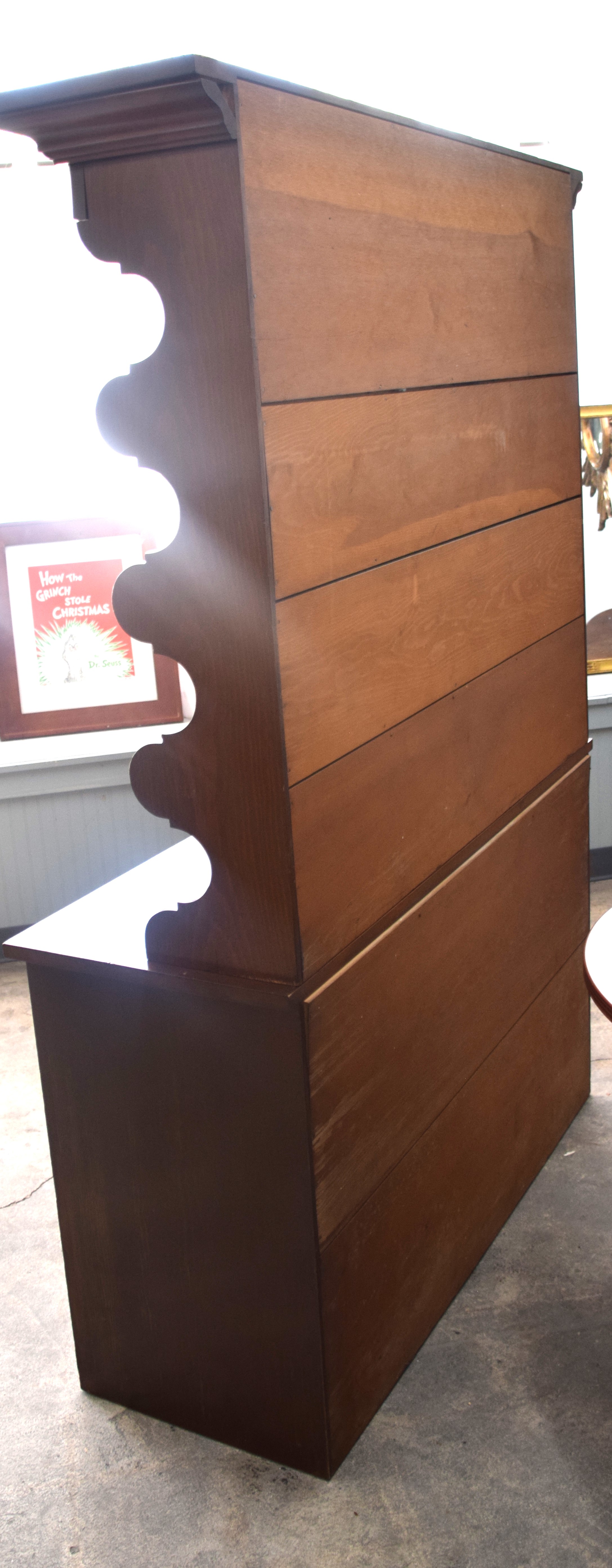 Fine two-part pine Wallace Nutting cupboard molded scalloped top. Plate grooved shelves, with lower section with three drawers, flanked by two raised paneled doors with “H” hinges. Top drawer stamped with “Wallace Nutting”. This cupboard is probably from the 1920s era. Dimensions: 75″ H x 51″ L x 18.5″ D
