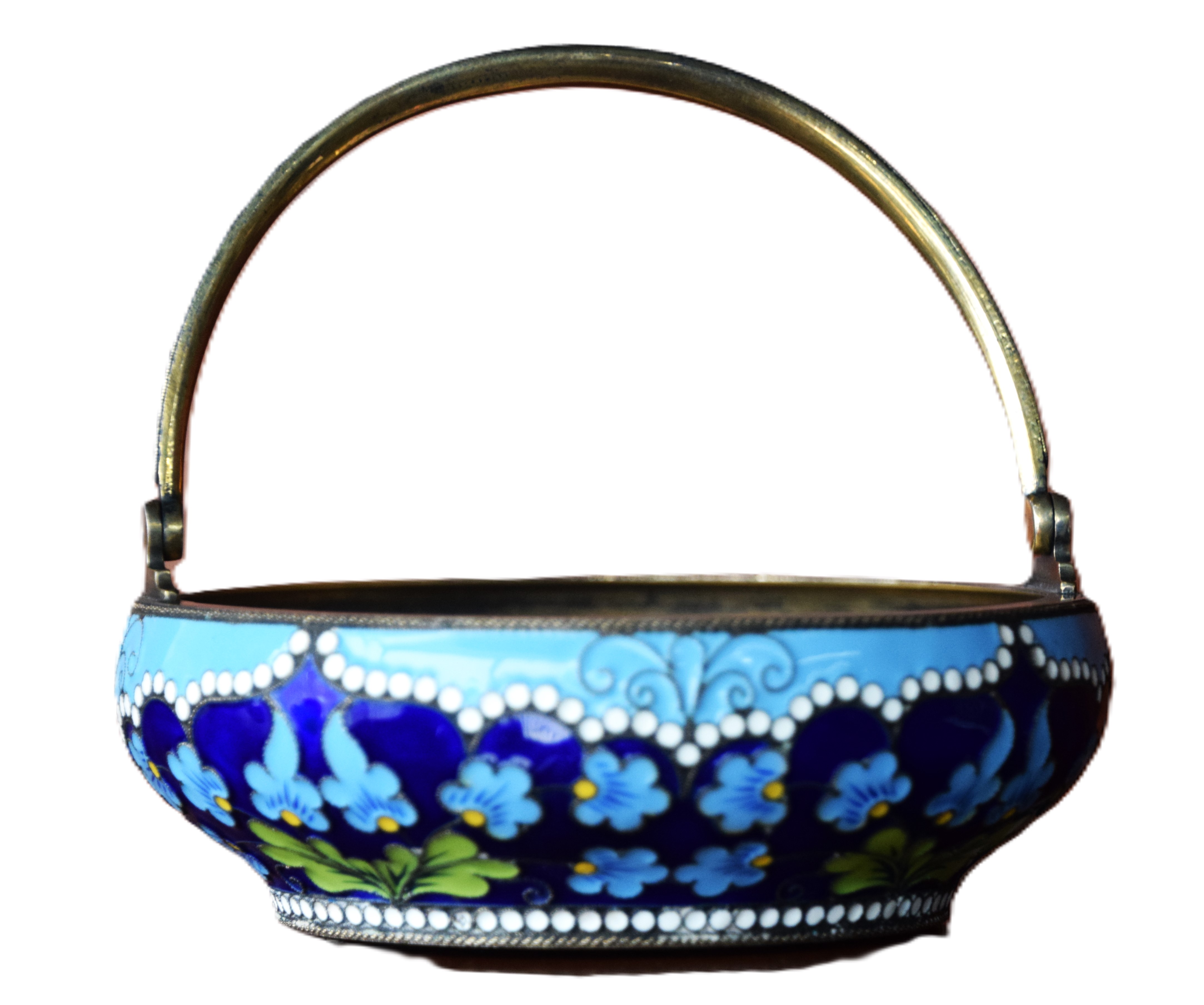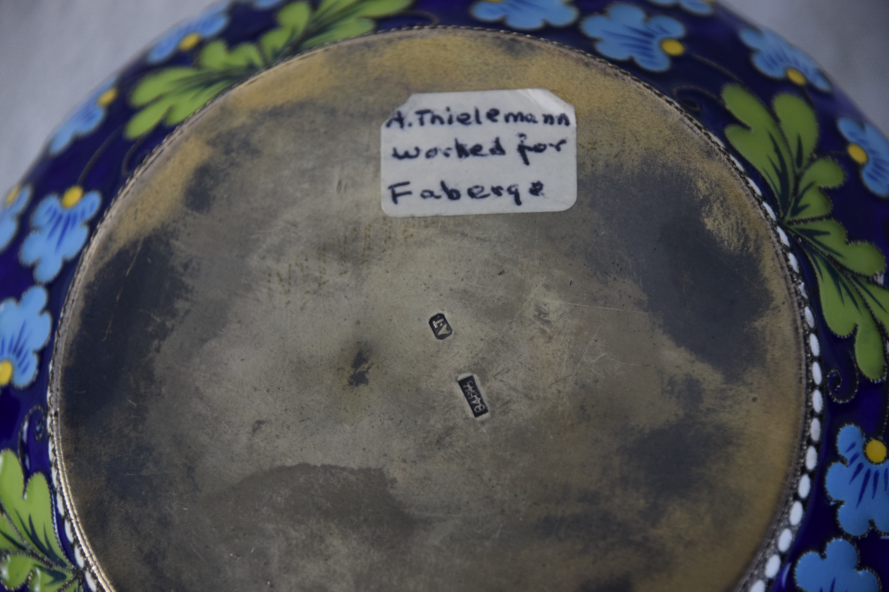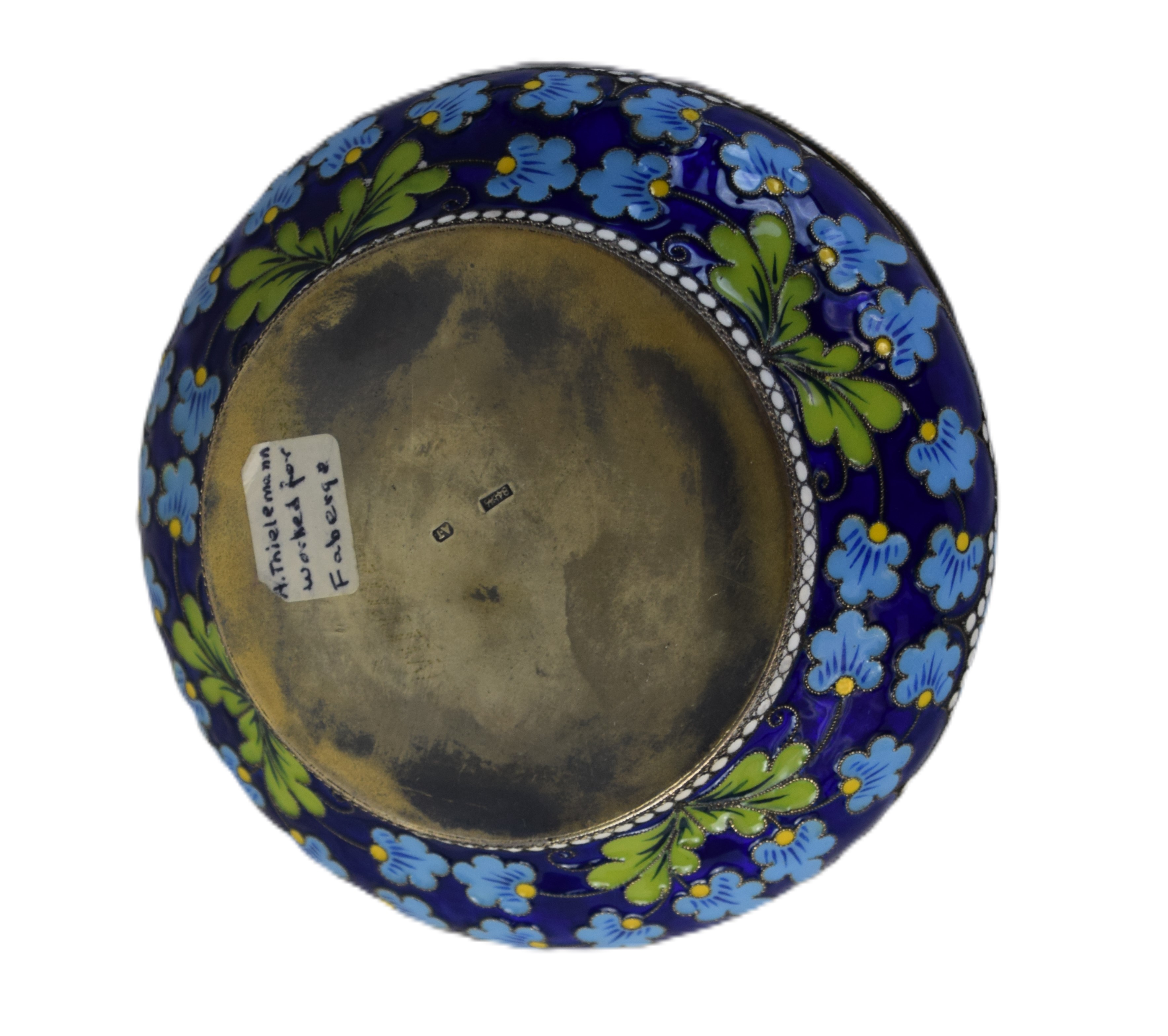 A fine art candy dish with handle and with floral designs made by Alfred Thielemann, an active jeweler for Fabergé from 1880 to 1910. Signed AT on bottom of bowl. From a Bedford NH Estate whose family immigrated from Russia. Dimensions: 4″ Dia r mark was ‘AT’ (possibly).