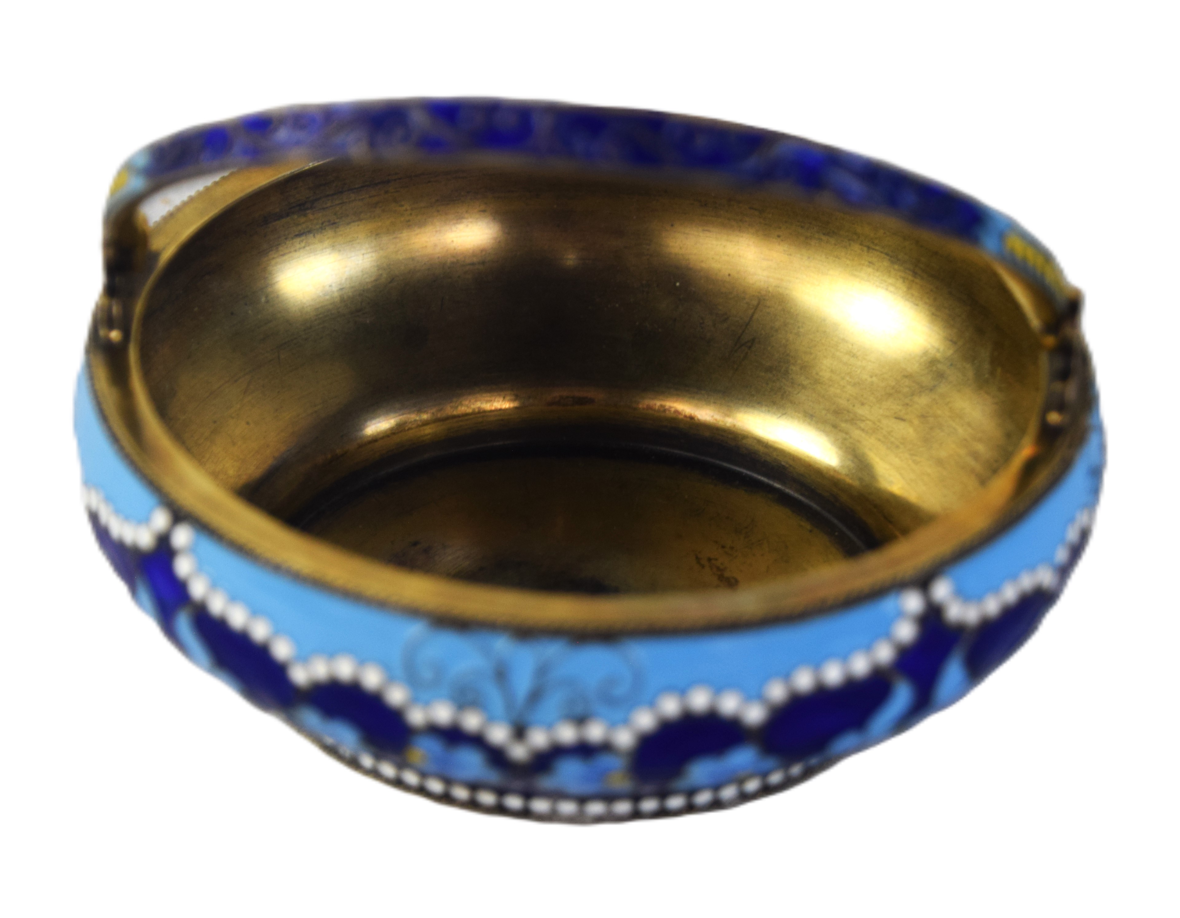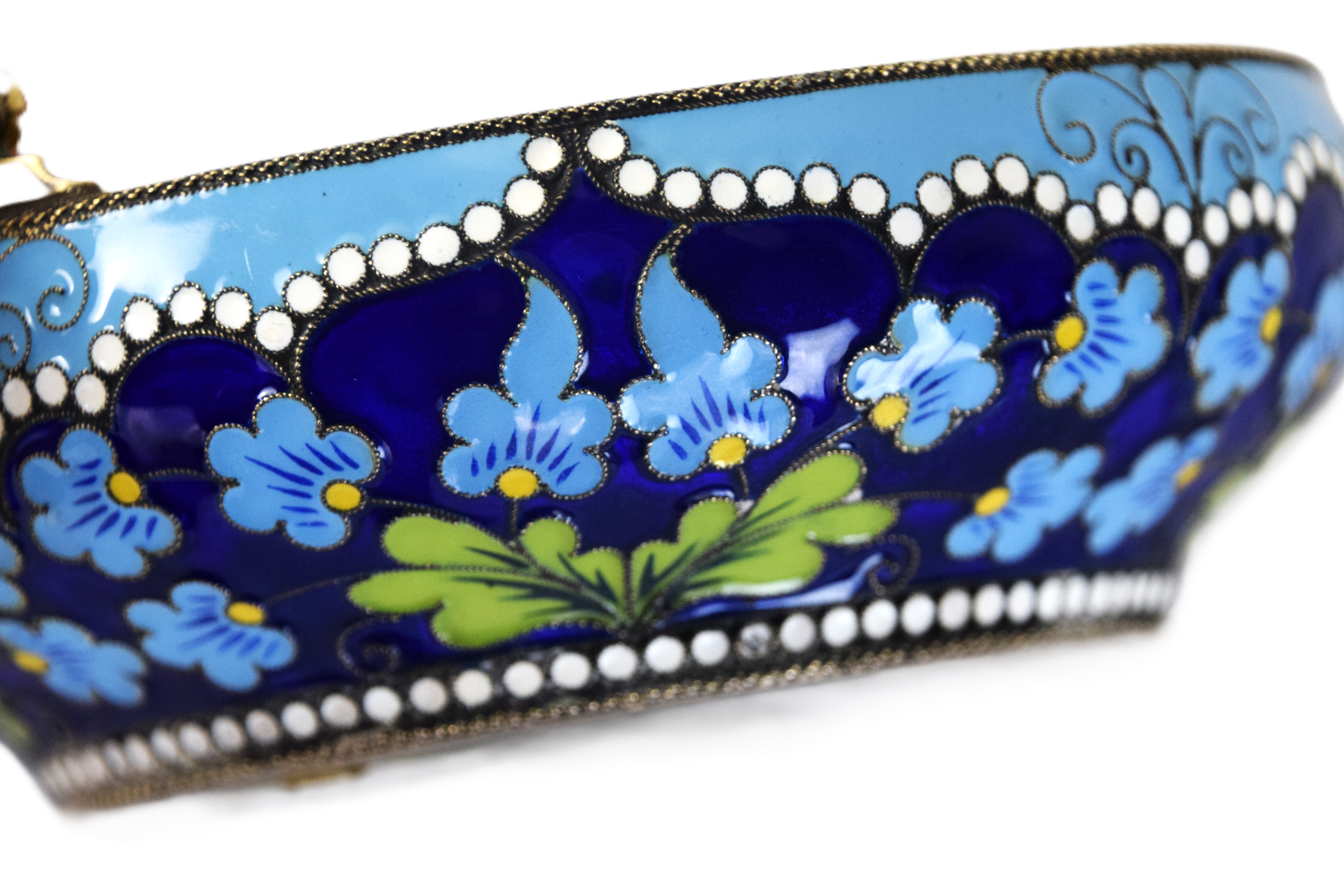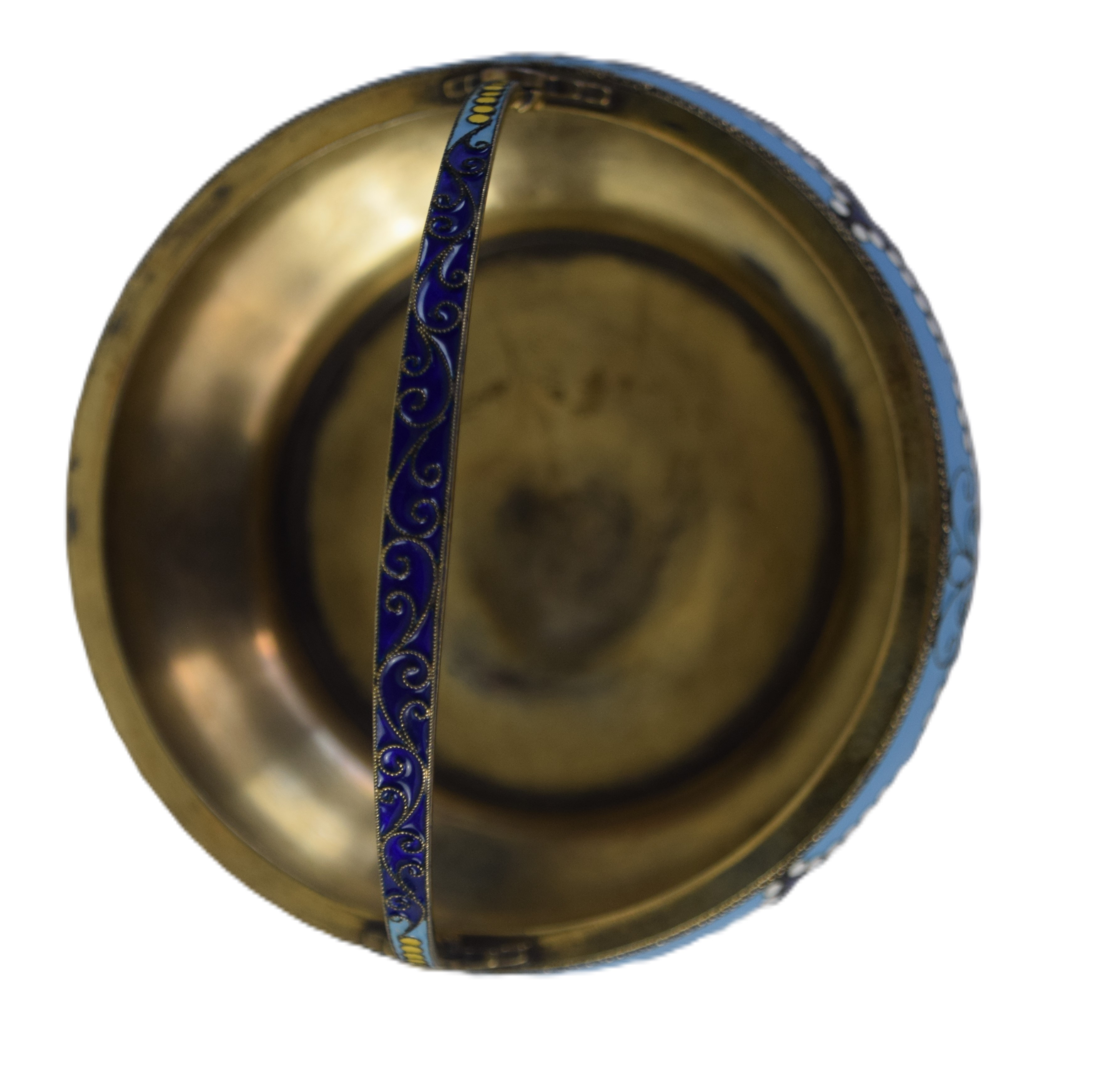 A fine art candy dish with handle and with floral designs made by Alfred Thielemann, an active jeweler for Fabergé from 1880 to 1910. Signed AT on bottom of bowl. From a Bedford NH Estate whose family immigrated from Russia. Dimensions: 4″ Dia r mark was ‘AT’ (possibly).