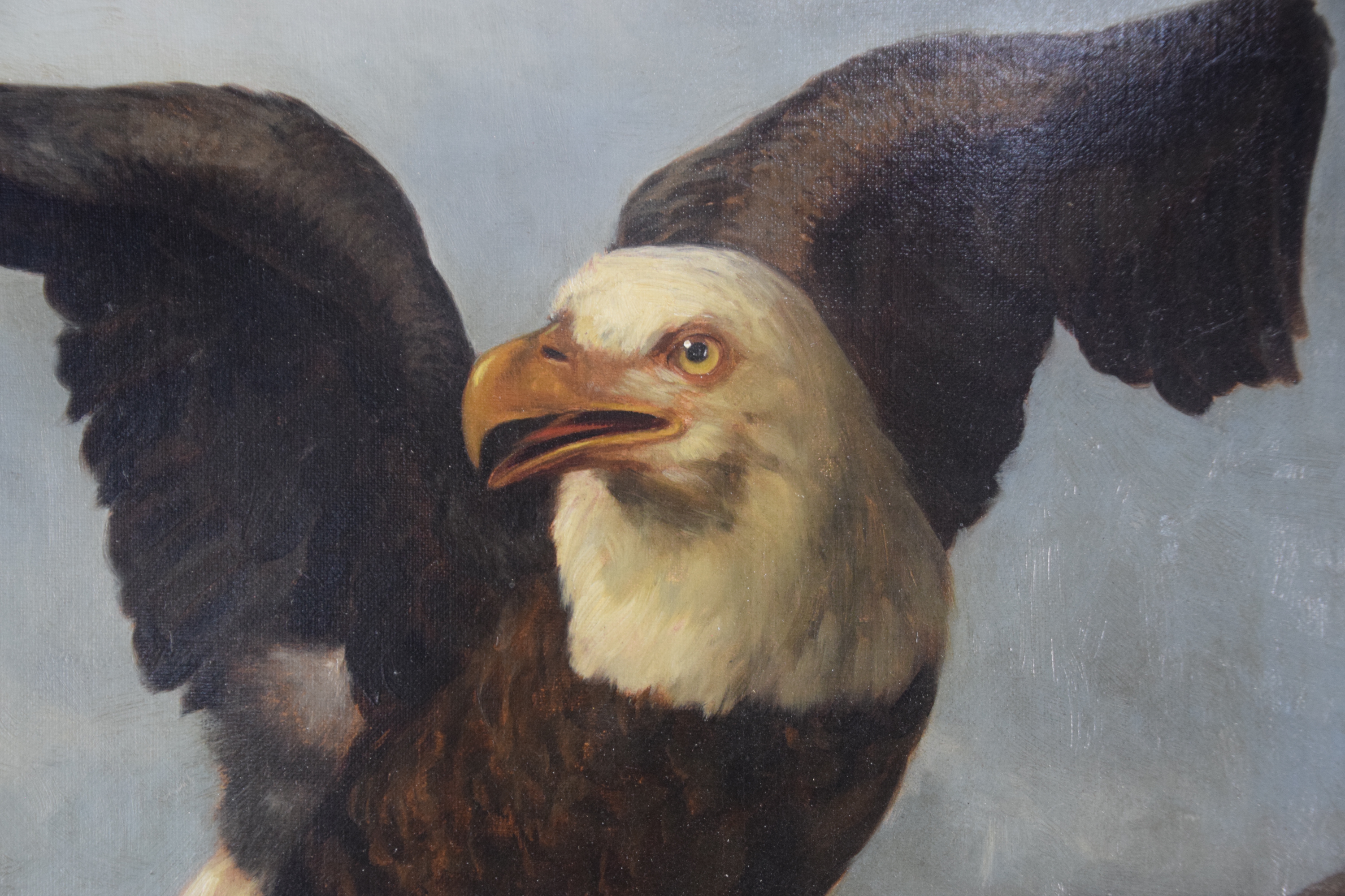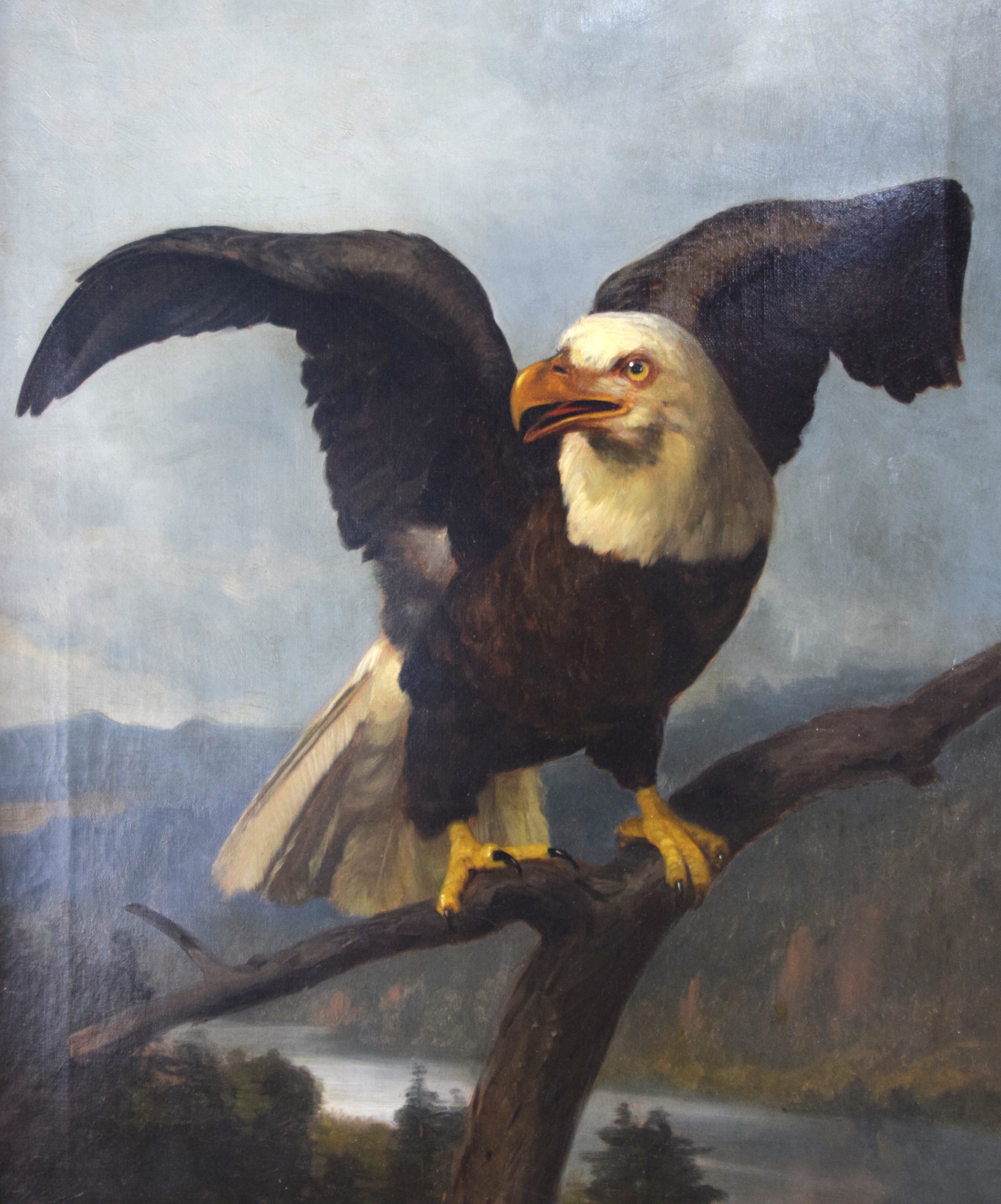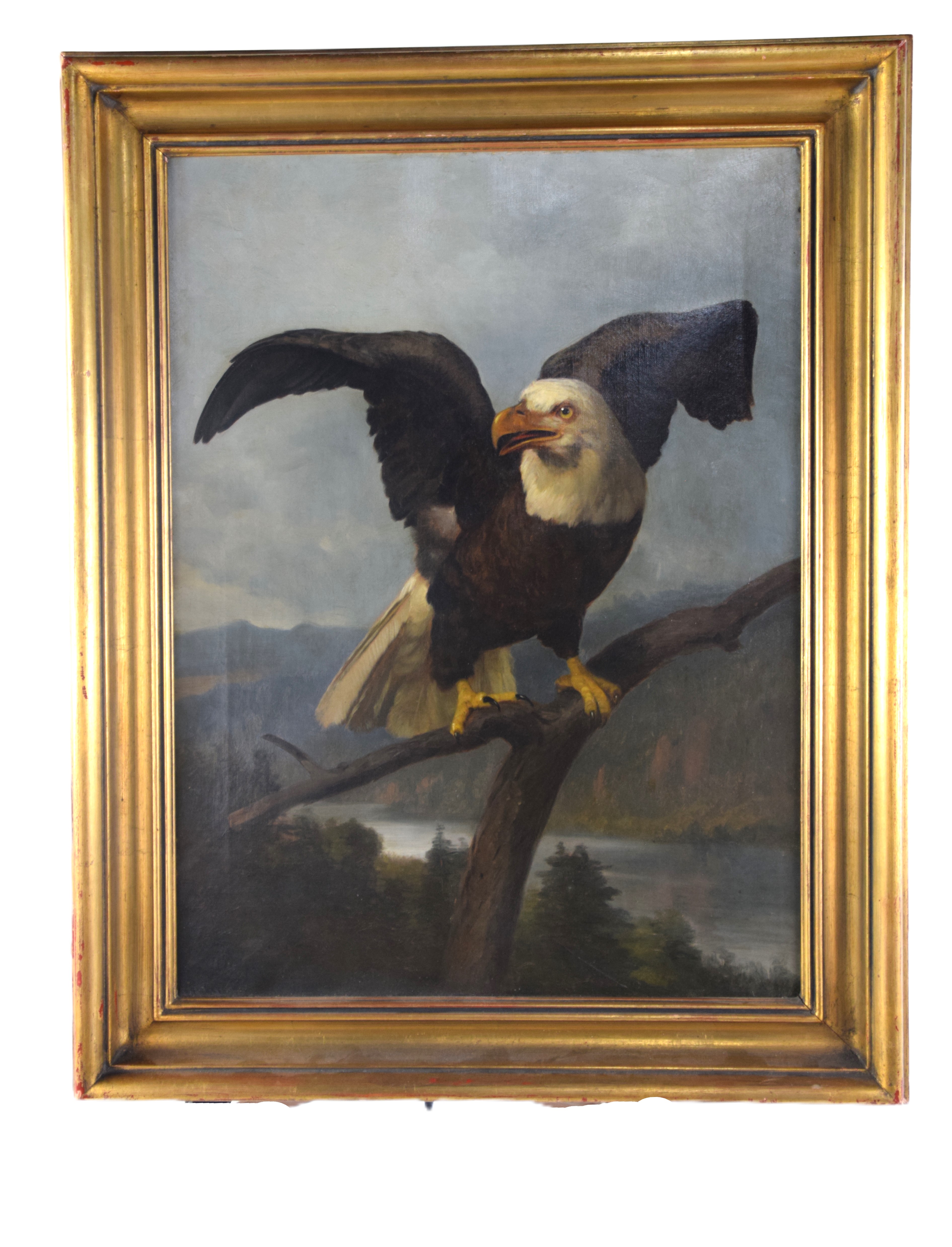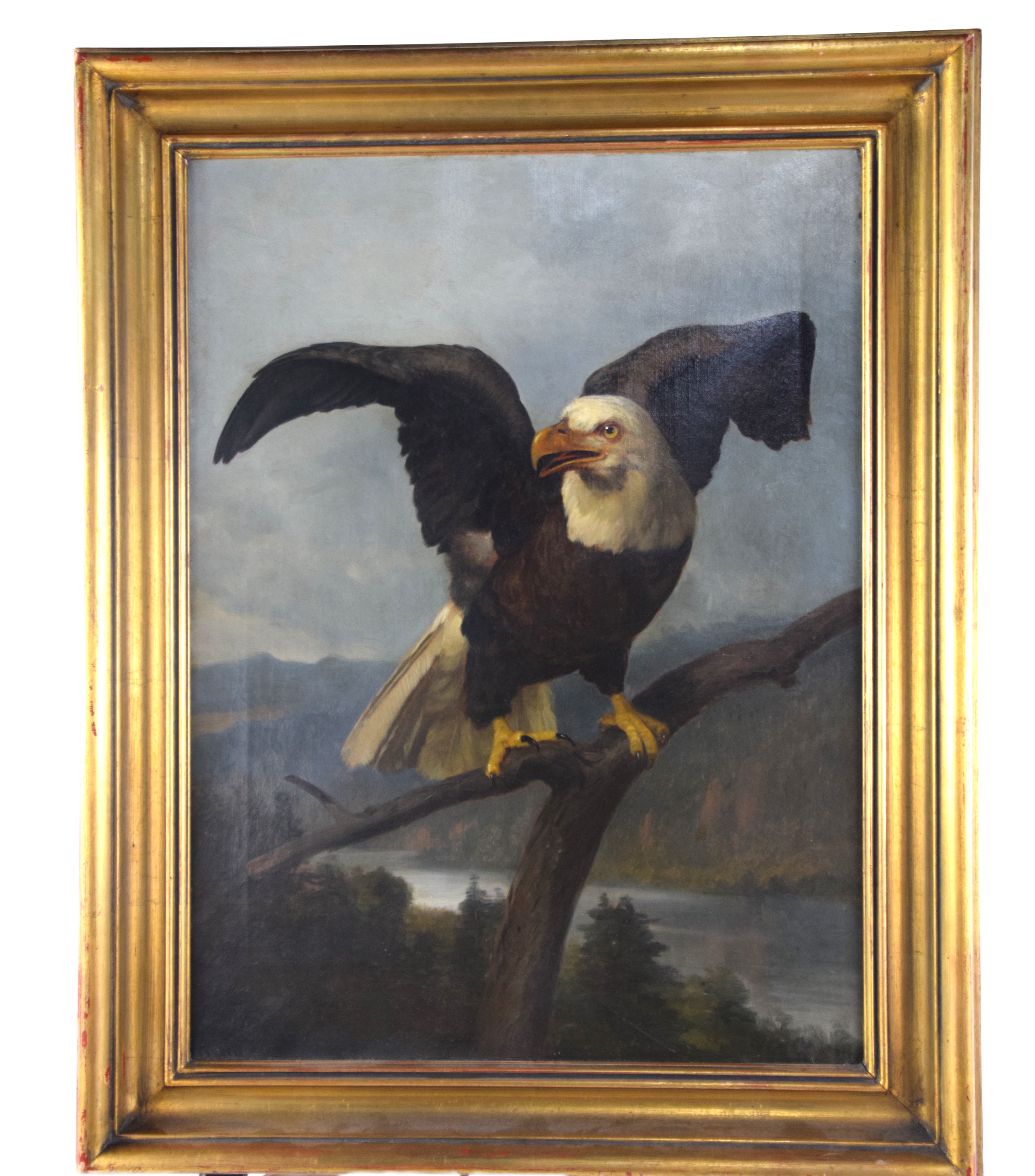 Oil on canvas painting of an American bald eagle by John Dolph, signed lower left. John Henry Dolph (1835 – 1903) worked in New York and Ohio and is known for animal portraits and landscape paintings. Dimensions: 24″ x 17.5″