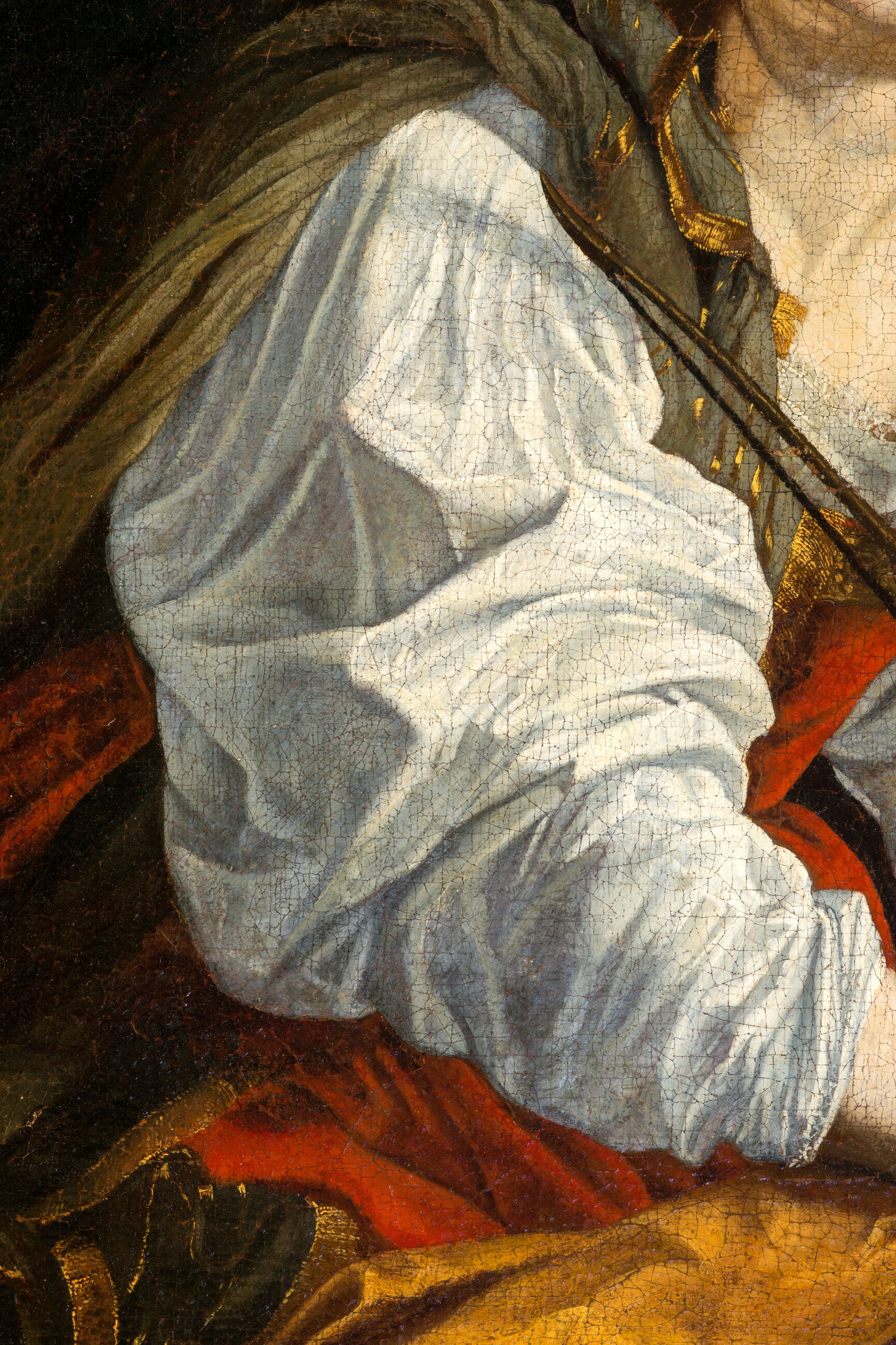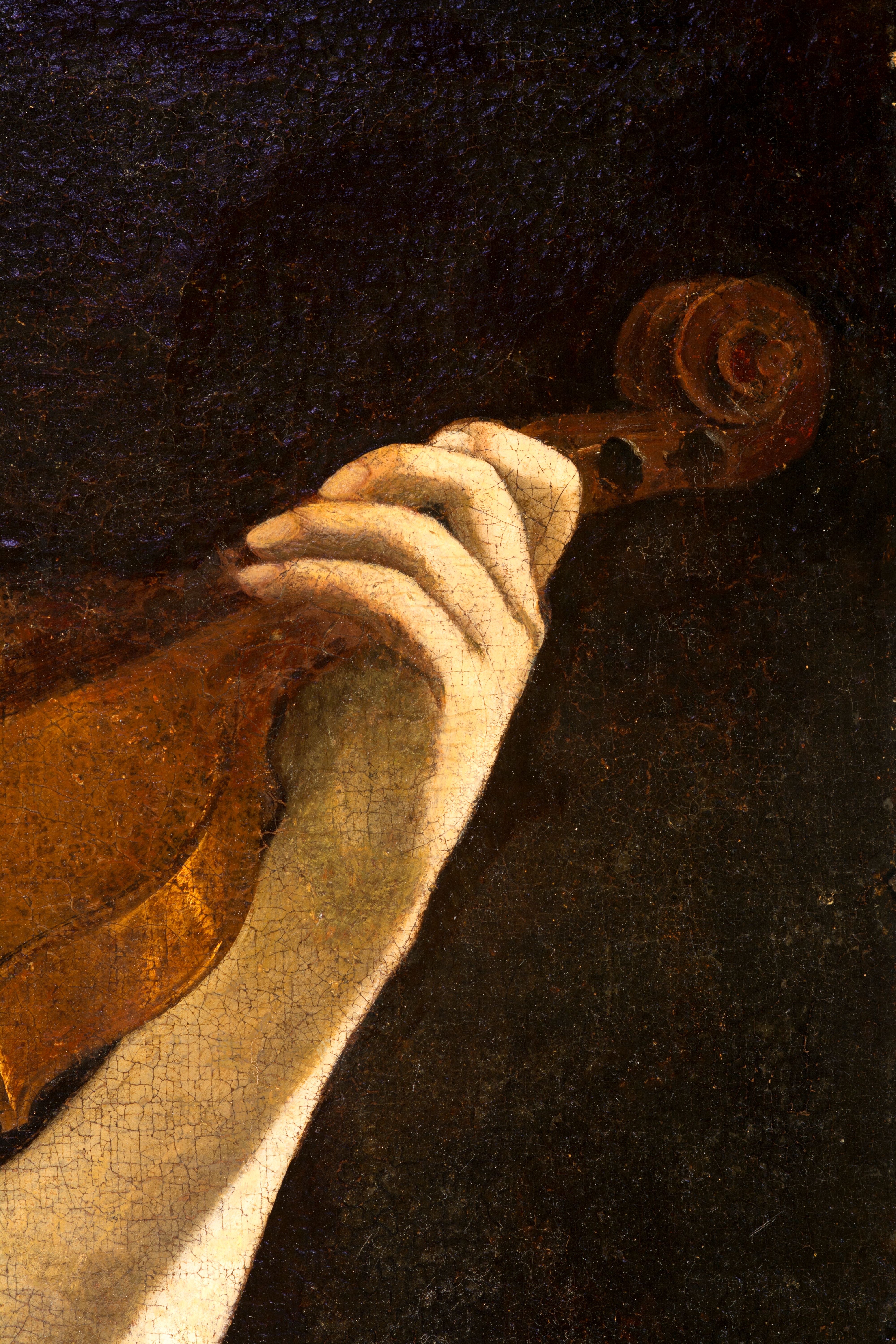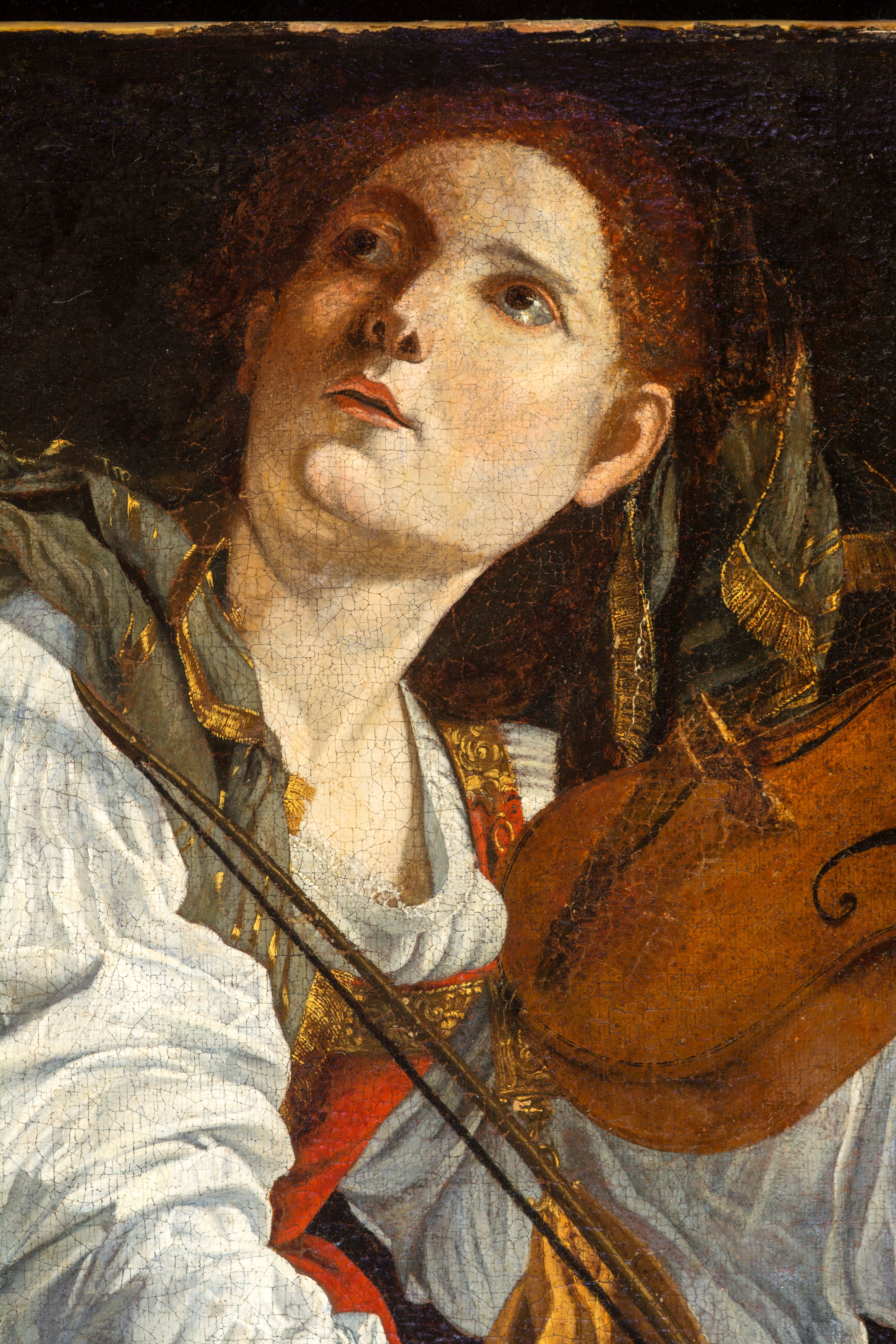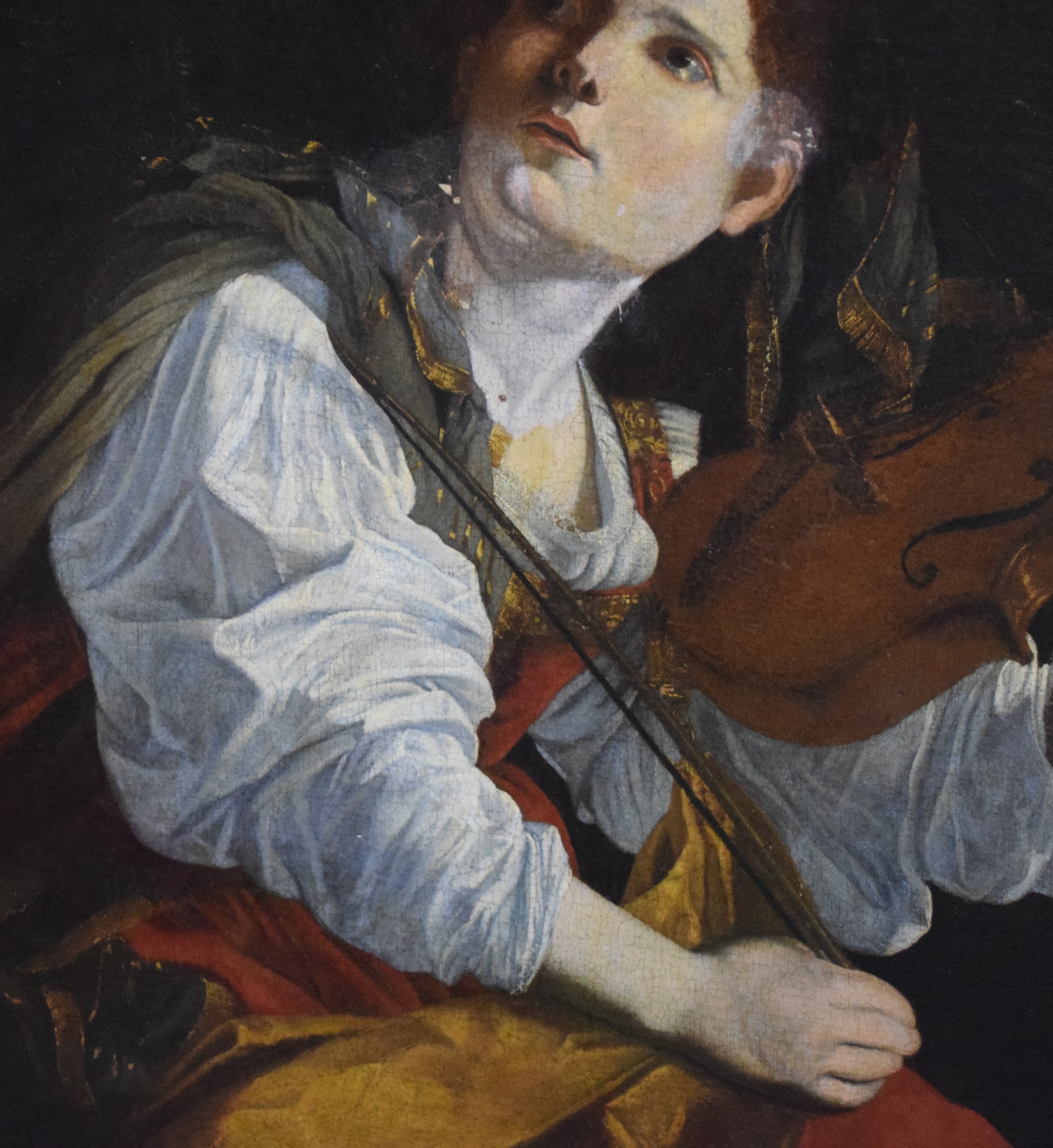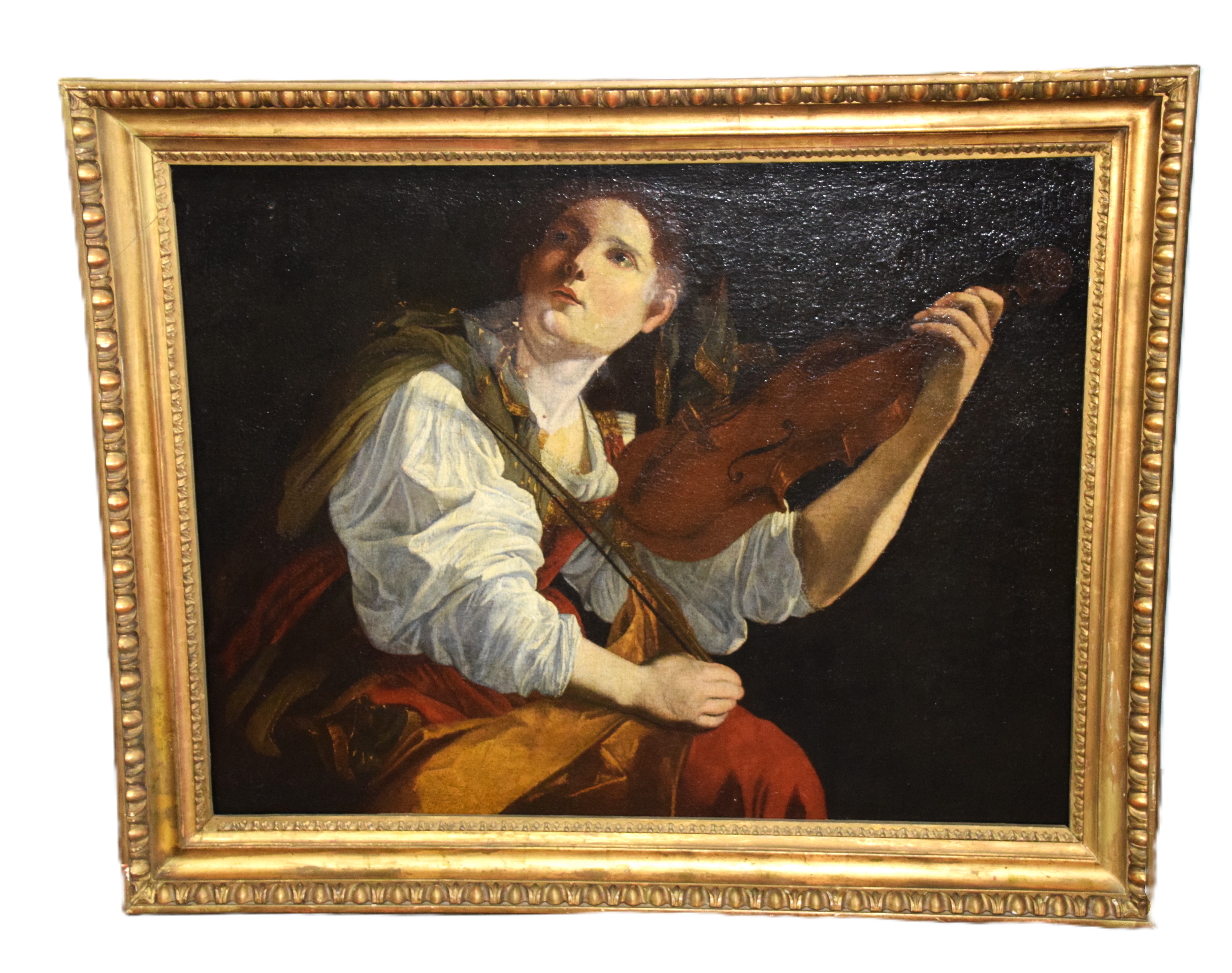 A 17th century old master painting of St Cecilia playing a violin, wearing a white blouse and attributed to Orazio Gentileschi, an Italian painter from Pisa. Orazio Gentileschi (1563-1639) was in Rome by the time he was sixteen and began a career of painting for Popes including Sixtus V, Clement VIII and Paul V. He became close friends with Michelangelo Caravaggio. This painting is almost identical to the St. Cecilia at the Detroit Institute of Arts (Attached). In fact Keith Christiansen, former head of European Paintings at The Metropolitan Museum of Art, NY, stated after seeing and confirming the work, “Orazio used tracing both to replicate compositions and to do variants of them”. Saint Cecilia was a Roman Christian virgin martyr, who is venerated in Catholic, Orthodox, Anglican, and the Church of Sweden. She became the patroness of music and musicians, it being written that, as the musicians played at her wedding, Cecilia “sang in her heart to the Lord”. Provenance: Provenance:The painting was released from the Szepmuveszeti Muzeum, Hungary, around 1950s (as several museum labels indicate-probably on loan from the prominent Hungarian family). The painting was inherited from the Hungarian grandfather to the mother to the daughter who eventually moved to Portsmouth NH from Hungary. It was sold to an NH art collector in 2013, examined first by Skinners Auction in Boston who forward it to Keith Christiansen in 2015-2016 timeframe, who emailed his review to the NH art collector on August 5th 2016 and finally given to NH Auctions in 2025. Dimensions: 29″ x 38″ Image size, 36 x 45″ Overall