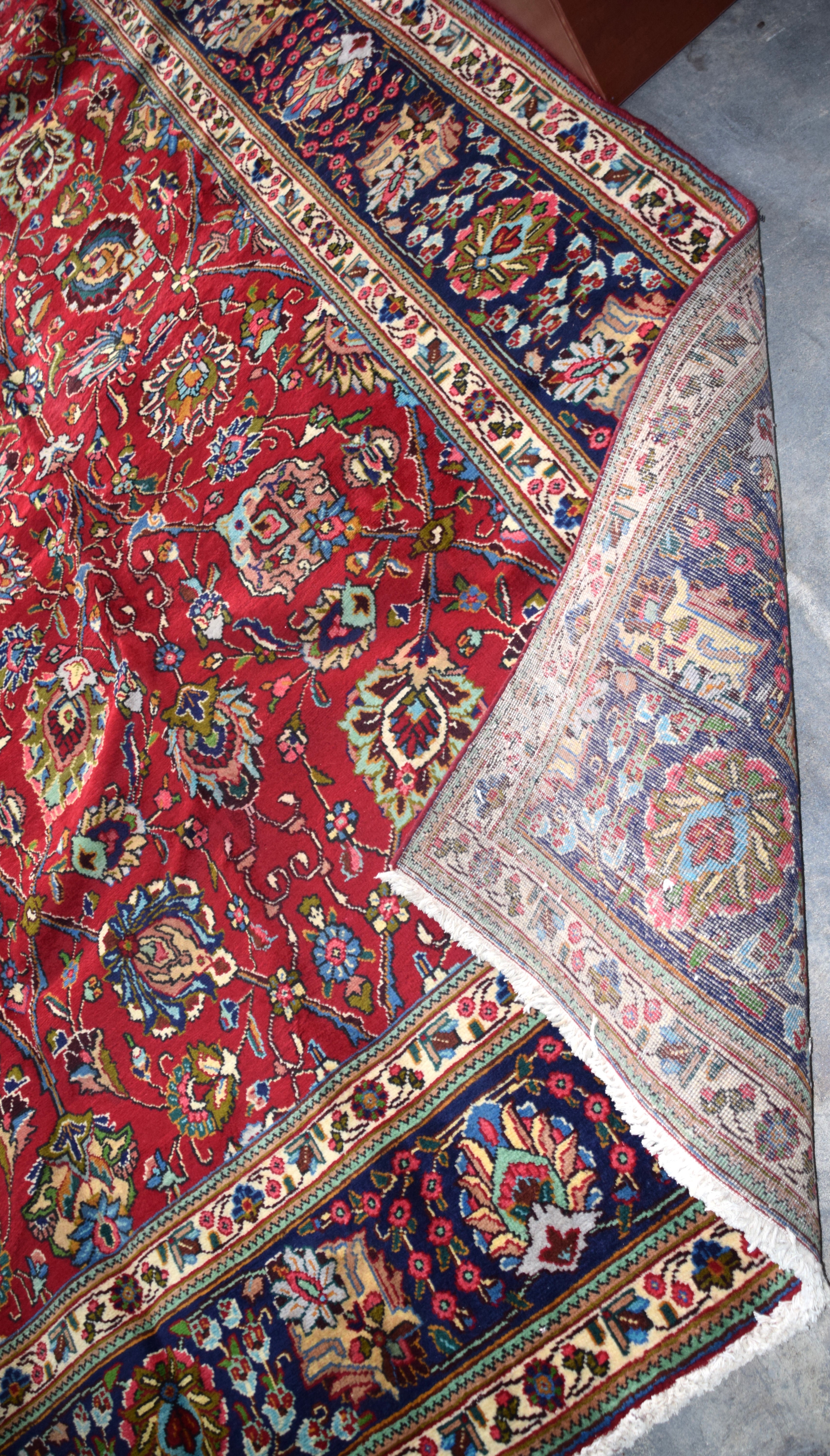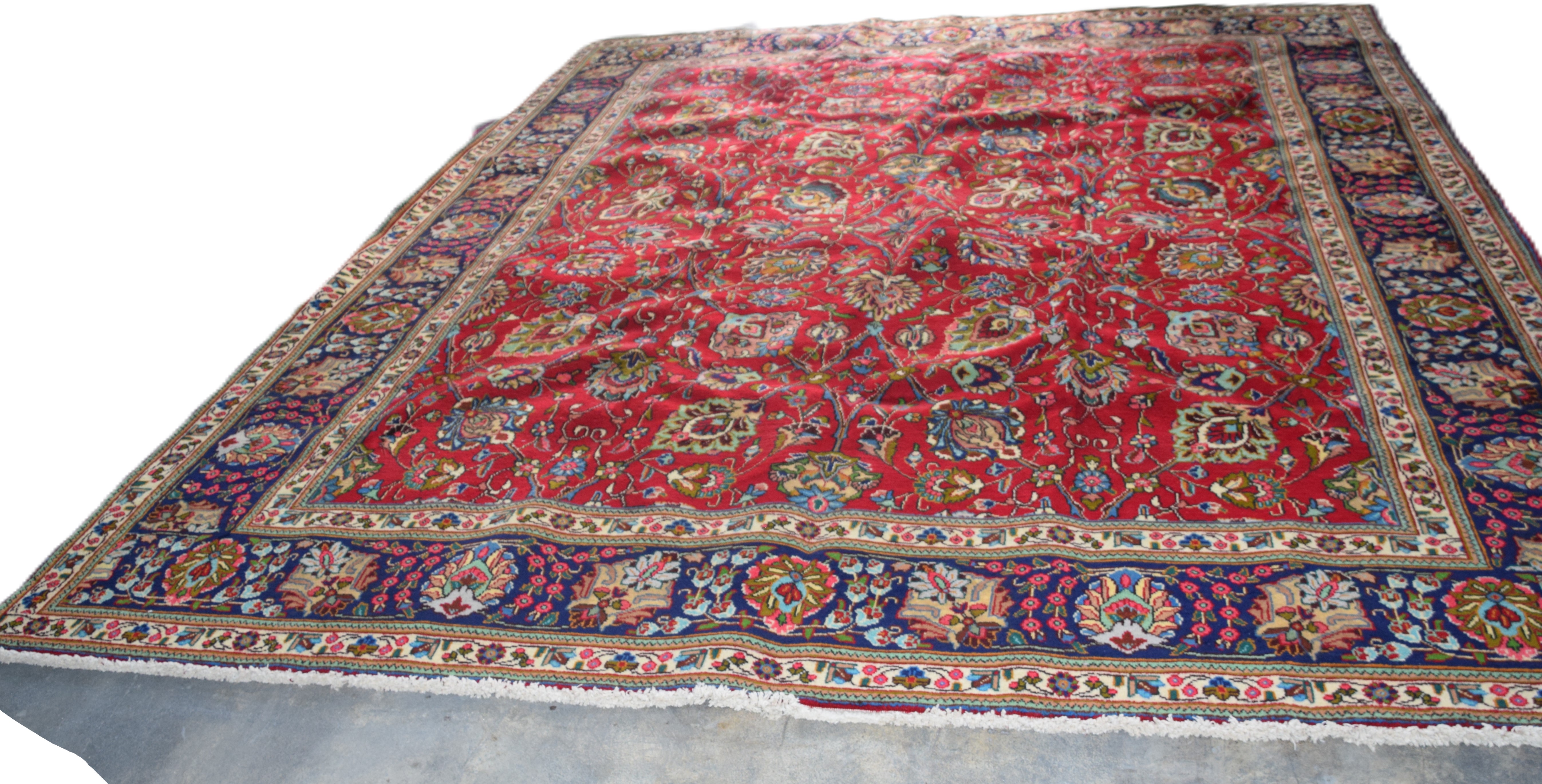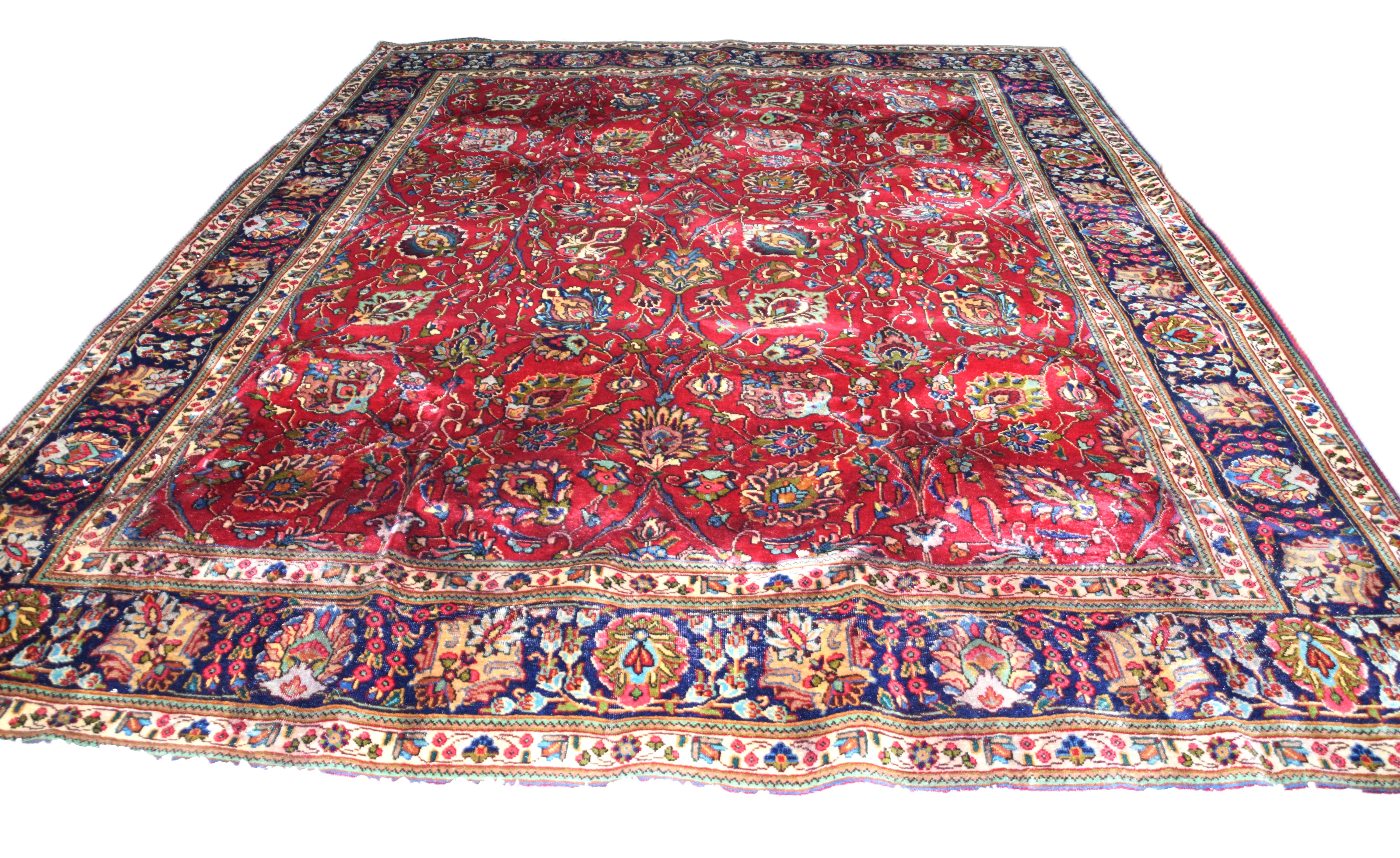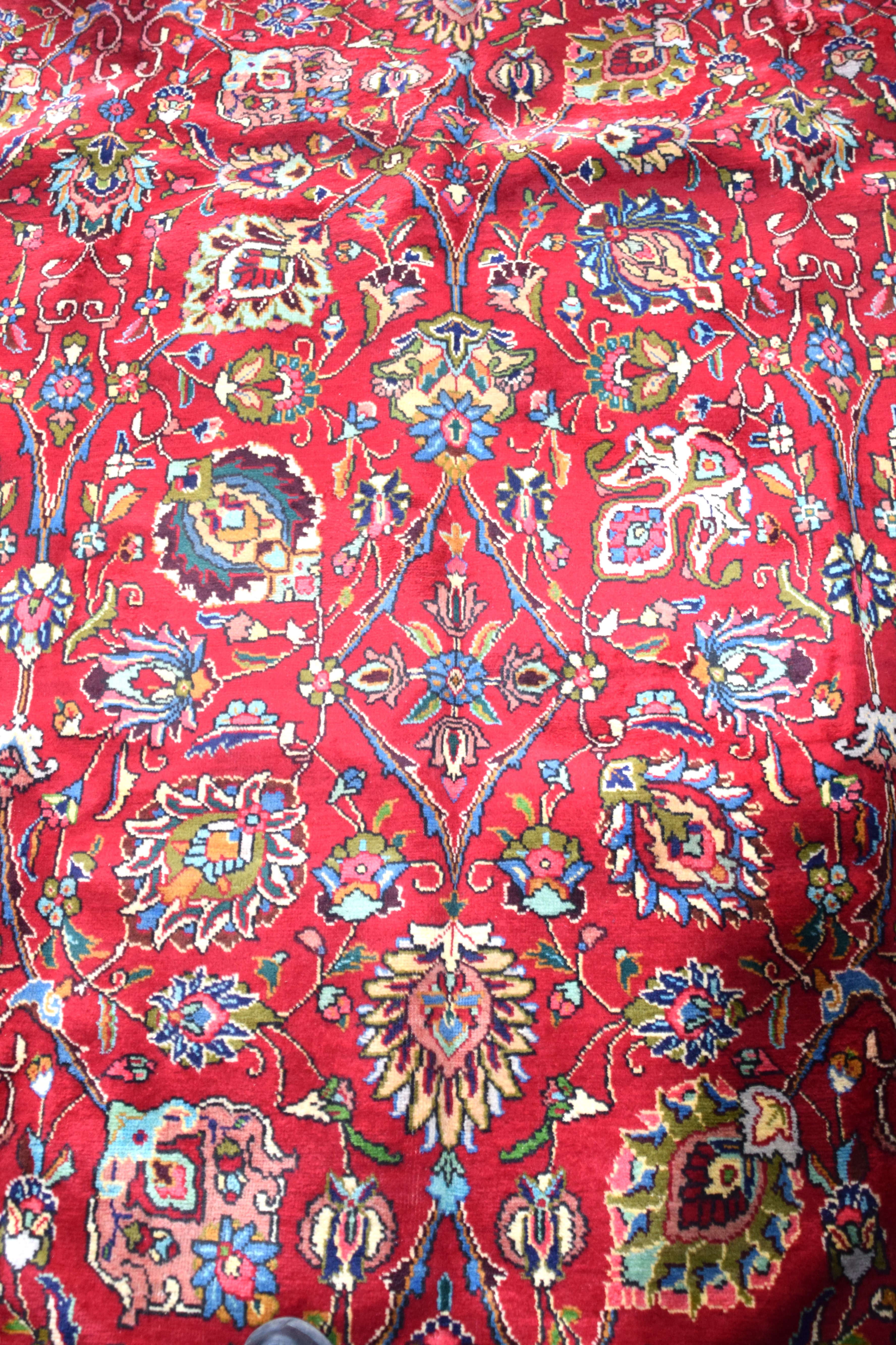 Room size oriental rug with multi-color designs with a predominate red field with all over designs. From a Bedford NH estate. Dimensions: 10′ 1″ x 12’8″