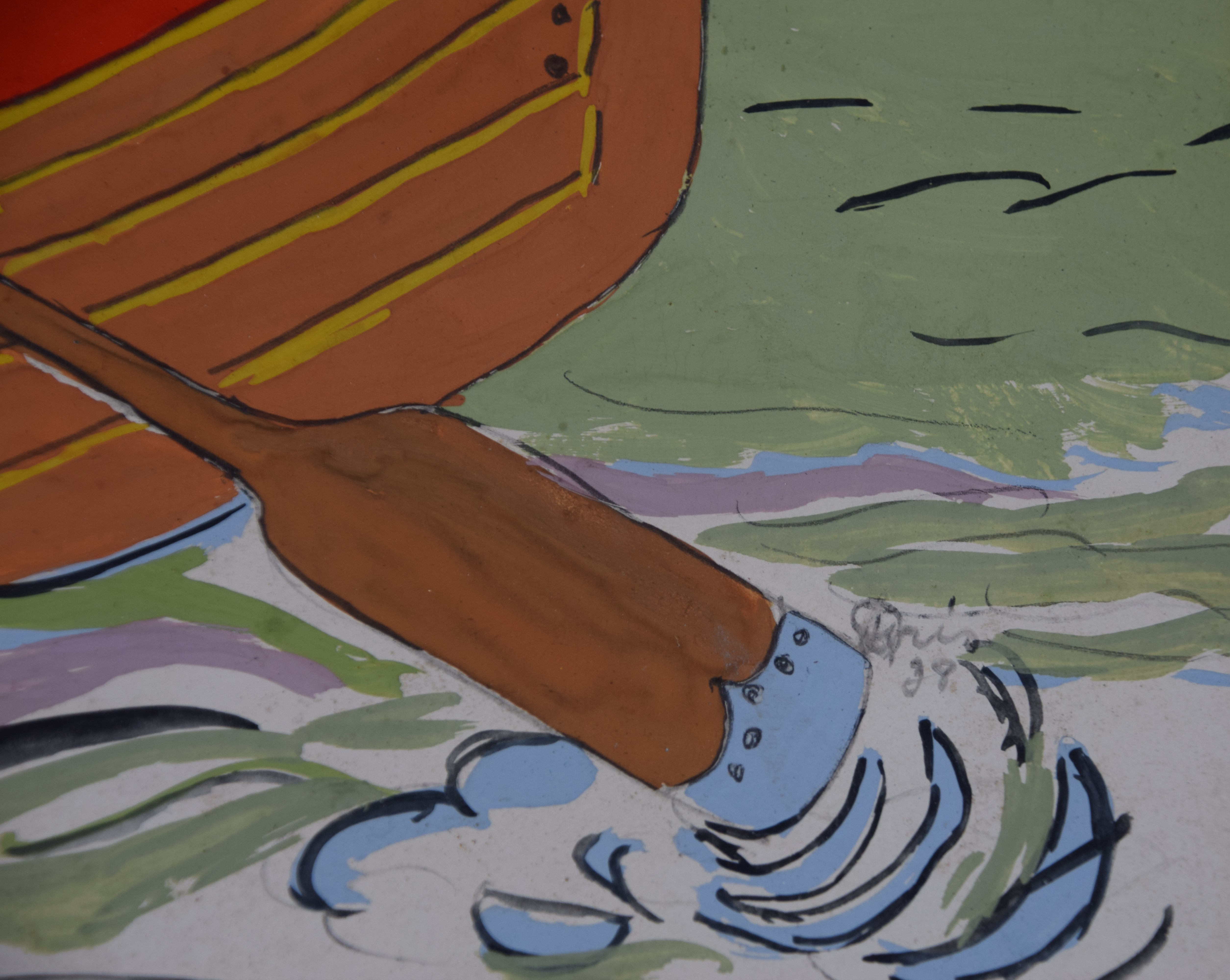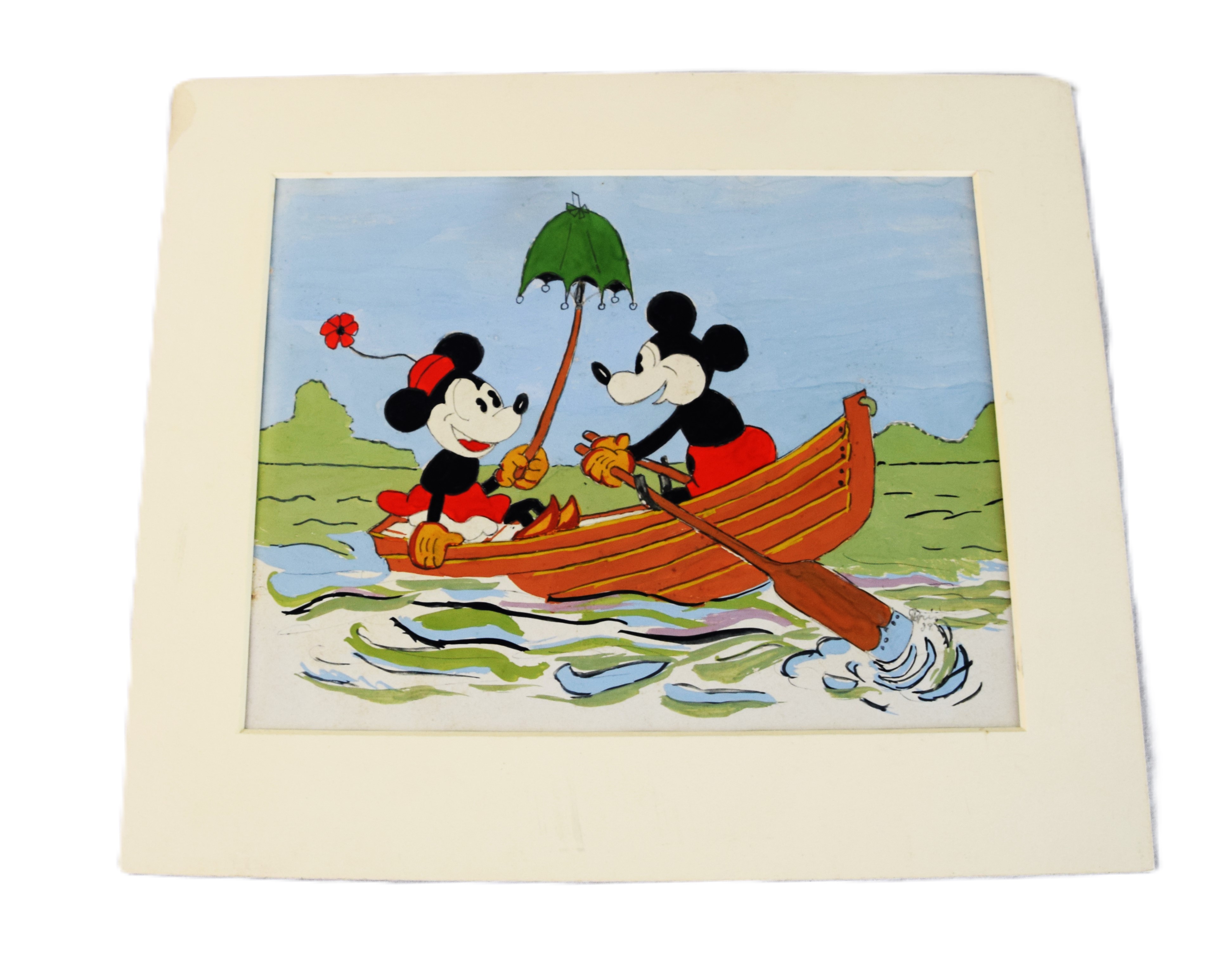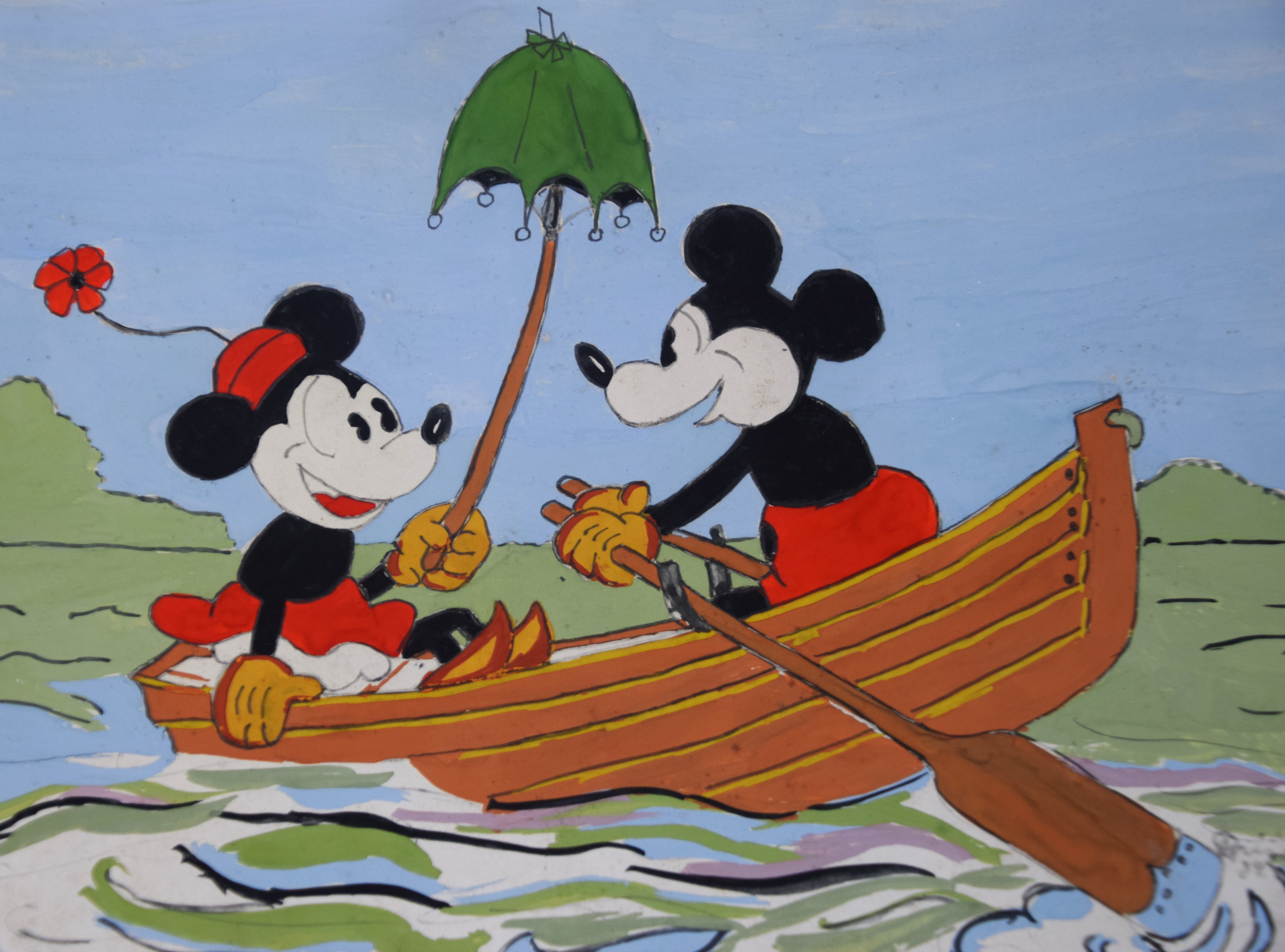 A signed gouache painting by Disney artist Davis, 1939, of Minnie and Mikey in a row boat. Marc Fraser Davis was an American prominent artist and animator for Walt Disney Animation Studios. He was one of Disney’s Nine Old Men, the famed core group of animators in Walt Disney’s animation studio. Dimensions: 7.5″ x 10″