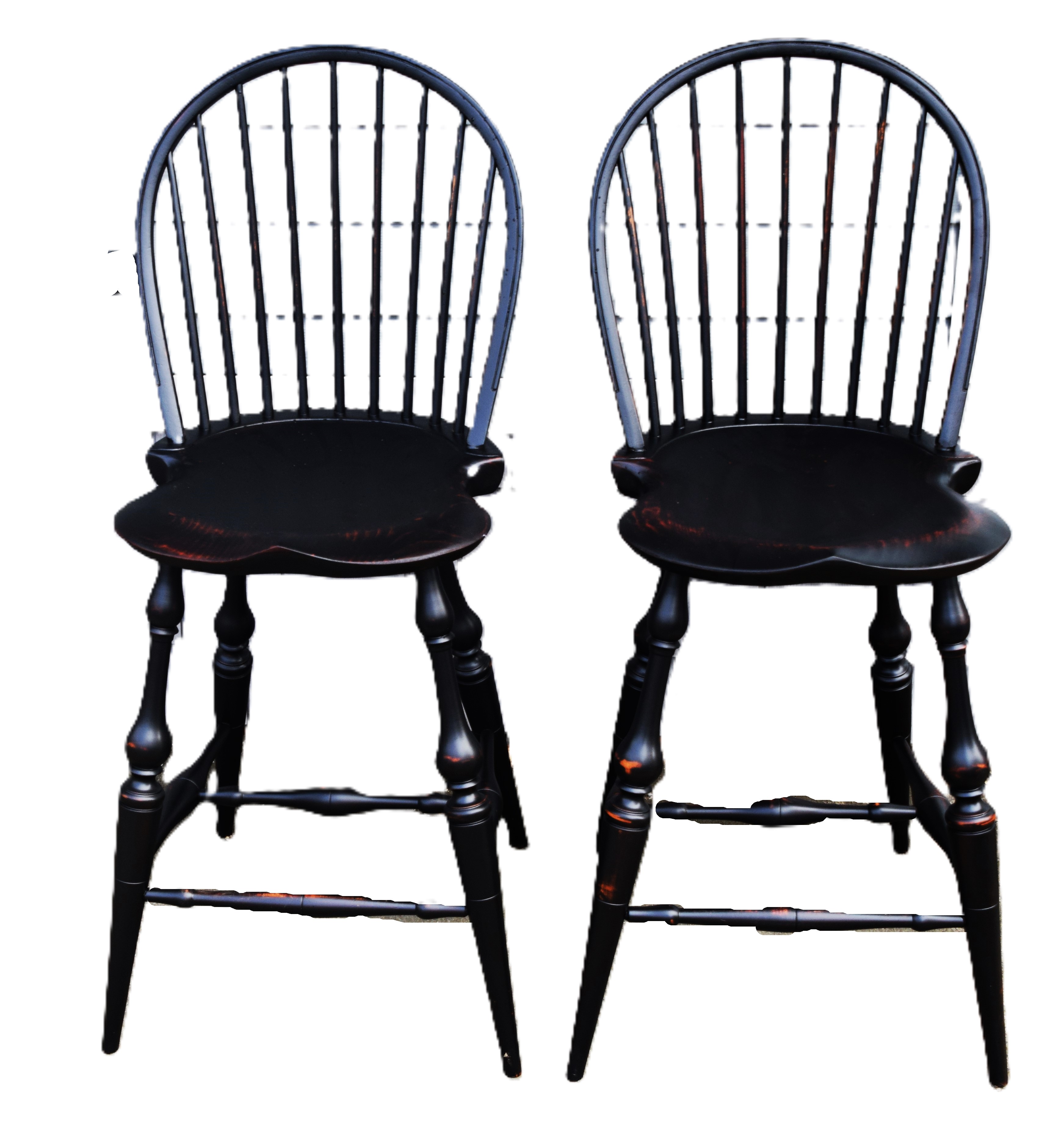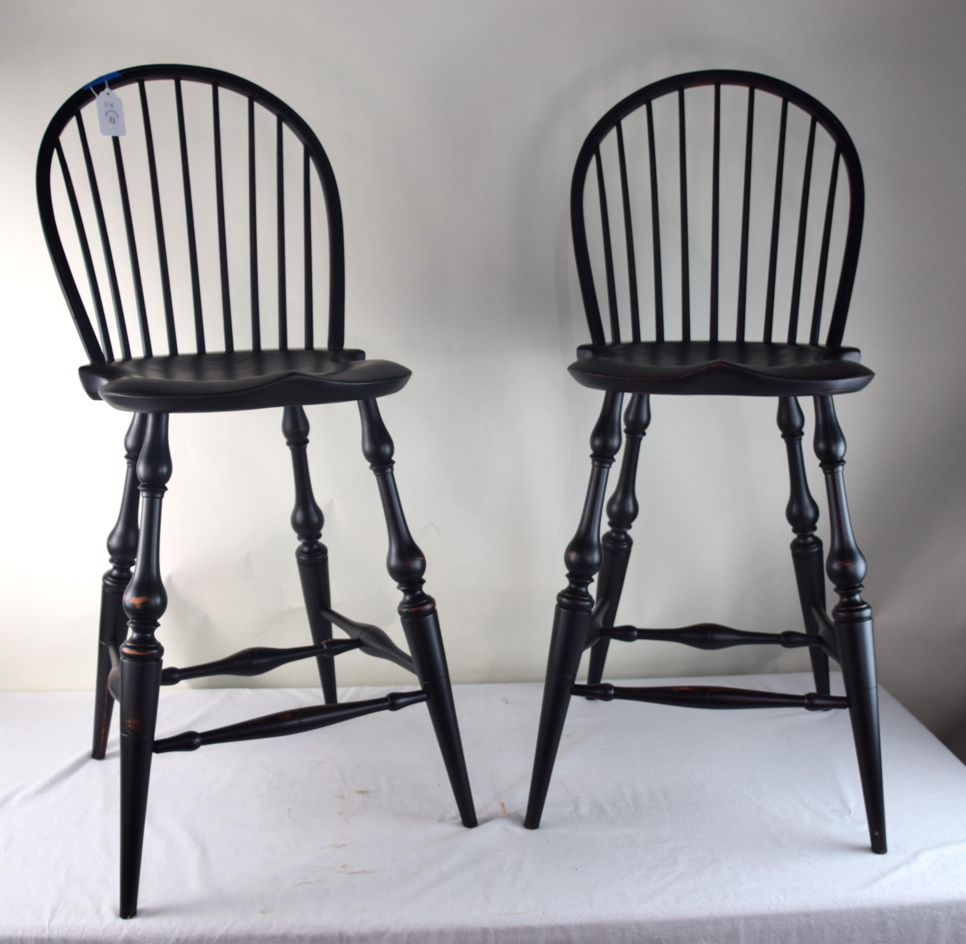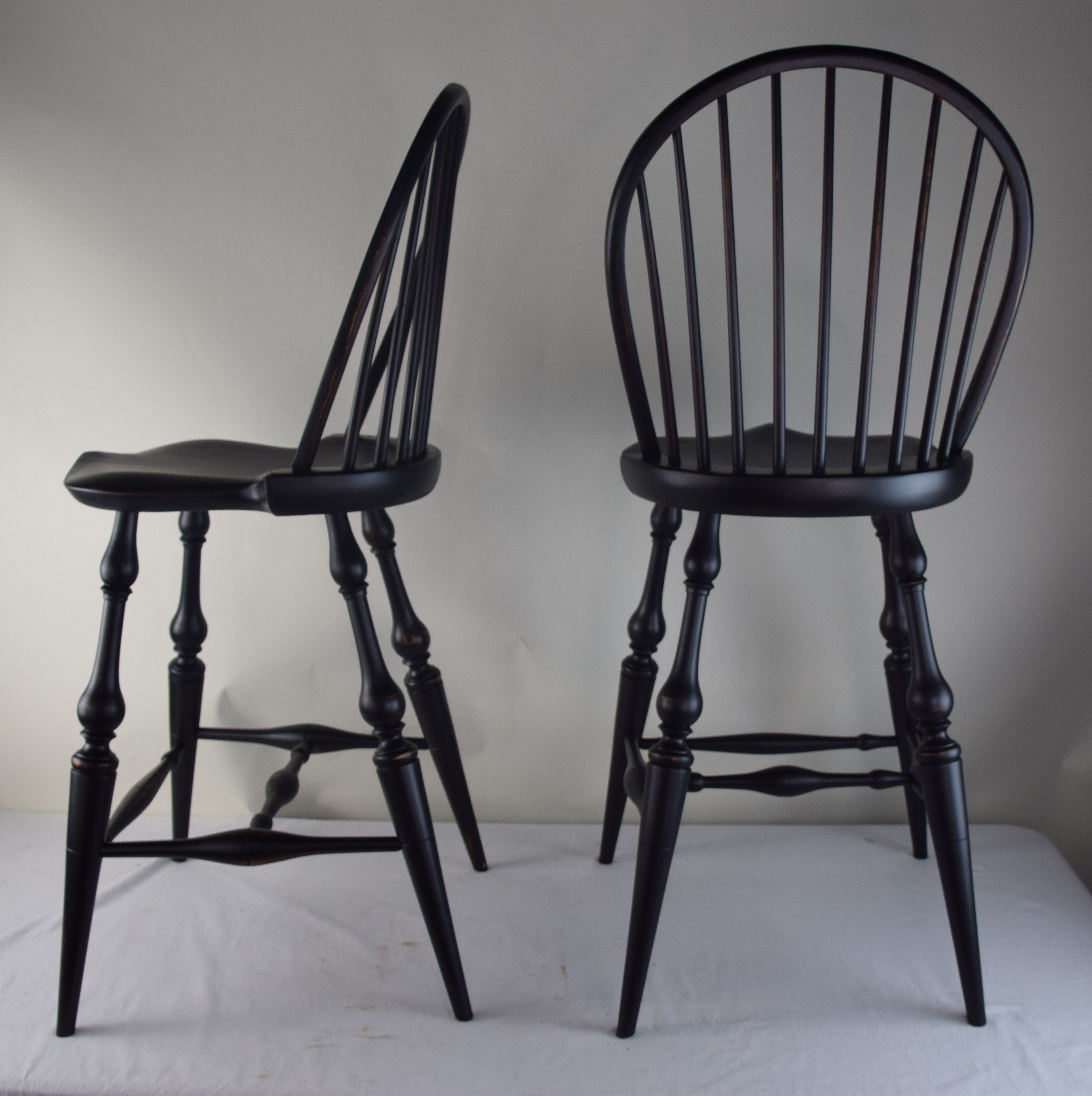 Fine pair of D.R. Dimes bow back Windsor counter/bar chairs with 9 spindles, saddle seats, stretcher base on splayed legs. Both chairs with Dimes brand mark and paper label. Dimensions: 26″ Seat Height, 43″ Overall