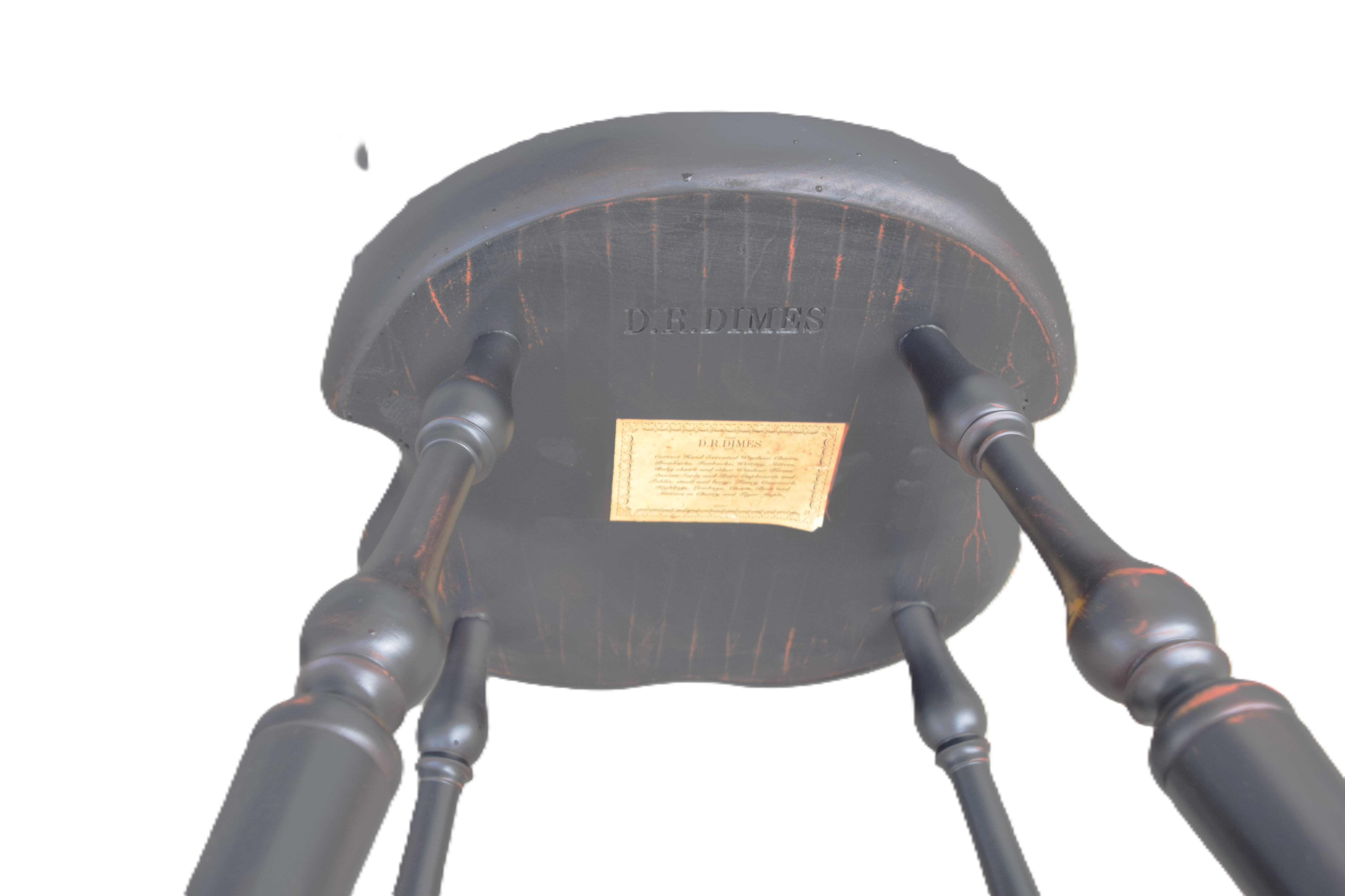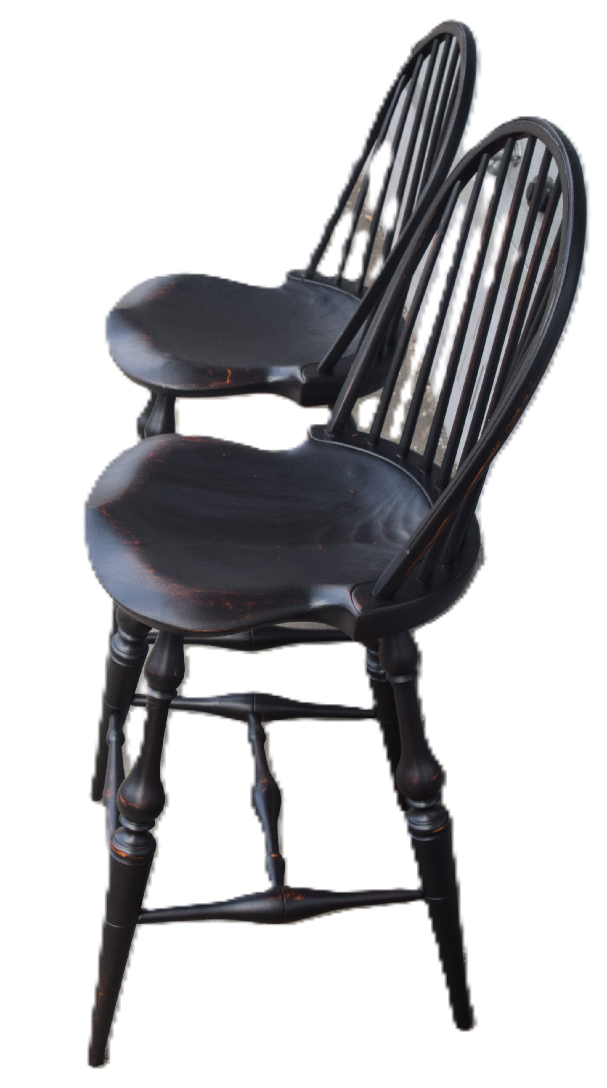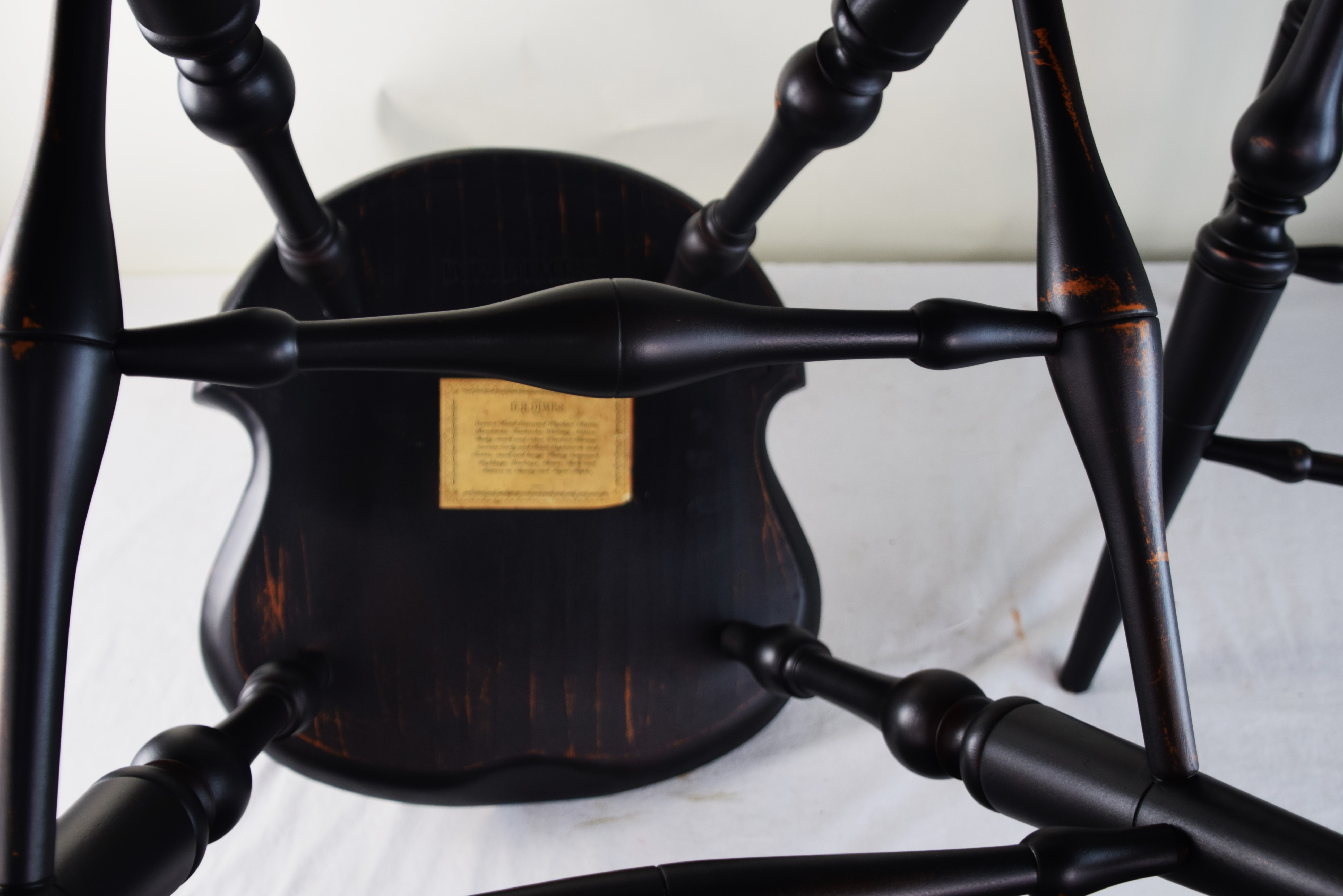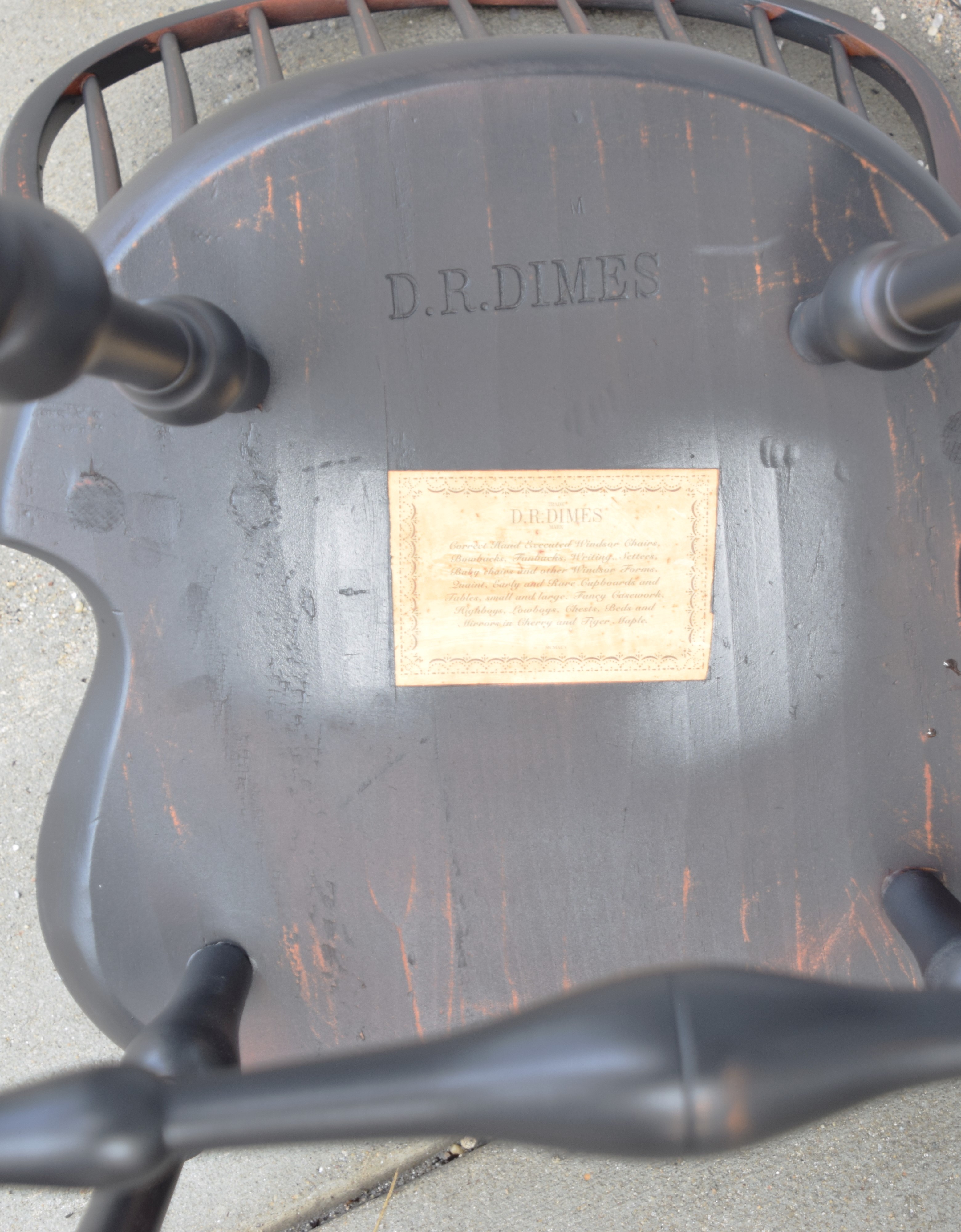 Fine pair of D.R. Dimes bow back Windsor counter/bar chairs with 9 spindles, saddle seats, stretcher base on splayed legs. Both chairs with Dimes brand mark and paper label. Dimensions: 26″ Seat Height, 43″ Overall