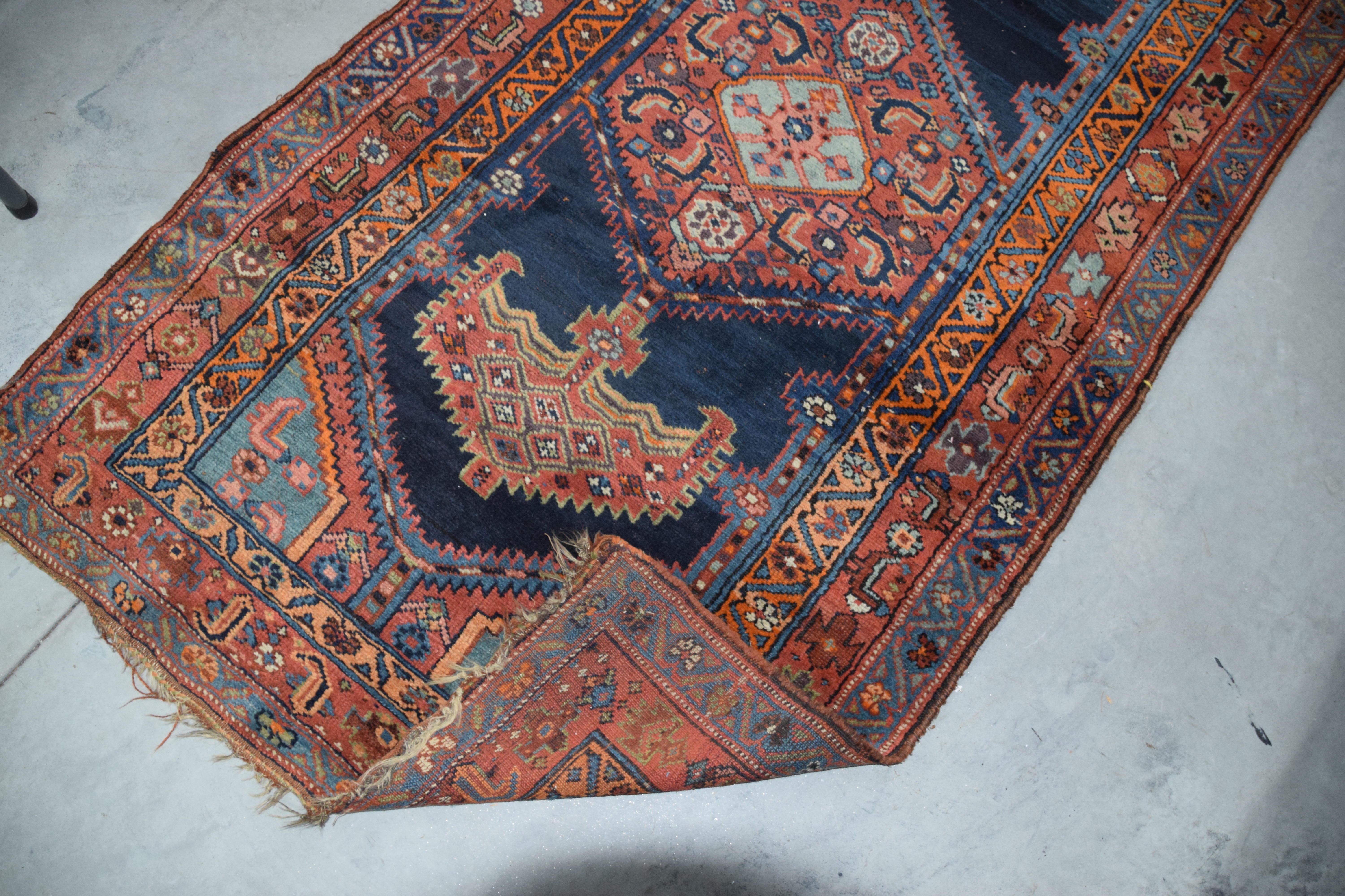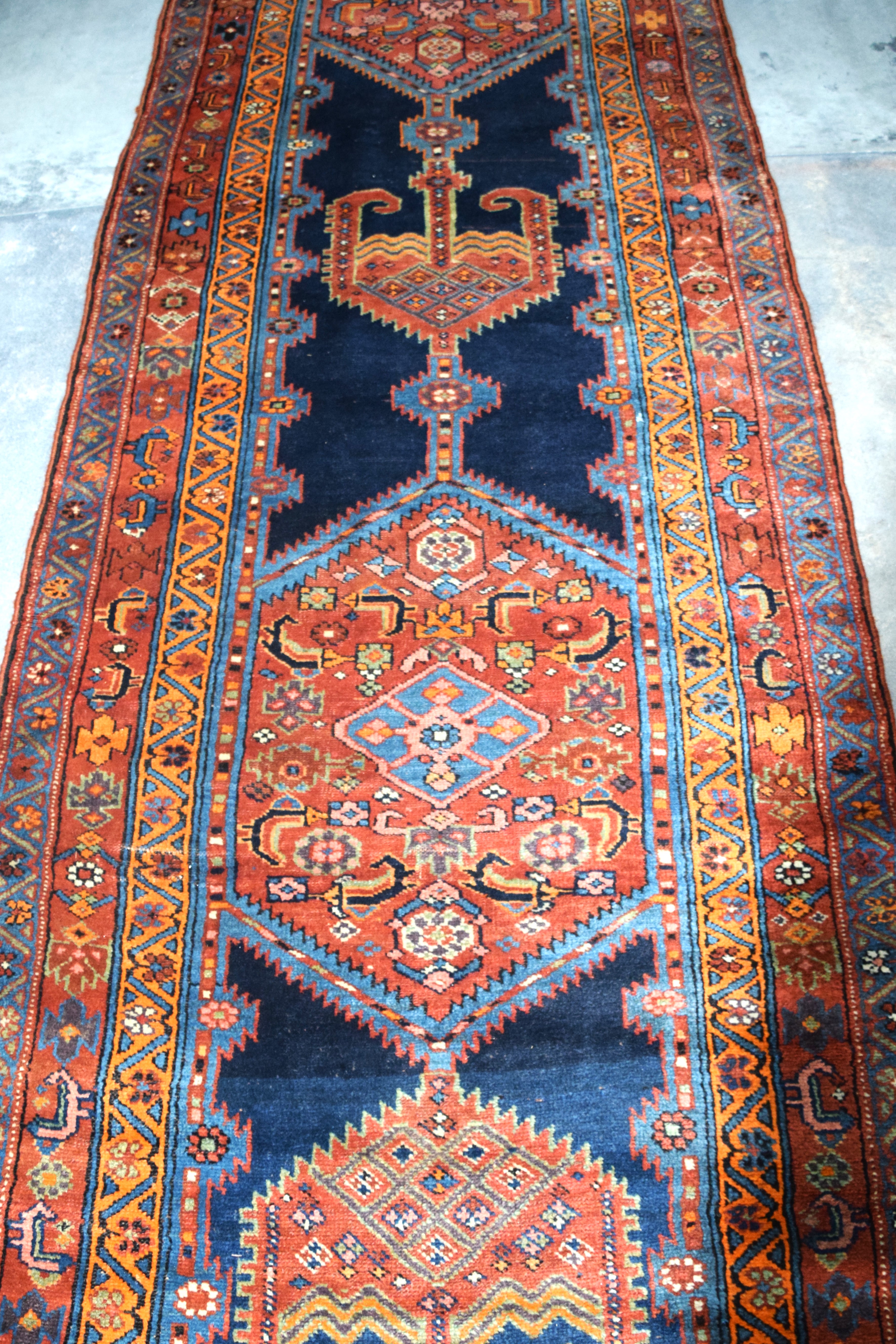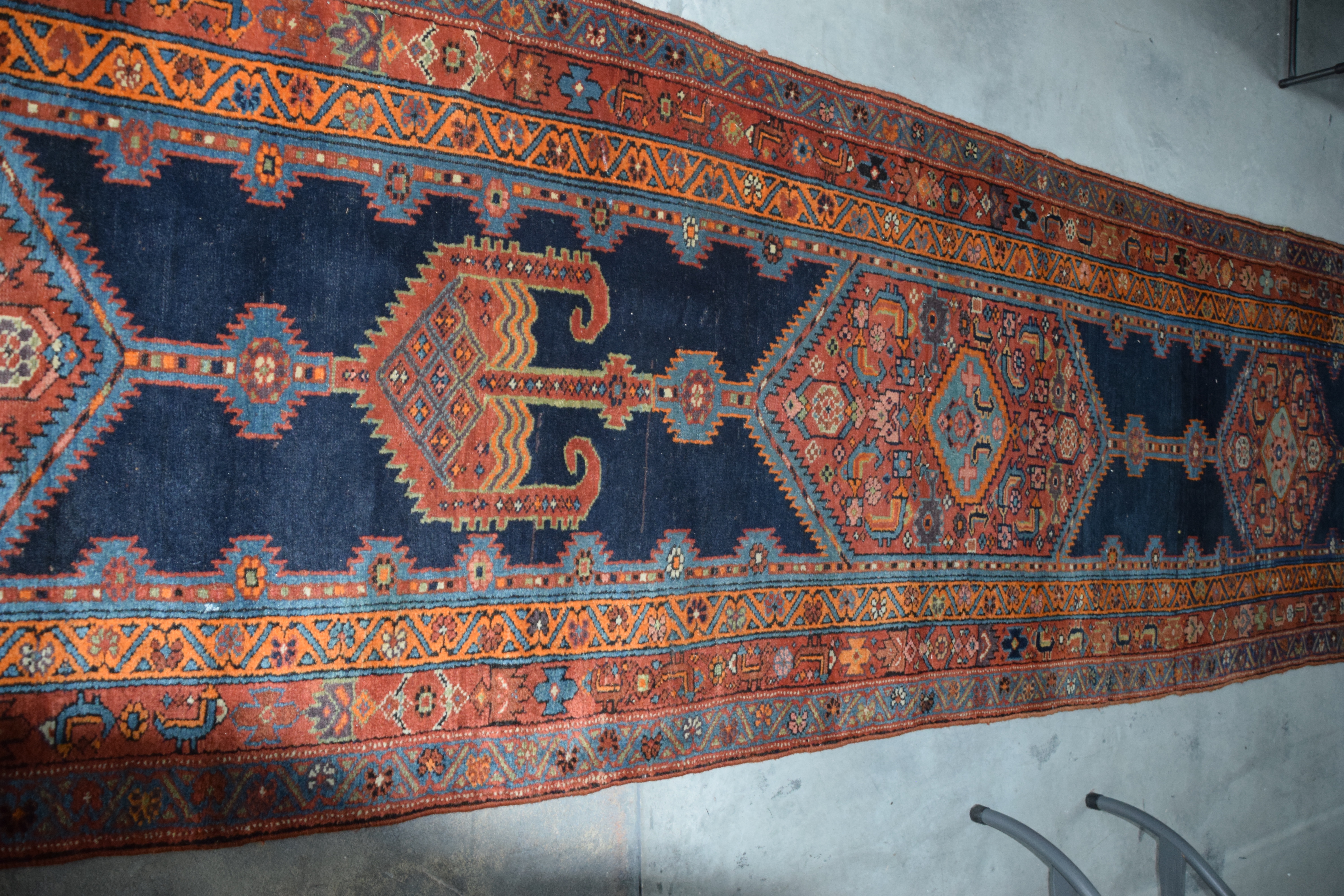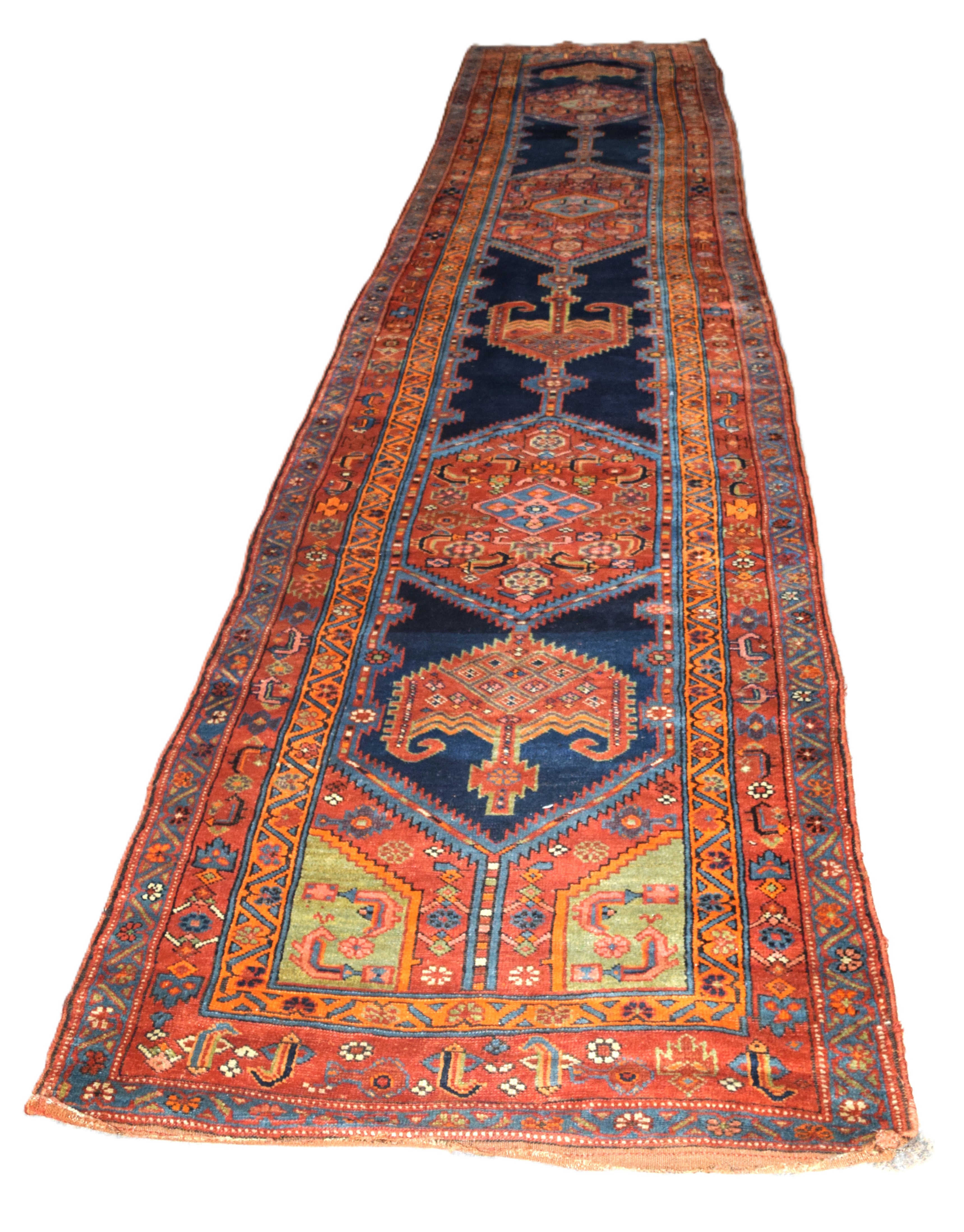 Old oriental runner with multi-color and multiple designs with a red and blue field. From a Bedford NH Estate. Dimensions: 3′ 8″ x 18′