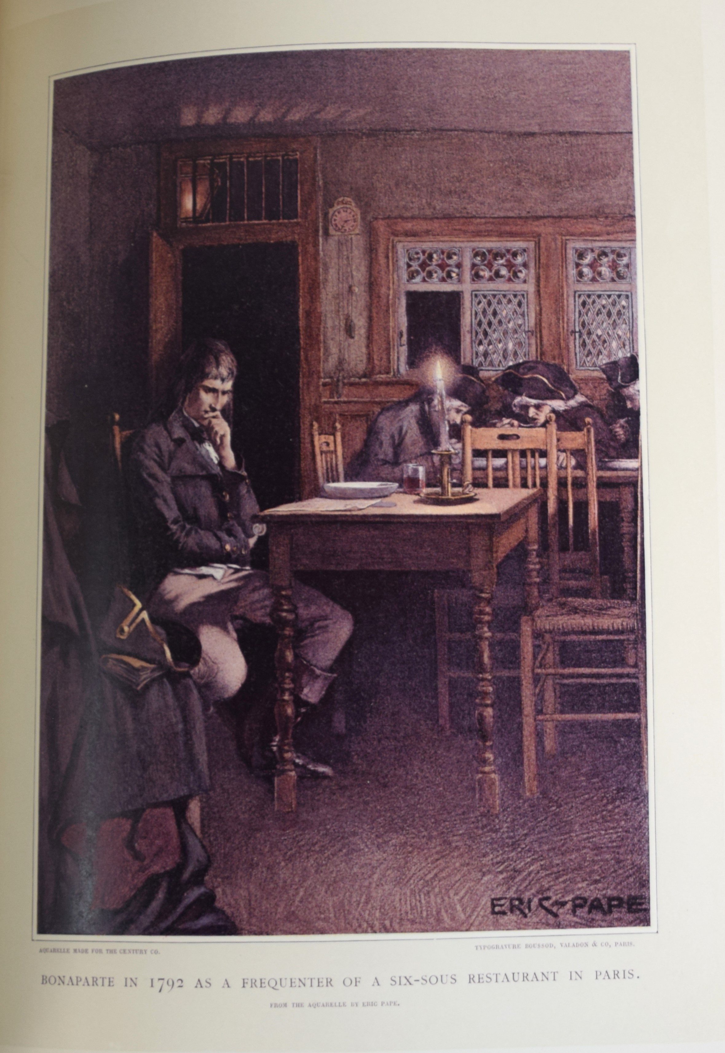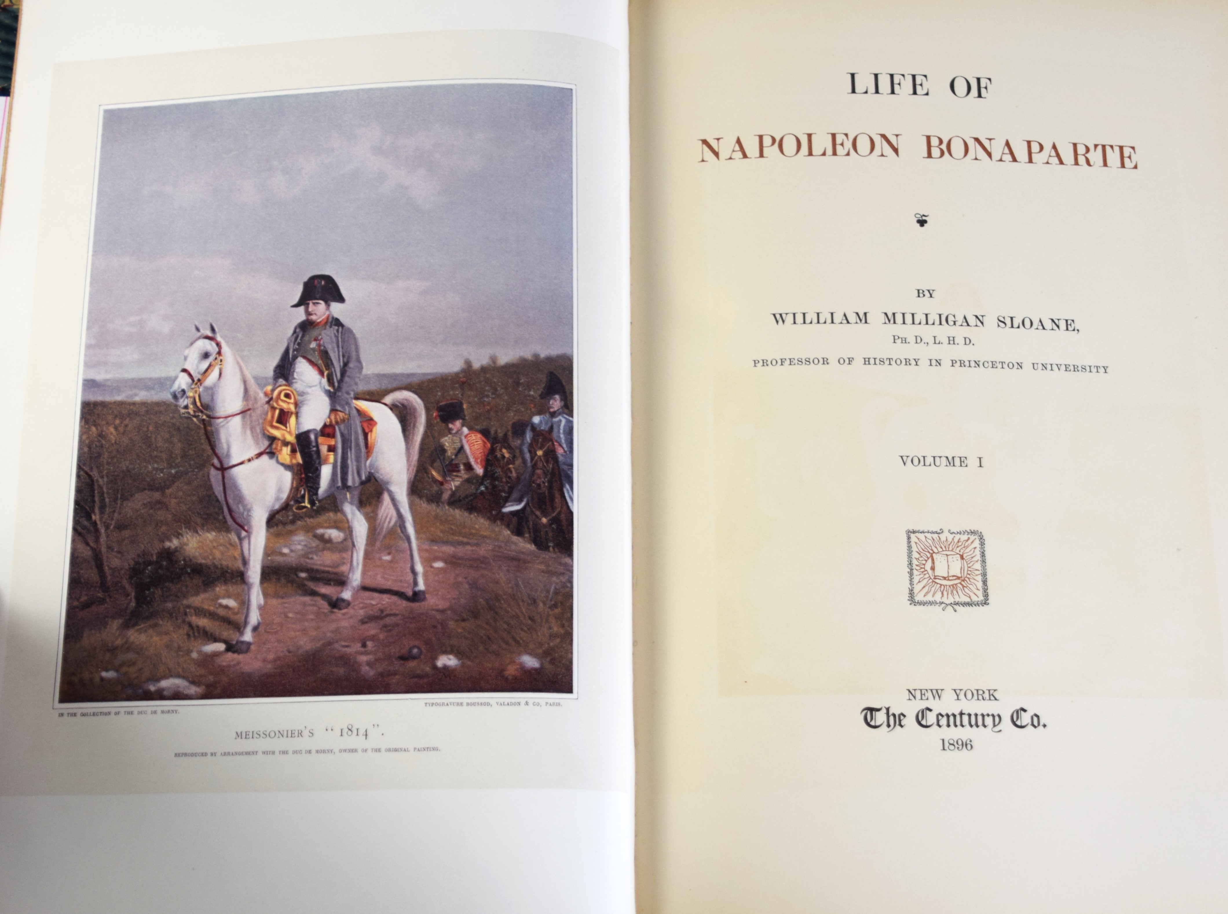Four hardback volume set of ” Napolean Bonaparte A History” by Princeton professor William Mulligan Sloane, published by The Century Company, New York in 1896. Half leather binding with Napoleonic emblem on the spine. Over 70 page illustrations in each volume, both color and black and white. Strong bindings. 280-300 pages per volume.