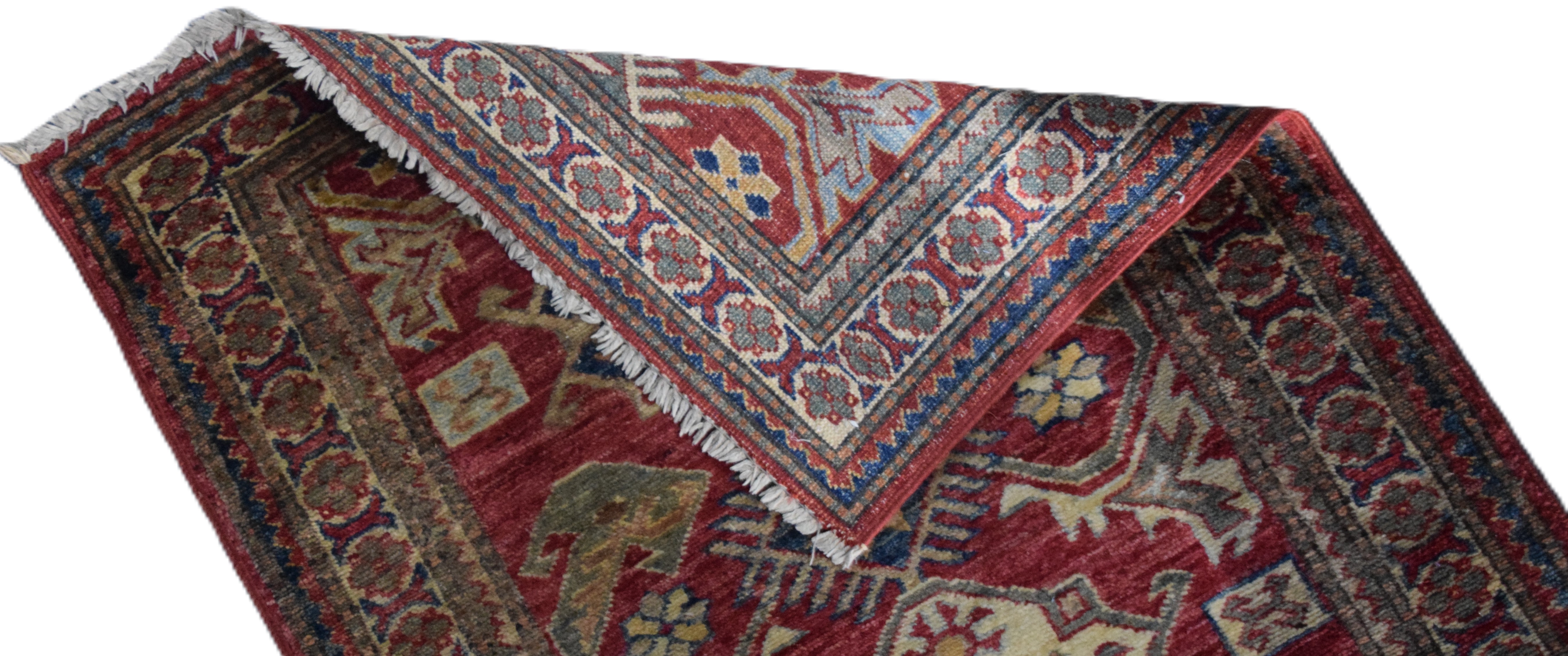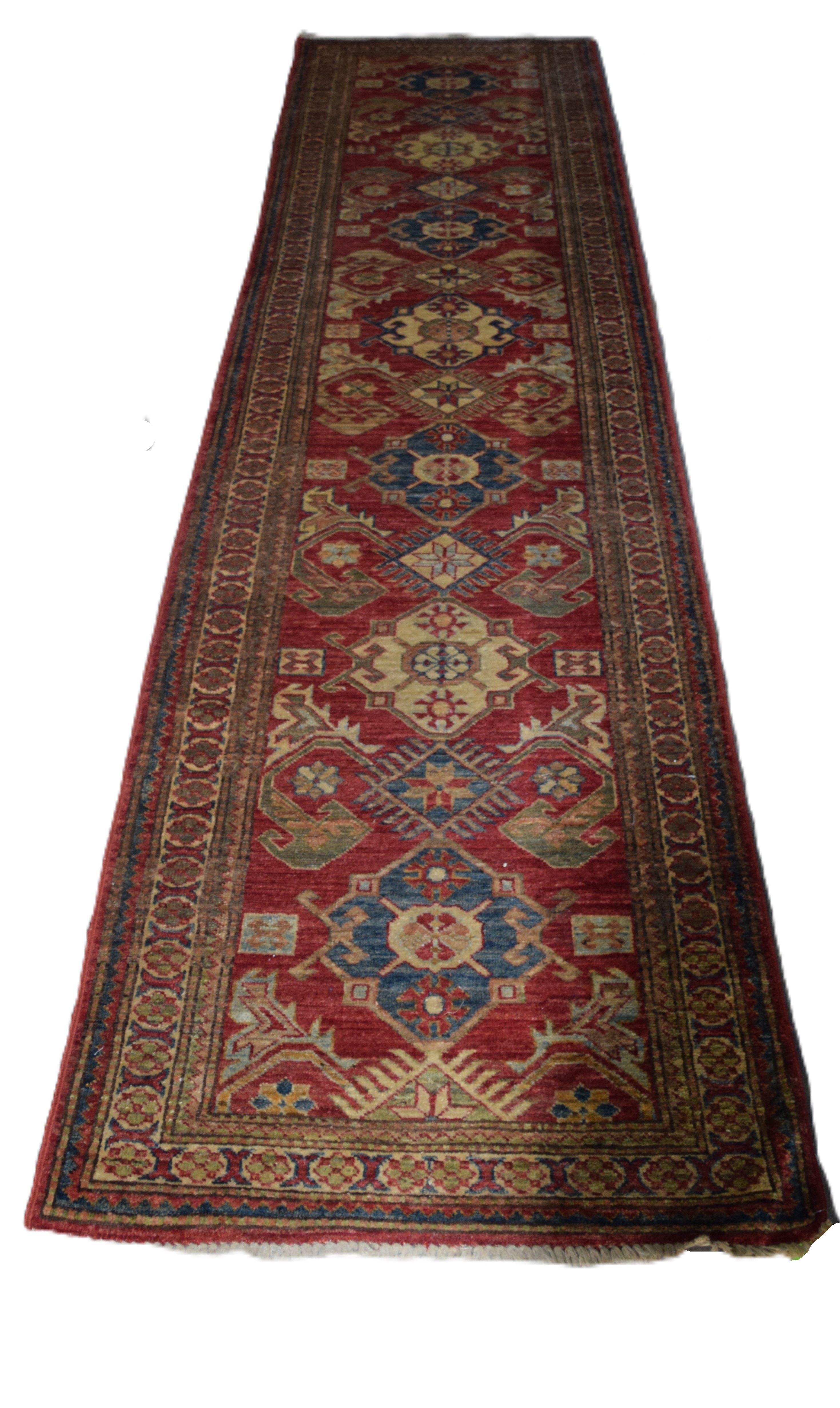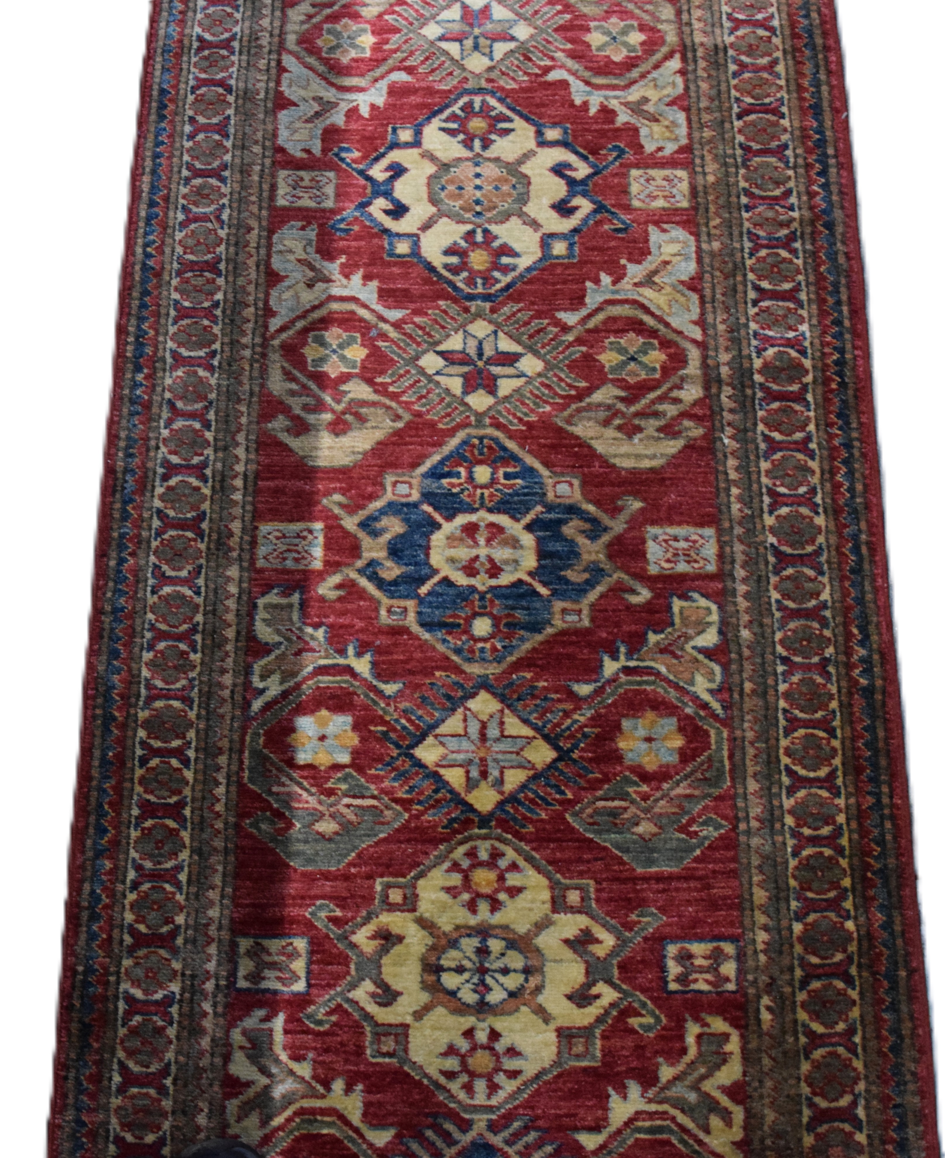 Turkish oriental runner with all over busy design, multi-color with colors of blues, reds and ivory. Dimensions: 2’7″ x 10′ 10″