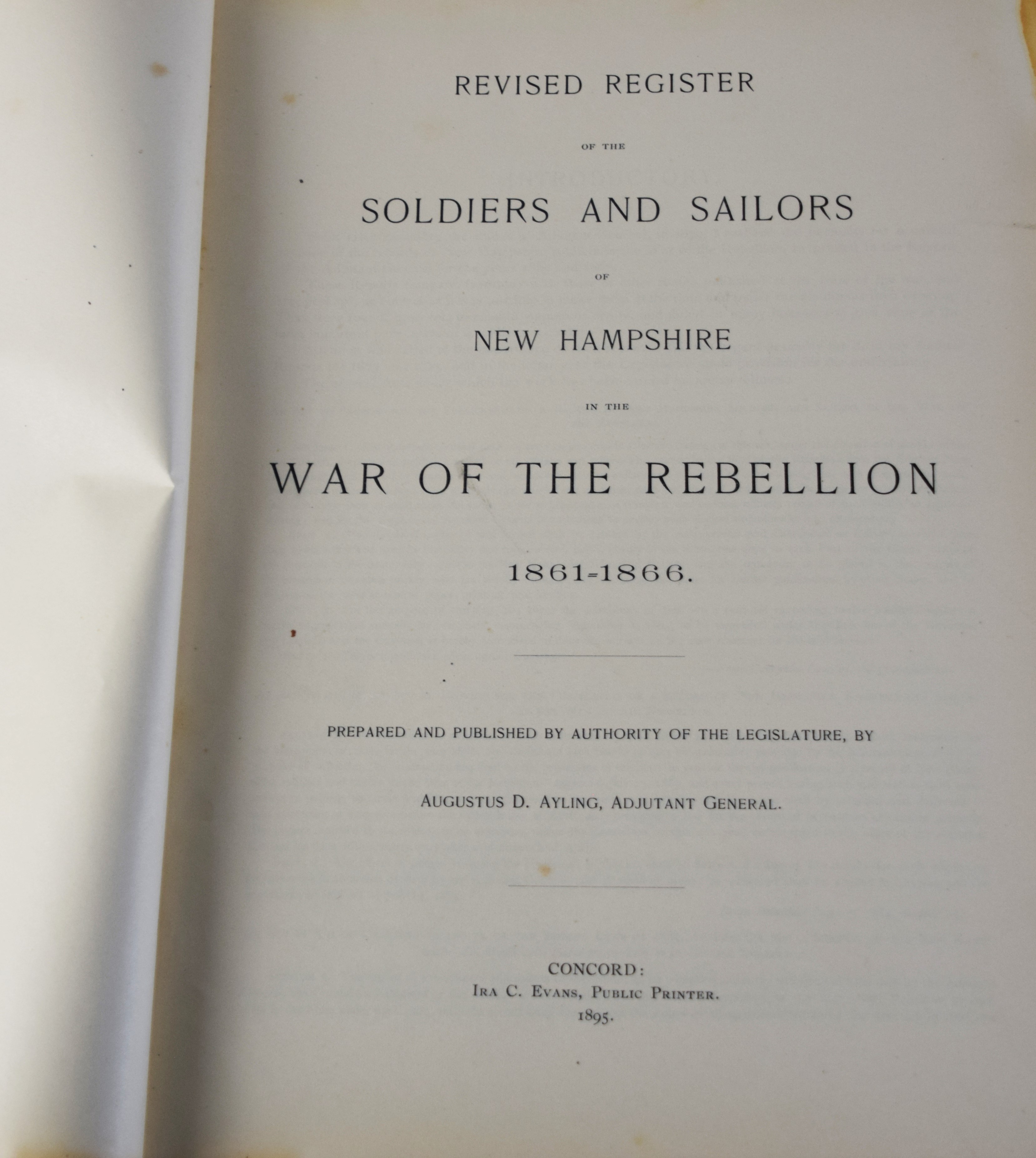 Best resource book of New Hampshire in the Civil War. A thick folio of 1347 pages, published be State Adjutant General Ayling. The best source for individual soldier’s records as well as a complete record of the 18 regiments as well as the Sharp Shooters units, the colored soldiers, and the Lafayette Guard. AG Ayling was able to obtain the records from the Navy Department of all the New Hampshire sailors who served in the Civil War, making this among the most complete of all the state histories of what they called the War of the Rebellion. A near fine copy of a book that frequently has severe wear or cracked hinges.