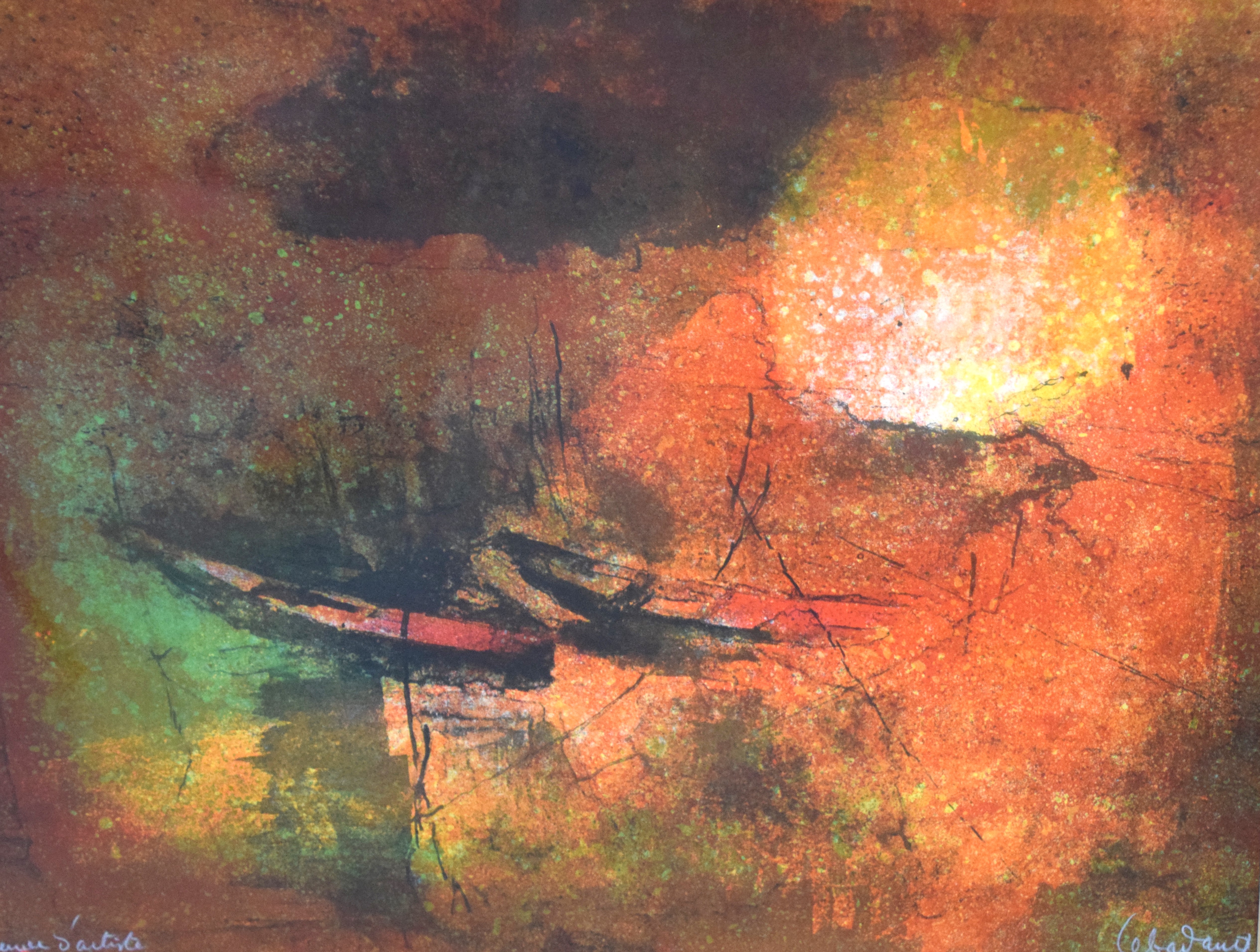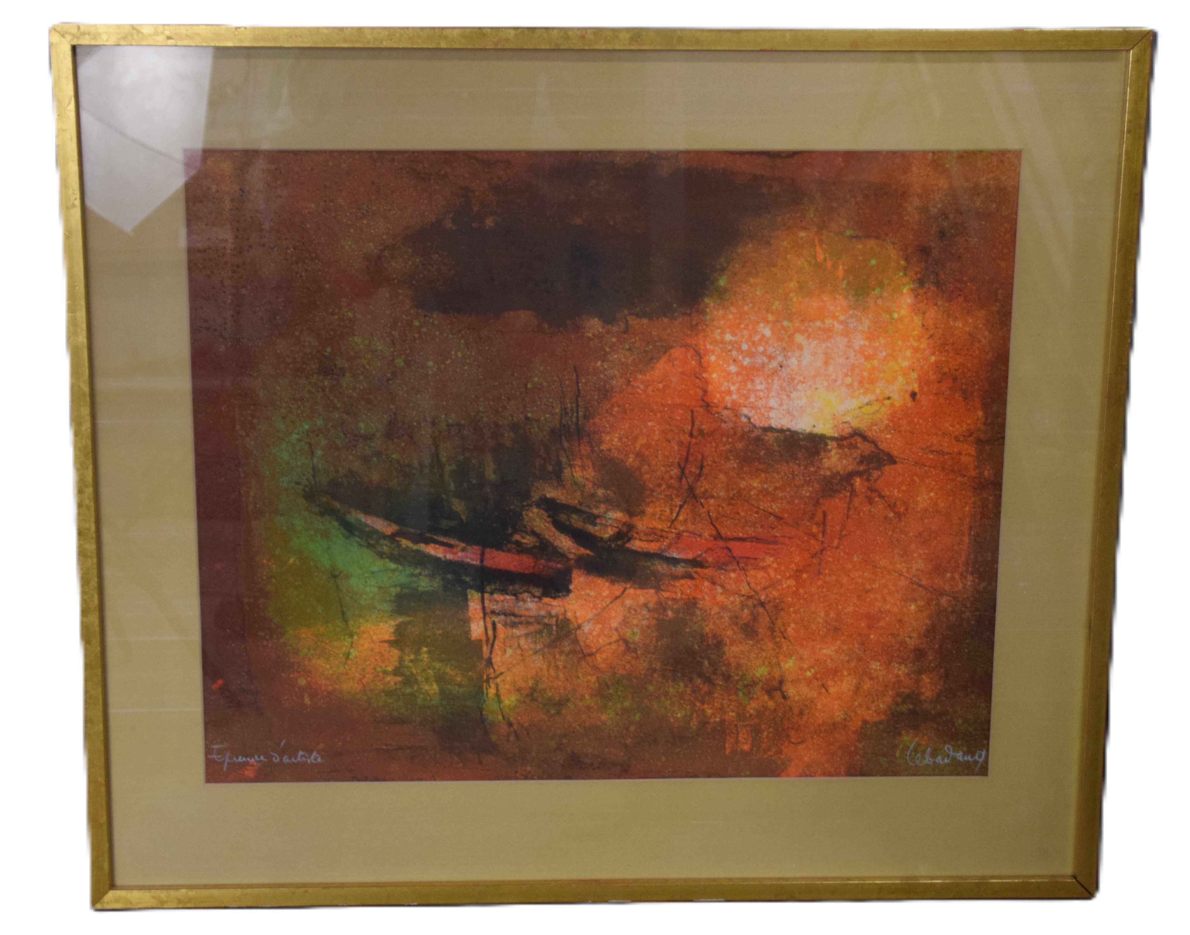 Framed and signed (lower right) artist proof of two boats. Lebadang (1922 – 2015) was born in Viet Nam and worked in France. Lebadang was first represented in the United States, in 1966, with an exhibition of his paintings at the Cincinnati Art Museum. Dimensions: 19″ x 23″ Image size