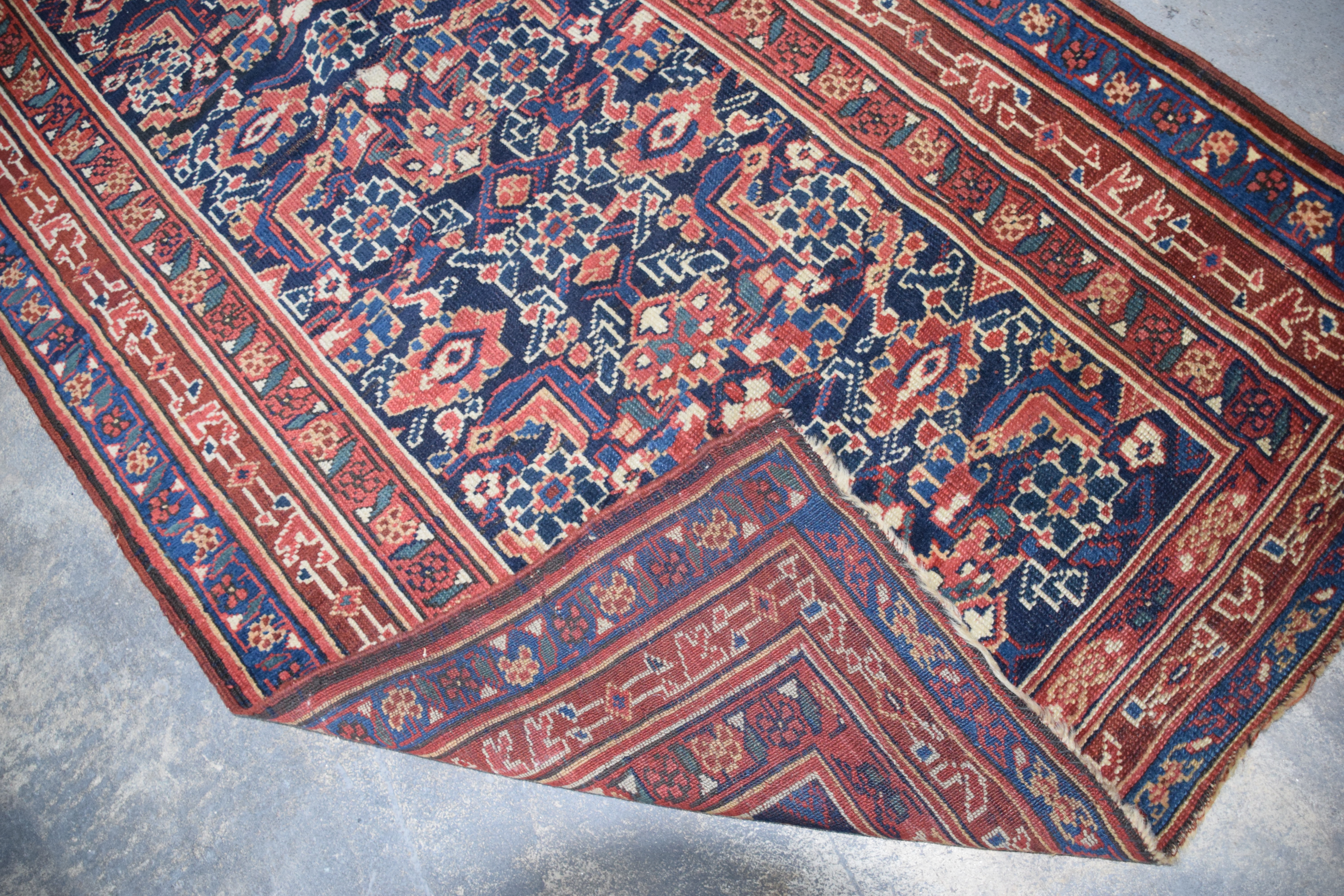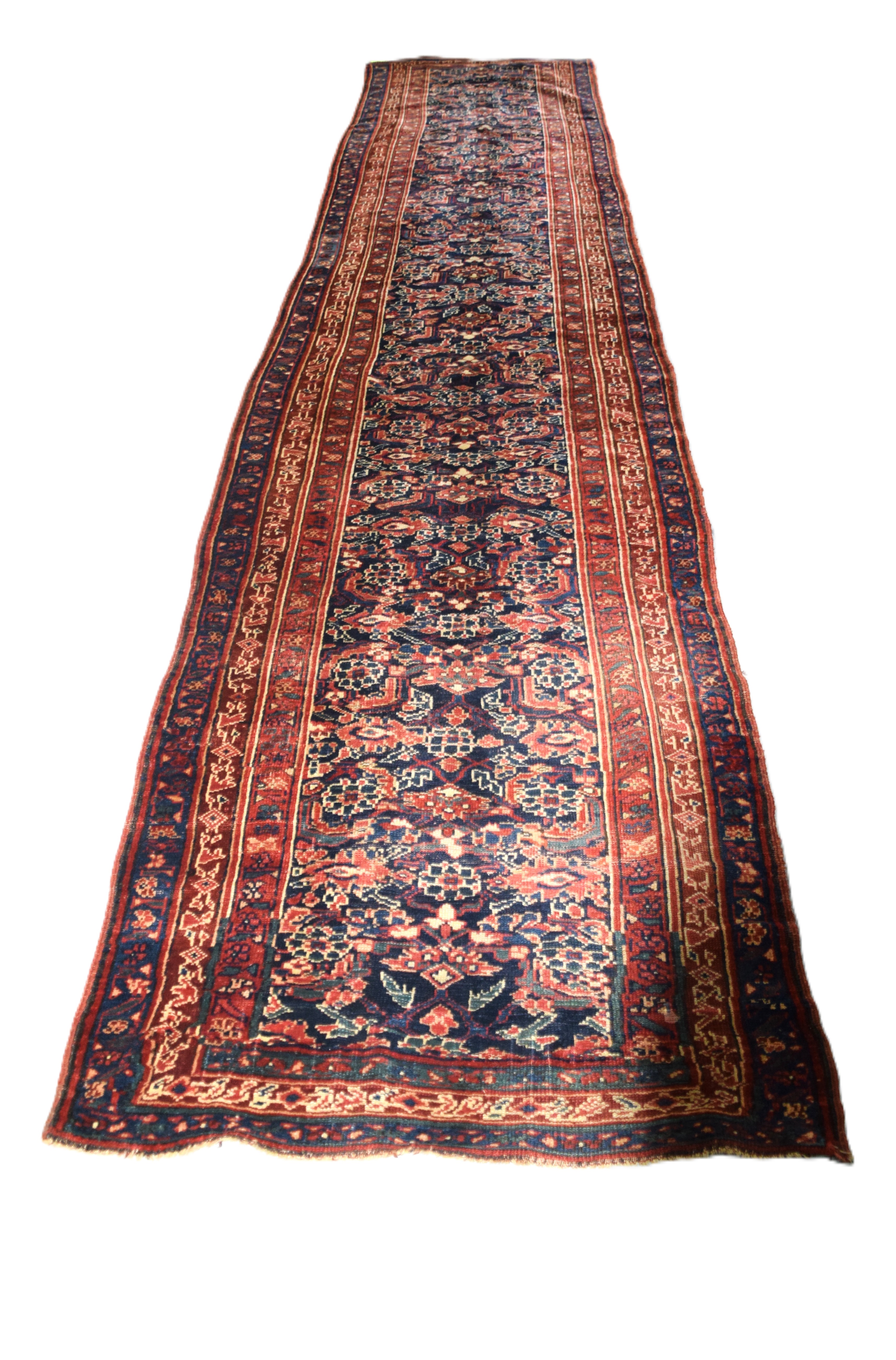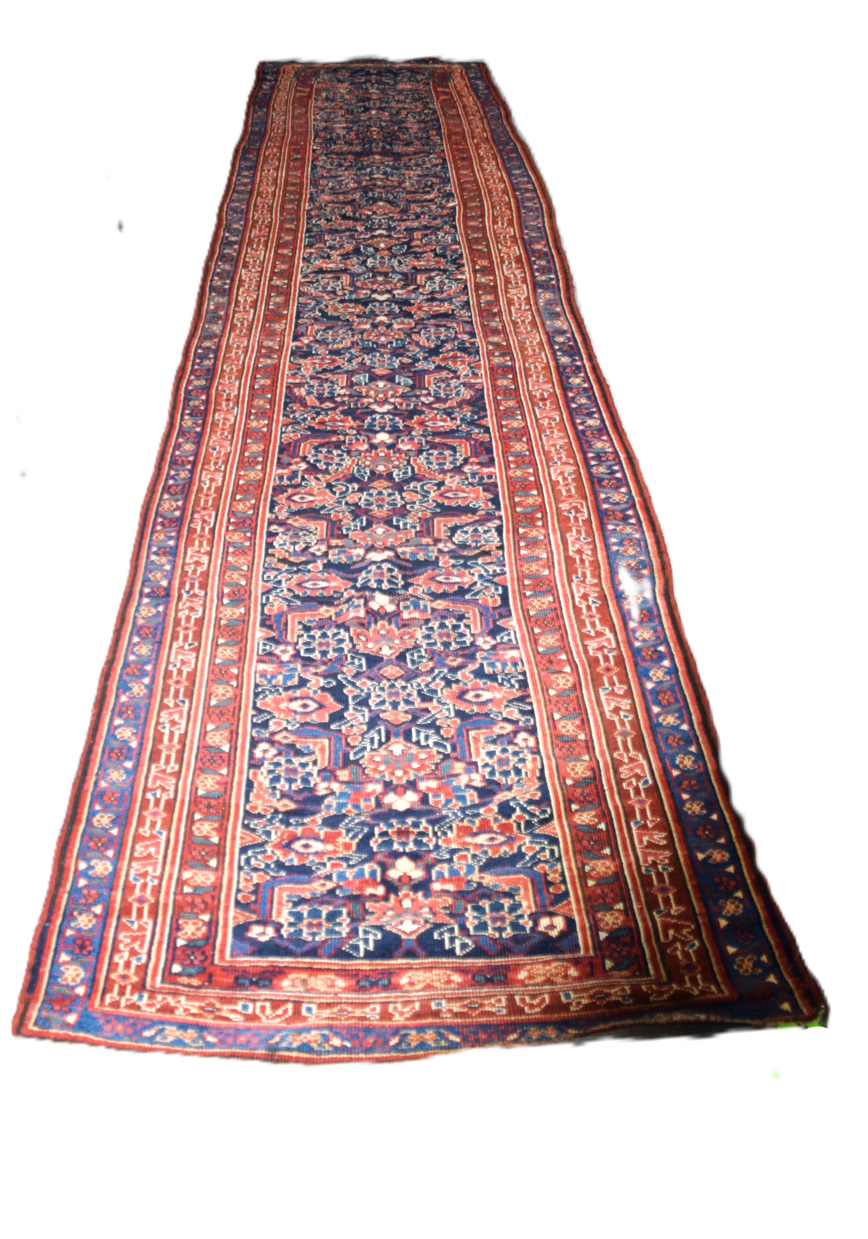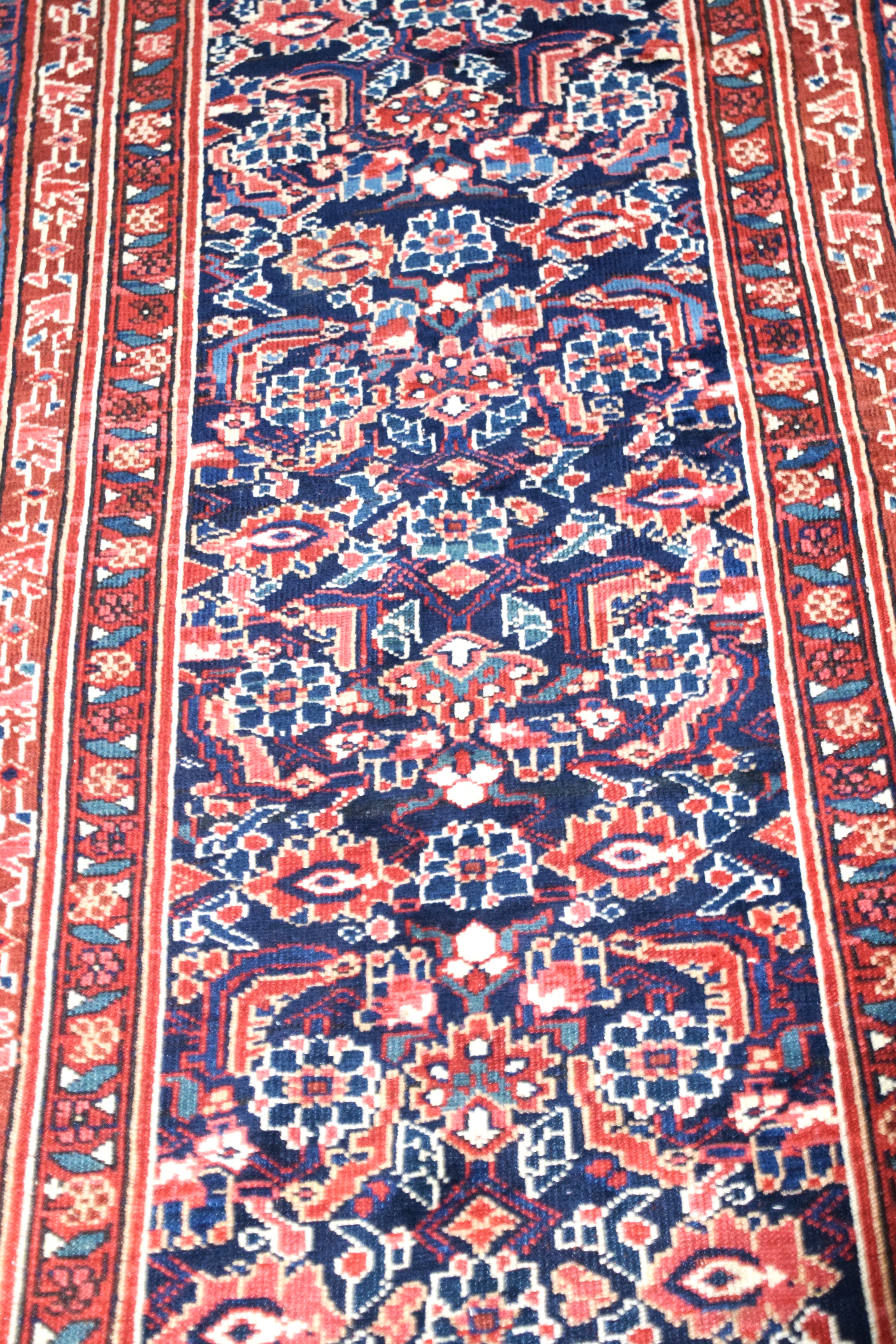 Old oriental runner with multi-colors and all over designs with blue field. From a Bedford NH estate. Dimensions: 3’5″ x 16’4″