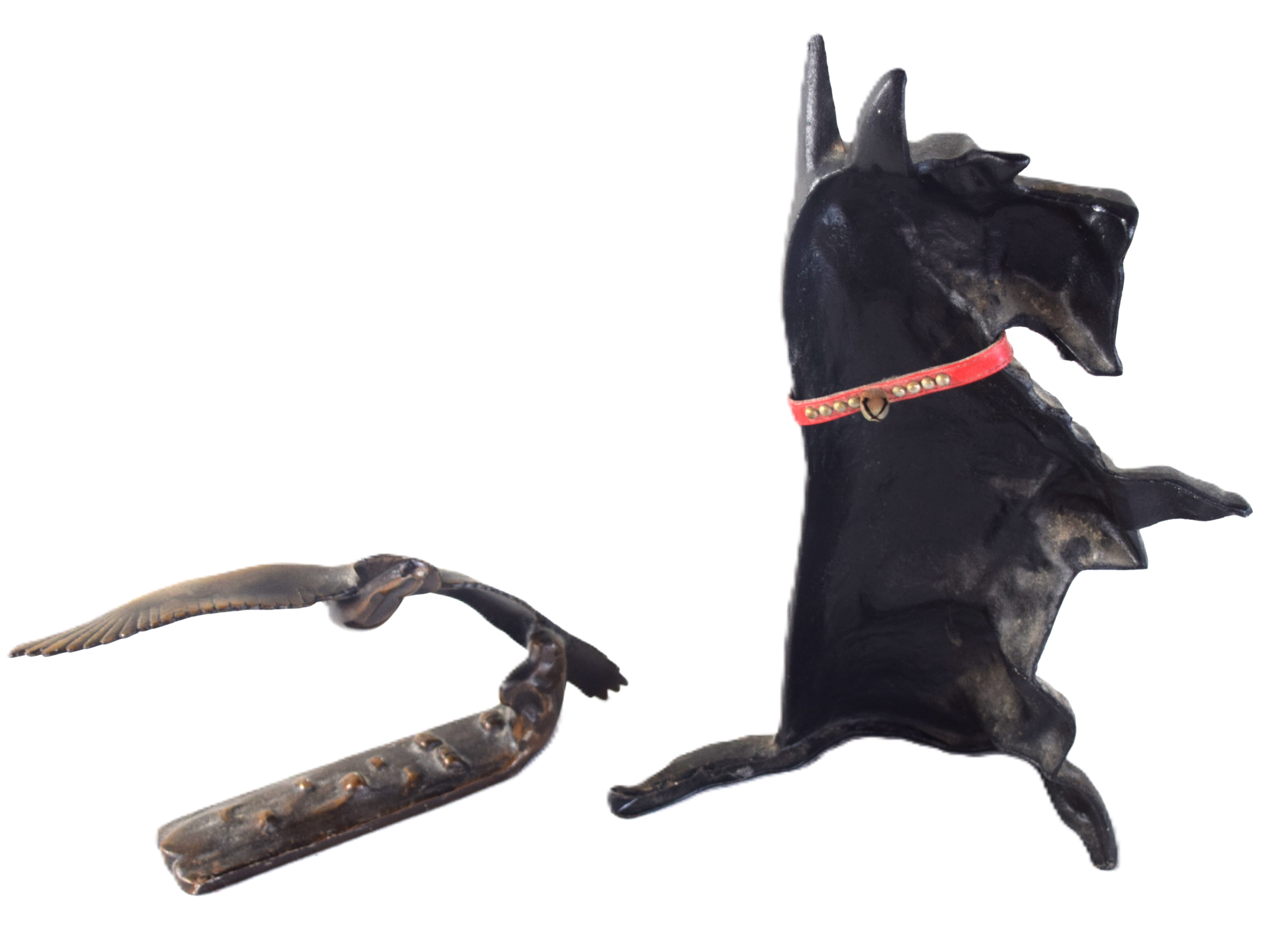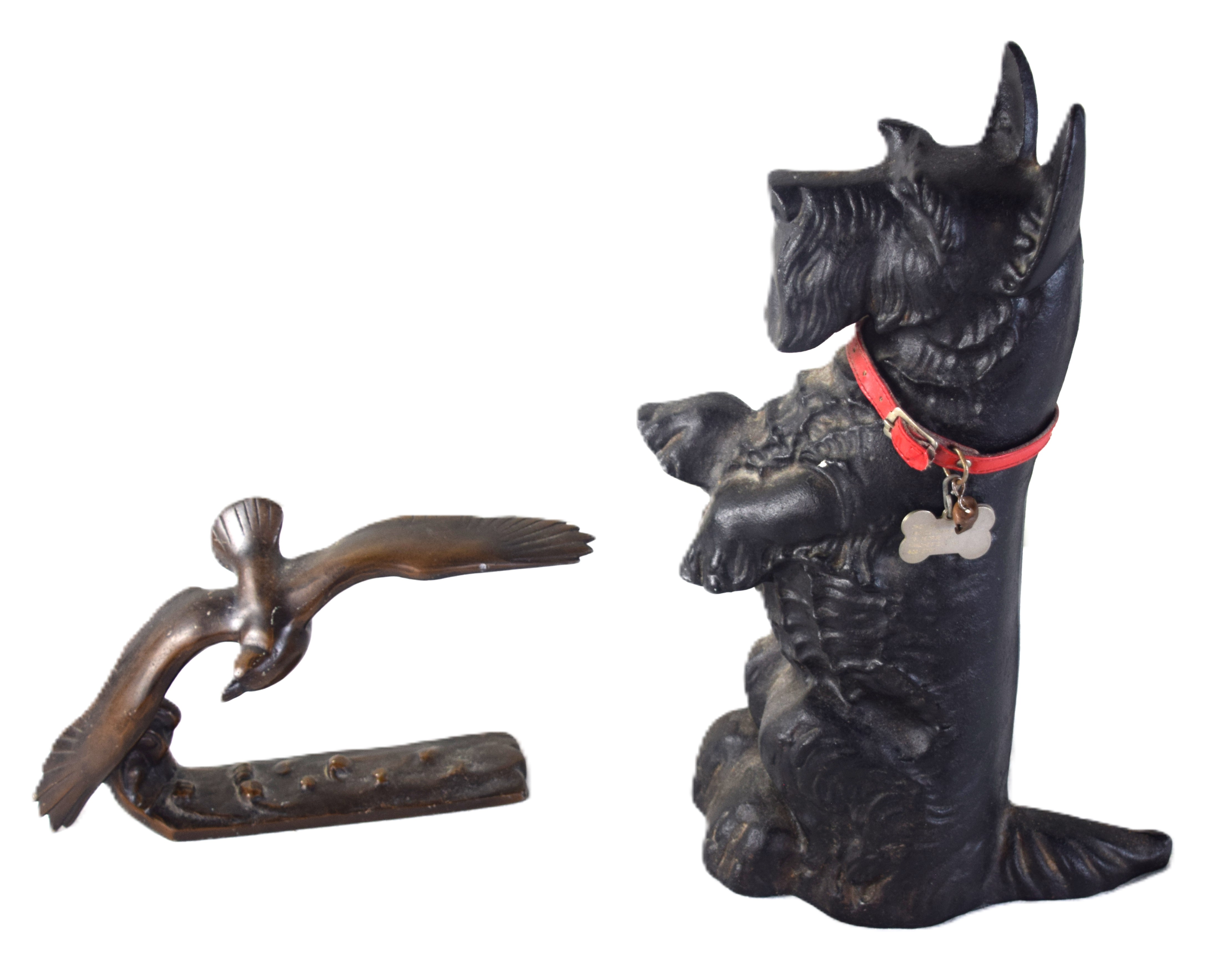 Two door stops including a bronze spread wing eagle (12″ L) and a Scotty dog cast iron (16″ H)