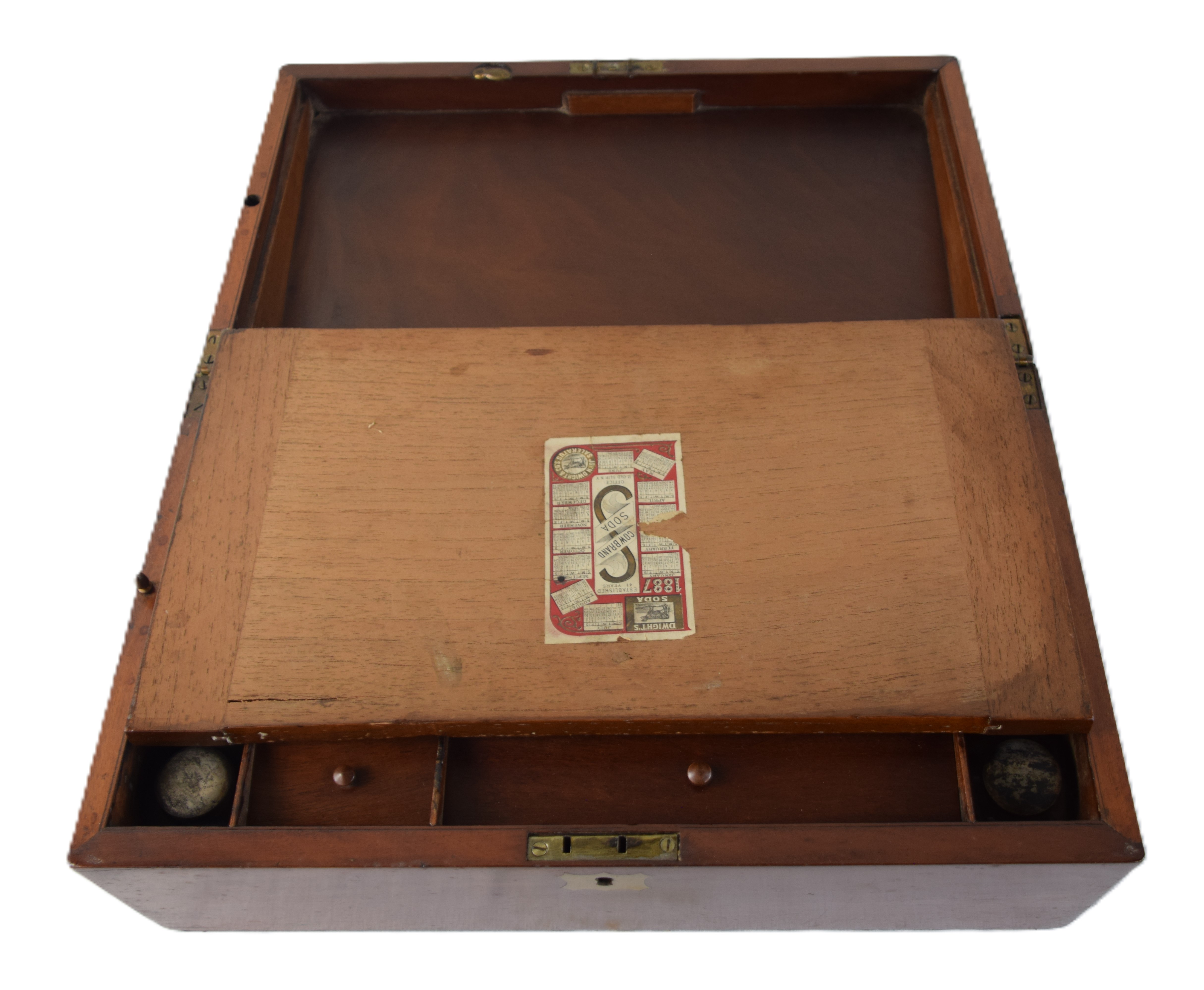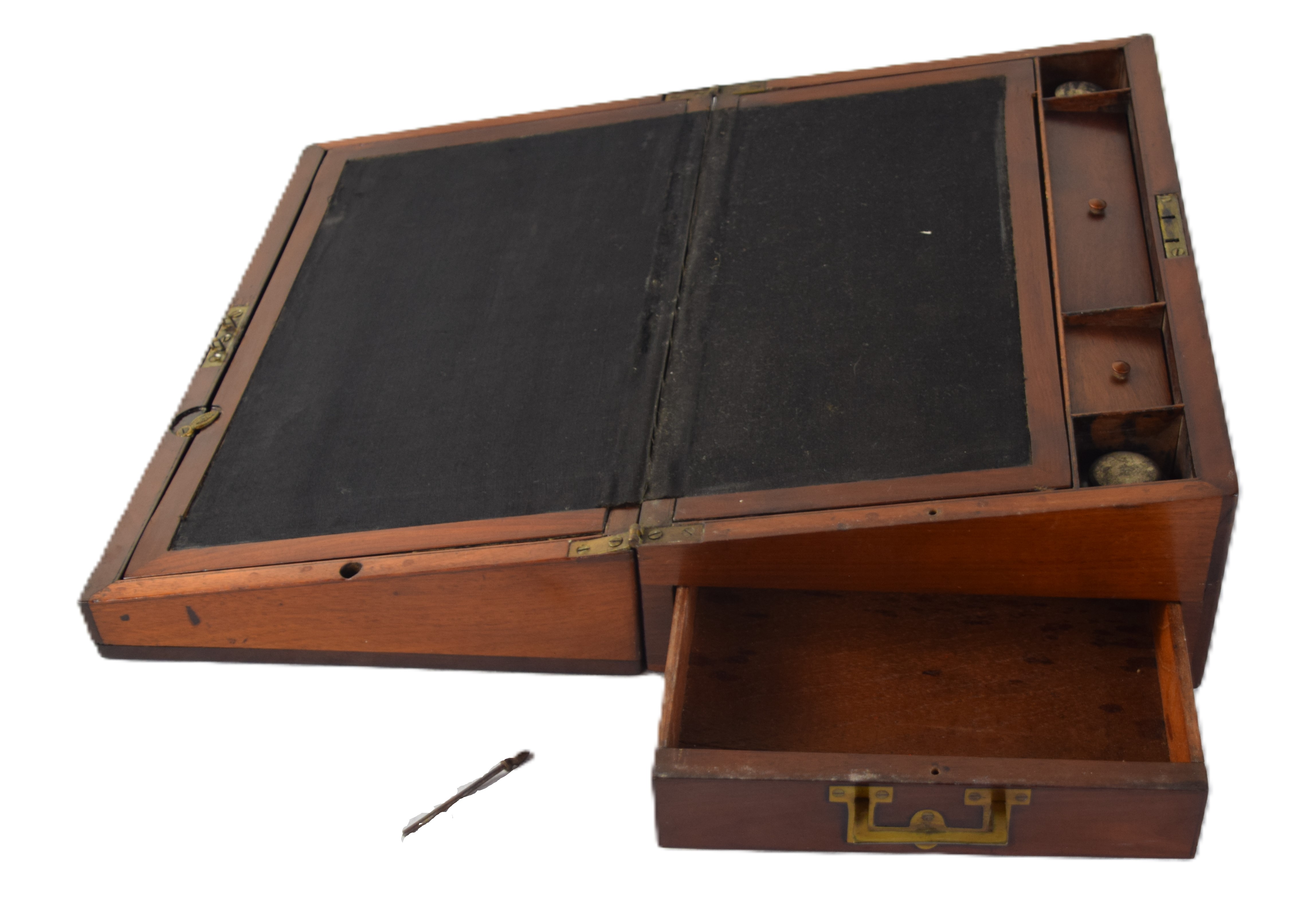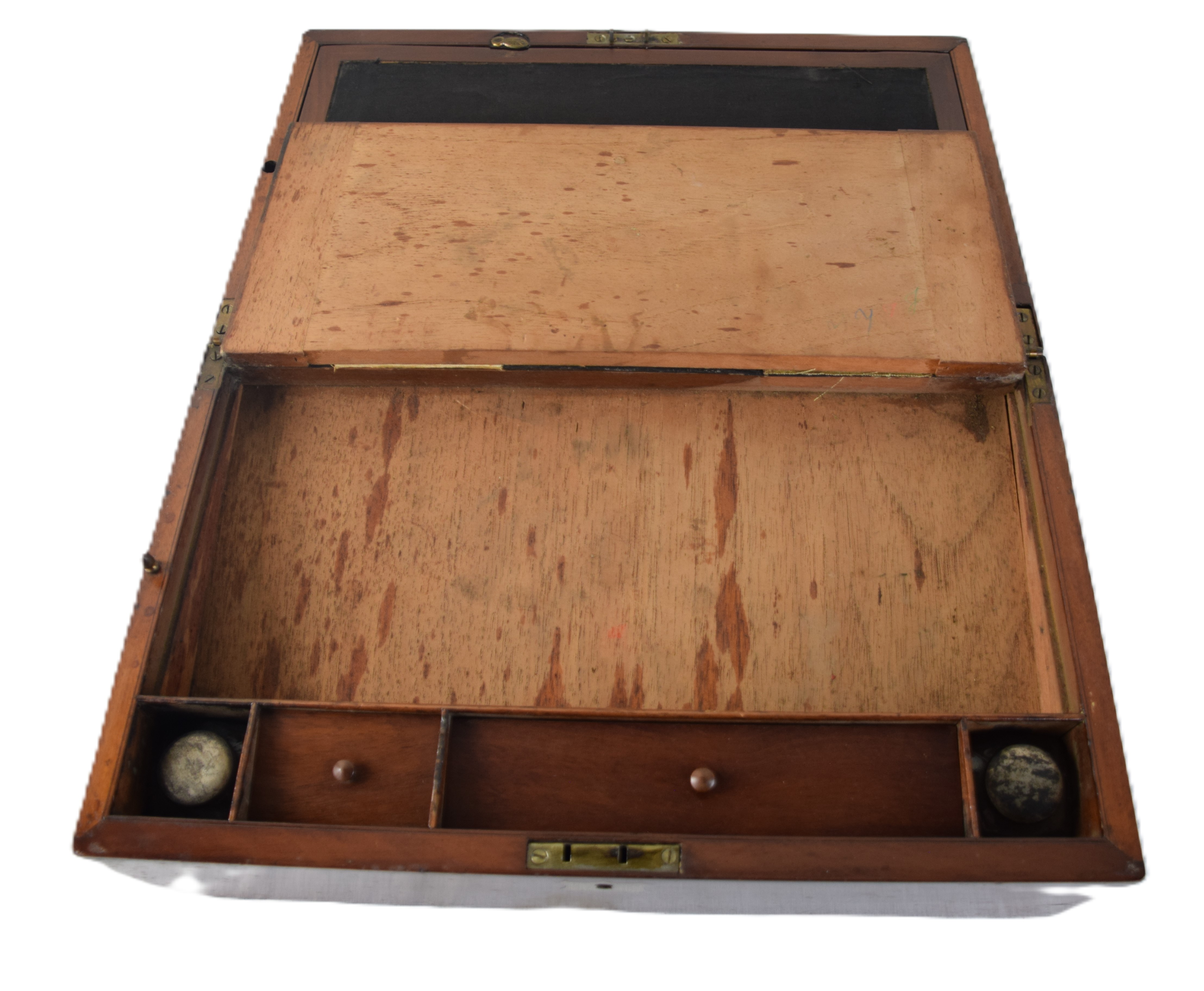 Table Top mahogany 19th century Captain’s writing desk with hinged lid, hidden top compartment, 3 small drawers and ink bottles and side drawer. Dimensions: 6″ H x 16″ W x 10″ D