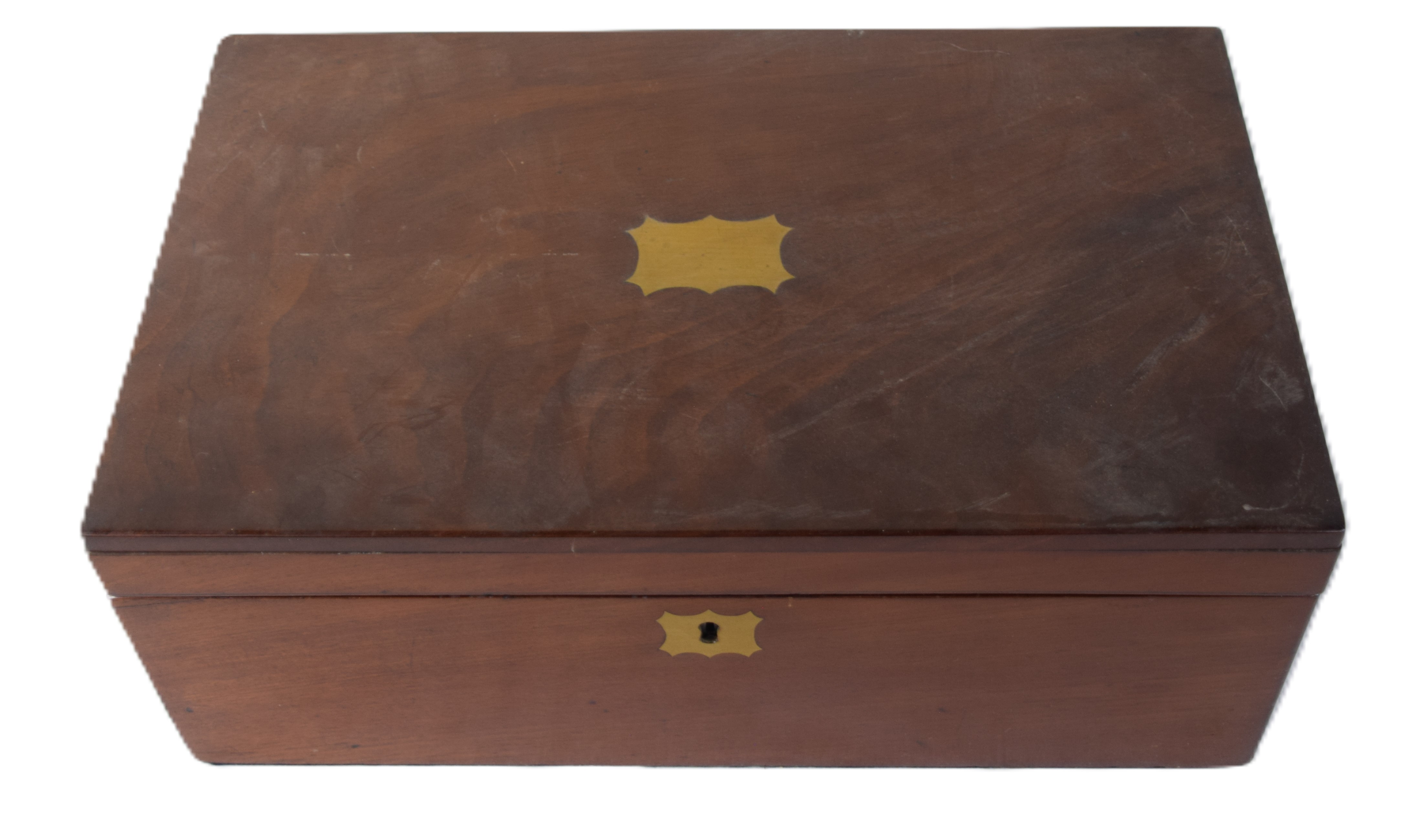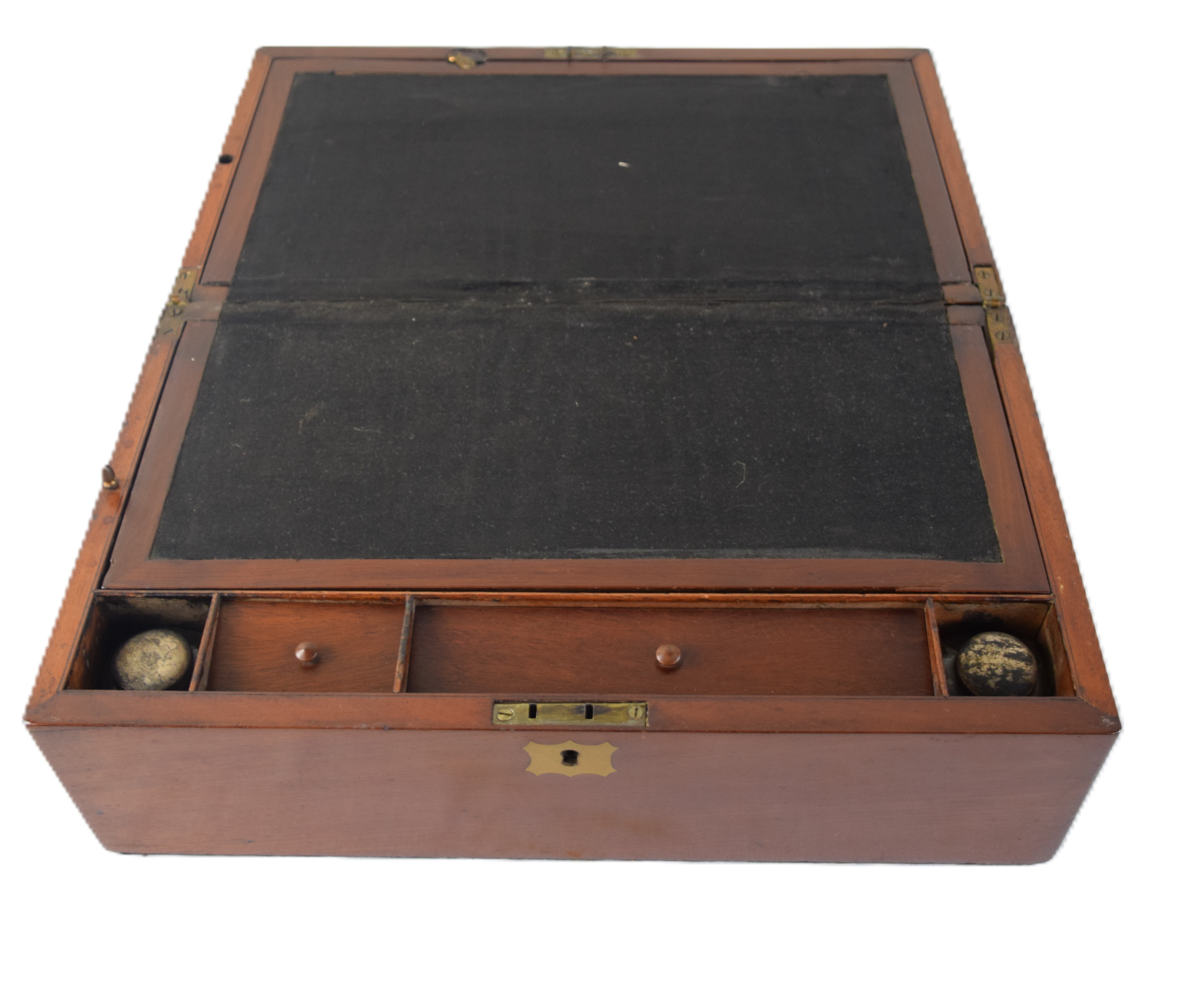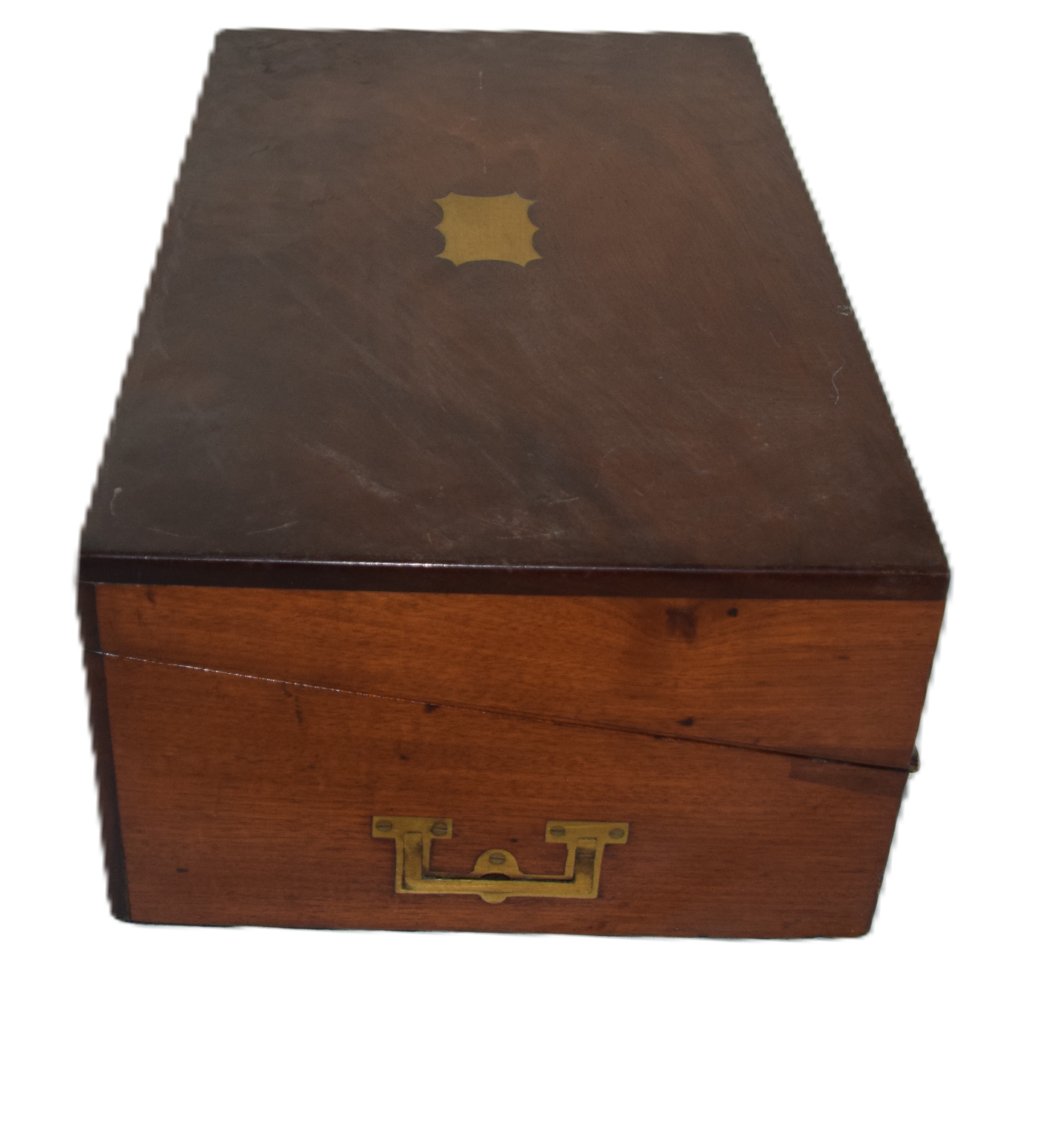 Table Top mahogany 19th century Captain’s writing desk with hinged lid, hidden top compartment, 3 small drawers and ink bottles and side drawer. Dimensions: 6″ H x 16″ W x 10″ D