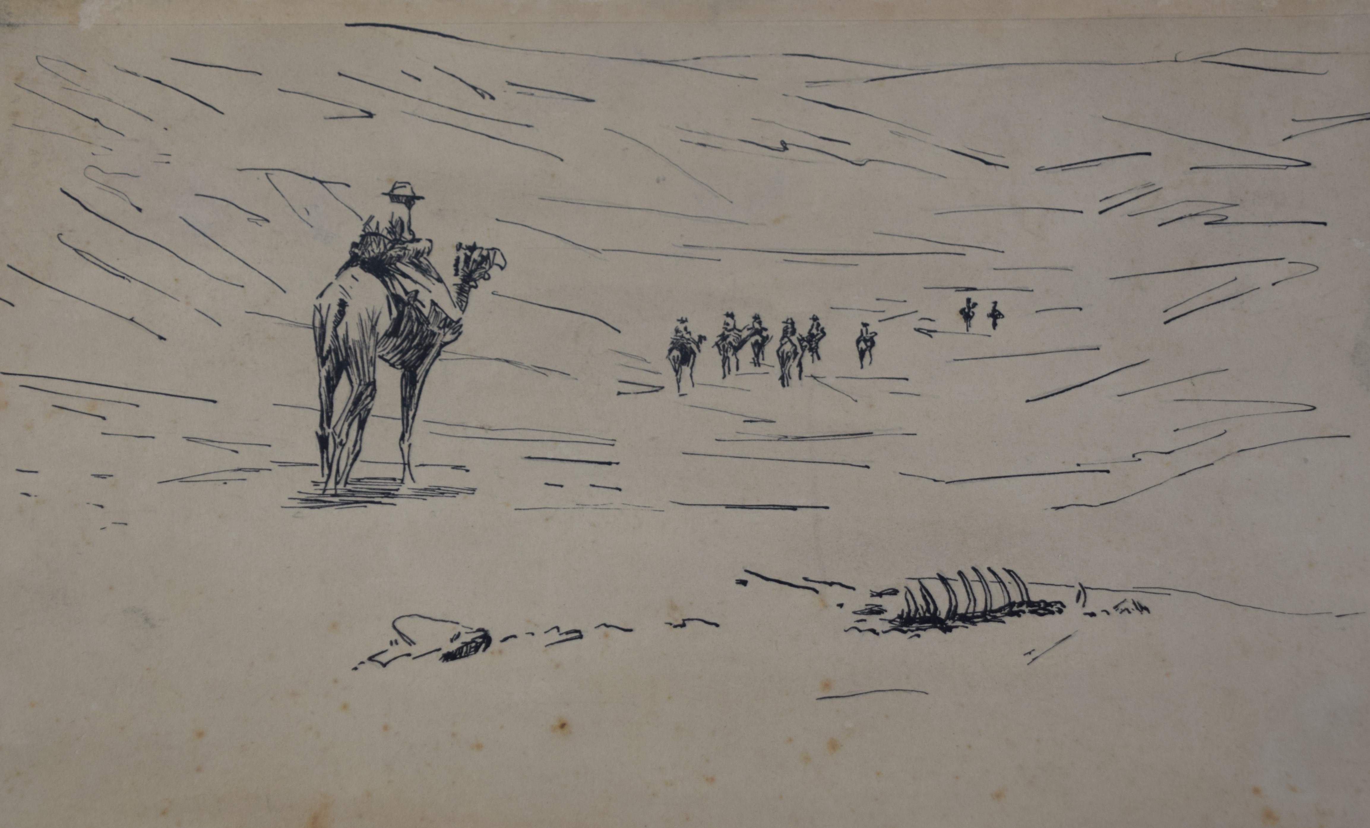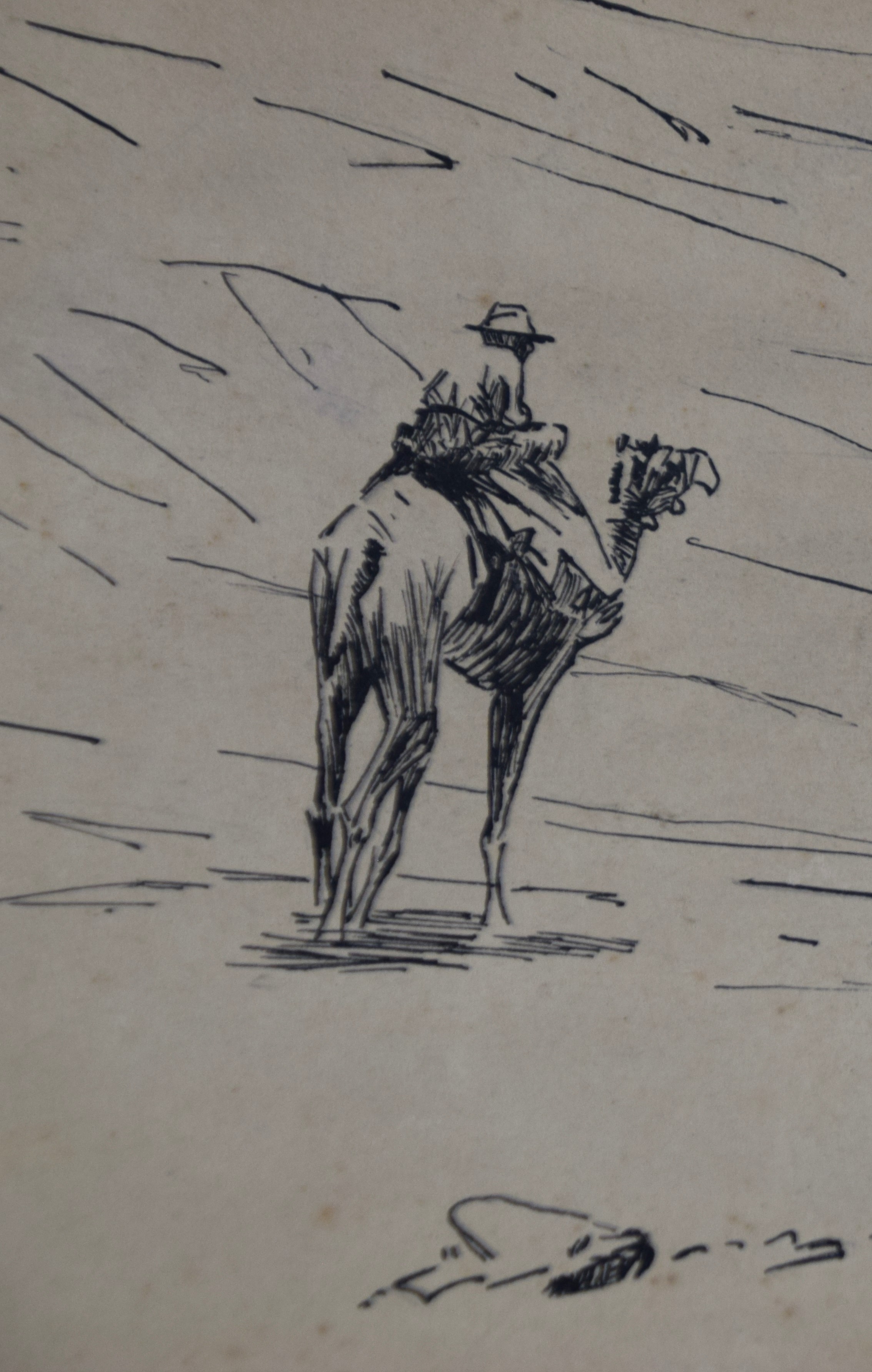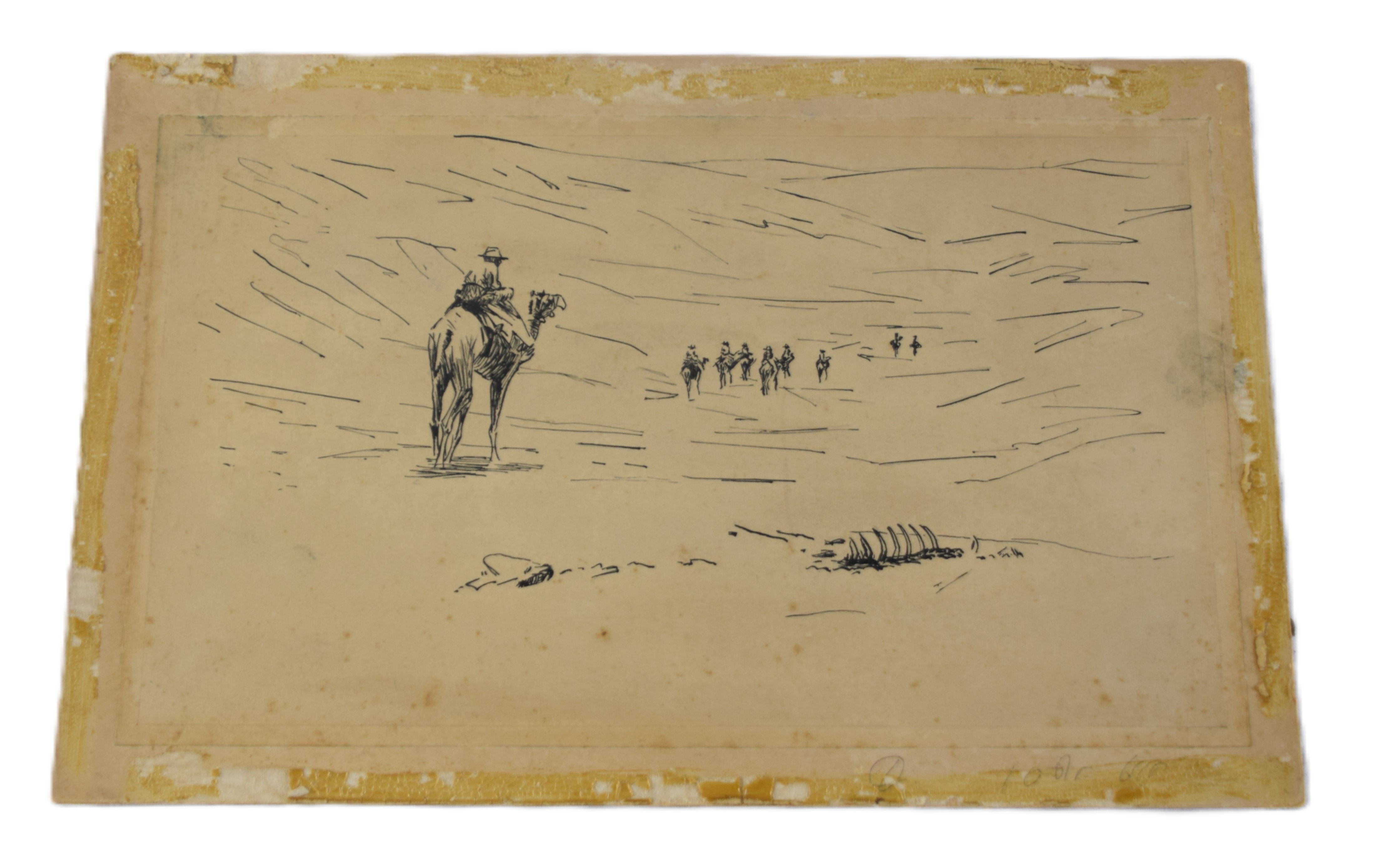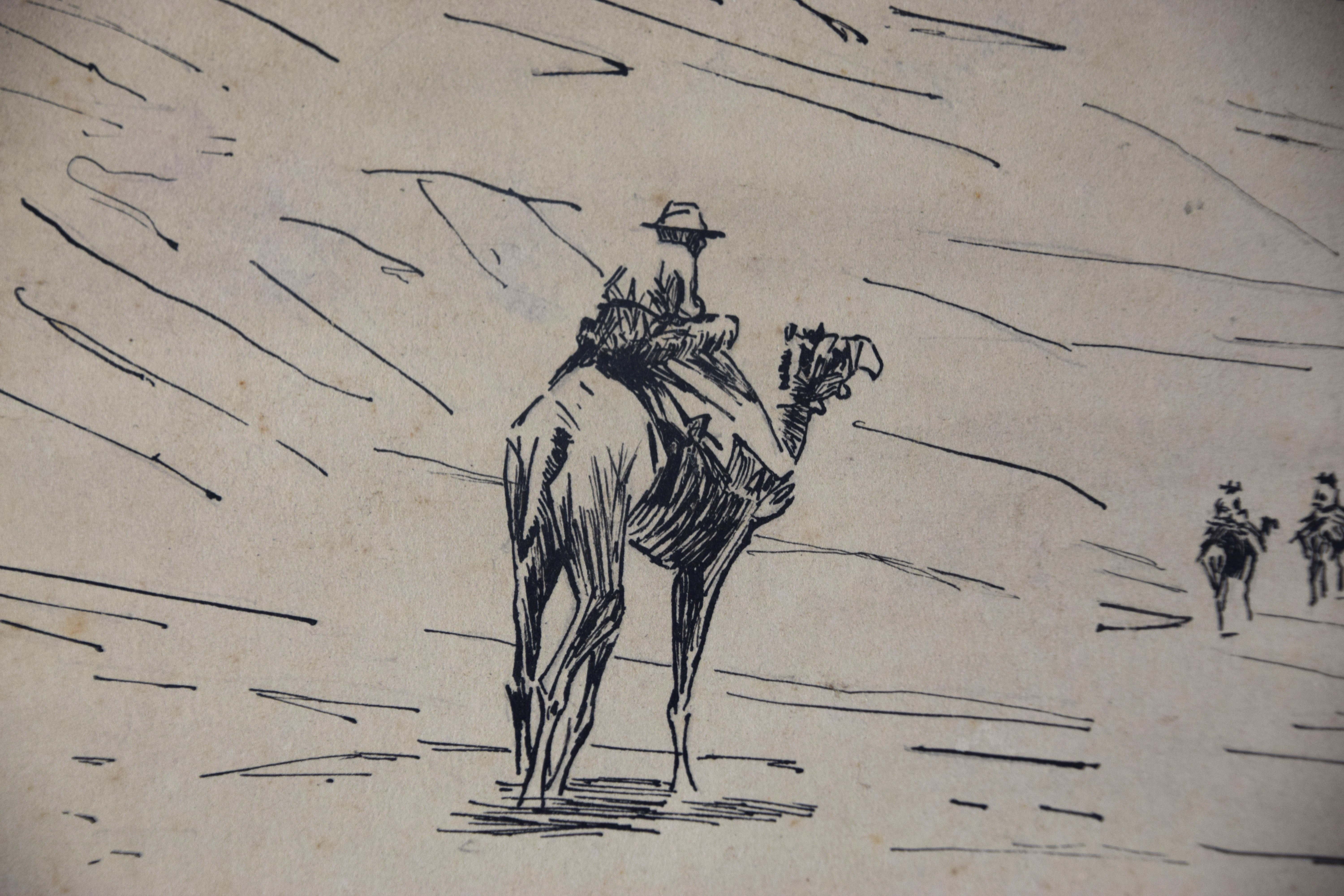Unsigned pen and ink drawing of a camel rider in the desert following others. Attributed to Frederic Sackrider Remington (1861 – 1909) worked in New York, Kansas and Connecticut and is known as the most successful and famous Western American artist. Dimensions: 7.5″ x 11.5″