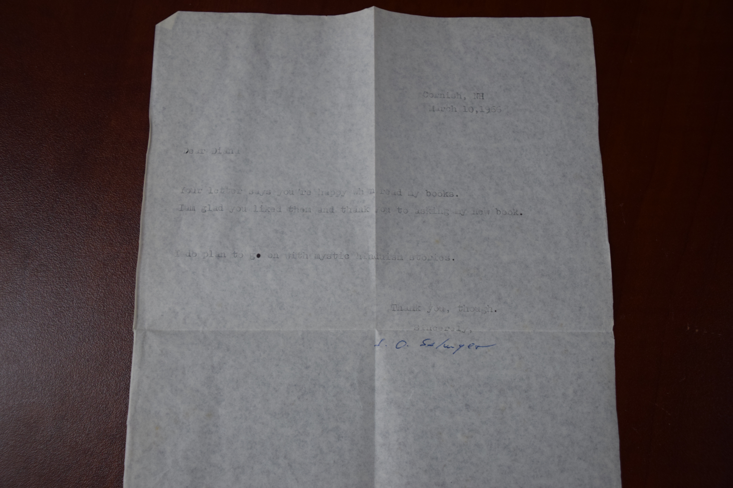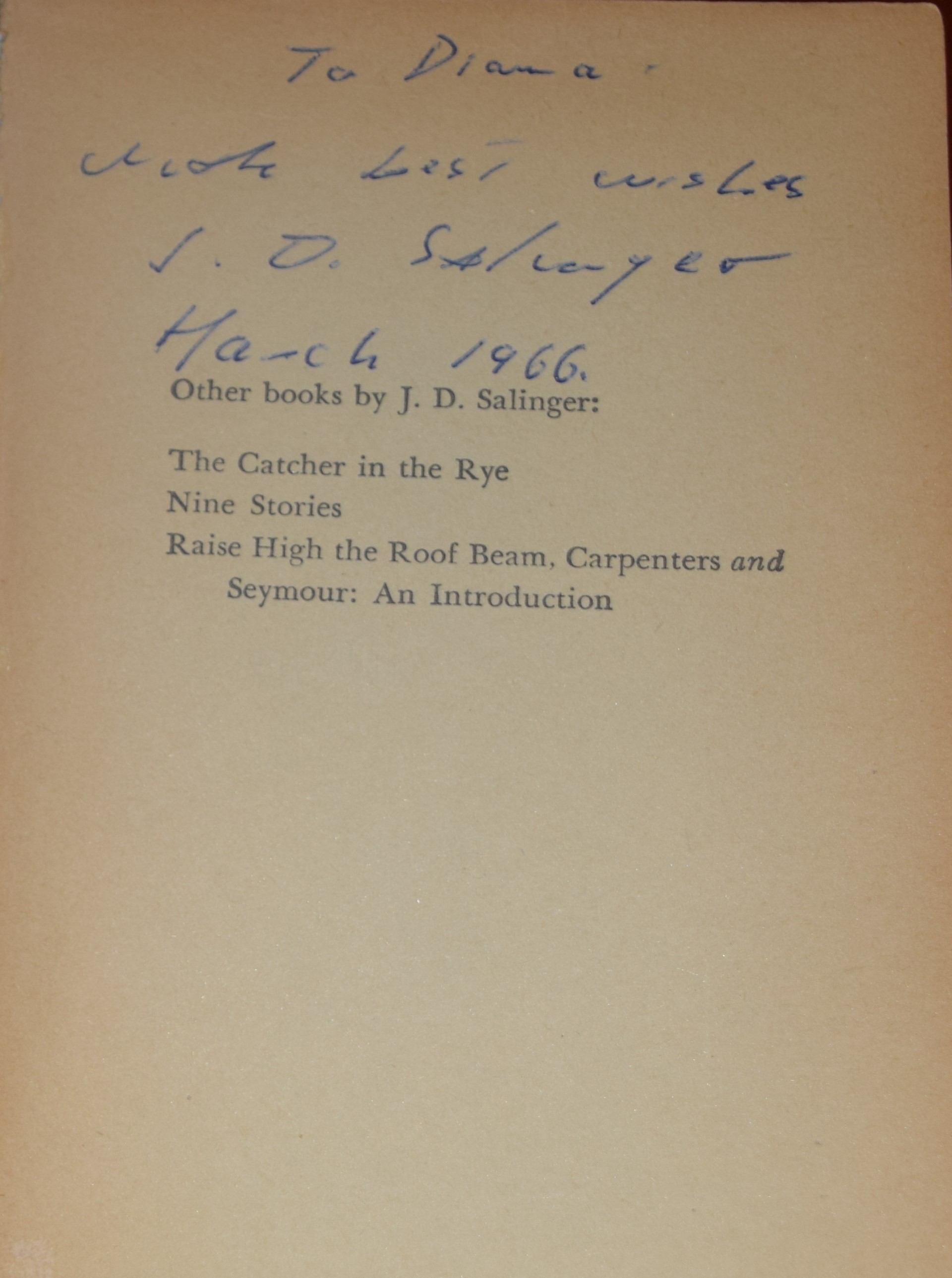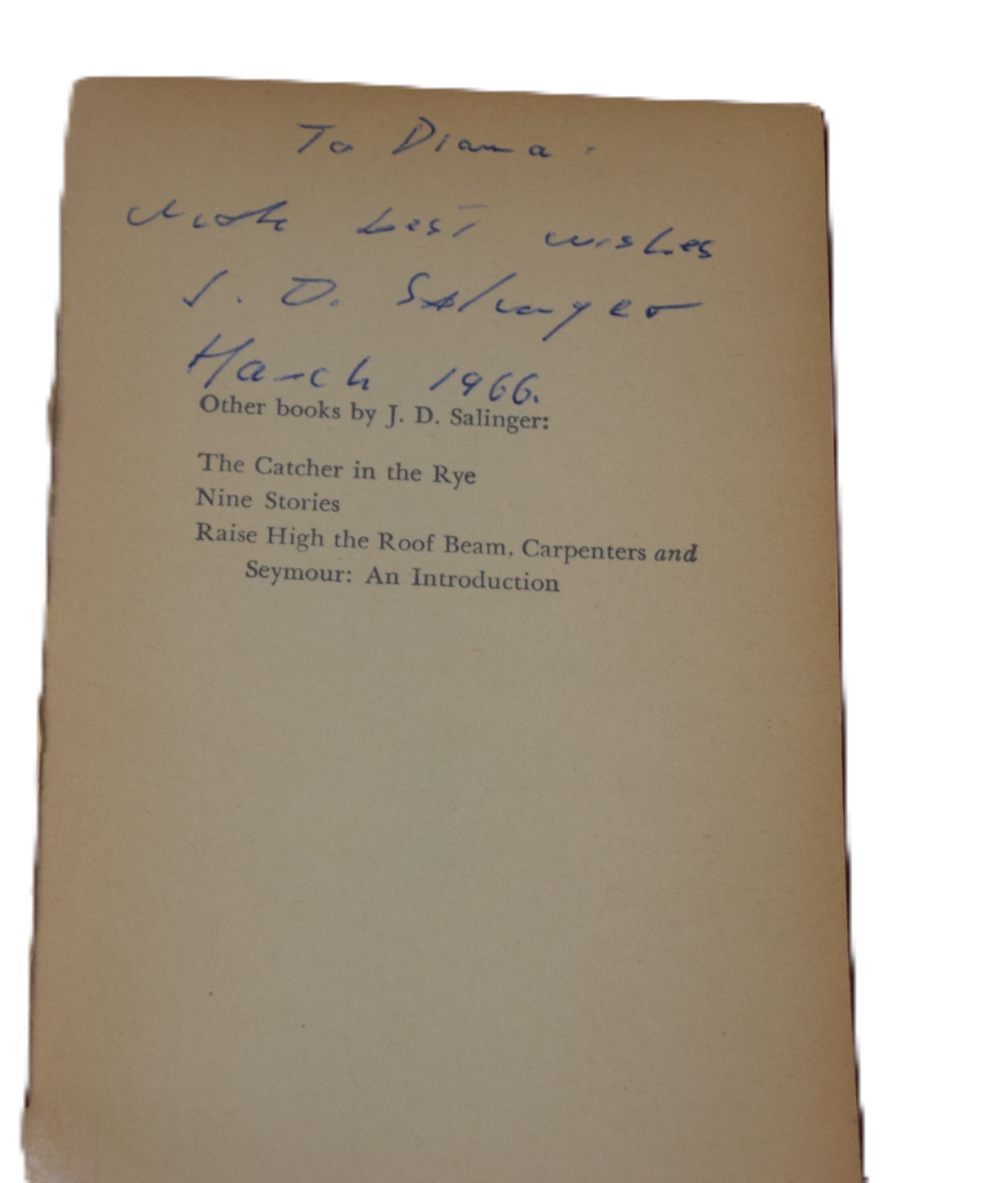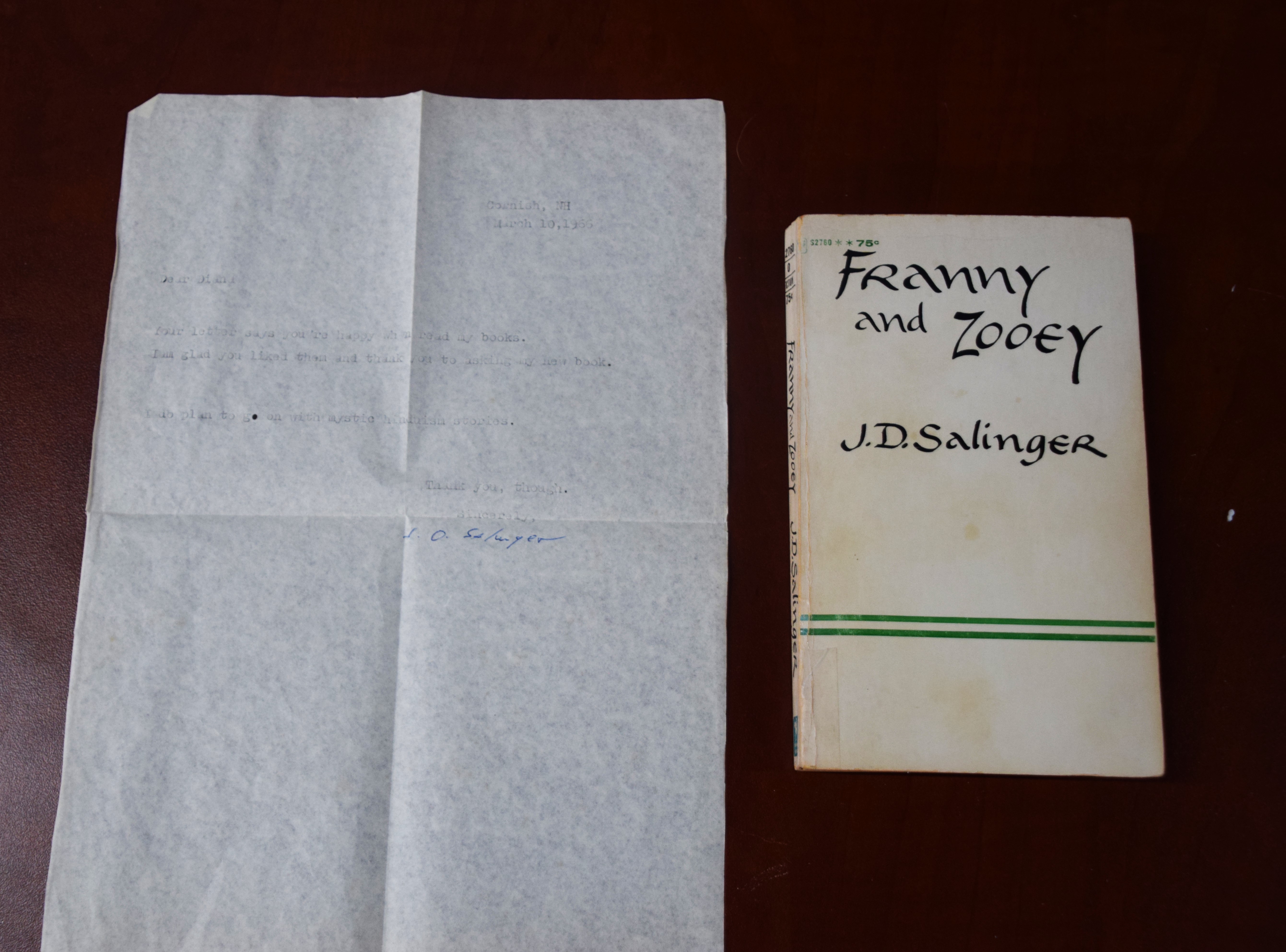 Paperback copy of Franny and Zooey, 12th edition, signed by J. D. Salinger, March 1966. Signed typed letter accompanies book inquiring about his next book.